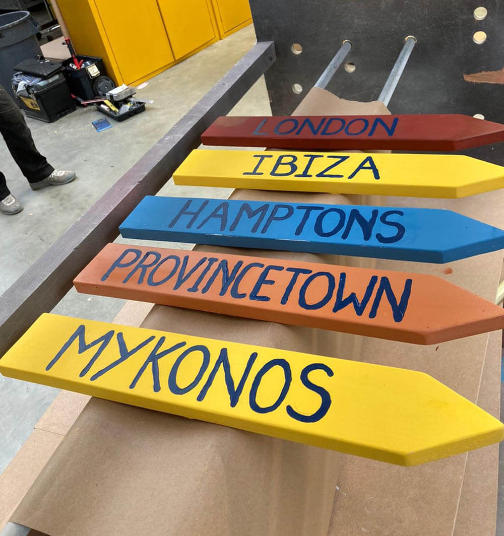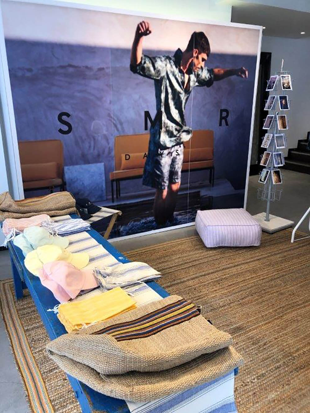 Ibiza Rocks for Joseph and SMR Days! For this exciting collaboration between the two brands, we had the chance to create props for their old town Ibiza theme pop up for their Fulham Street store. We sourced furniture items to decorate the space and made bespoke painted signposts alongside pouffes, table runners and napkins from the SMR days linen collection. There were postcard holders featured to hold Ibiza themed postcards that were then sold to customers for Charity. The prints and vinyls we included in the design really helped bring Ibiza to London after a year of not being able to travel!