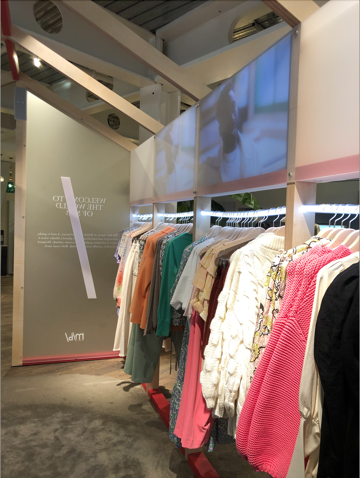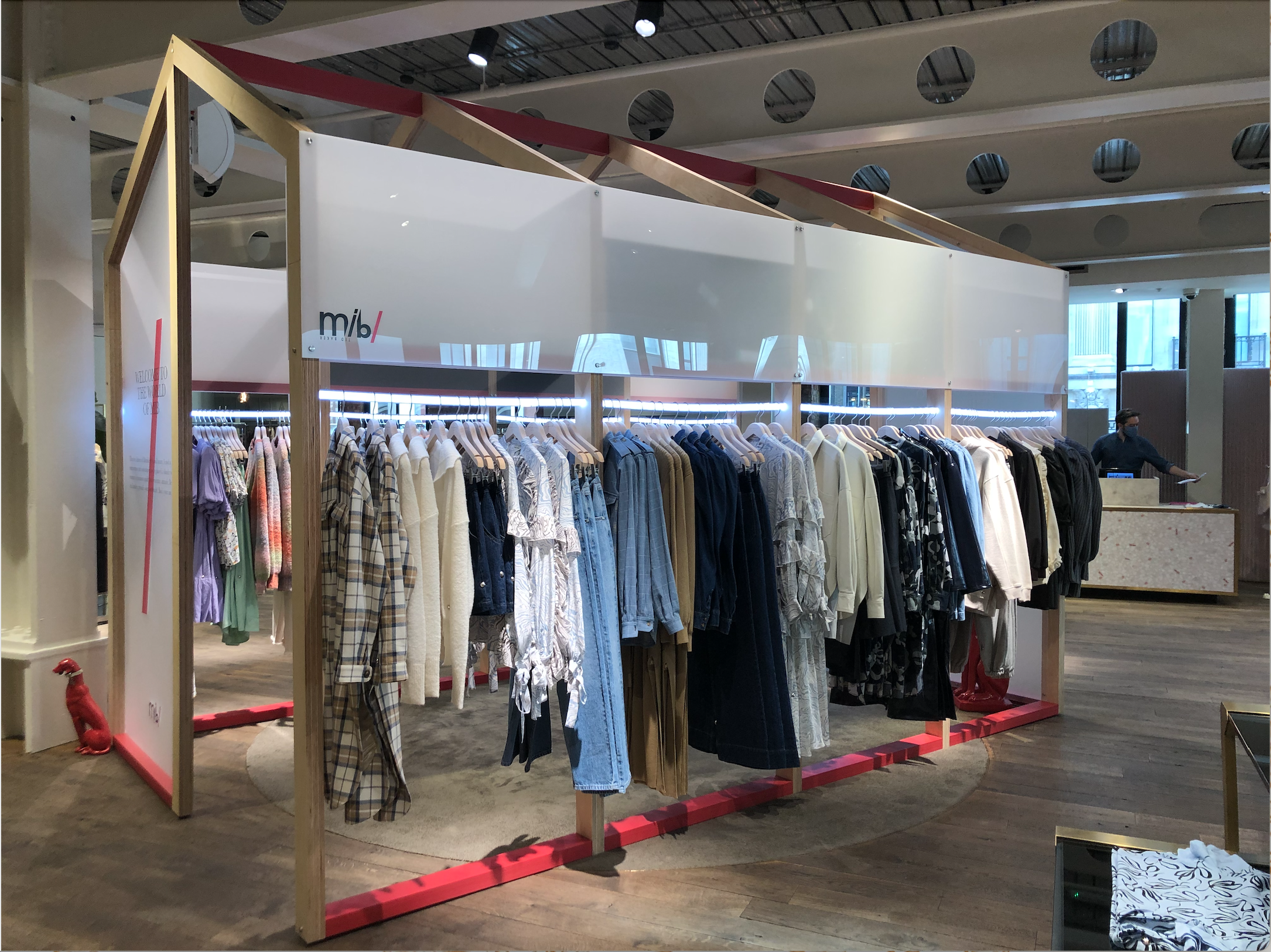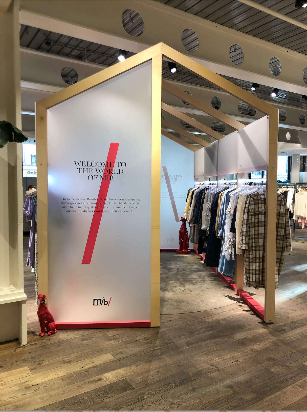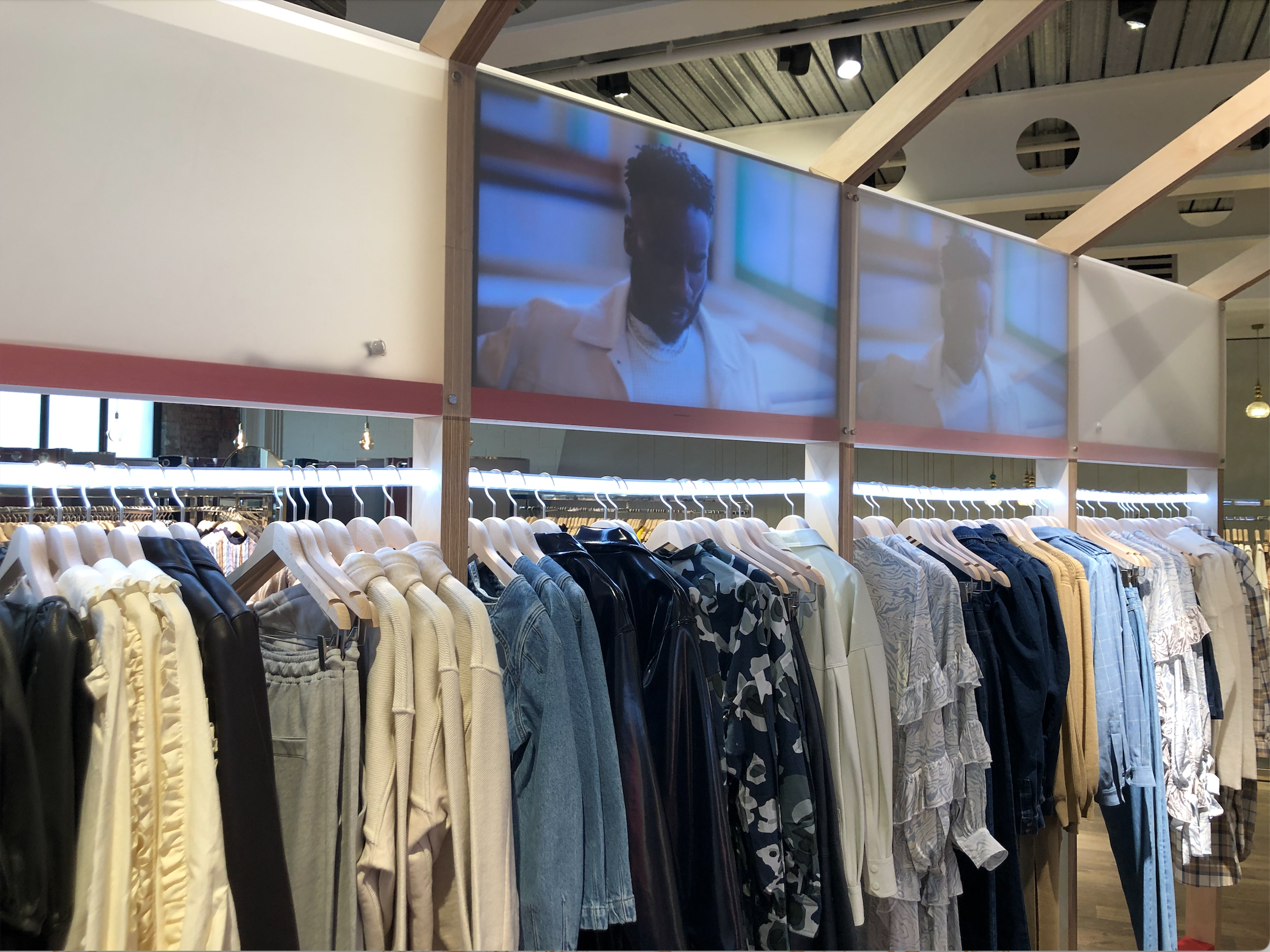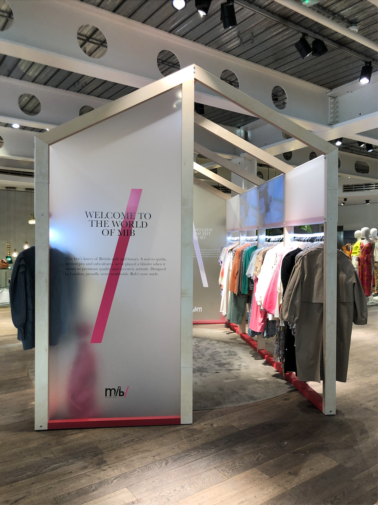 The Regent Street Flagship store has been transformed into an open space with a bespoke MIB structural display. When entering the space, media content plays through concealed panels to create an ‘art gallery’ experience. The clothes rails are illuminated to highlight the products.