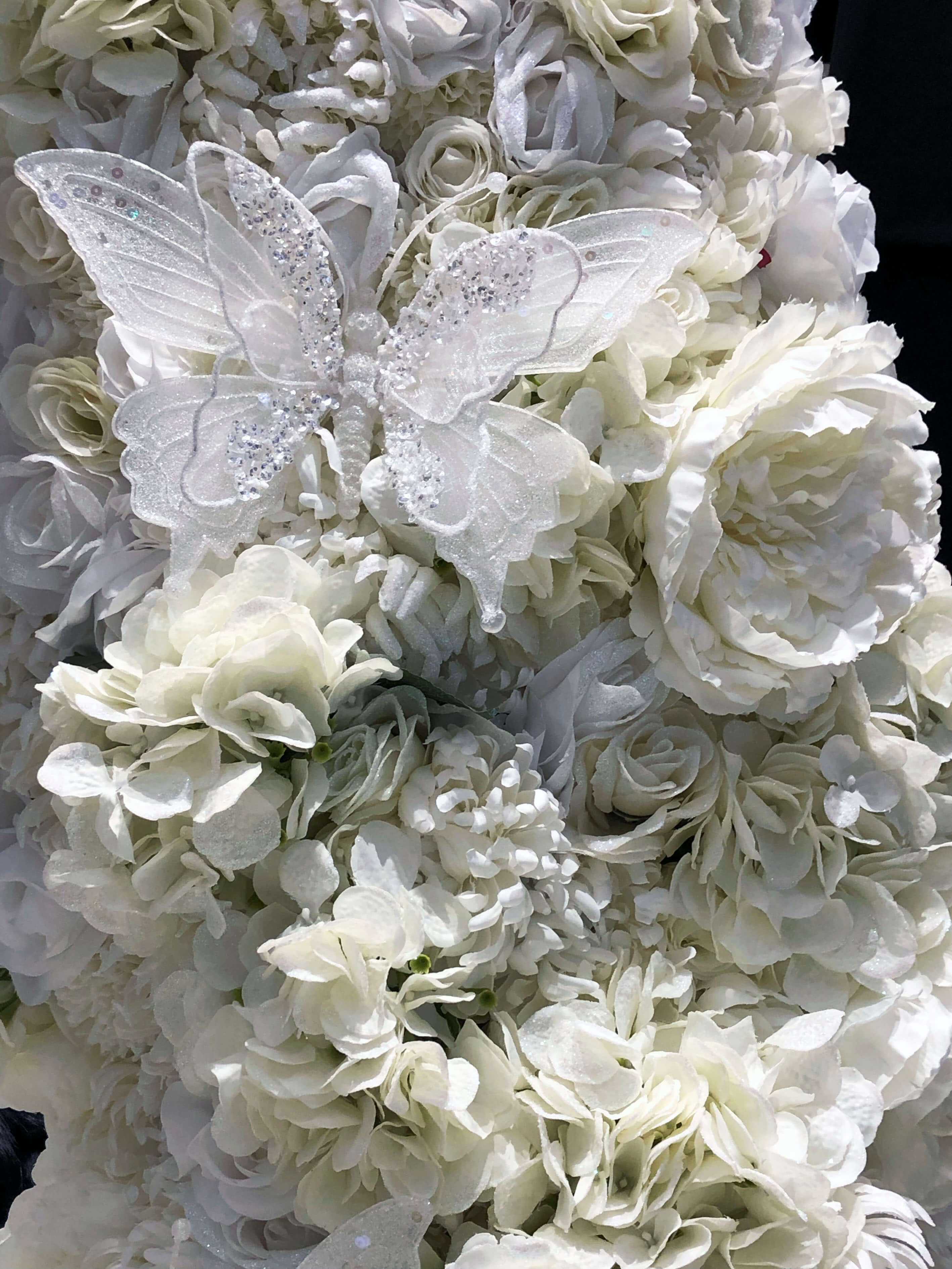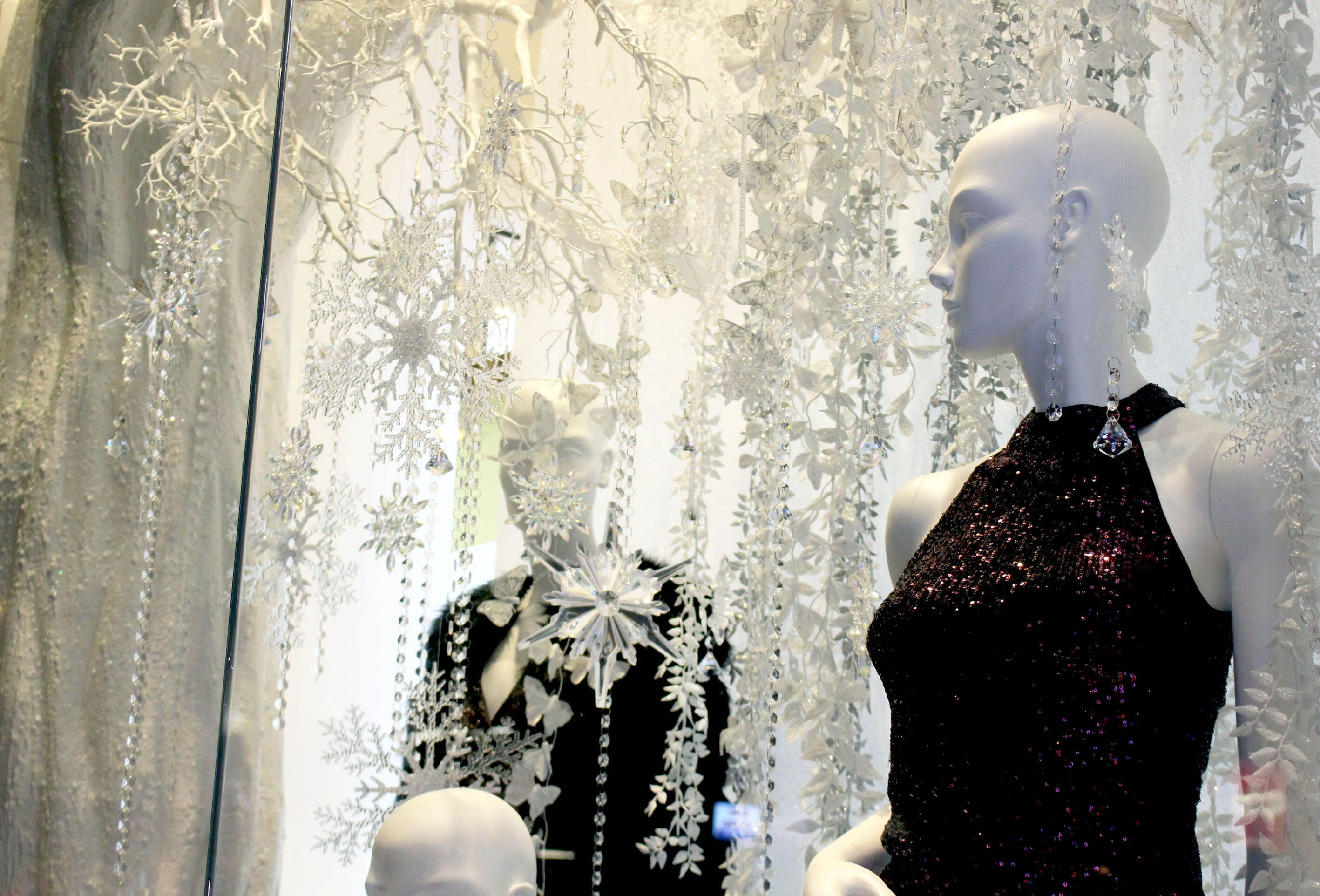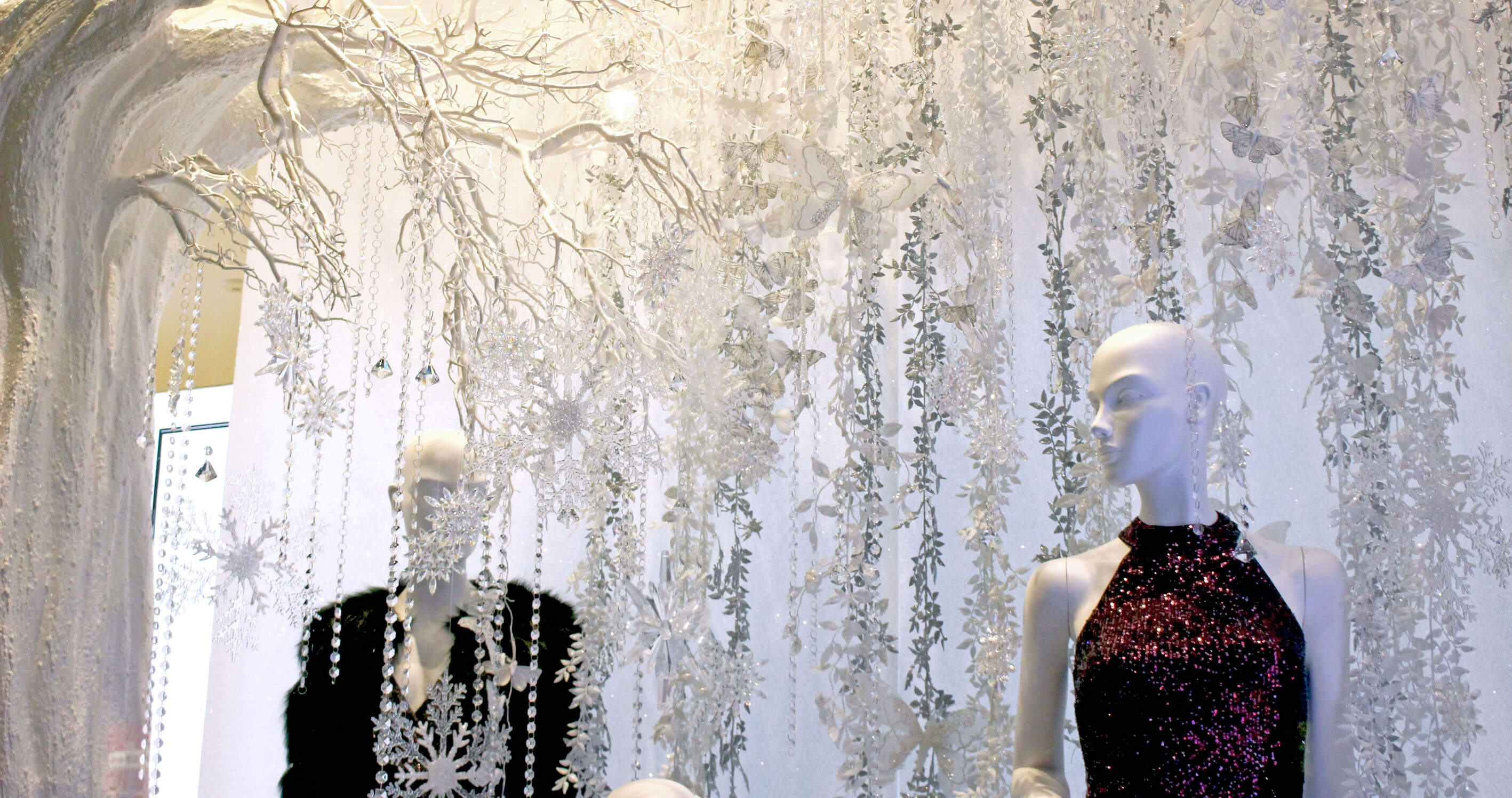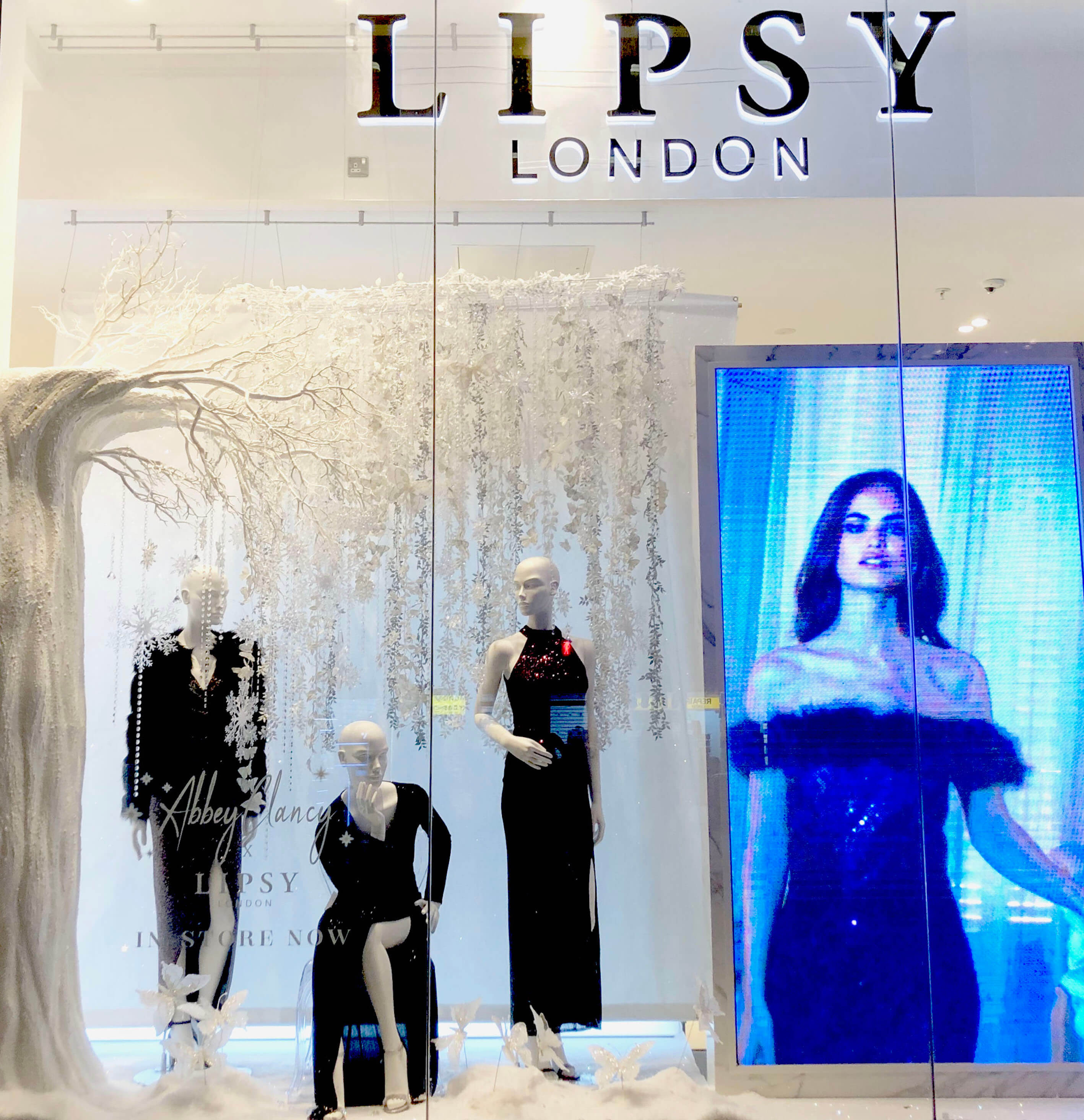 Hello Flamingo sculpted a crystallised white tree this was embellished with cascading flowers, elegant crystals and ornamental snowflakes. This was displayed with a snowy blanket and glistening butterflies to embrace the season and to create an atmospheric setting, of which the clothes were displayed. Flower columns were made of individually cut ivory assorted flowers and formed into waves that wrapped columns to complement Lipsy’s colour palette whilst keeping the display design consistent.