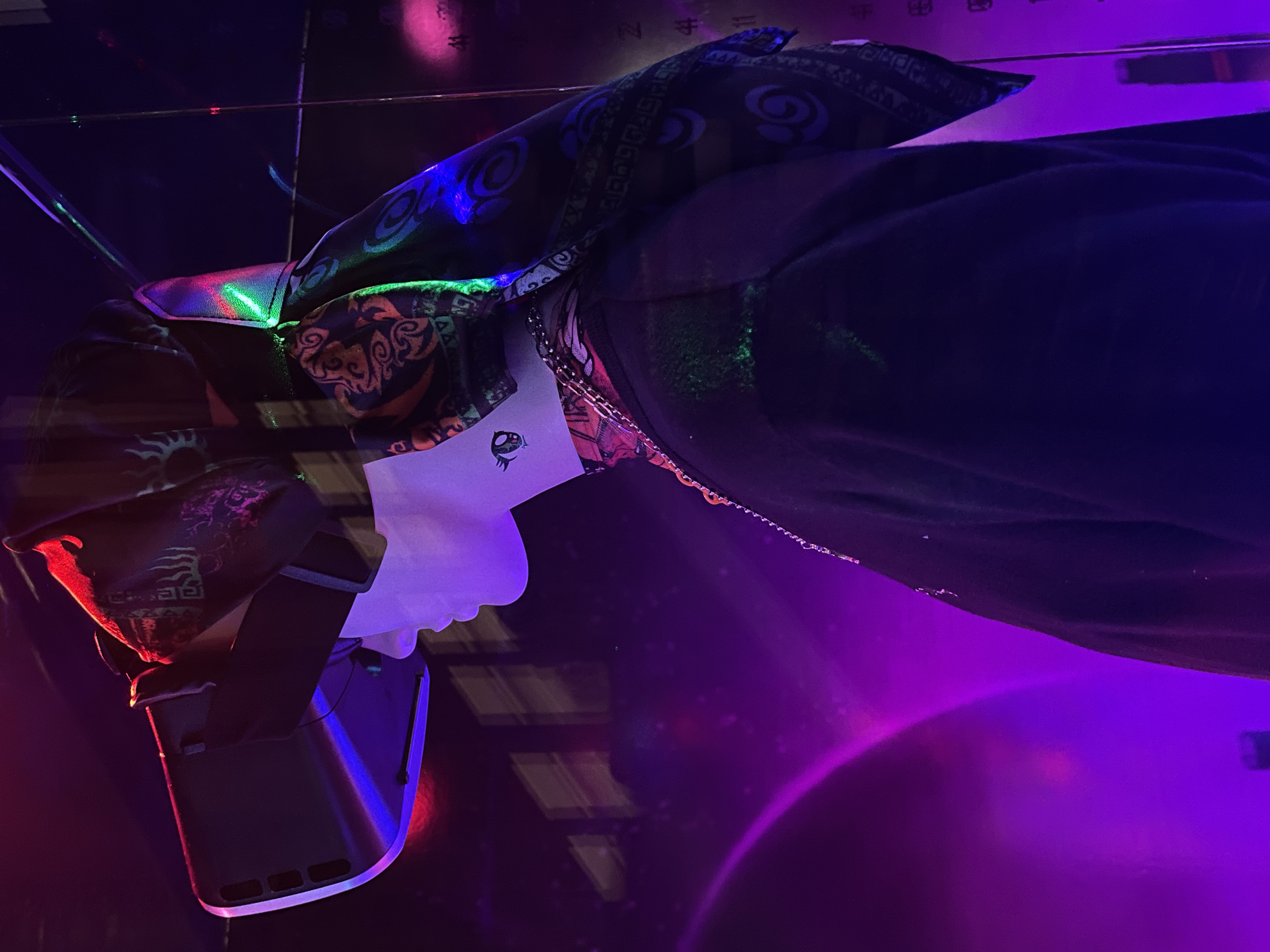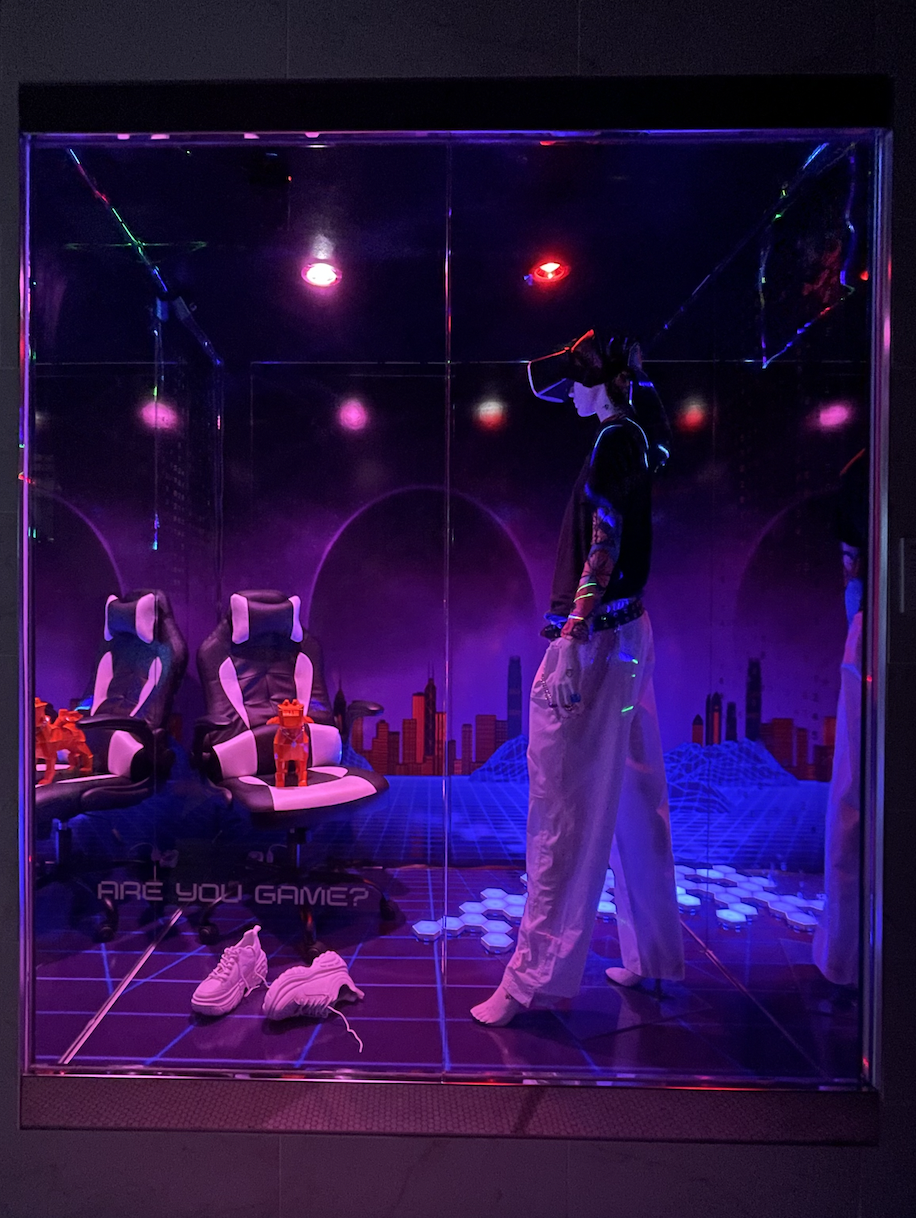Our window is inspired by the world of gaming – specifically how gamification is becoming increasingly important within the fashion industry. It has become a trending topic in our classes at SCAD and our goal for this window was to continue its relevance at Morris Hall, reinforcing the importance gaming is to the future of fashion and our lives. We focused on lighting and color, which was implemented via laser lights, light-up tiles, light filters. Our hero image was positioned on the back wall and floor to set the tone for the 3D environment our subject is experiencing through VR.