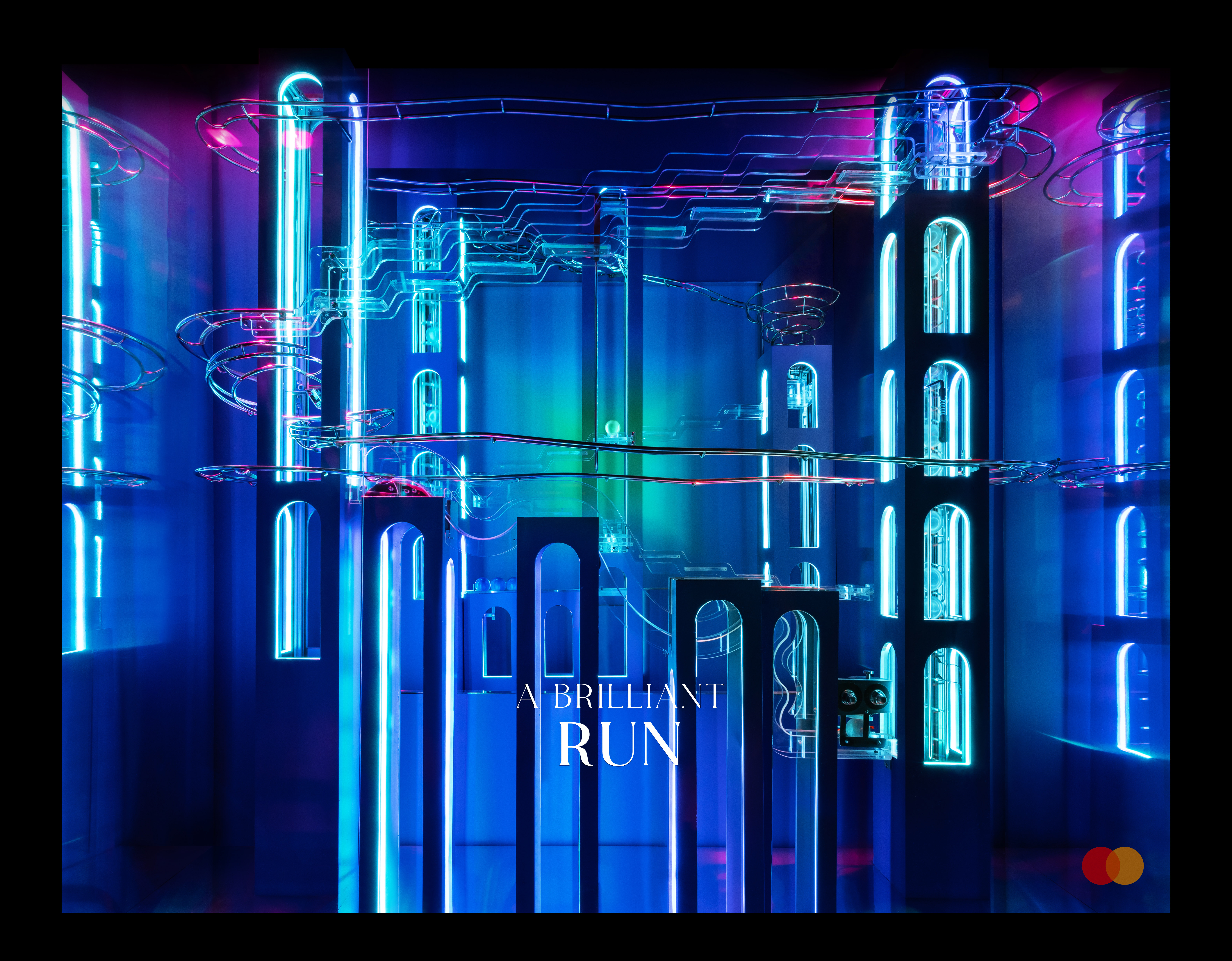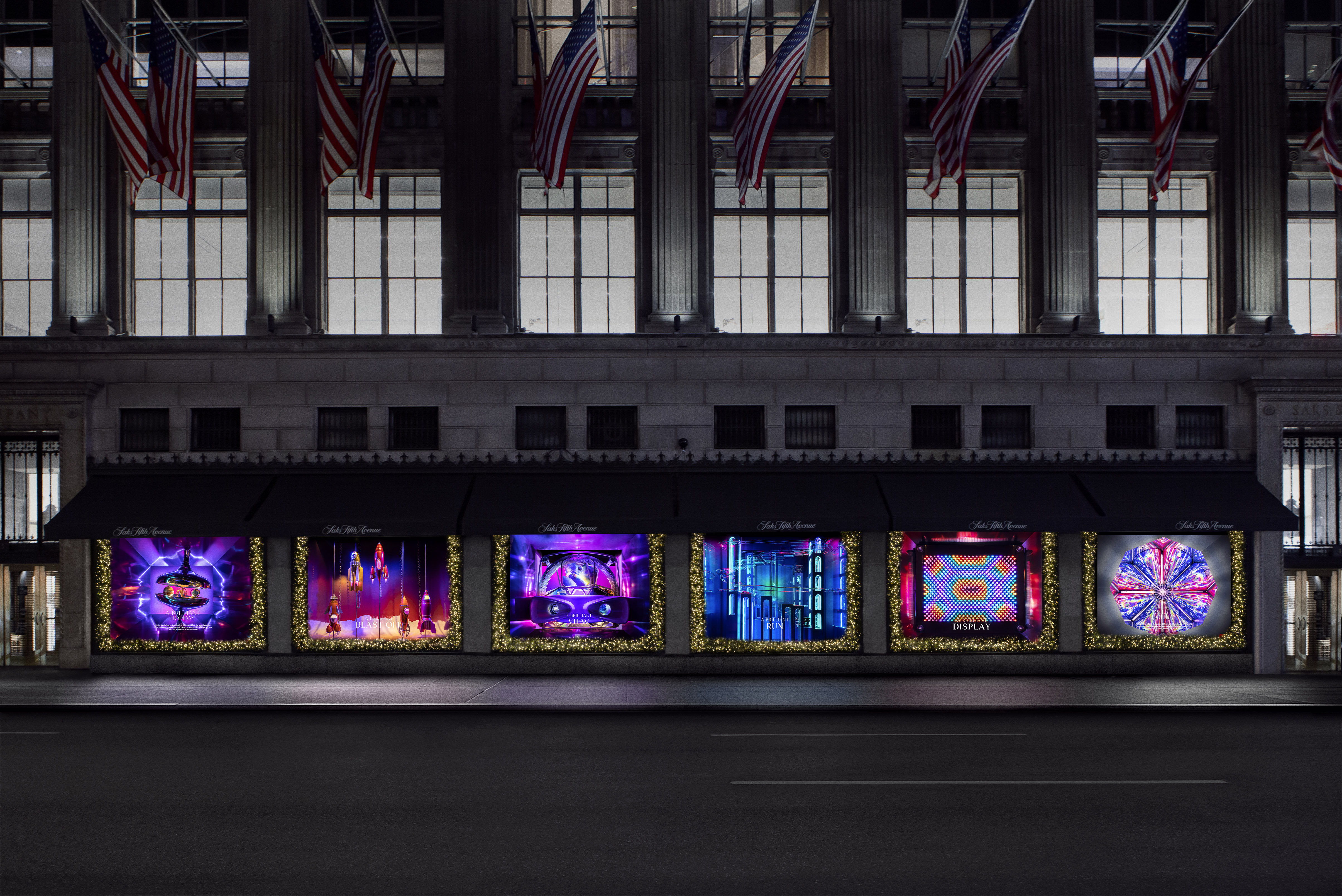 A giant scale spinning top defies gravity by rotating and opening to reveal a glowing celestial solar system. We've taken the iconic toy rocket, and created a whimsical rocket race. Our next window celebrates the memory of using a View-Master, with 3 fantastical destinations highlighted in a dynamic, rotating structure. The classic marble run has grown into a hyper surreal and colorful infinity room. Next, we've recreated the magic of using a Lite-Brite by creating an evolving display of color that takes iconic holiday images that explode into vibrant patterns. Our last Center Six window features a giant, mesmerizing kaleidoscope of light that rotates within a spectacular world.