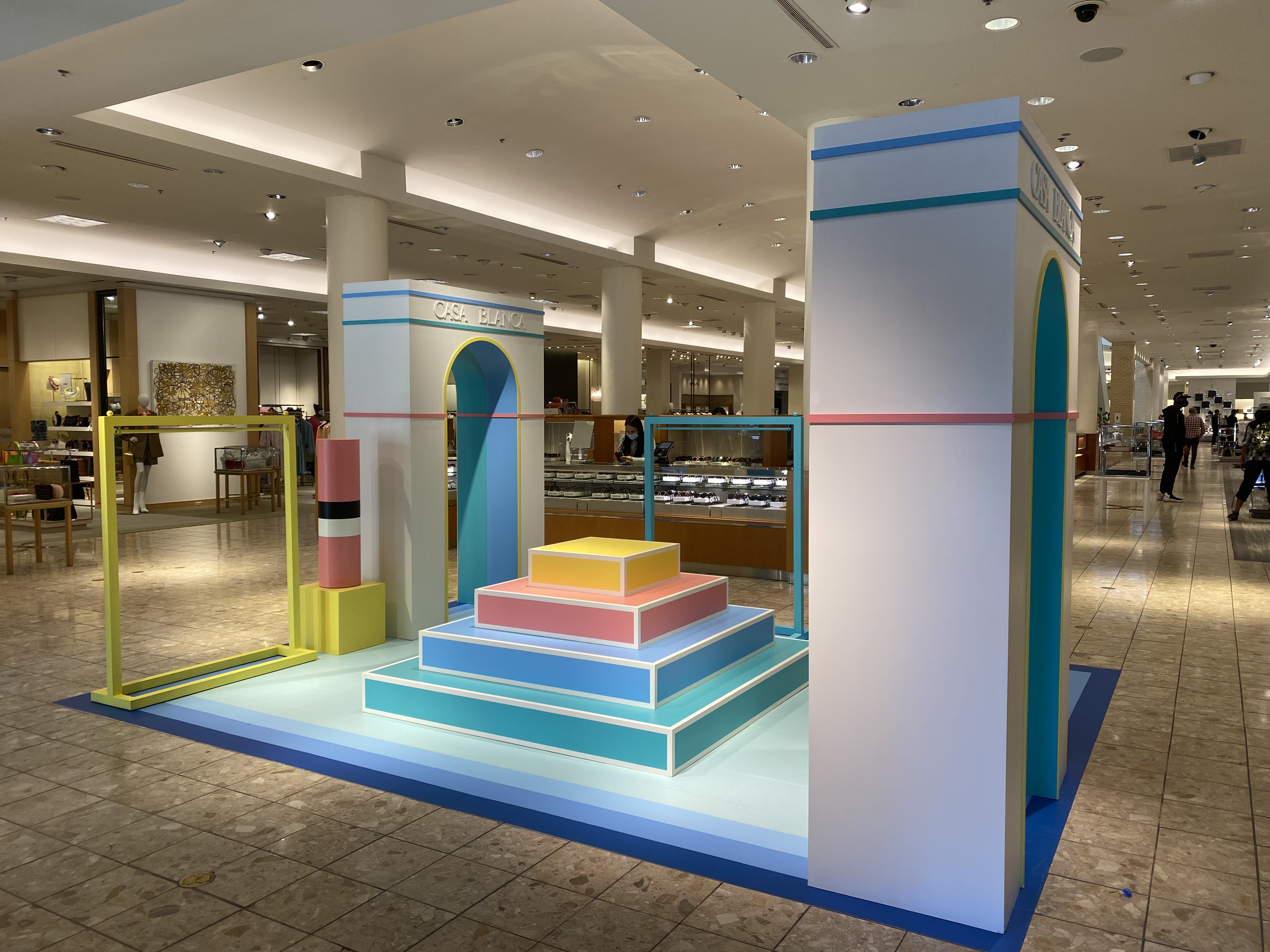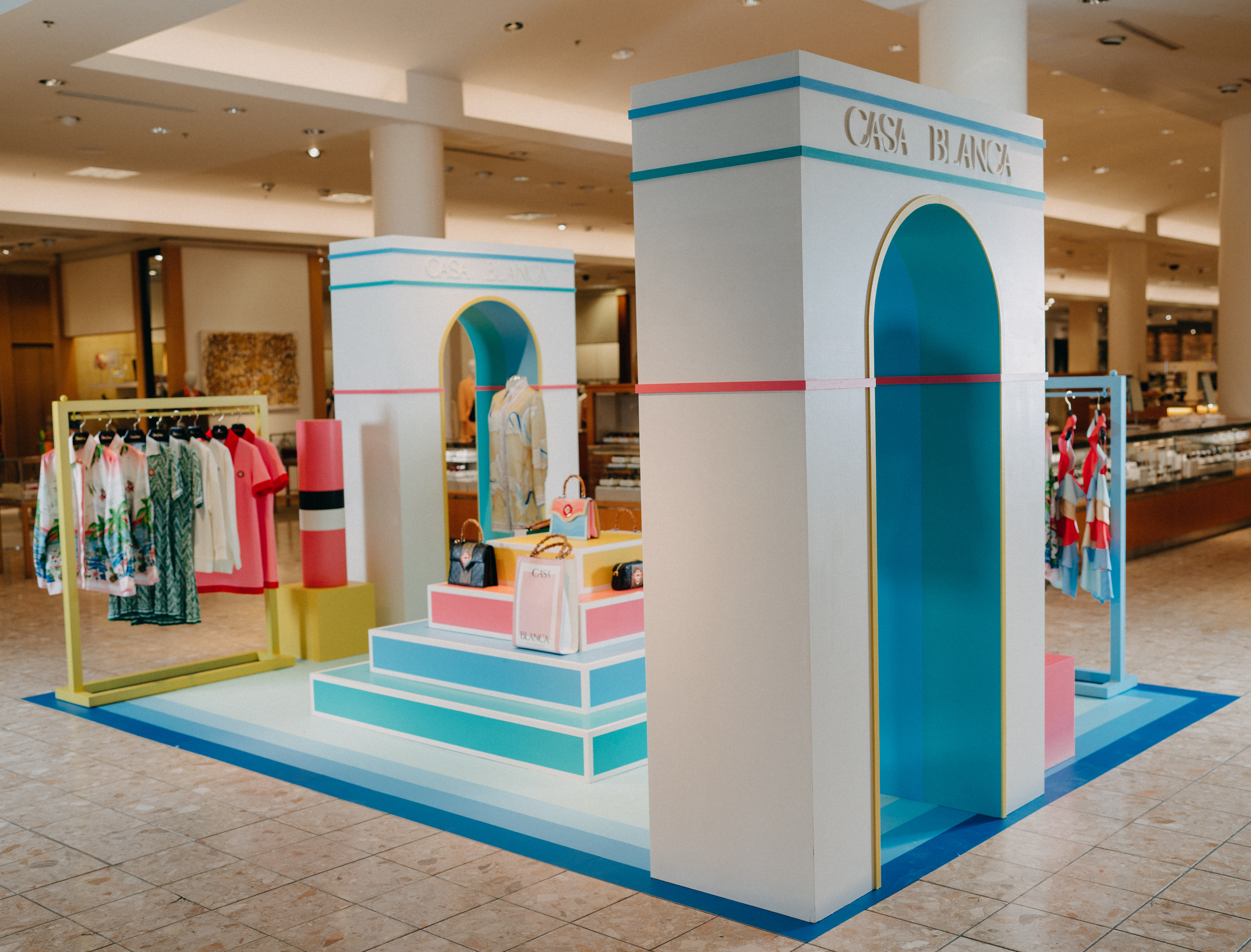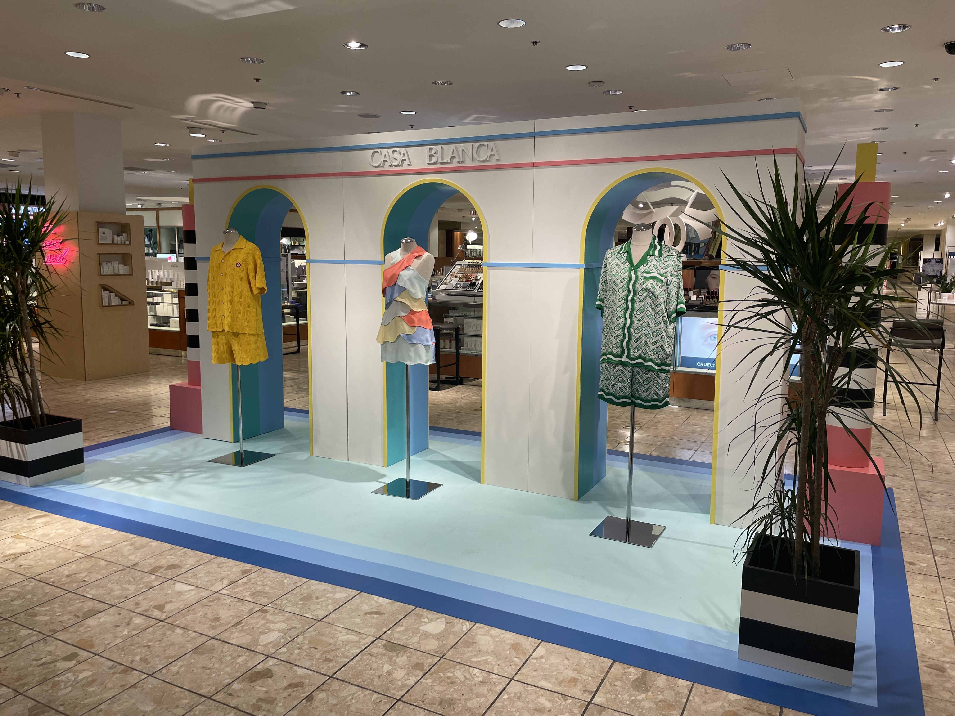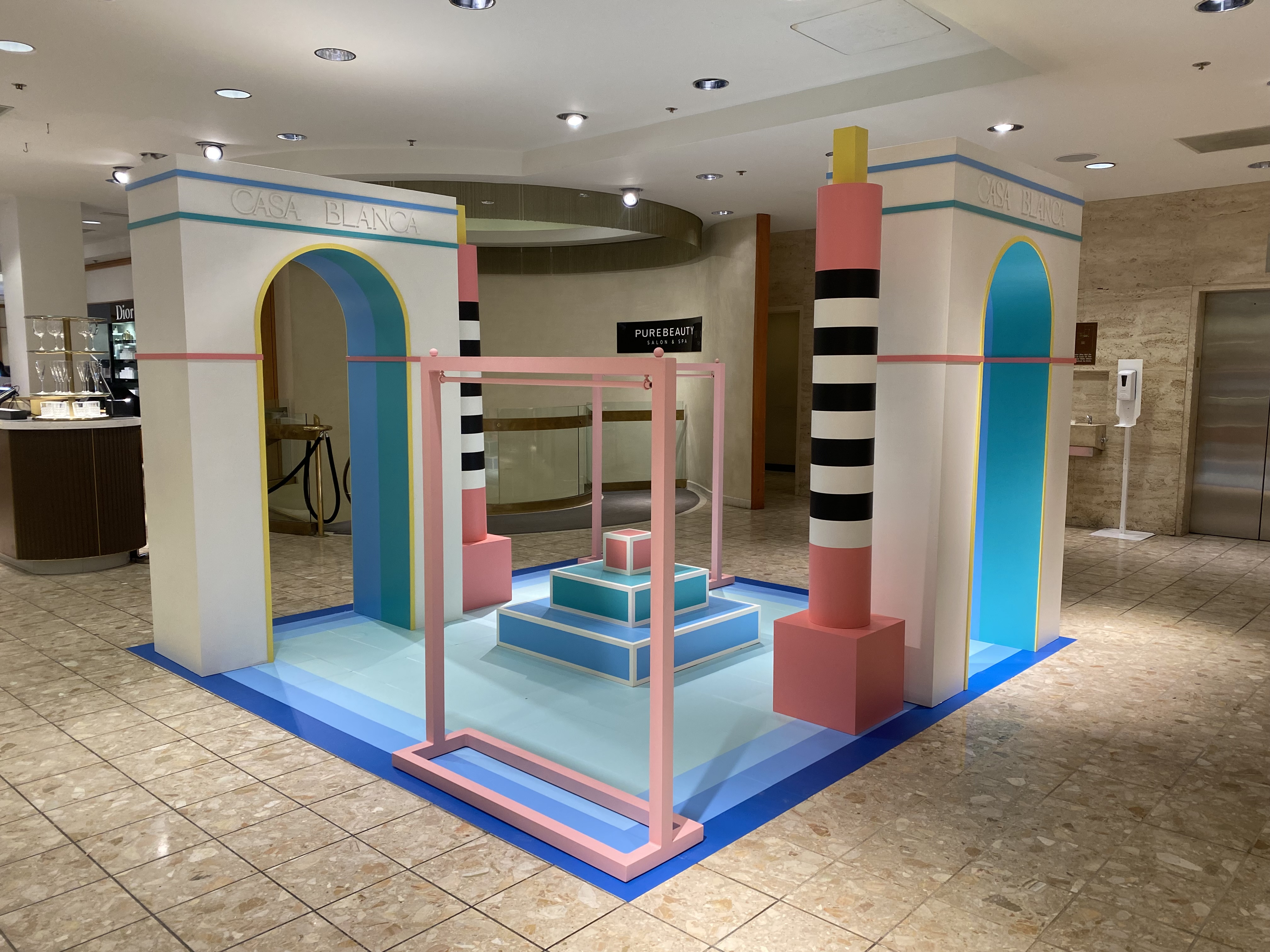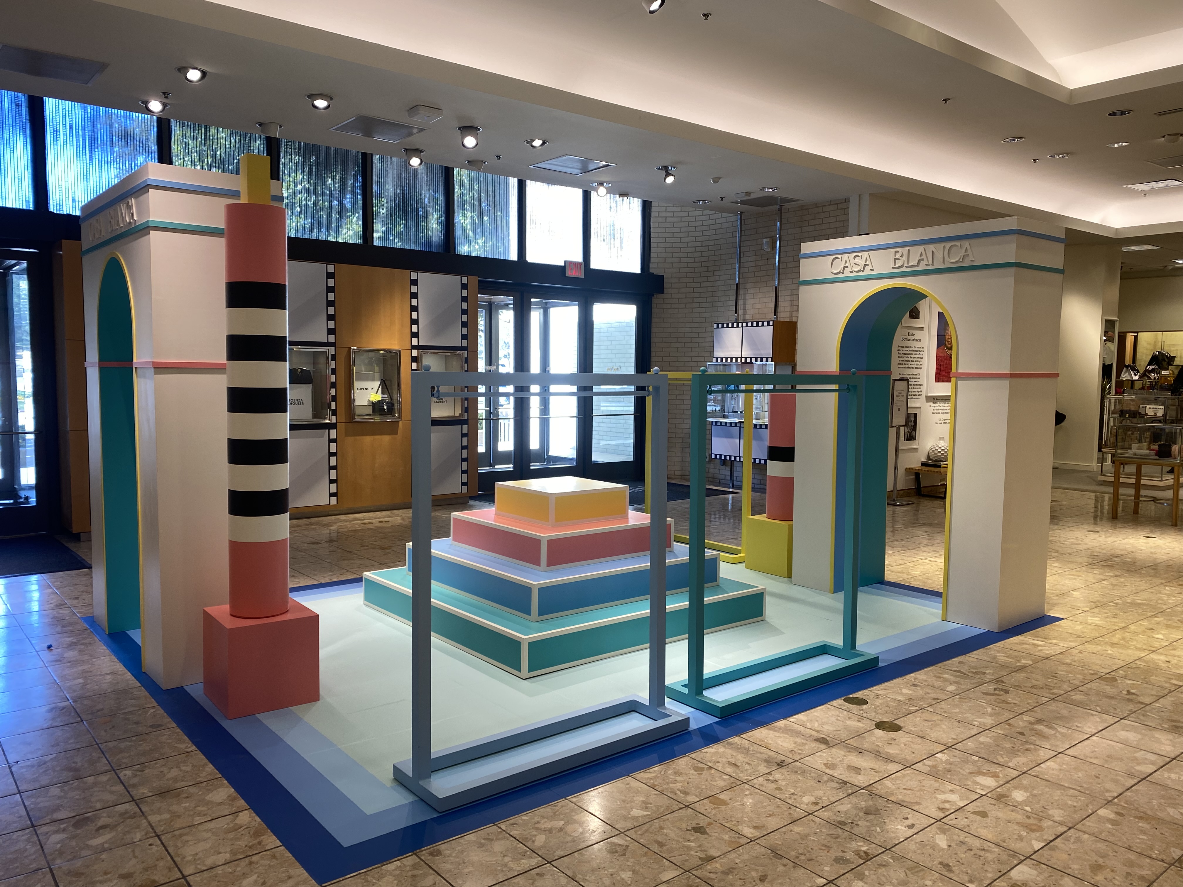 Pop-in displays fabricated and installed by Zero Productions for display at Neiman Marcus at Northpark Center in Dallas, TX. These displays highlighted Casa Blanca's SS 2022 collection titled Desert Phantastica and was designed to highlight the interconnection between the architecture and nature of Palm Springs. Another inspiration for the design of these displays was the 1996 Los Angeles Summer Olympics.