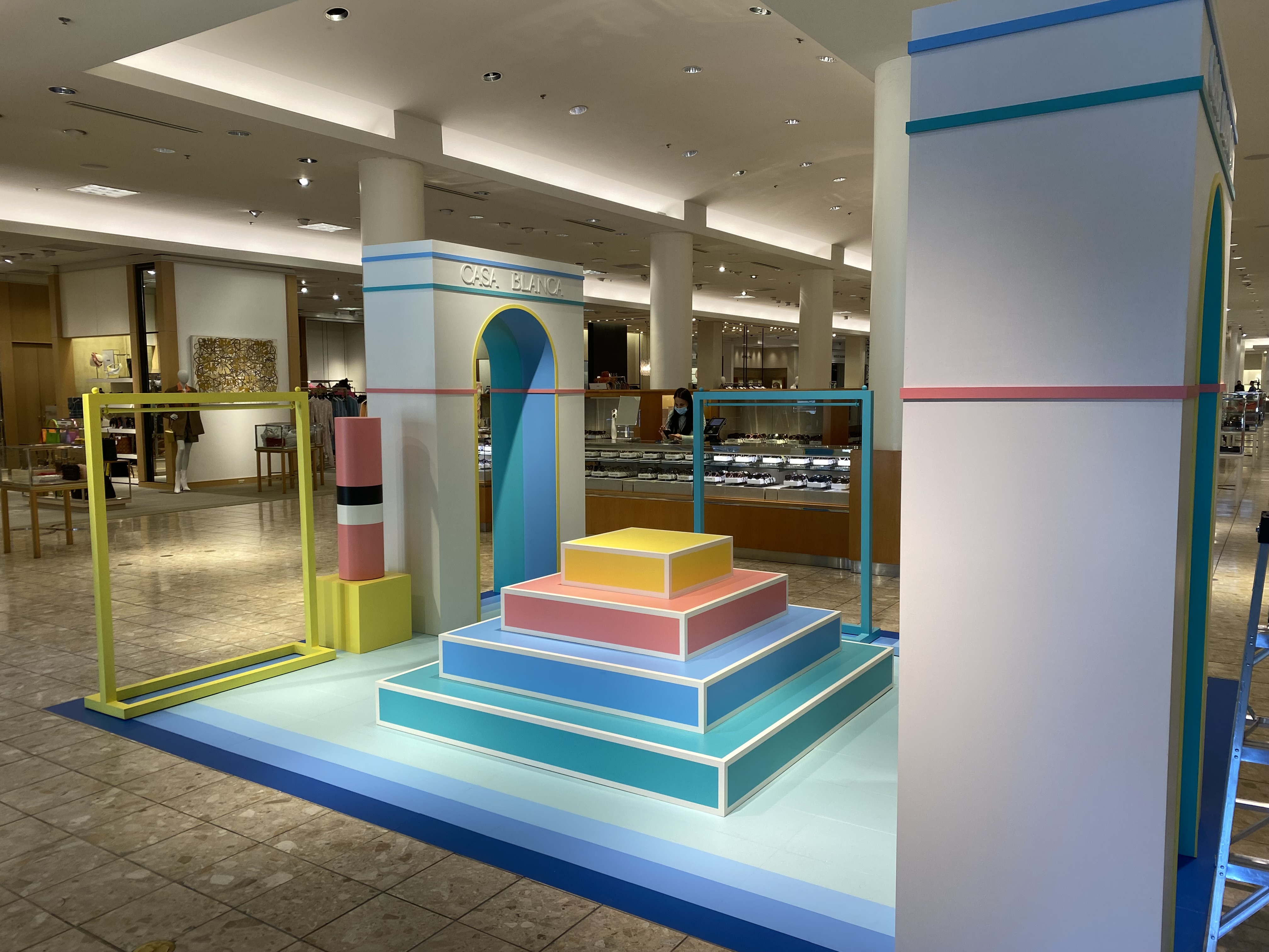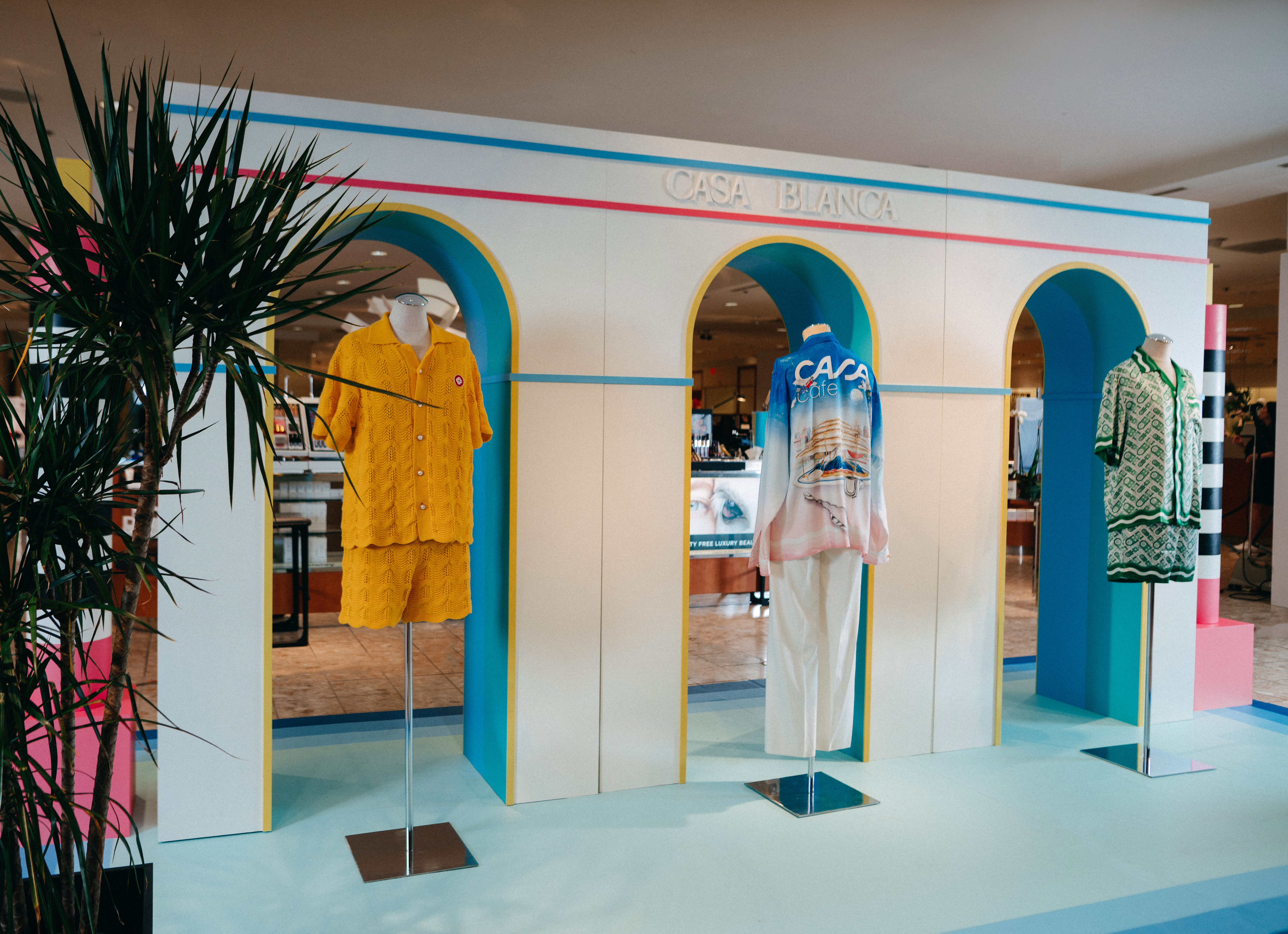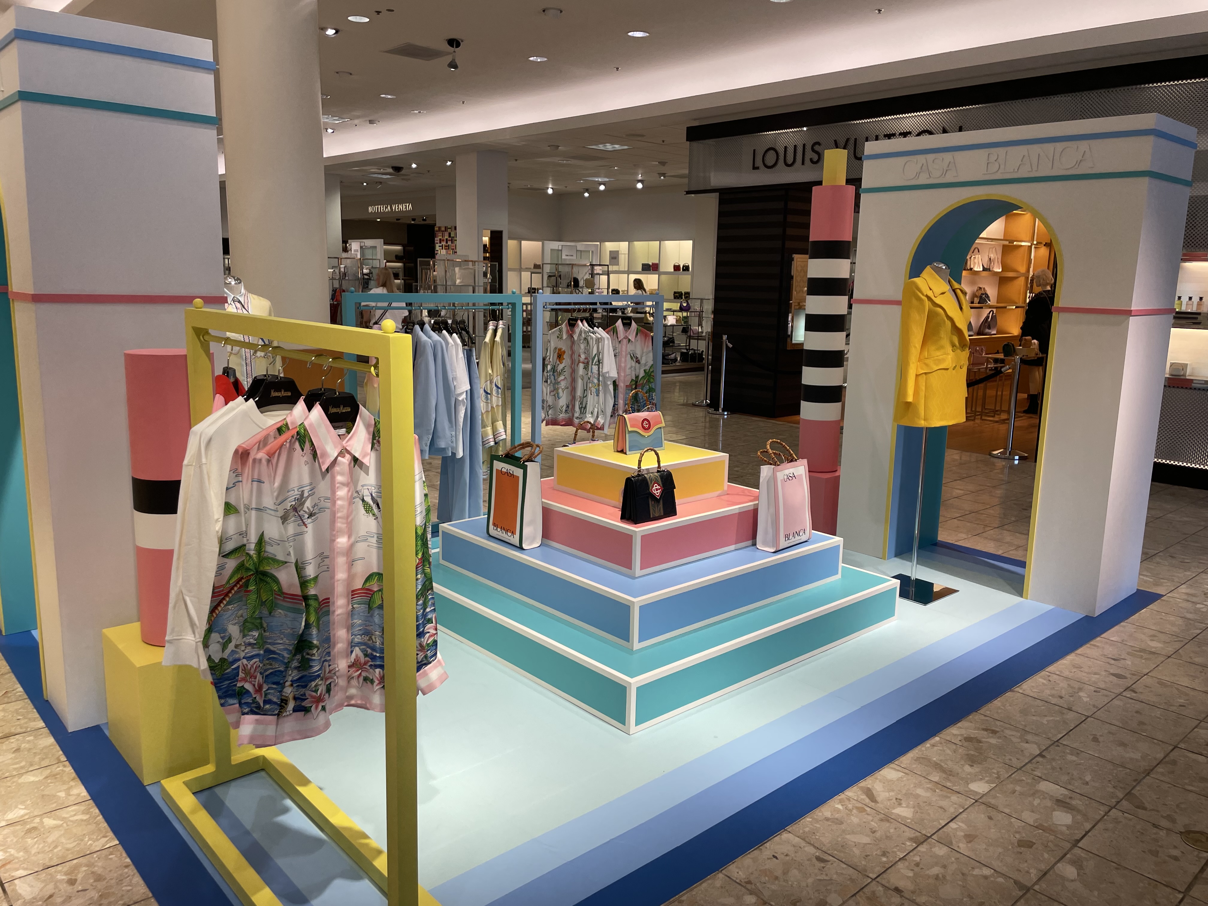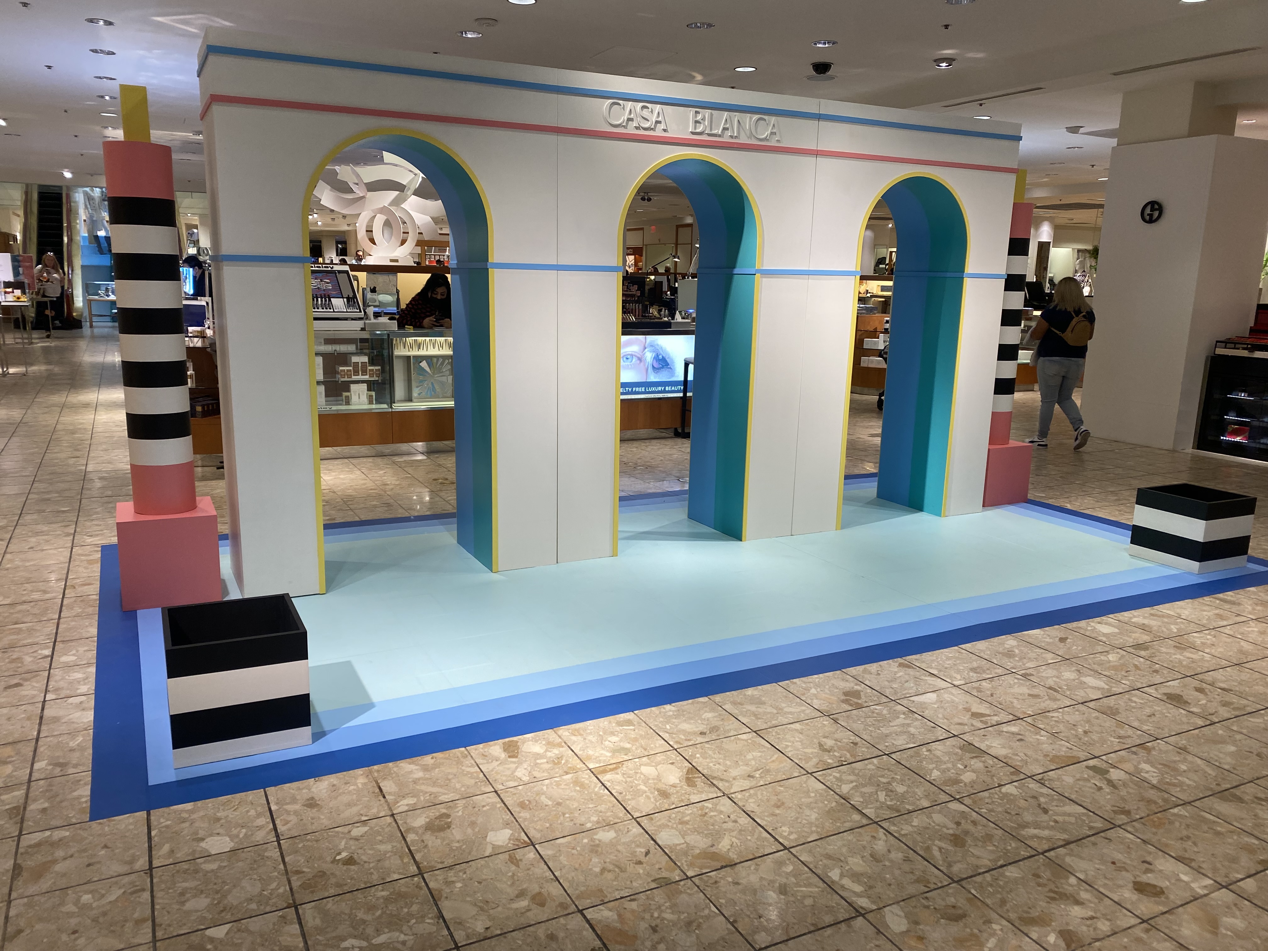 Pop-in displays fabricated and installed by Zero Productions for display at Neiman Marcus at Northpark Center in Dallas, TX. These displays highlighted Casa Blanca's SS 2022 collection titled Desert Phantastica and was designed to highlight the interconnection between the architecture and nature of Palm Springs. Another inspiration for the design of these displays was the 1996 Los Angeles Summer Olympics.