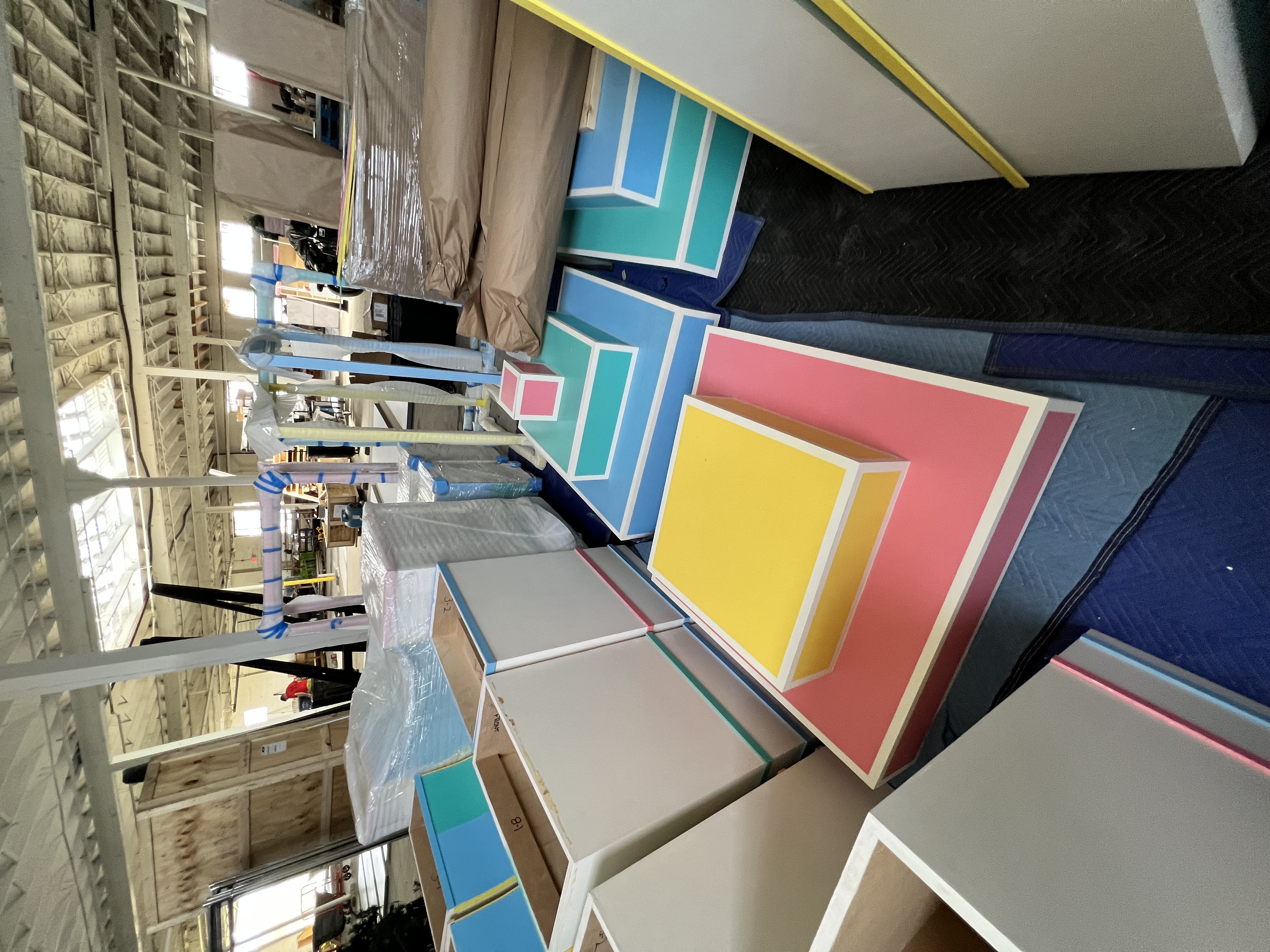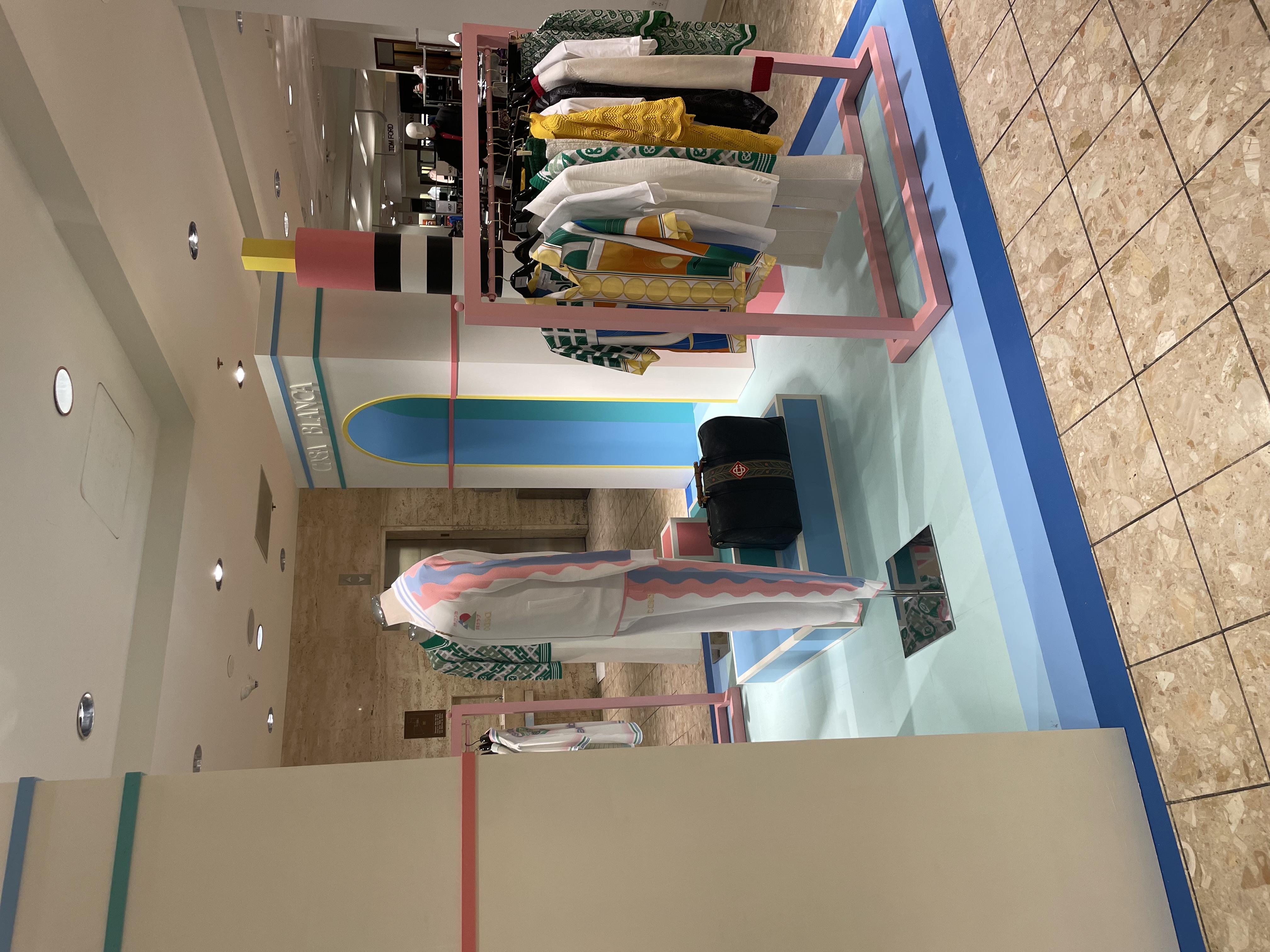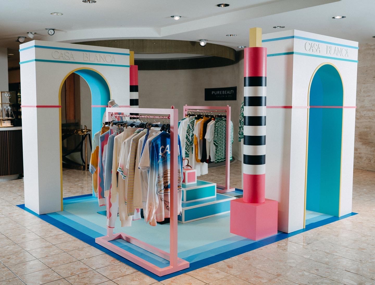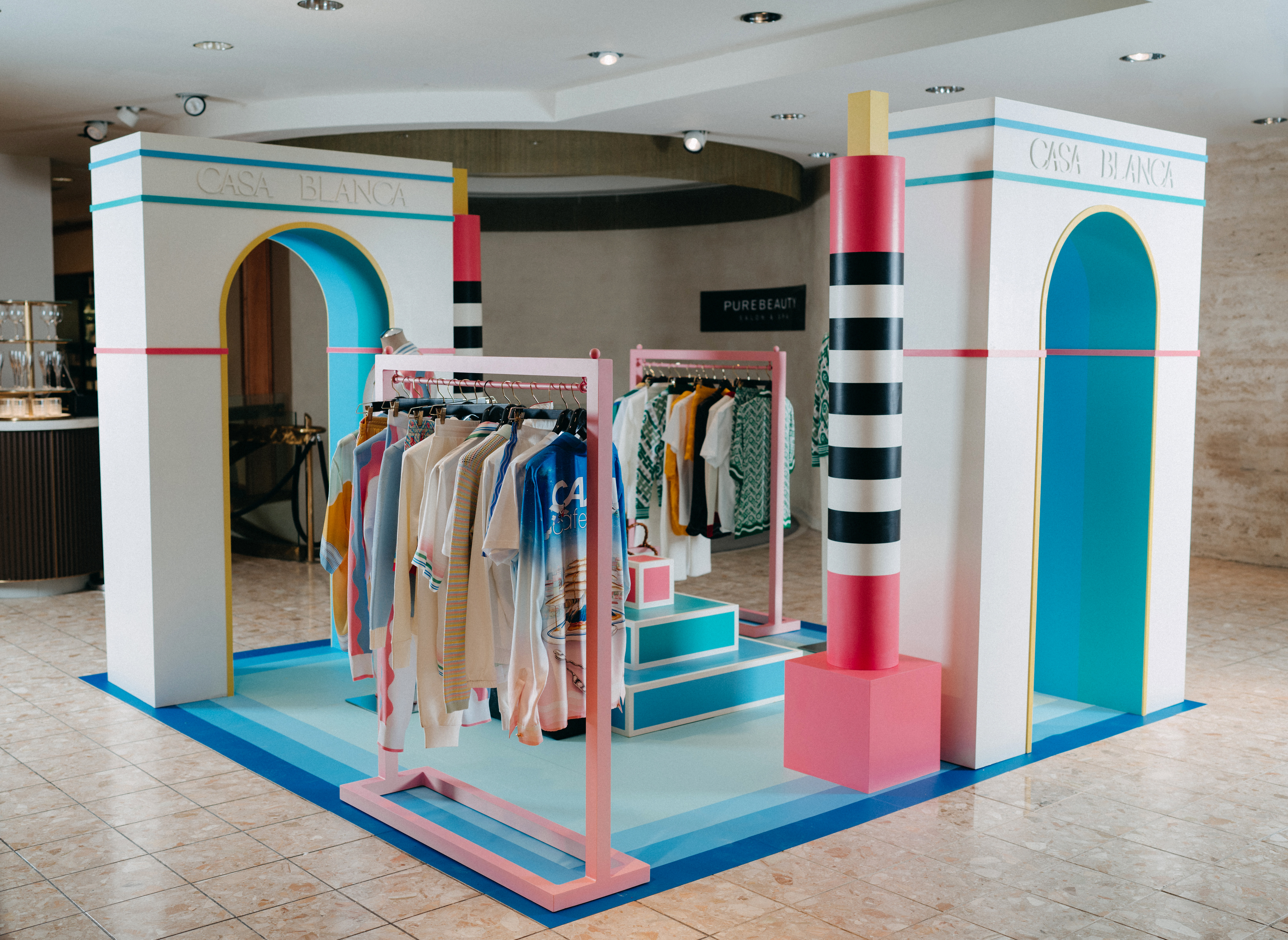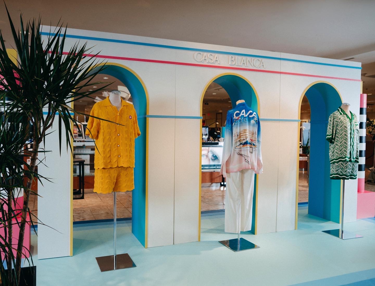 Pop-in displays fabricated and installed by Zero Productions for display at Neiman Marcus at Northpark Center in Dallas, TX. These displays highlighted Casa Blanca's SS 2022 collection titled Desert Phantastica and was designed to highlight the interconnection between the architecture and nature of Palm Springs. Another inspiration for the design of these displays was the 1996 Los Angeles Summer Olympics.