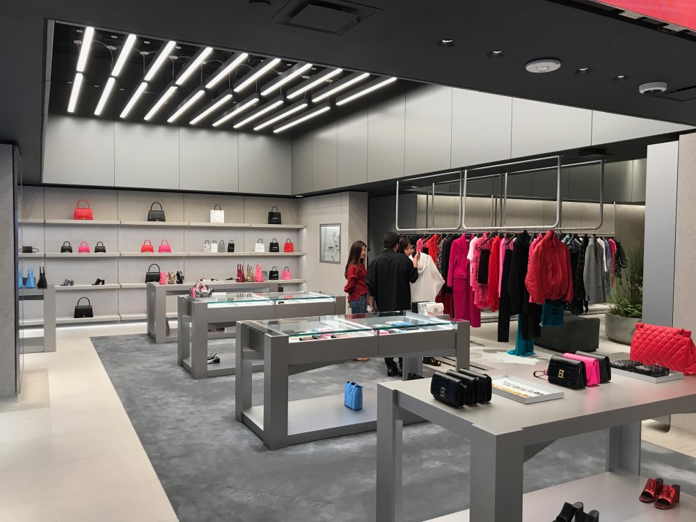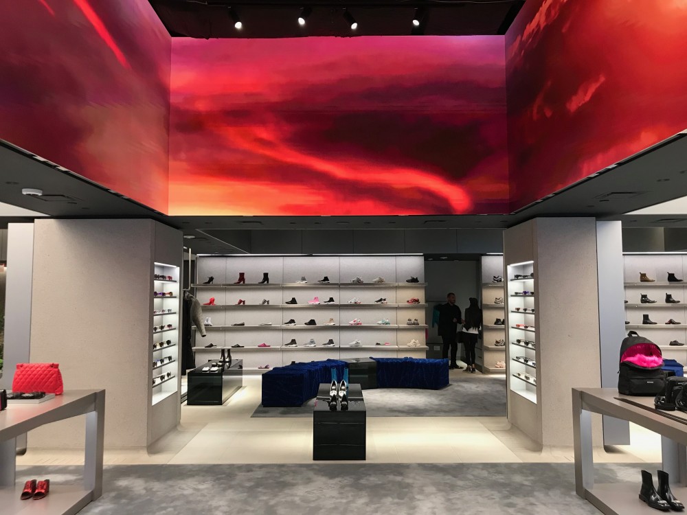southwest corner of 59th Street in Manhattan, represents creative director Demna Gvasalia‘s urban retail concept, which has an industrial spirit with touches of metal, concrete, and shades of gray. The public domain concept features a mix of elements from metropolitan exterior design and original artwork. Wraparound screens play videos of different types of skies. Hero products from the runway are displayed on hyper-realistic mannequins for maximum impact. Across one wall, the