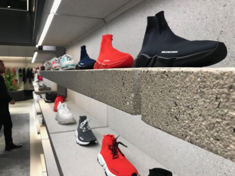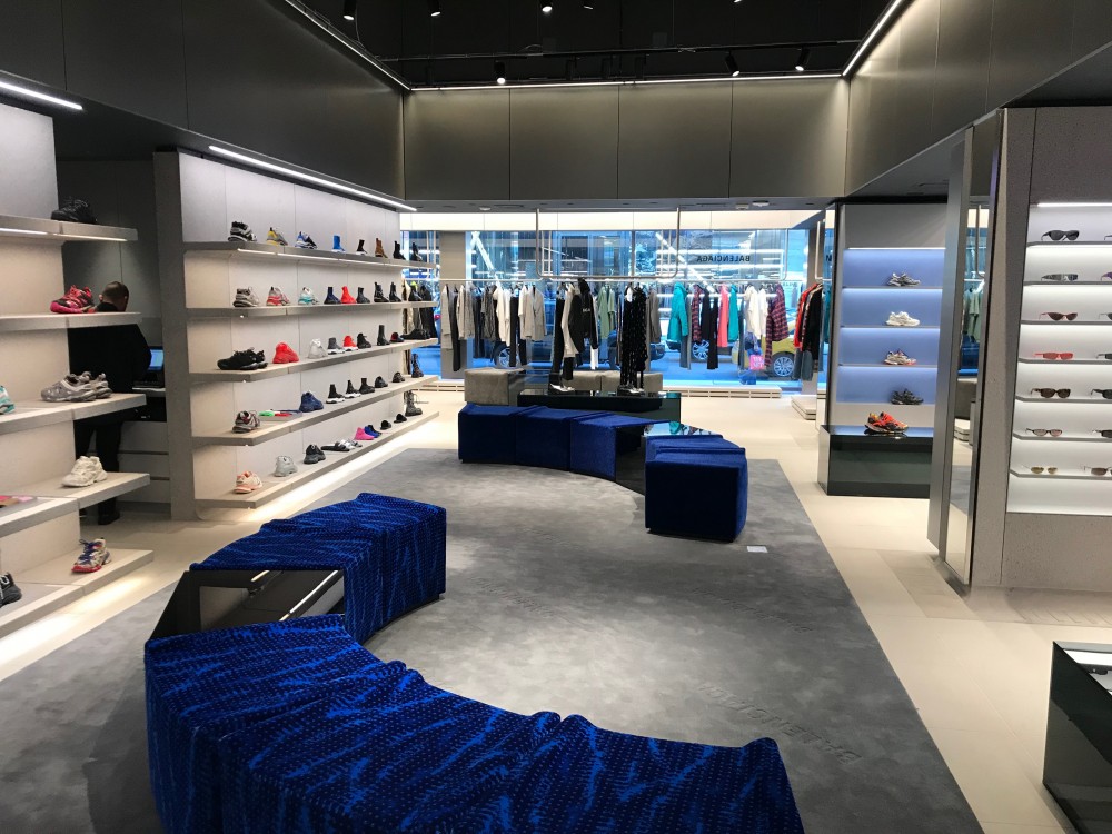 men’s and women’s shoe areas run the gamut of footwear. The Balenciaga logo is embossed across the gray carpeting. Throughout the unit, seating is upholstered in patterns inspired by public transportation, and benches resemble those in subway stations or parks. A piece by artist Tobias Spichtig is displayed at the flagship. Spichtig made the sculptures by dipping archival Balenciaga garments in resin and