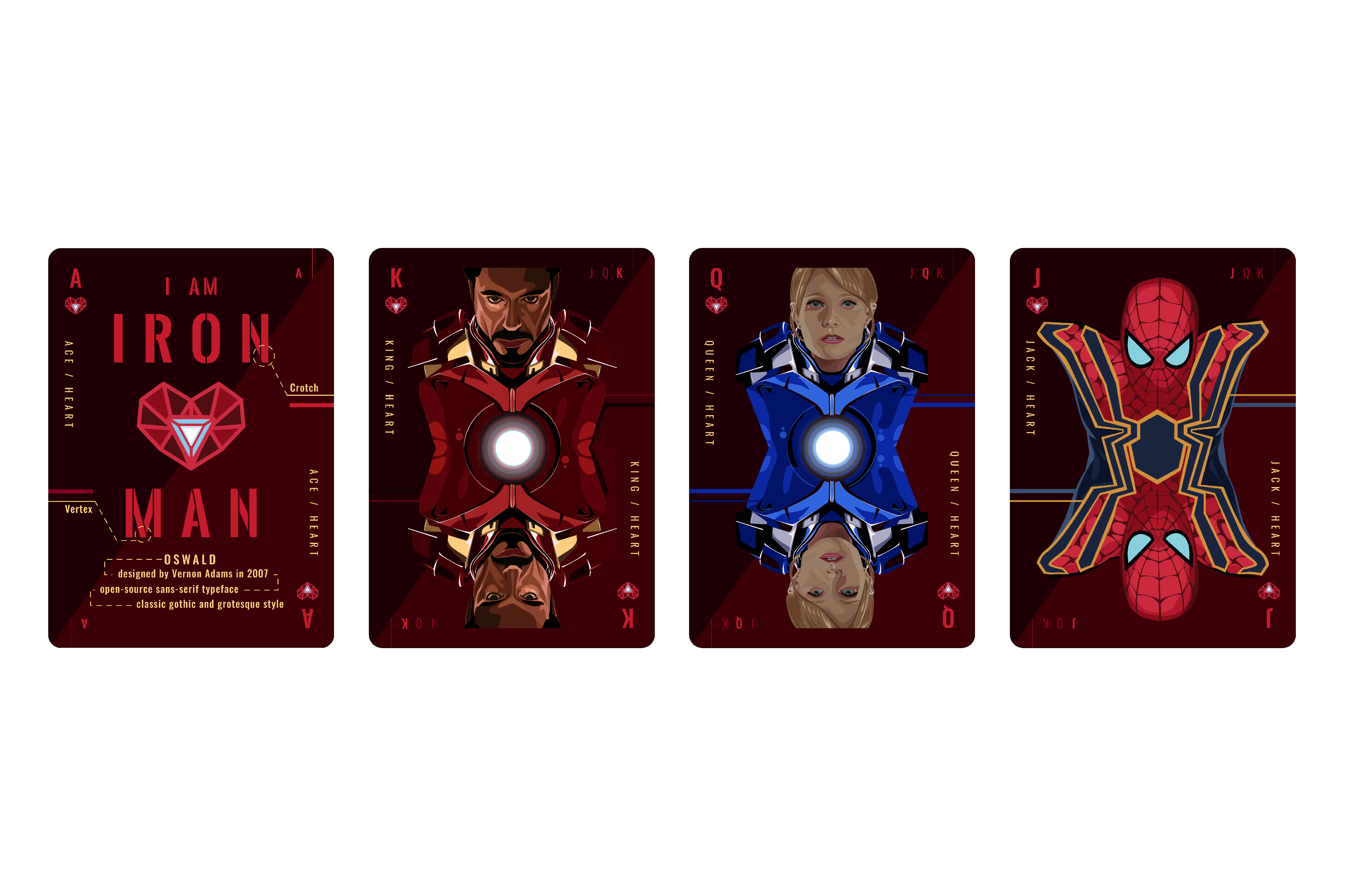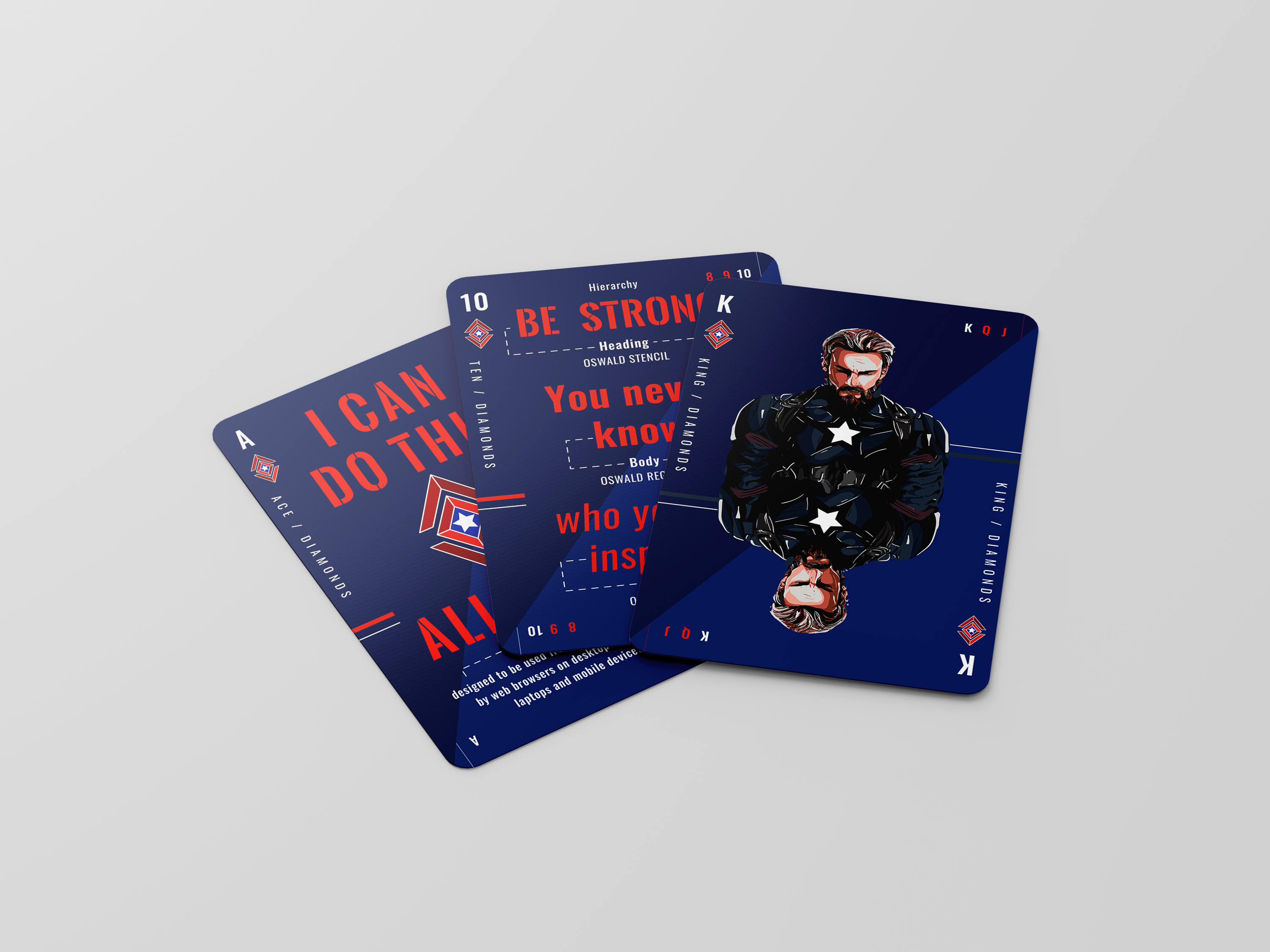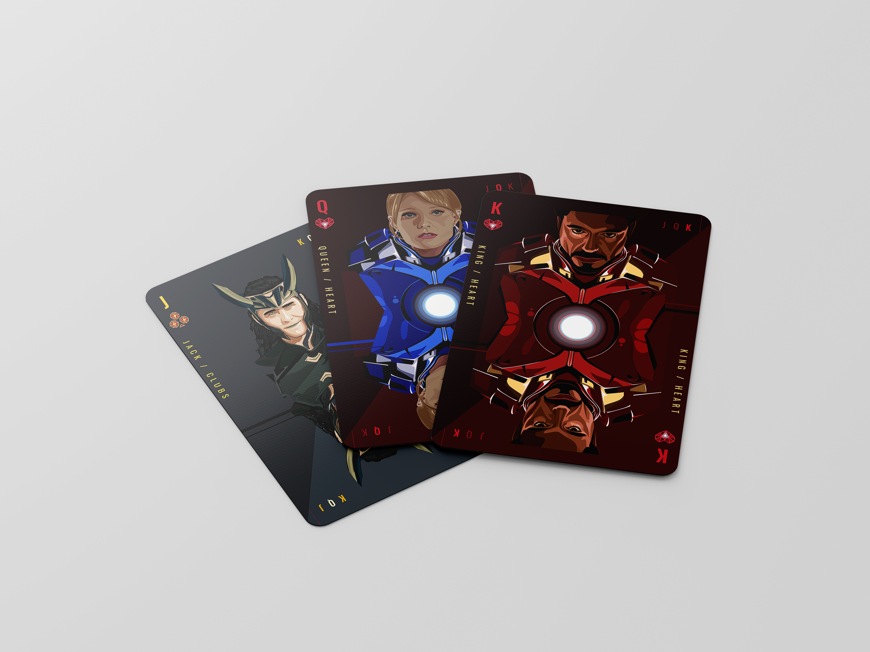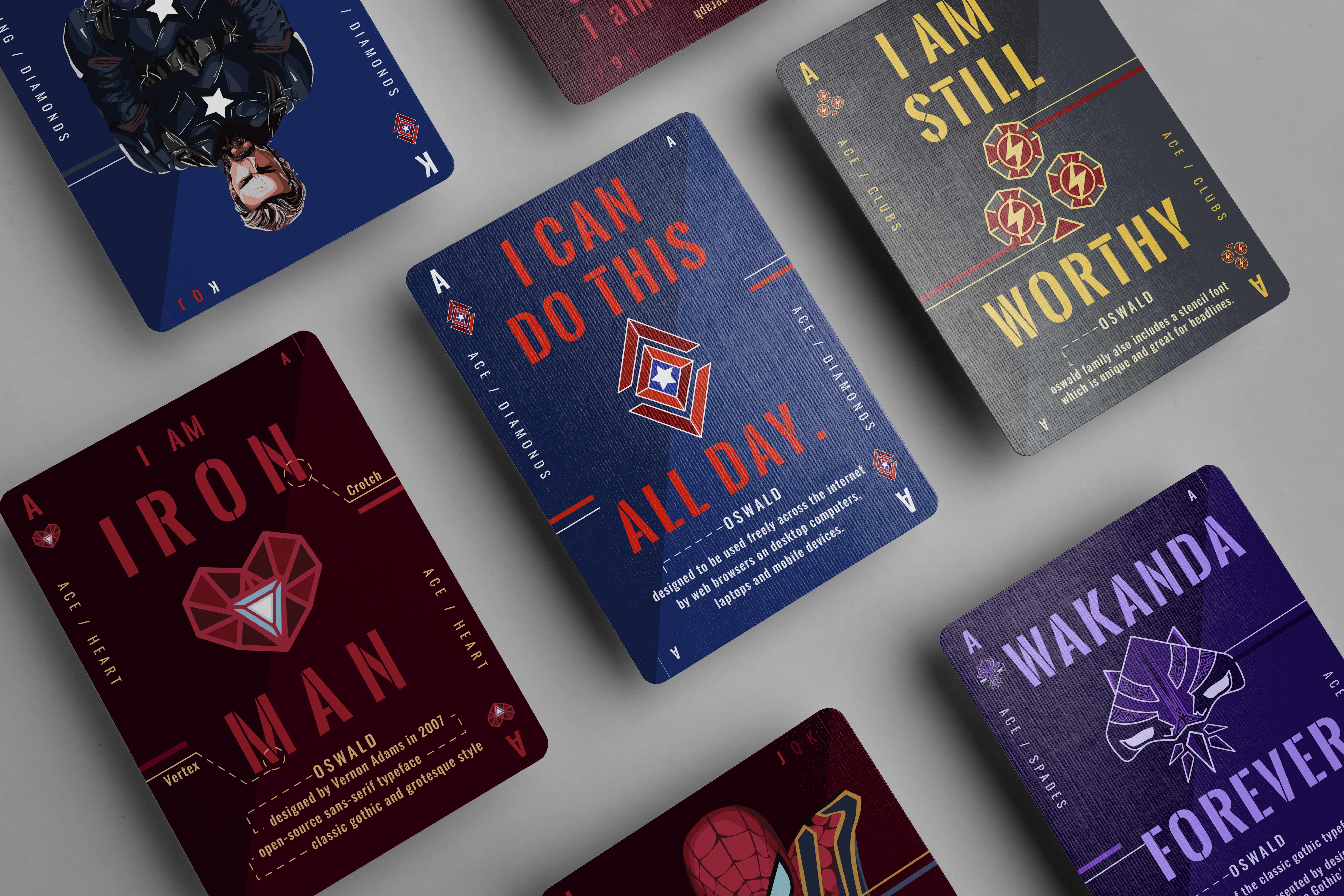 The final concept of this project is to showcase all the major characters of the Marvel Cinematic Universe in a creative and interactive form. The development of characters is inspired by the style of playing cards and the 4 suites are customized with specific logos. The typography used on the cards are the main dialogues used in the movies by characters to make it more personal and a perfect blend for all the Marvel fans.