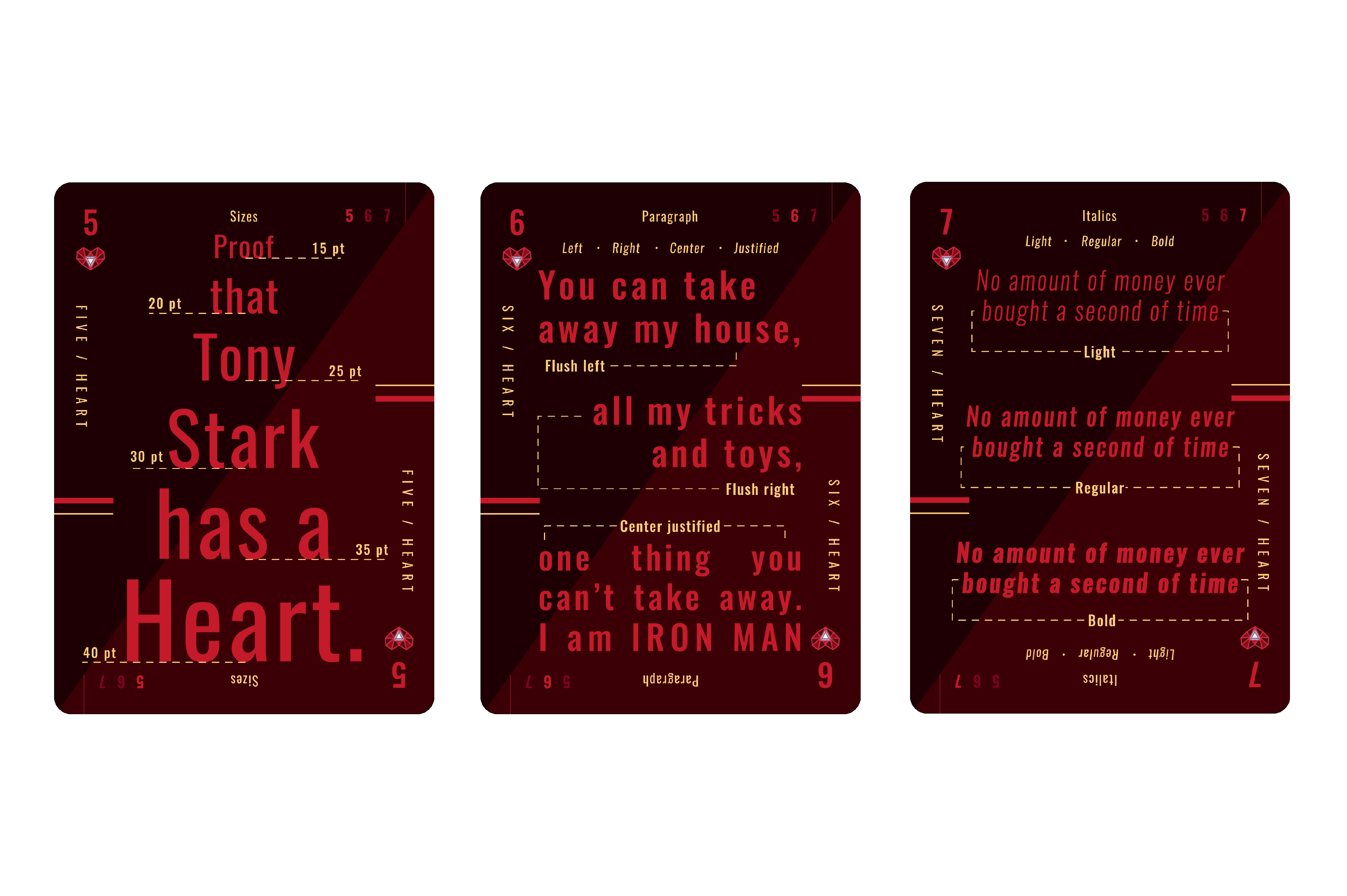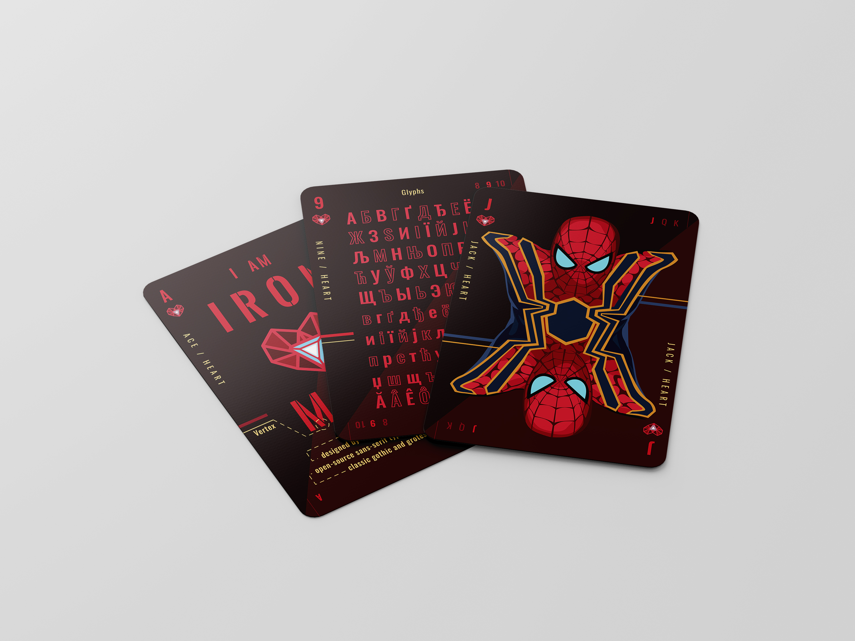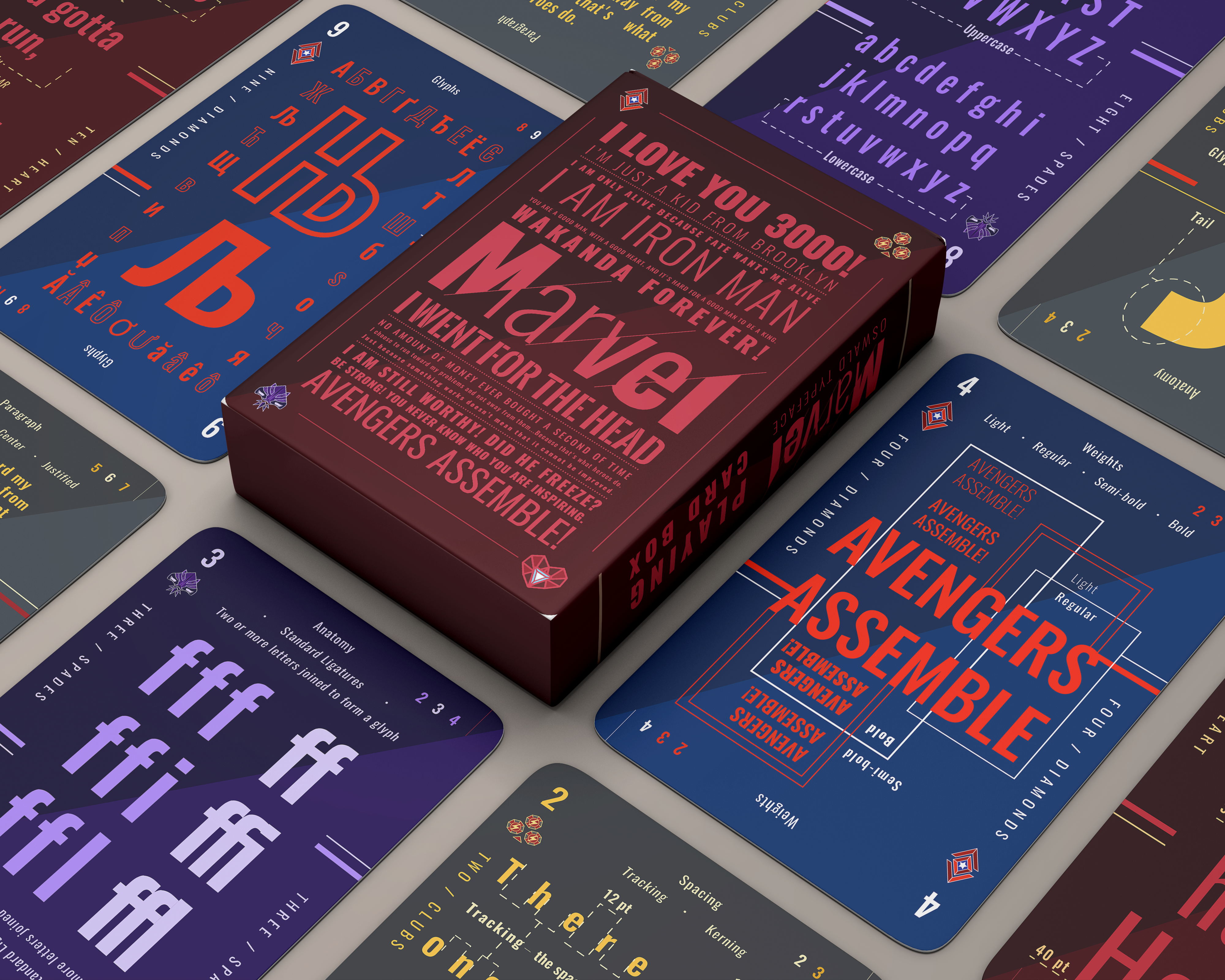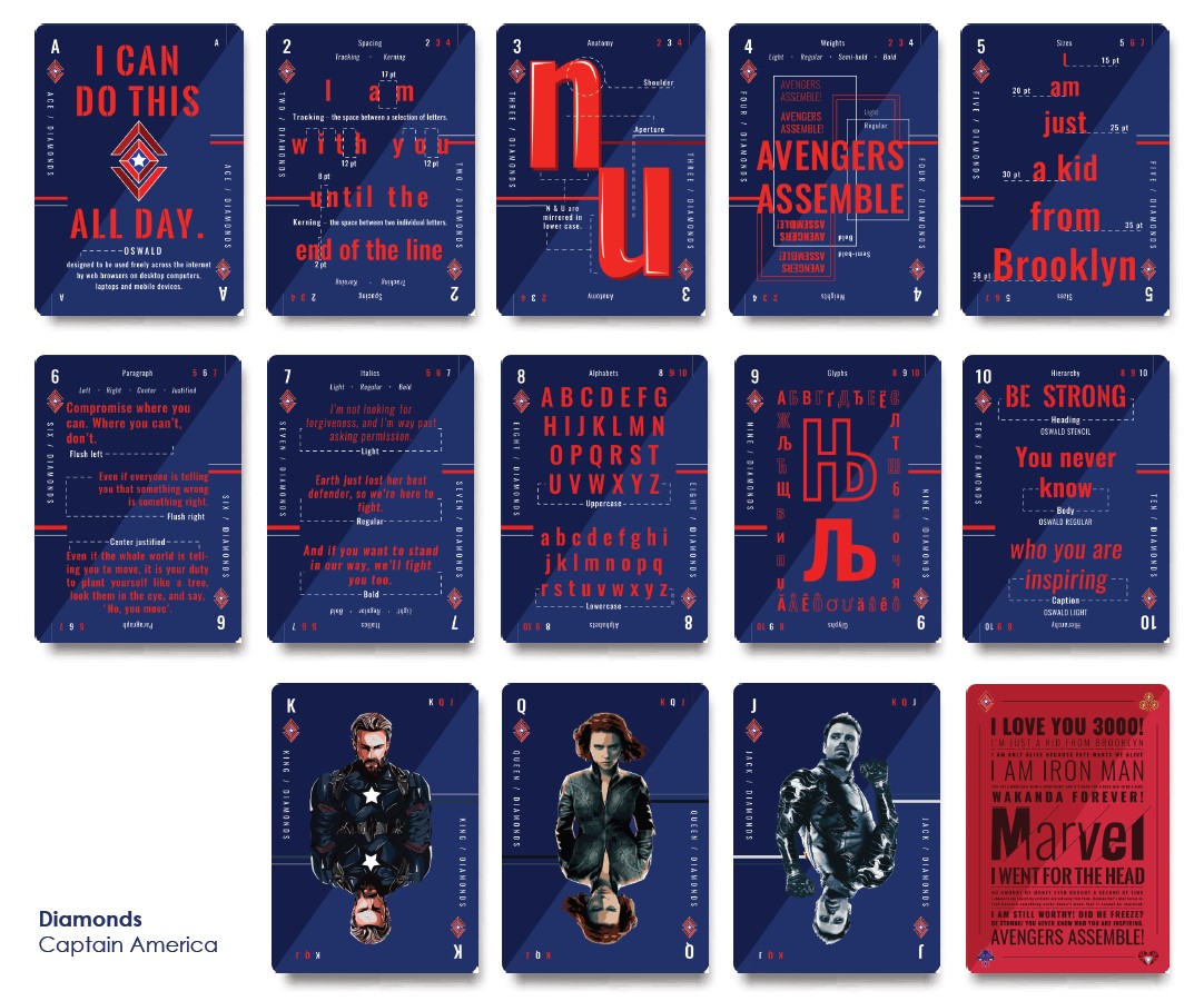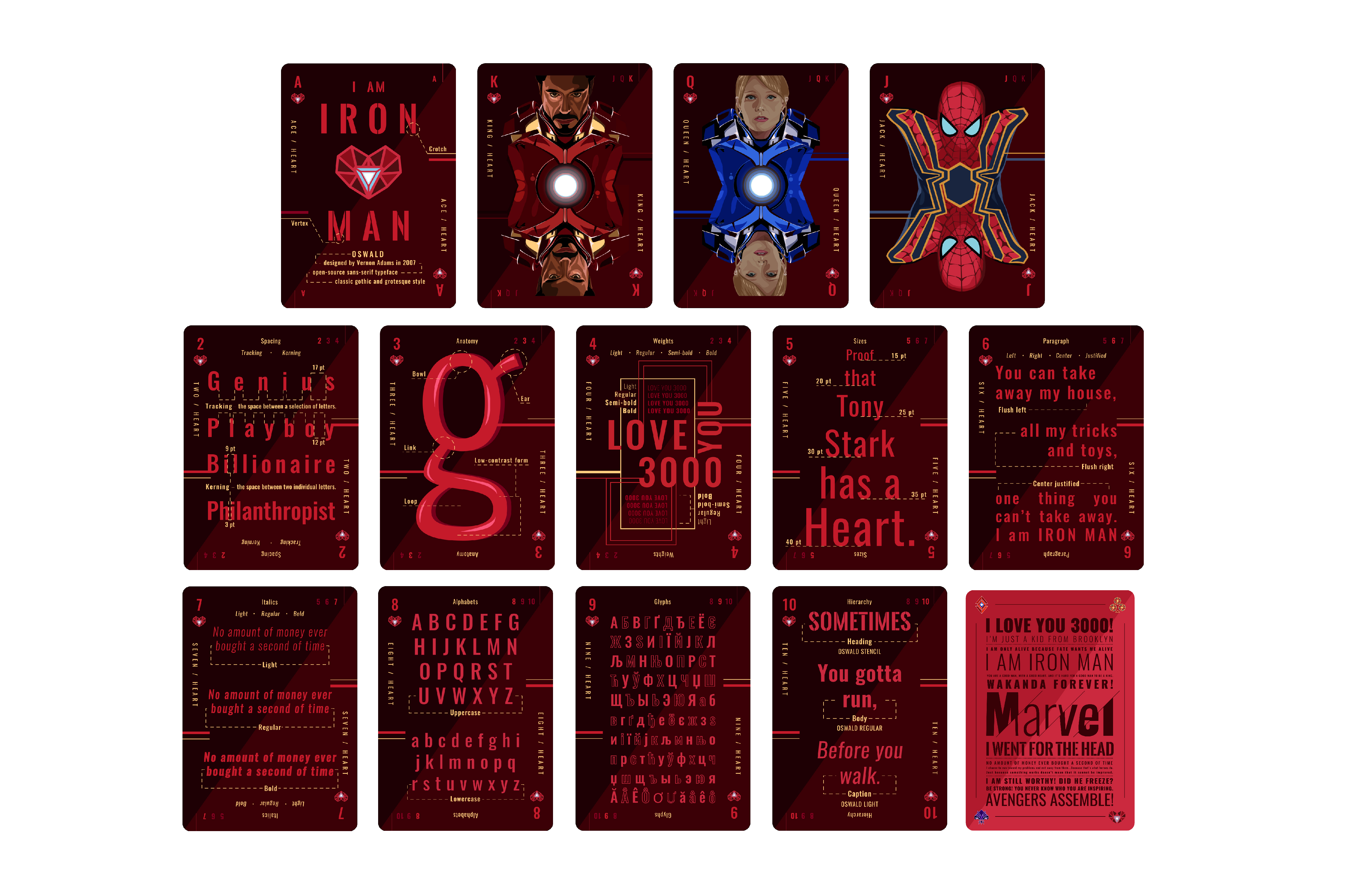 The final concept of this project is to showcase all the major characters of the Marvel Cinematic Universe in a creative and interactive form. The development of characters is inspired by the style of playing cards and the 4 suites are customized with specific logos. The typography used on the cards are the main dialogues used in the movies by characters to make it more personal and a perfect blend for all the Marvel fans.