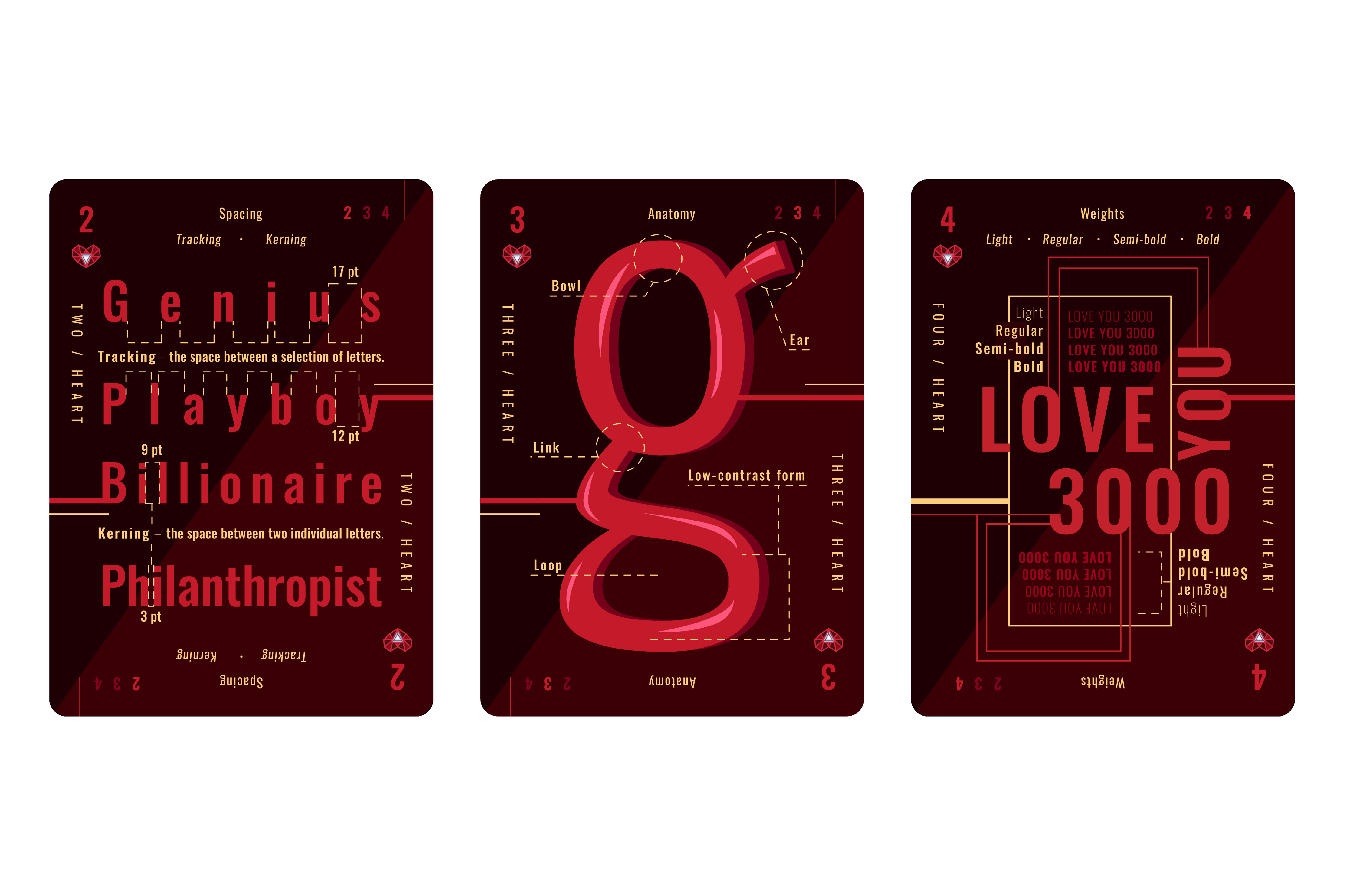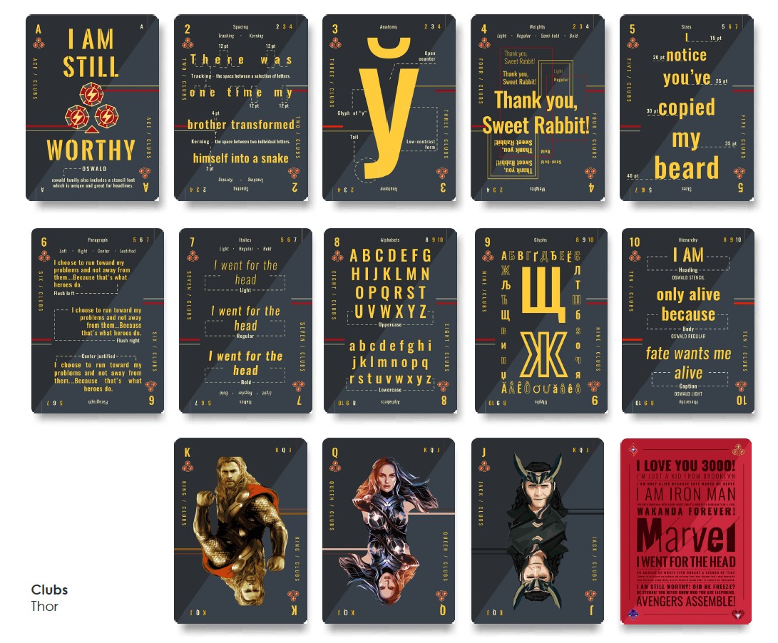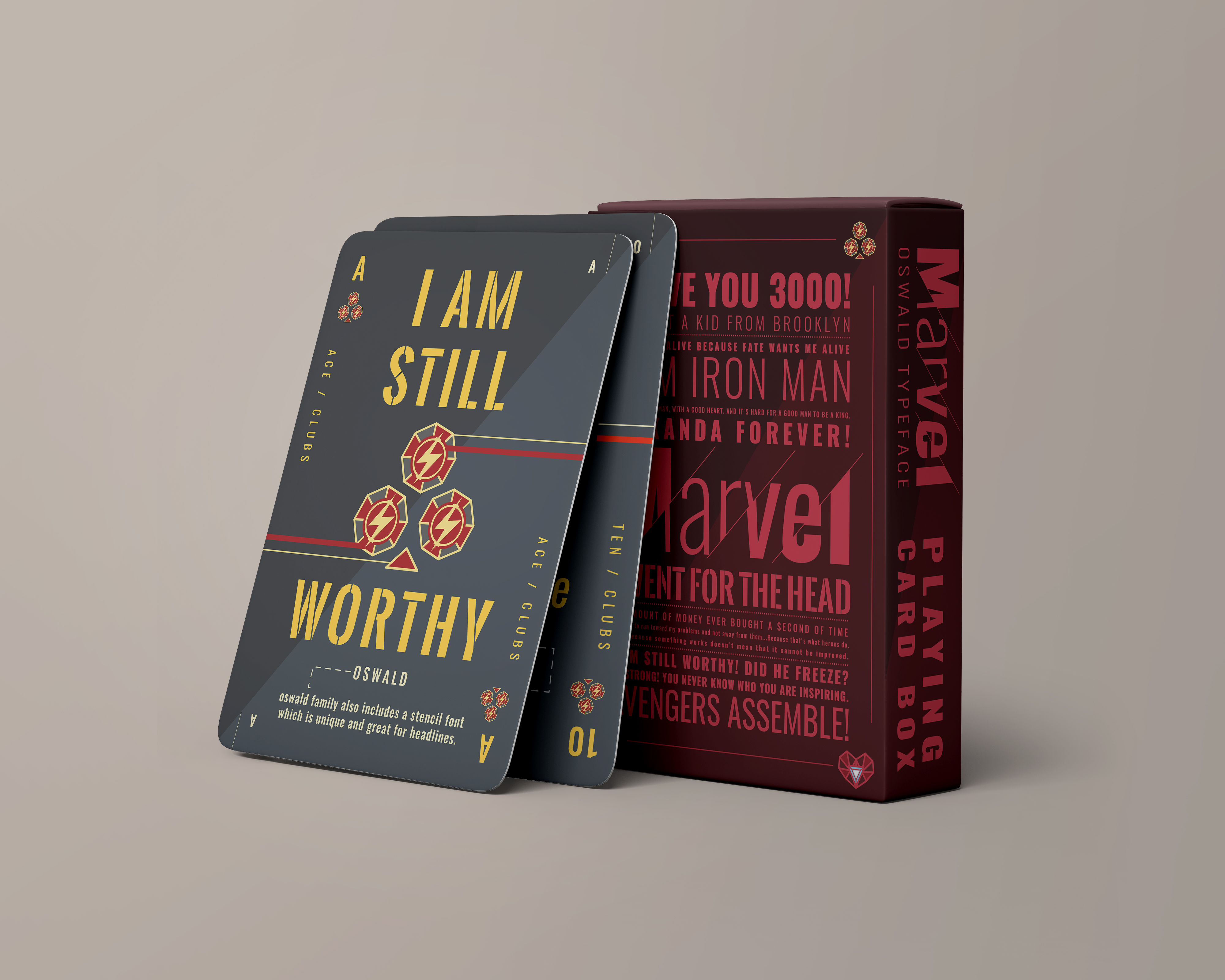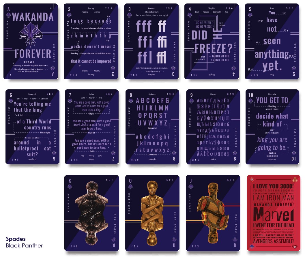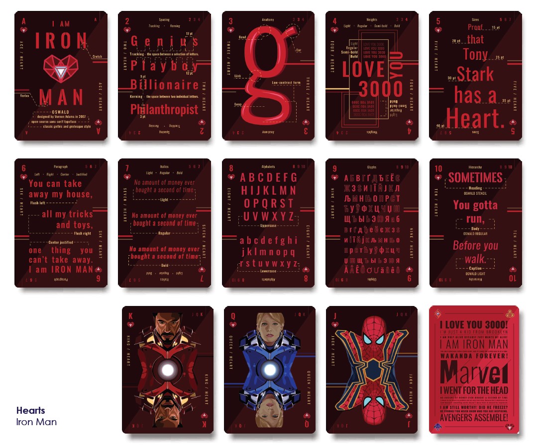 The final concept of this project is to showcase all the major characters of the Marvel Cinematic Universe in a creative and interactive form. The development of characters is inspired by the style of playing cards and the 4 suites are customized with specific logos. The typography used on the cards are the main dialogues used in the movies by characters to make it more personal and a perfect blend for all the Marvel fans.