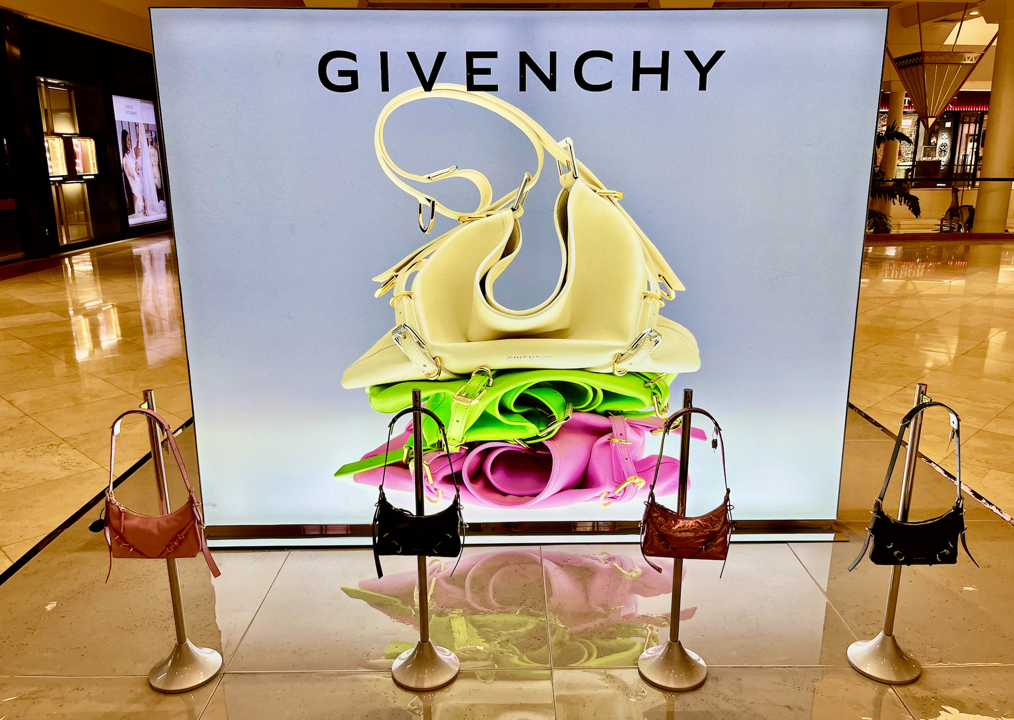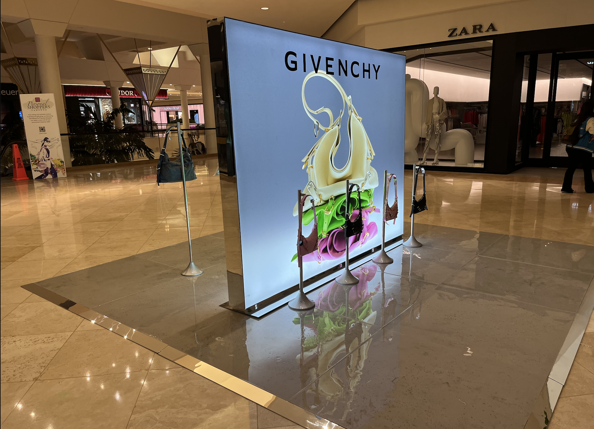 For the new Voyou Bag activation across multiple malls in the United States, the primary objective was to create a captivating and immersive retail experience that introduced Givenchy's latest fashion accessory, the Voyou Bag, to a diverse and fashion-conscious audience. Inspired by the chic and contemporary essence of the bag, the project featured innovative displays that seamlessly integrated the Voyou Bag with the ambiance of each mall. By utilizing a variety of design elements, such as modern minimalist aesthetics, digital screens, and elegant lighting, the project aimed to showcase the bag's distinctive features and versatility. This approach offered them an opportunity to explore the world of Givenchy, establishing a memorable and stylish introduction to the Voyou Bag collection within the bustling mall environment.