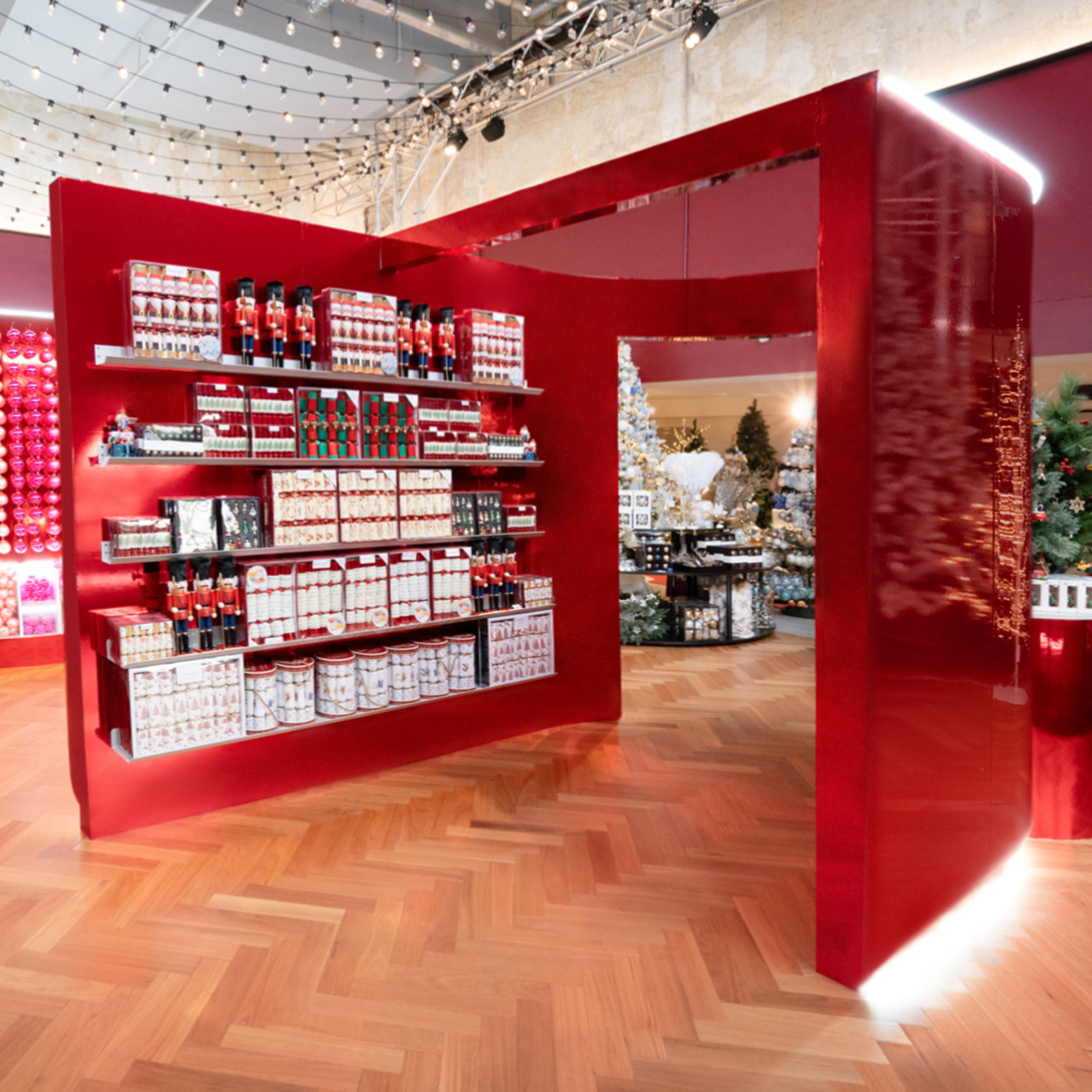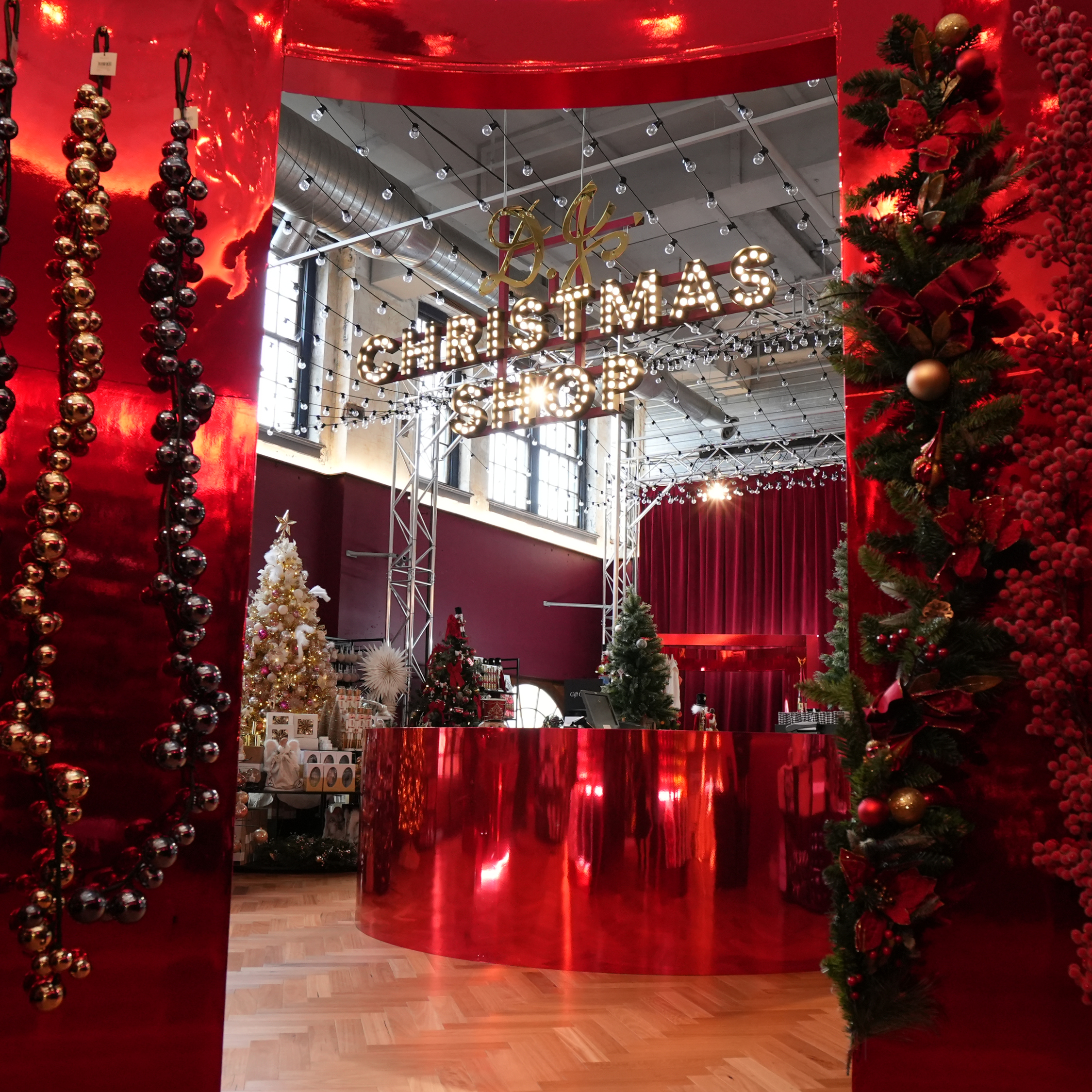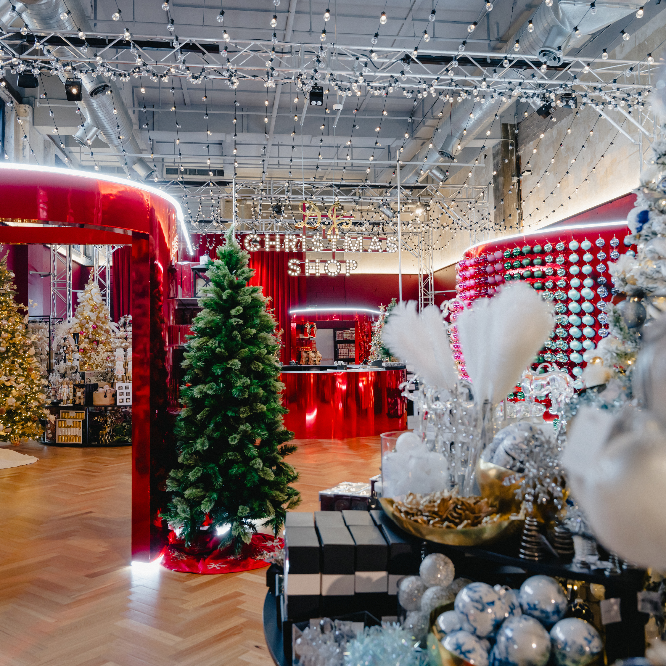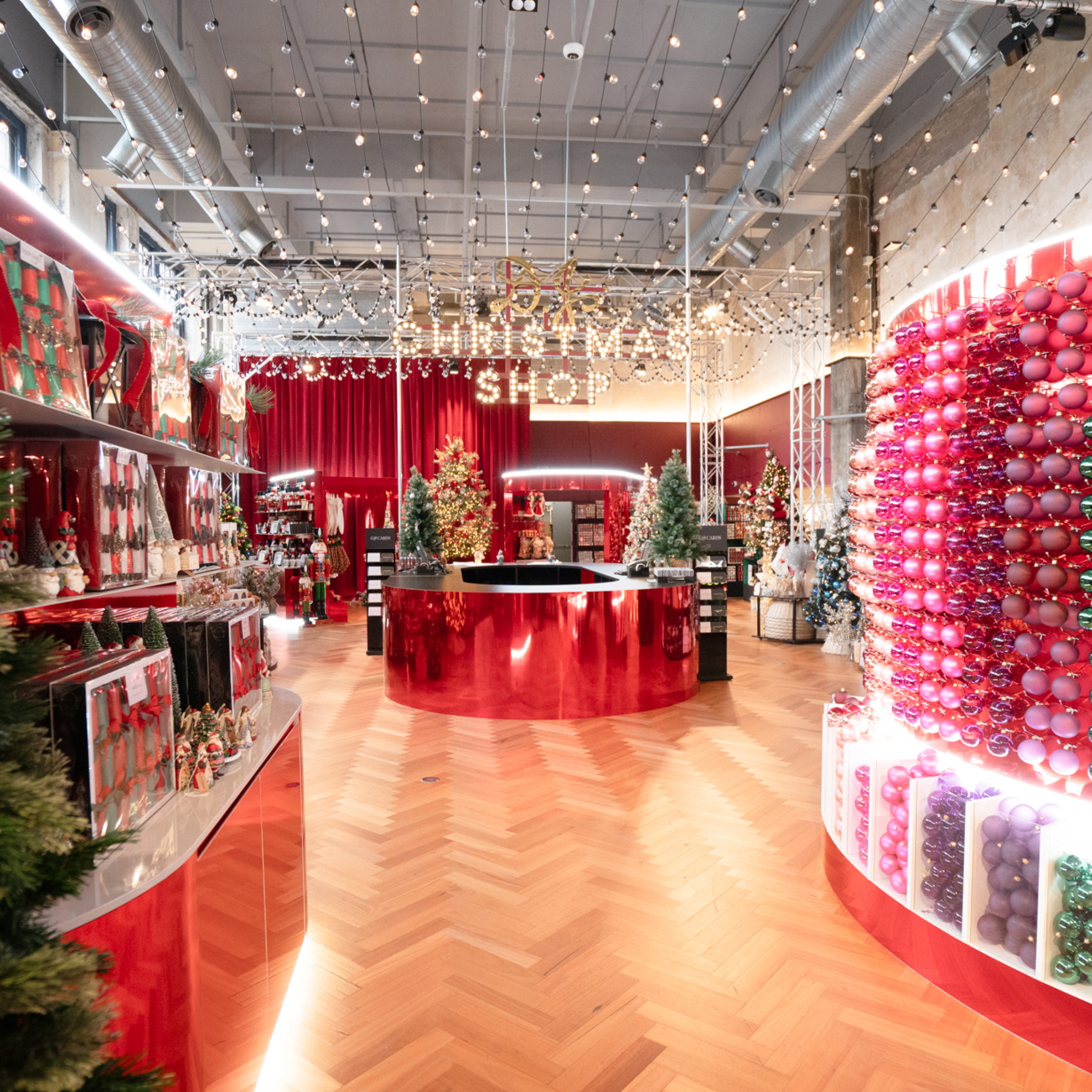 An oversized illuminated sign attracts visitors to the event space on level eight, drawing them through a hall of whimsical ornaments and twinkling trees. The nostalgic adventure continues when entering the shop, sparking celebrations and connecting with the brand's history. Inside, the ceiling is adorned with festoon lighting programmed in a sequence to highlight the centre Christmas Shop sign, surrounded by cabins and counters wrapped in red reflective vinyl, building a festive atmosphere.