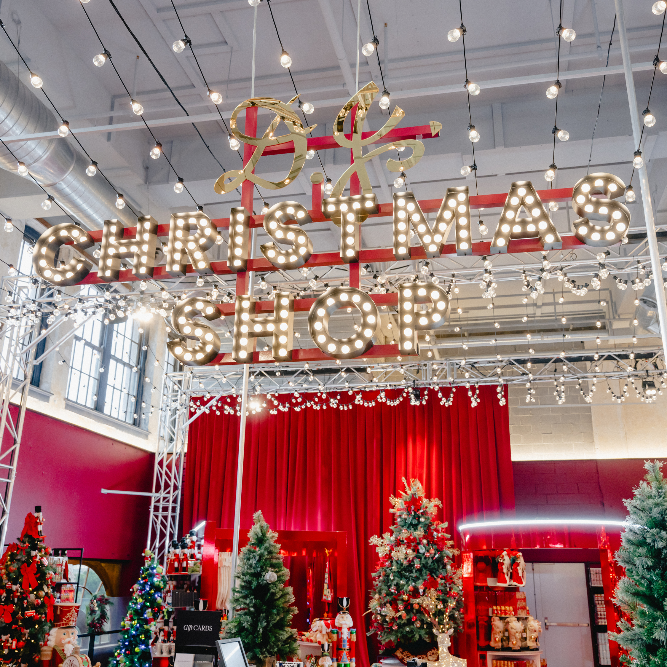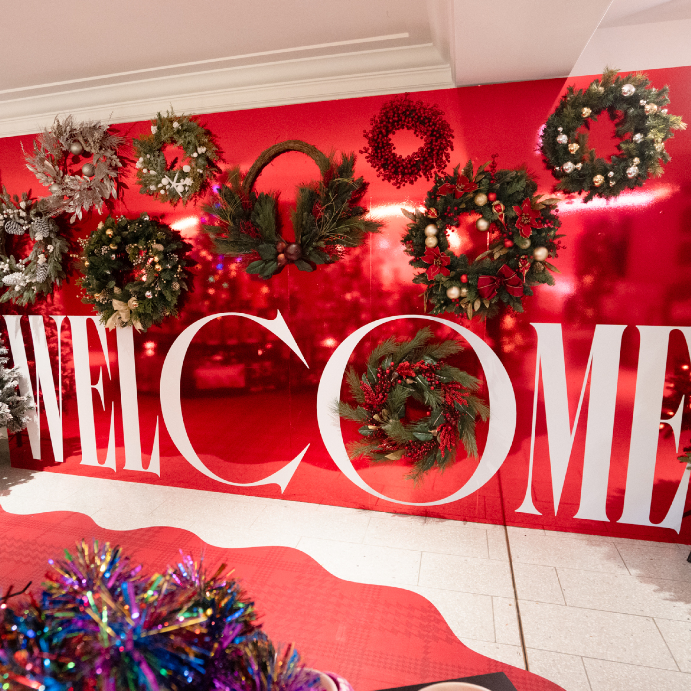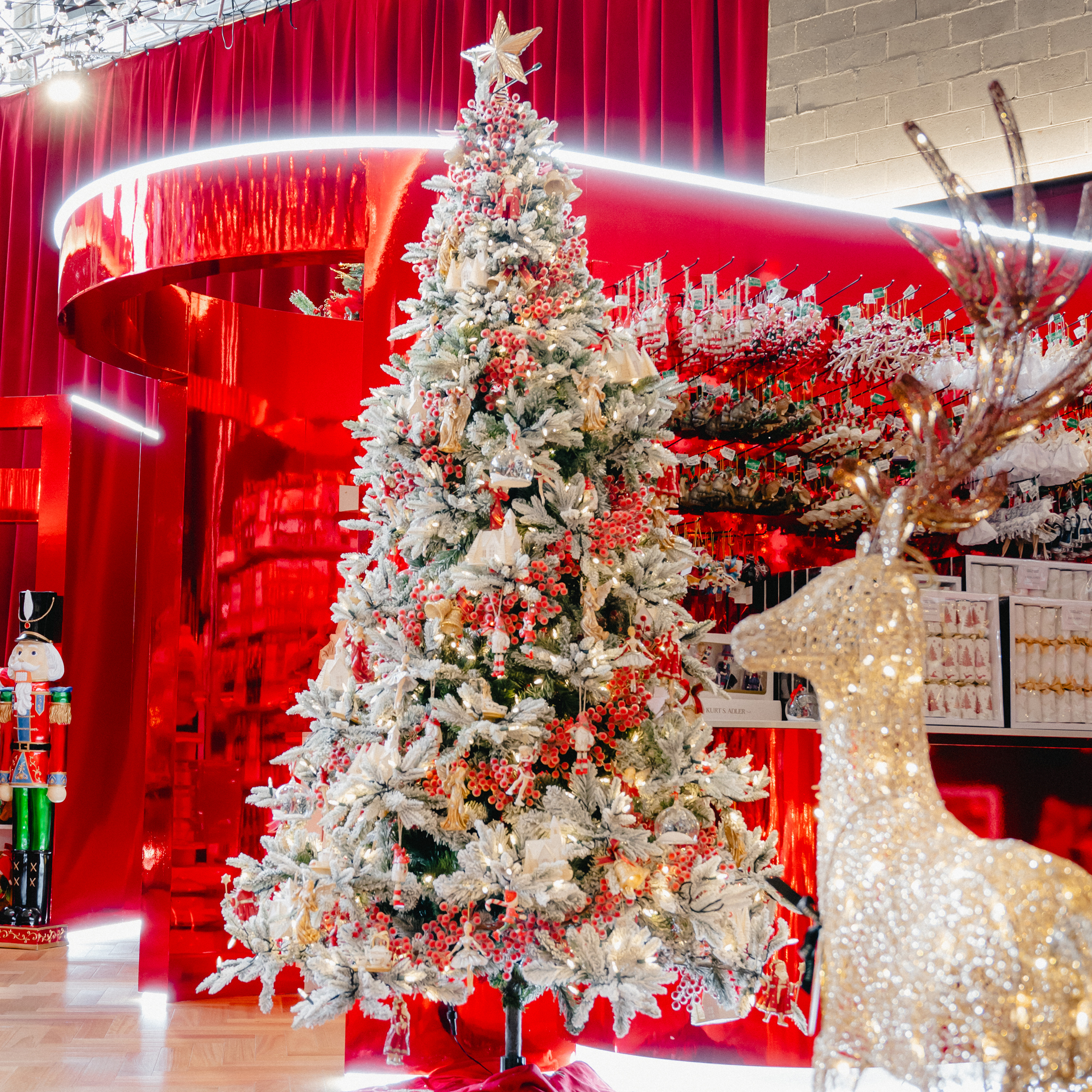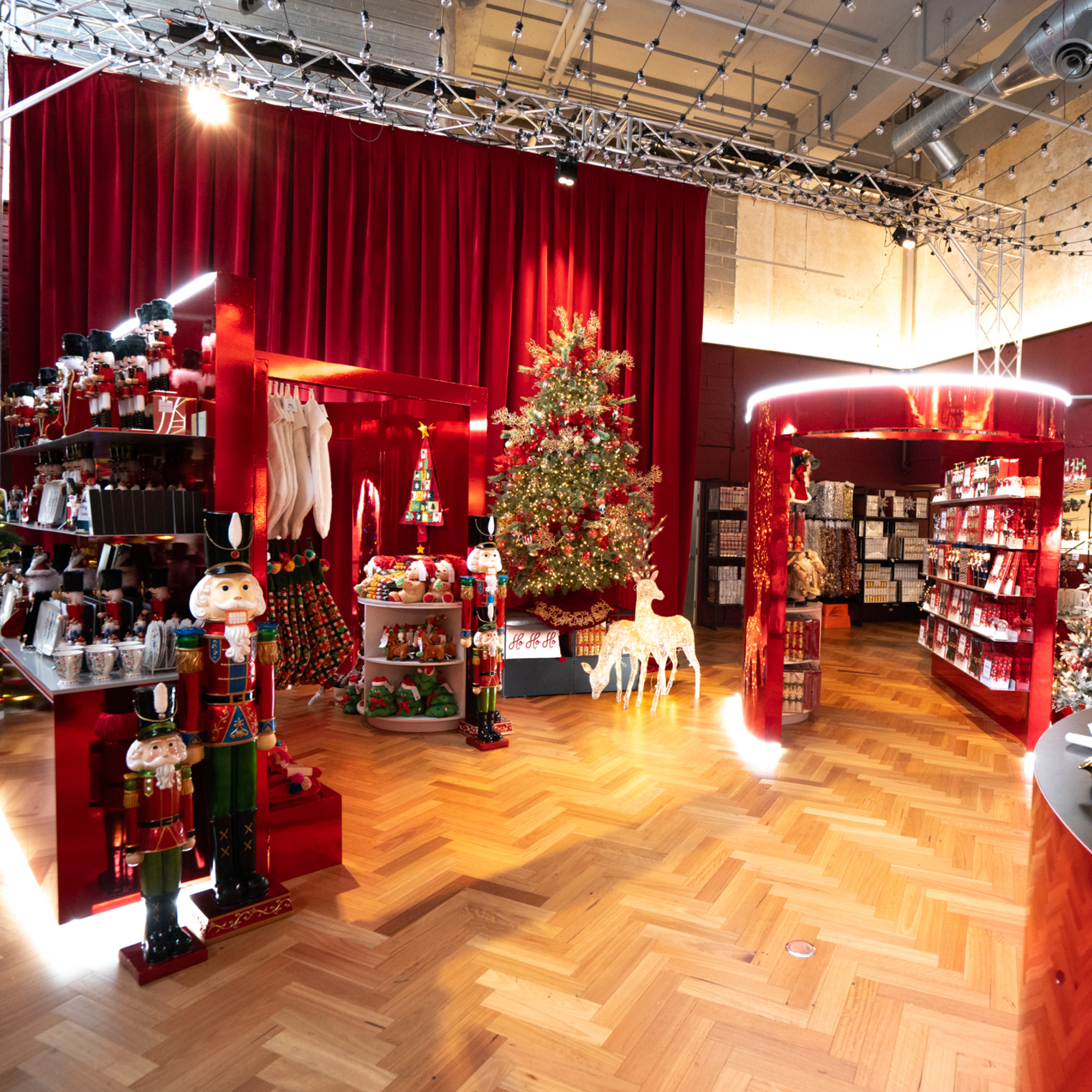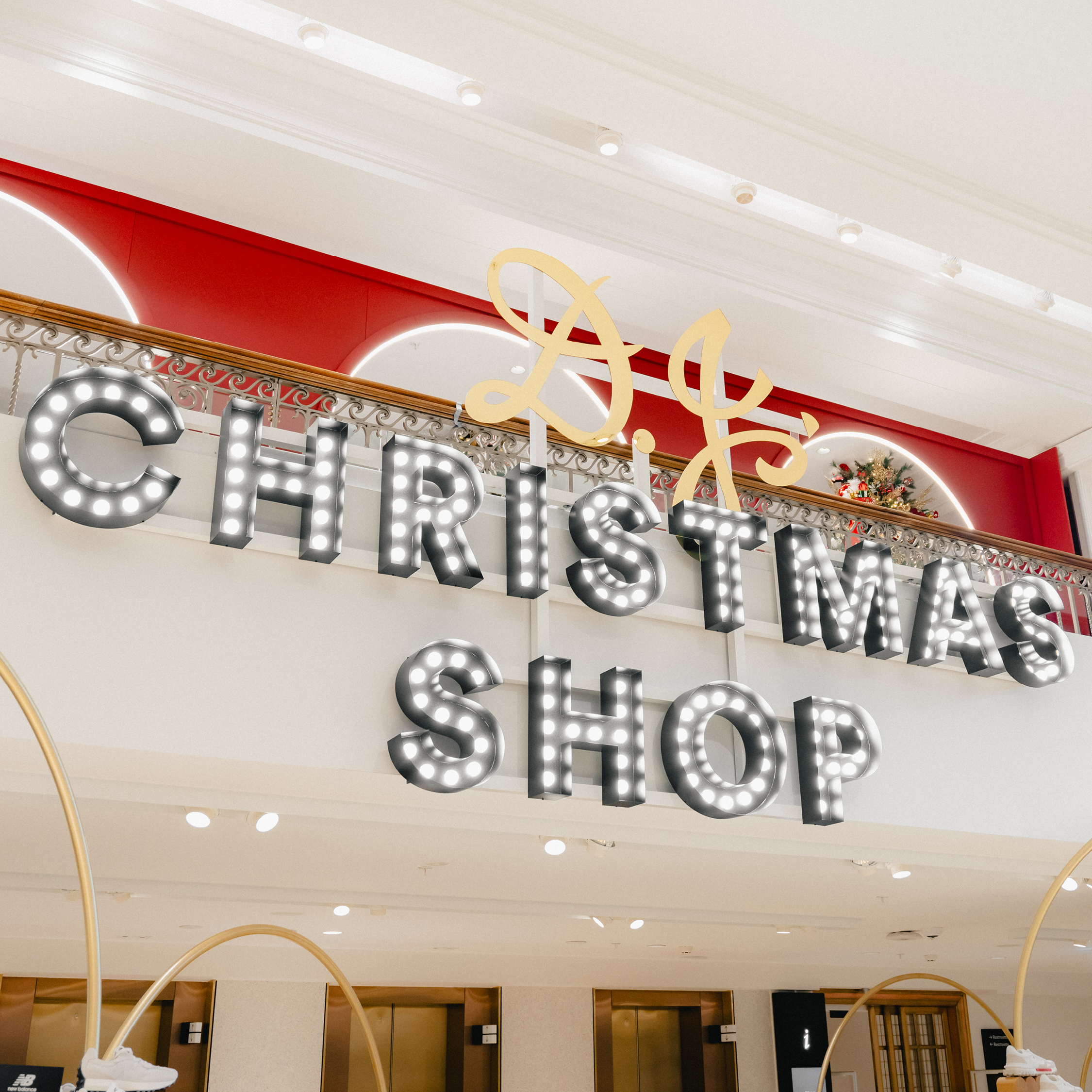 An oversized illuminated sign attracts visitors to the event space on level eight, drawing them through a hall of whimsical ornaments and twinkling trees. The nostalgic adventure continues when entering the shop, sparking celebrations and connecting with the brand's history. Inside, the ceiling is adorned with festoon lighting programmed in a sequence to highlight the centre Christmas Shop sign, surrounded by cabins and counters wrapped in red reflective vinyl, building a festive atmosphere.