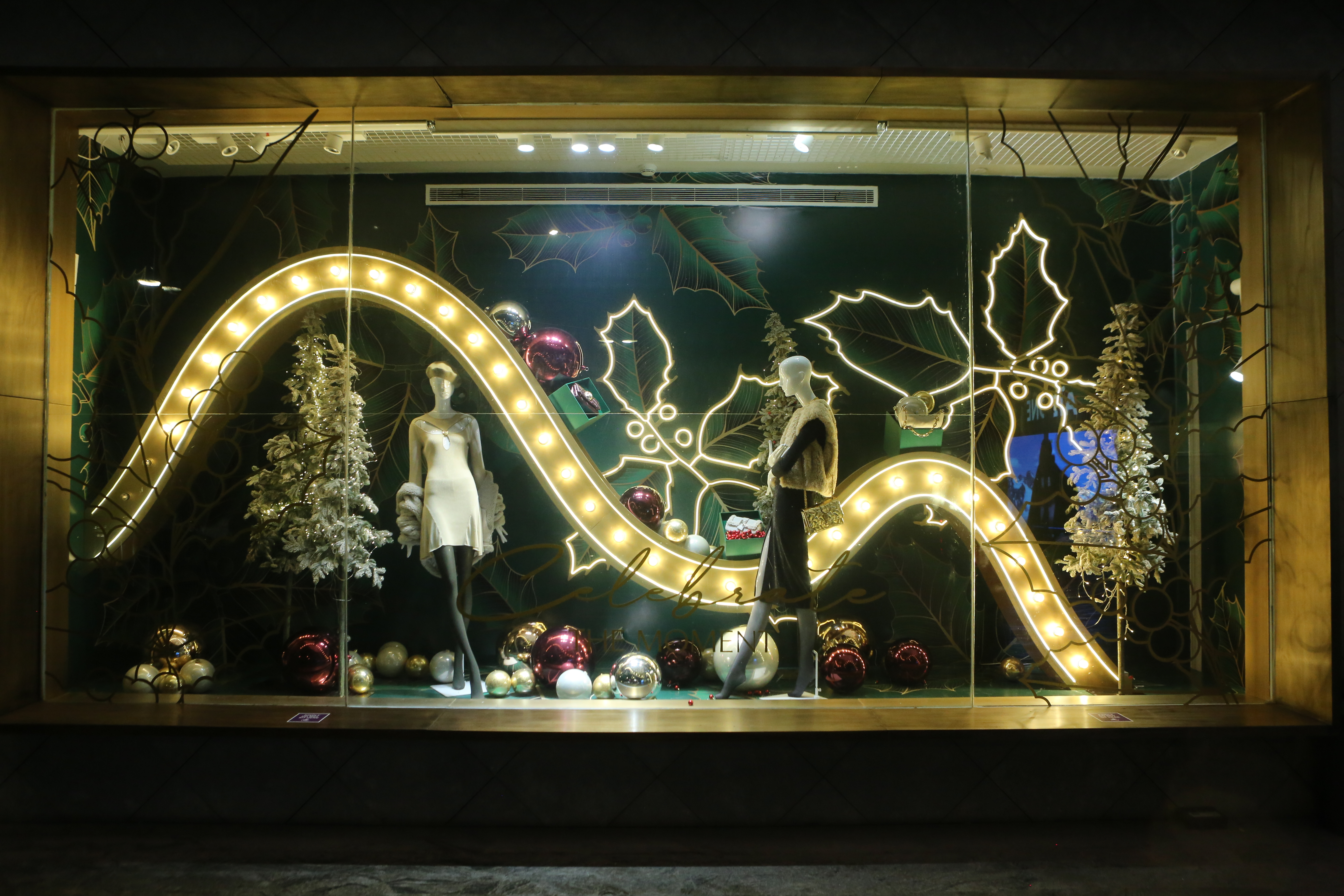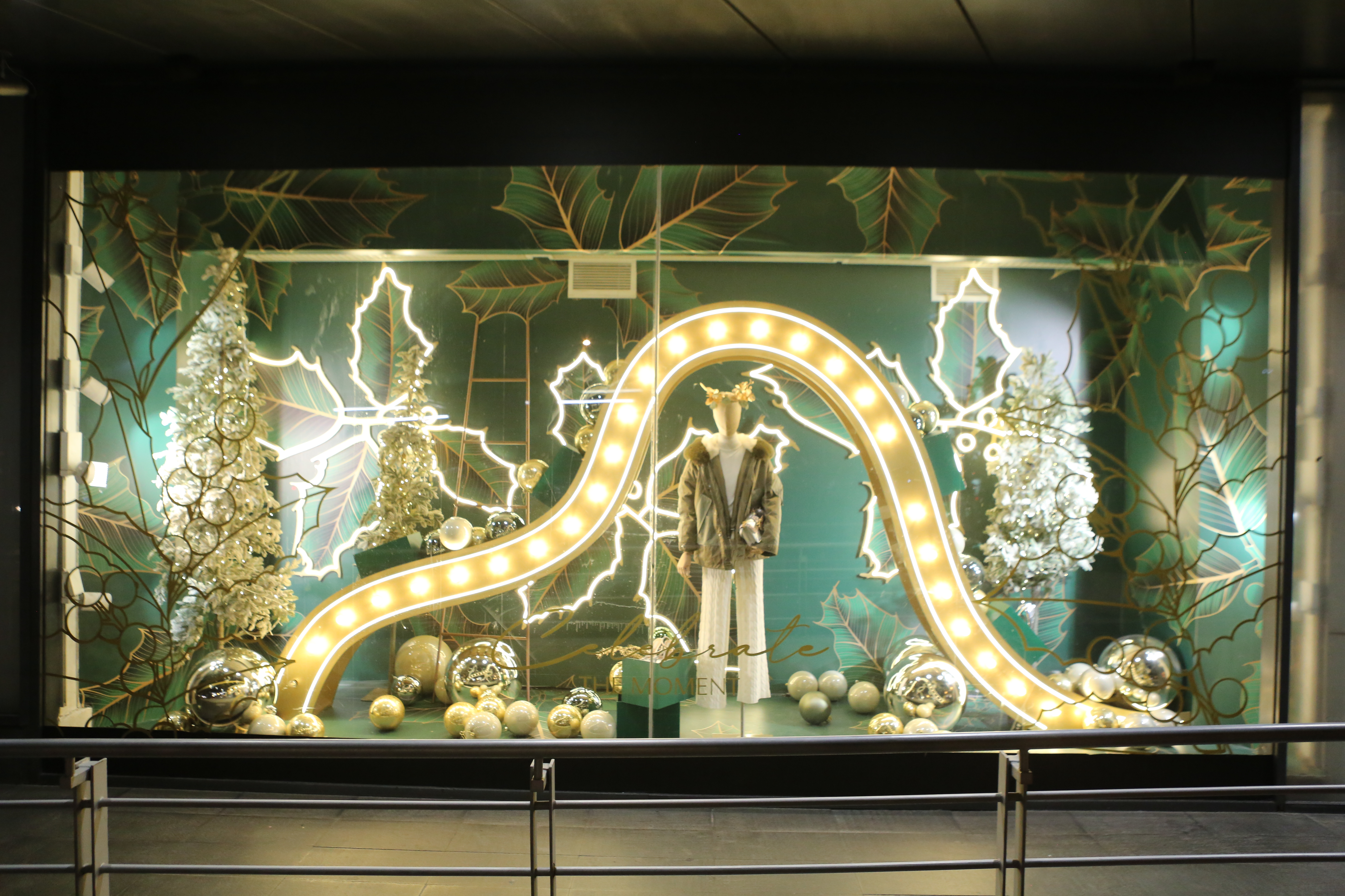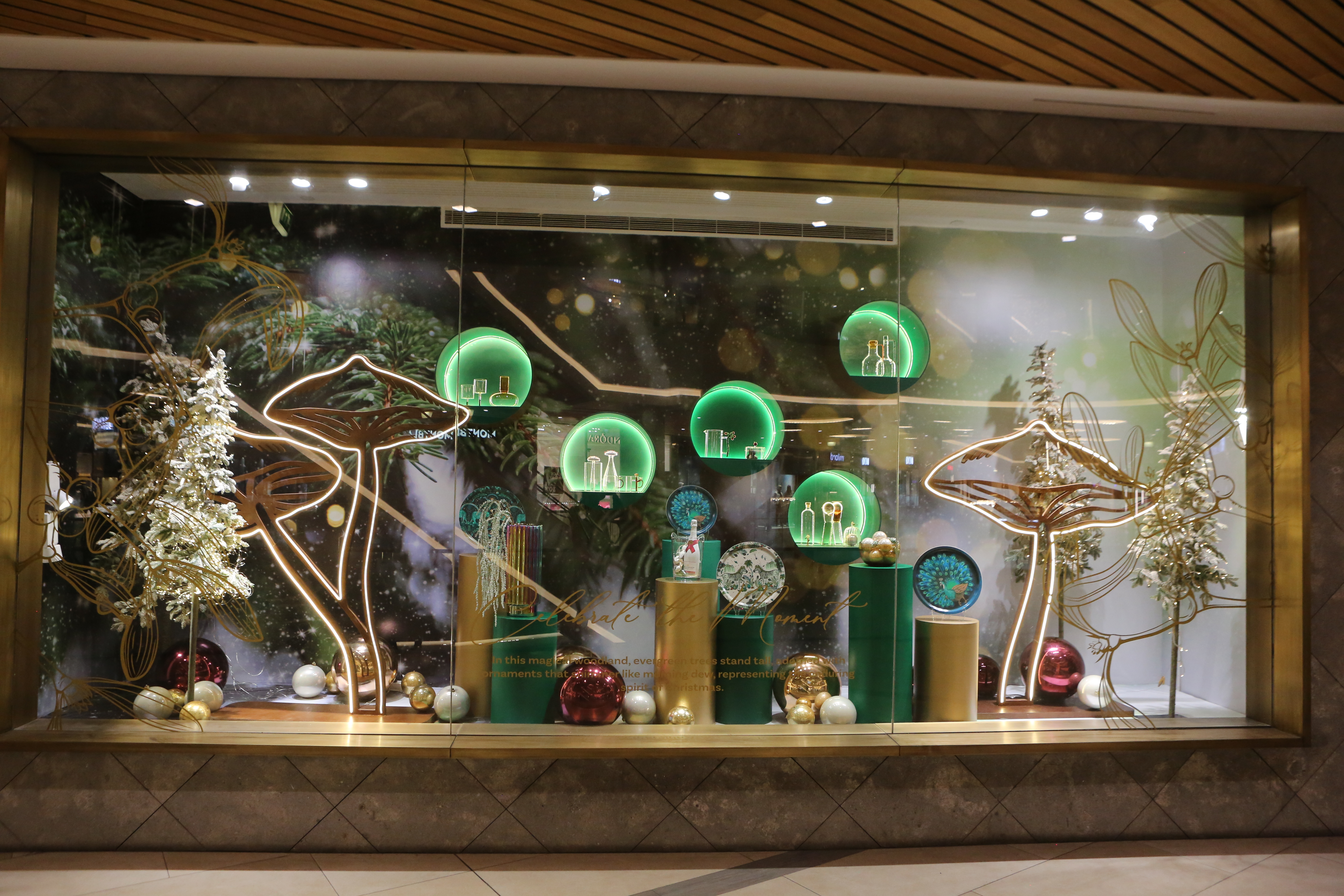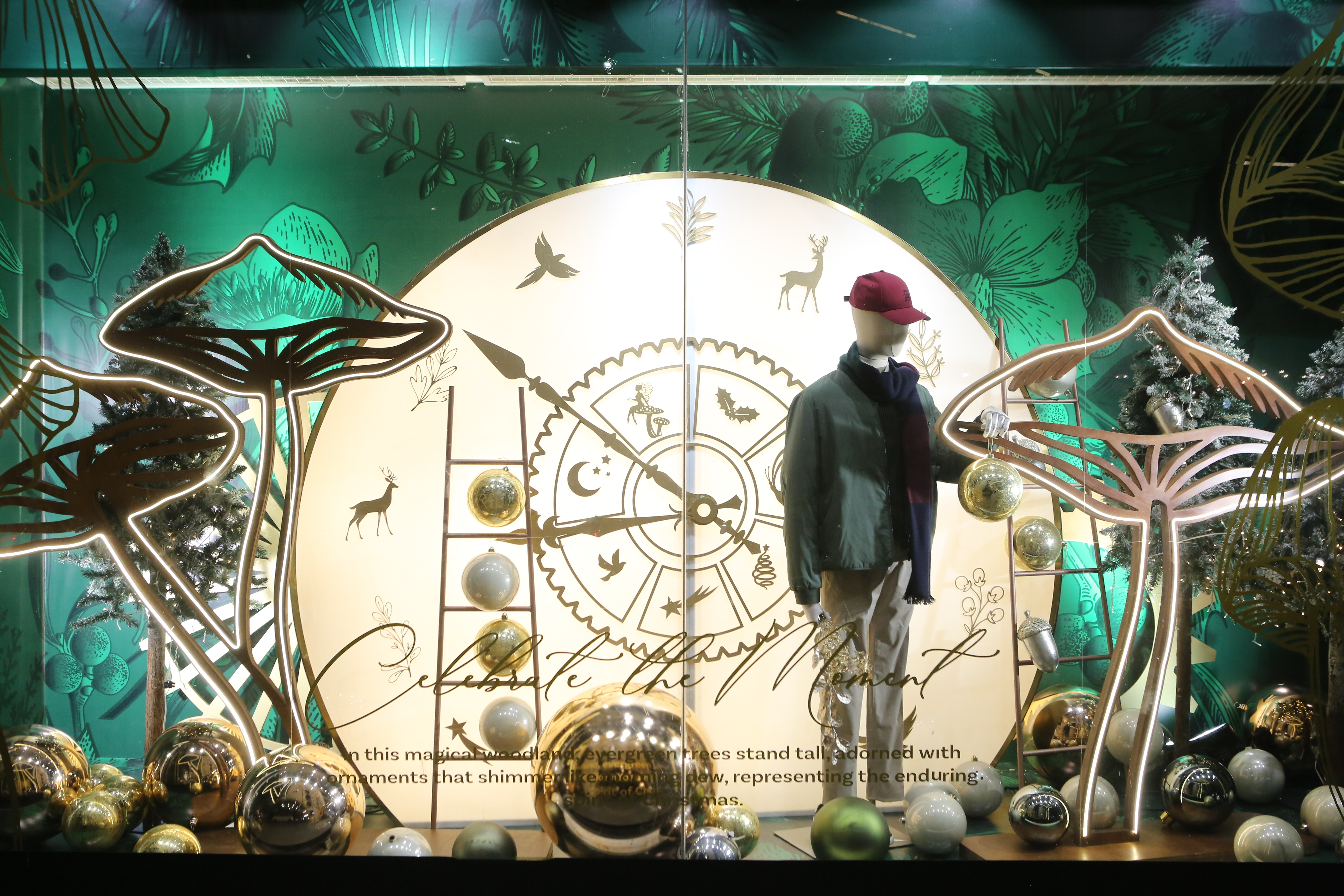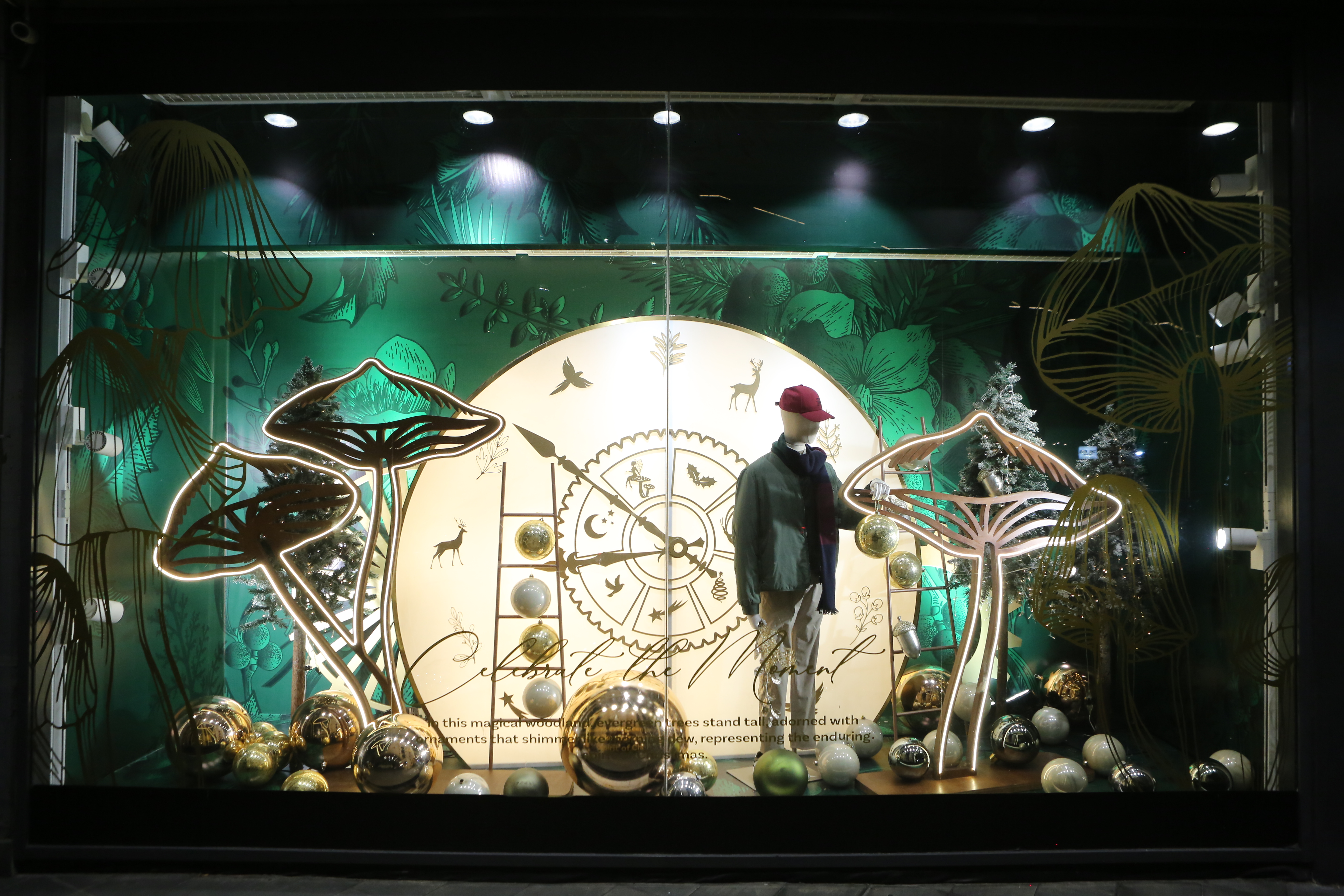 ABC Lebanon Holiday Fashion Windows titled "Celebrate The Moment". Forest element props to create a fairytale botanical Christmas mood by focusing on the green color and themes of "Enchanted Christmas Forest" and "Rebirth in Nature".