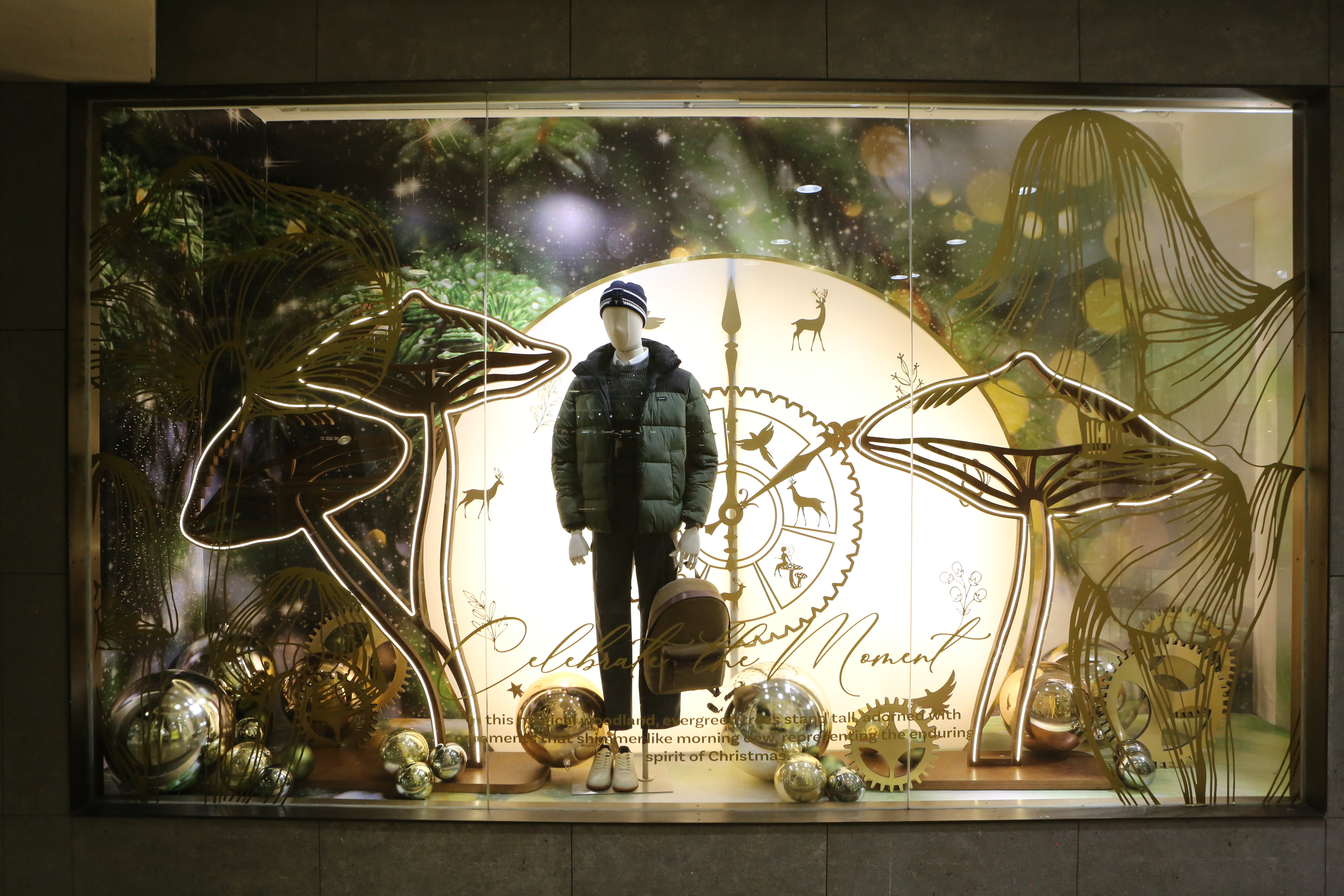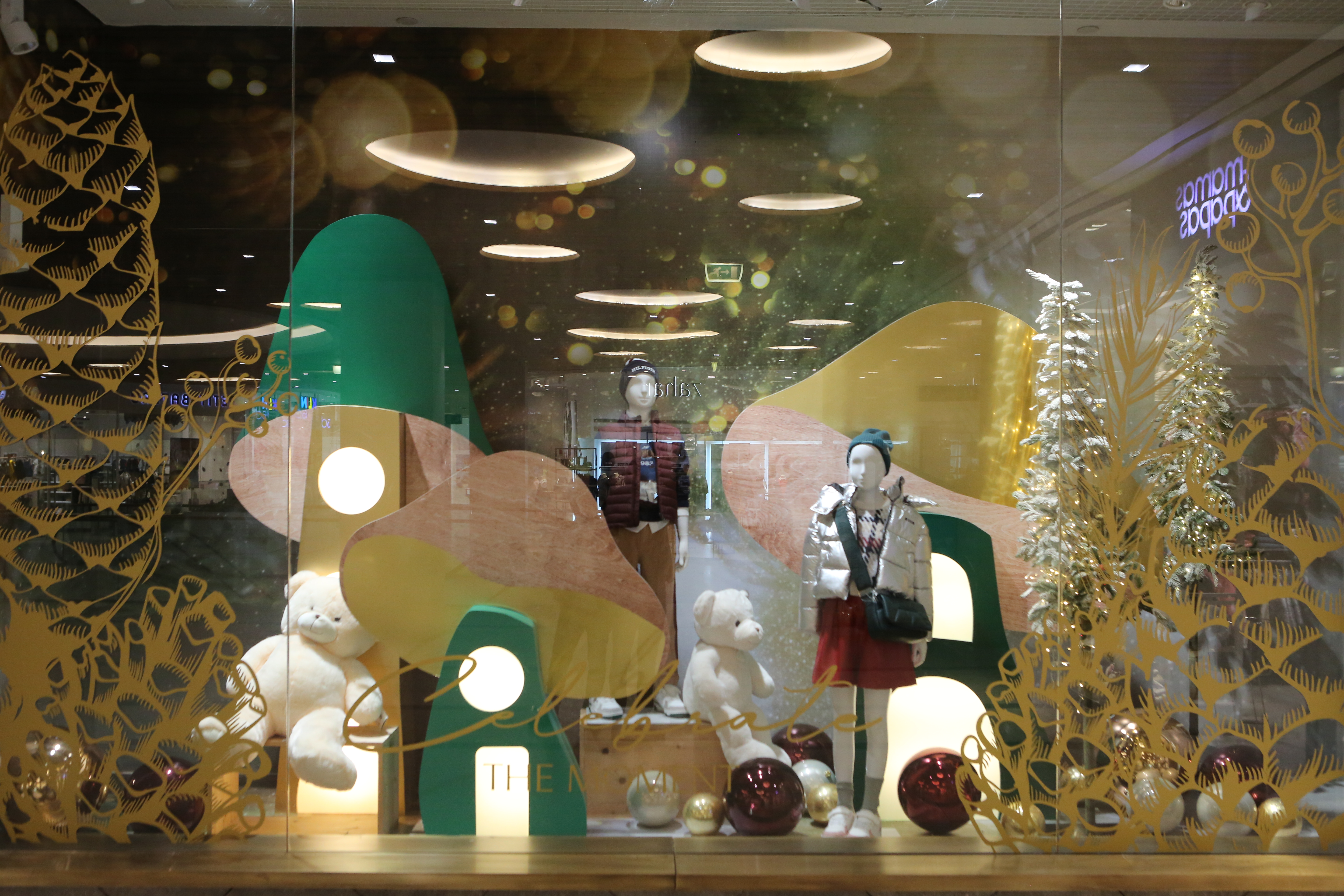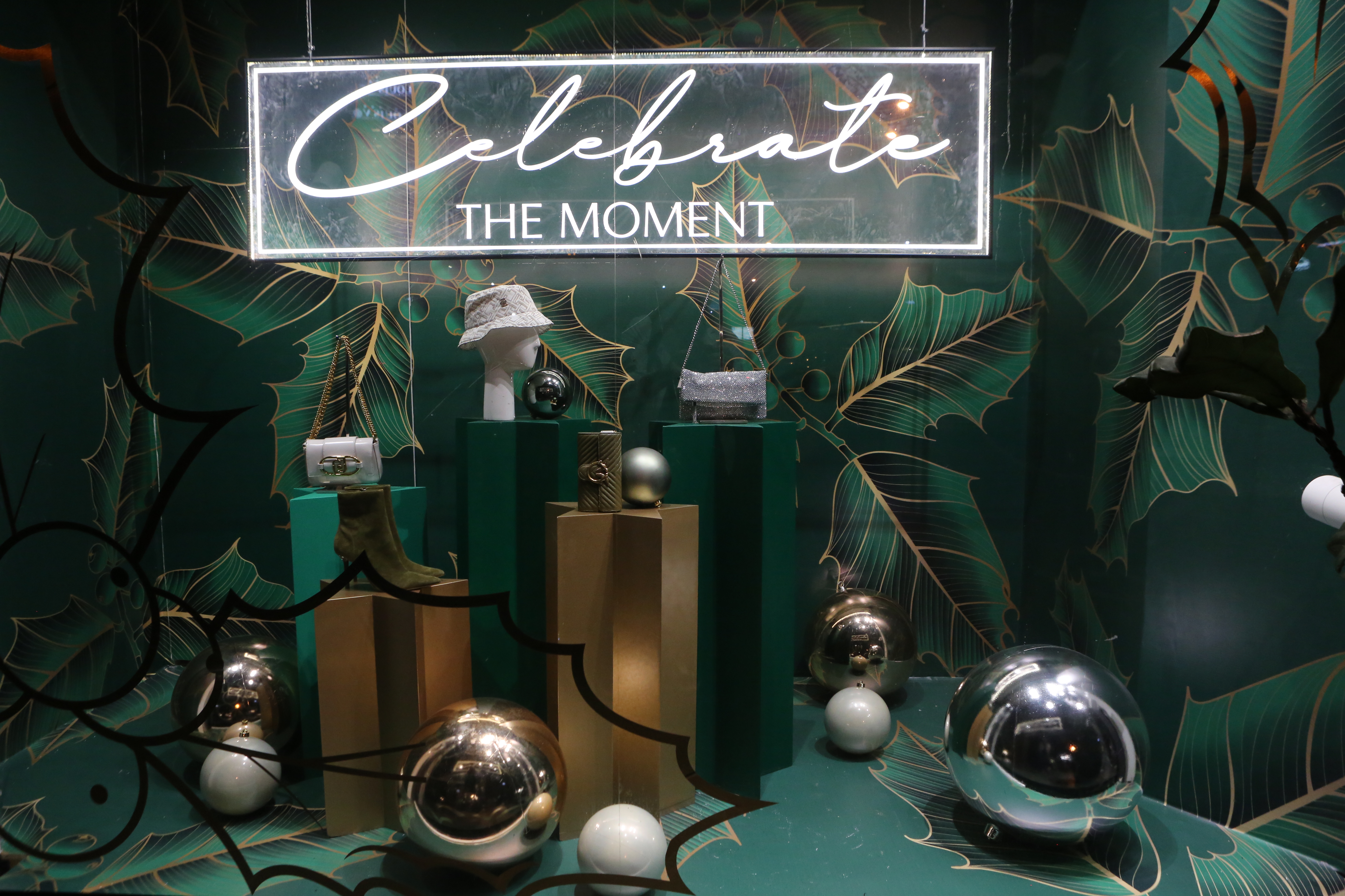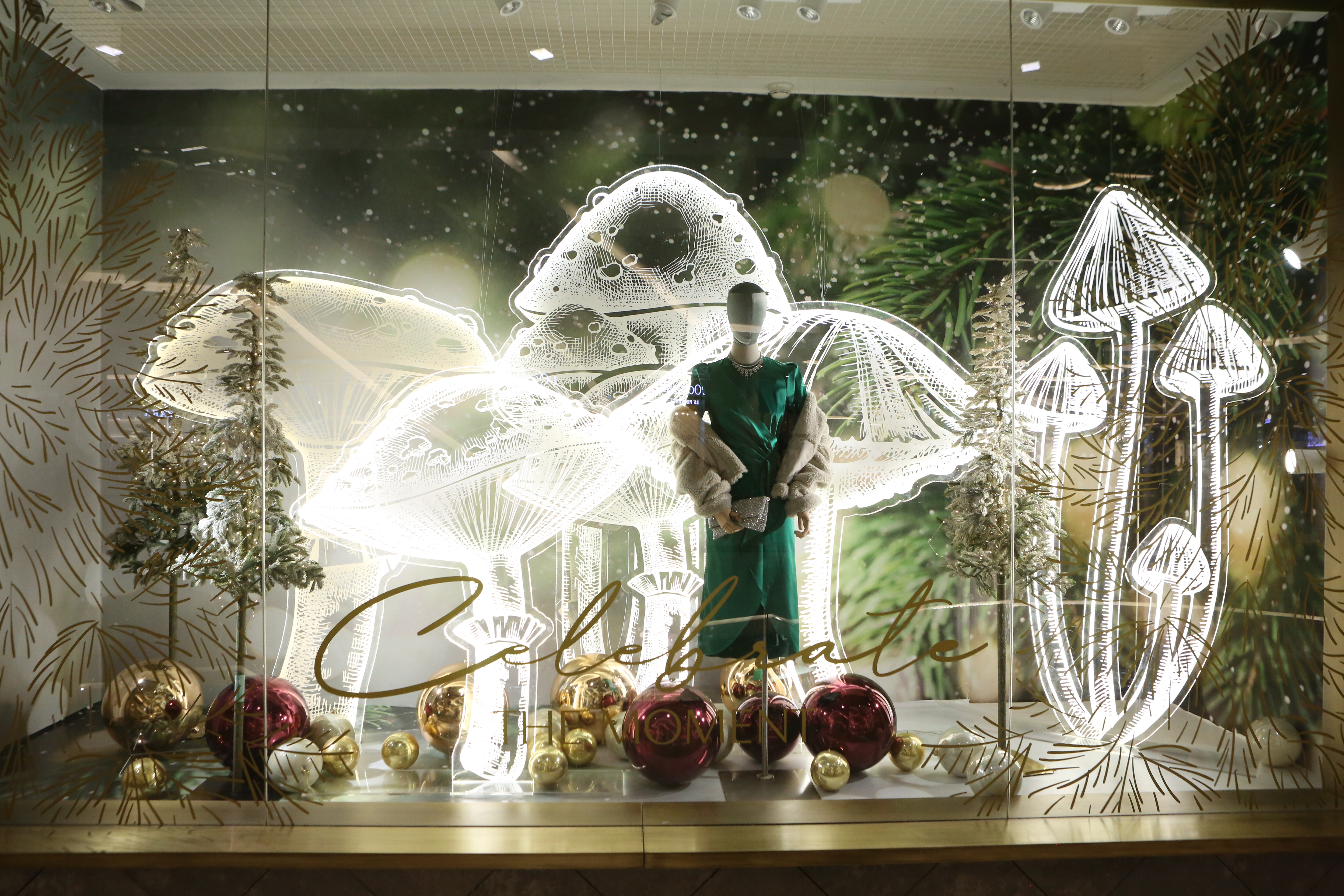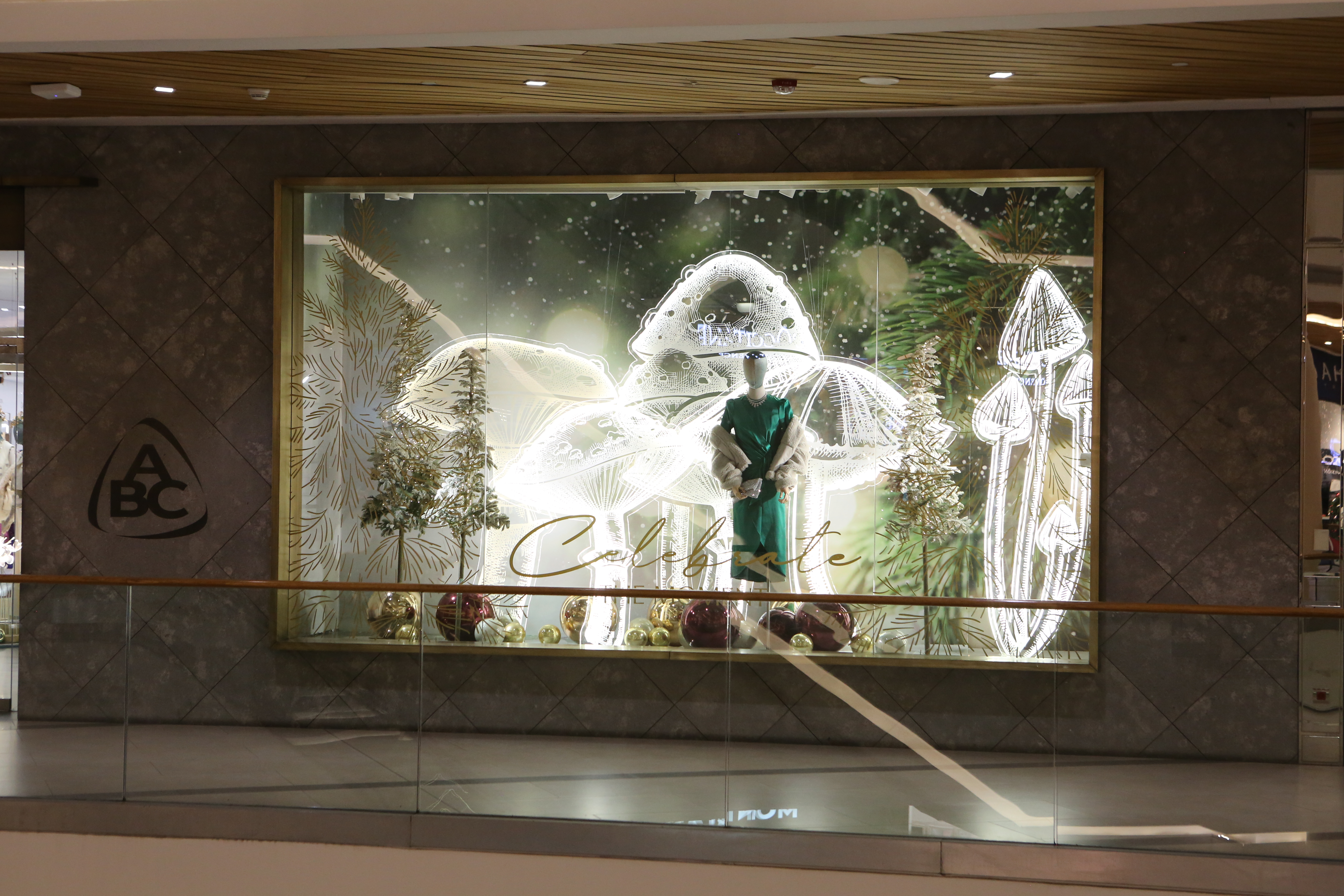 ABC Lebanon Holiday Fashion Windows titled "Celebrate The Moment". Forest element props to create a fairytale botanical Christmas mood by focusing on the green color and themes of "Enchanted Christmas Forest" and "Rebirth in Nature".