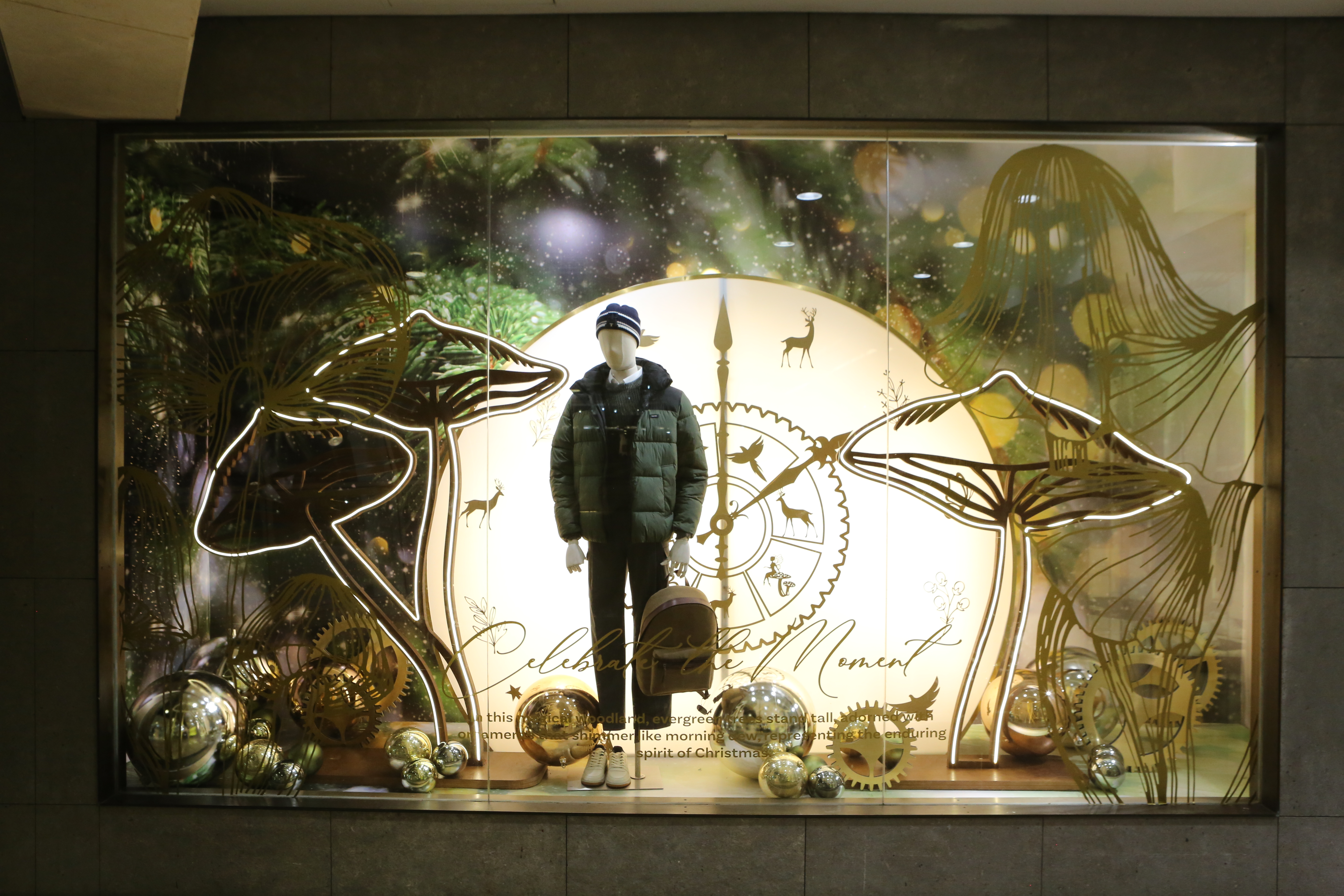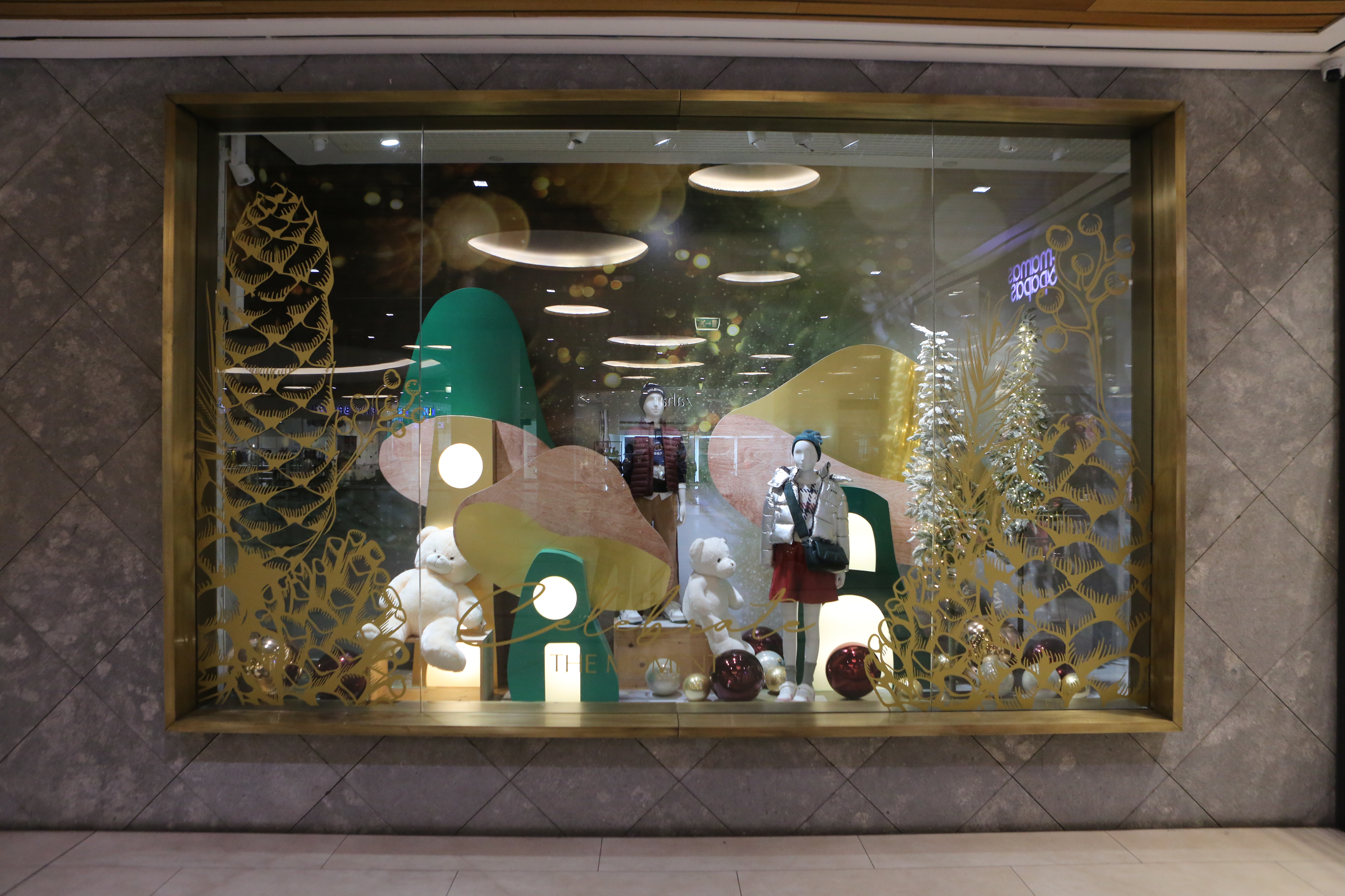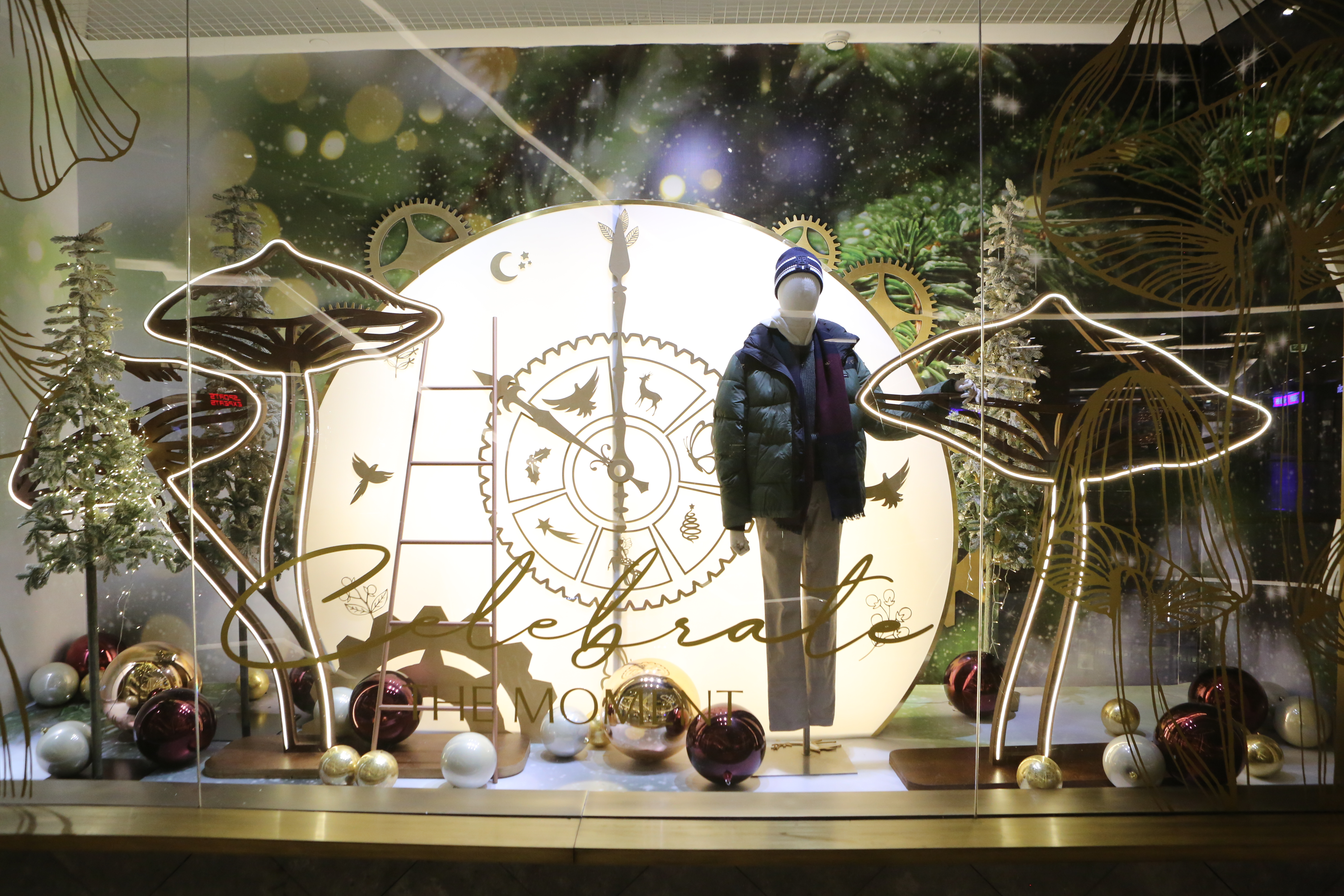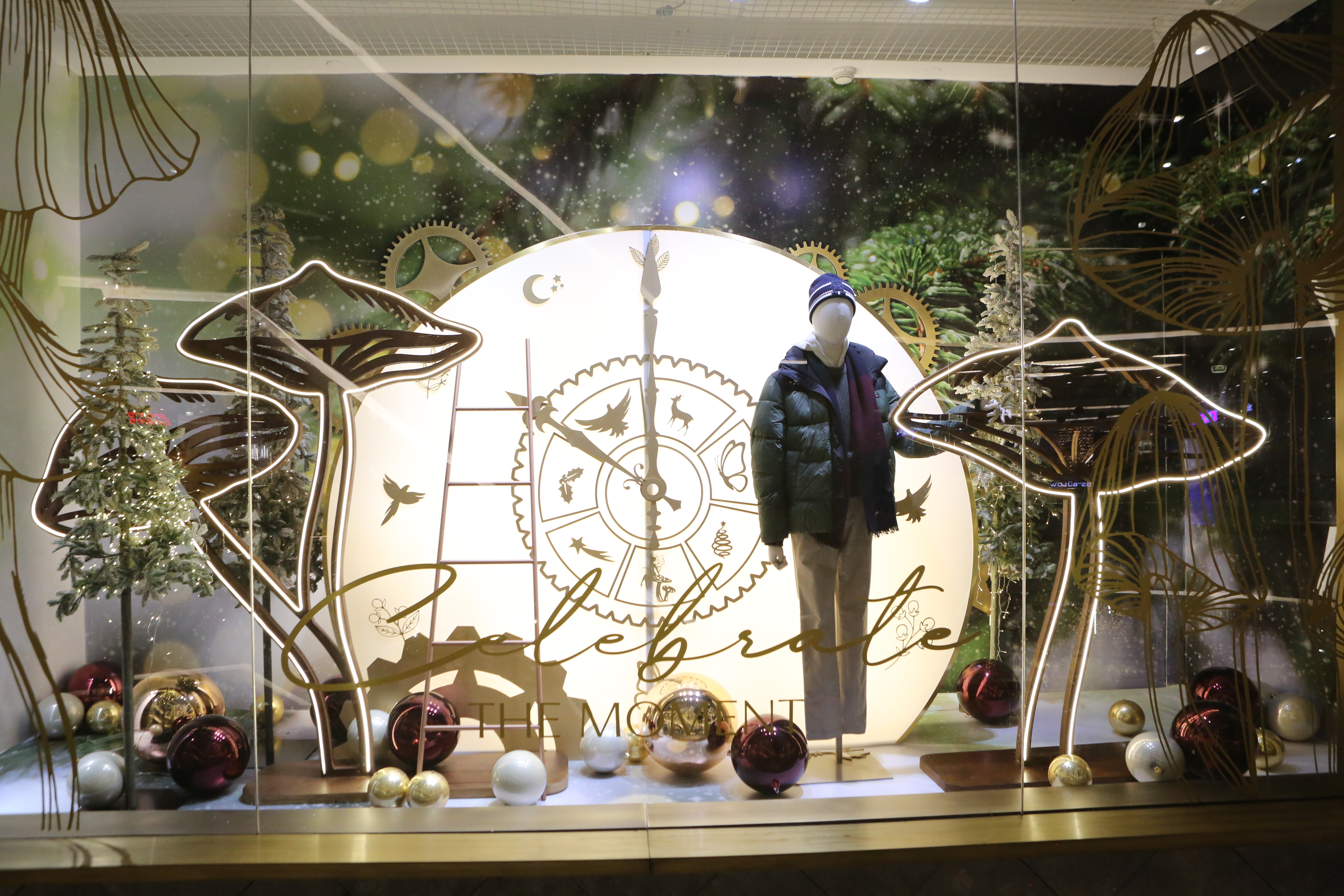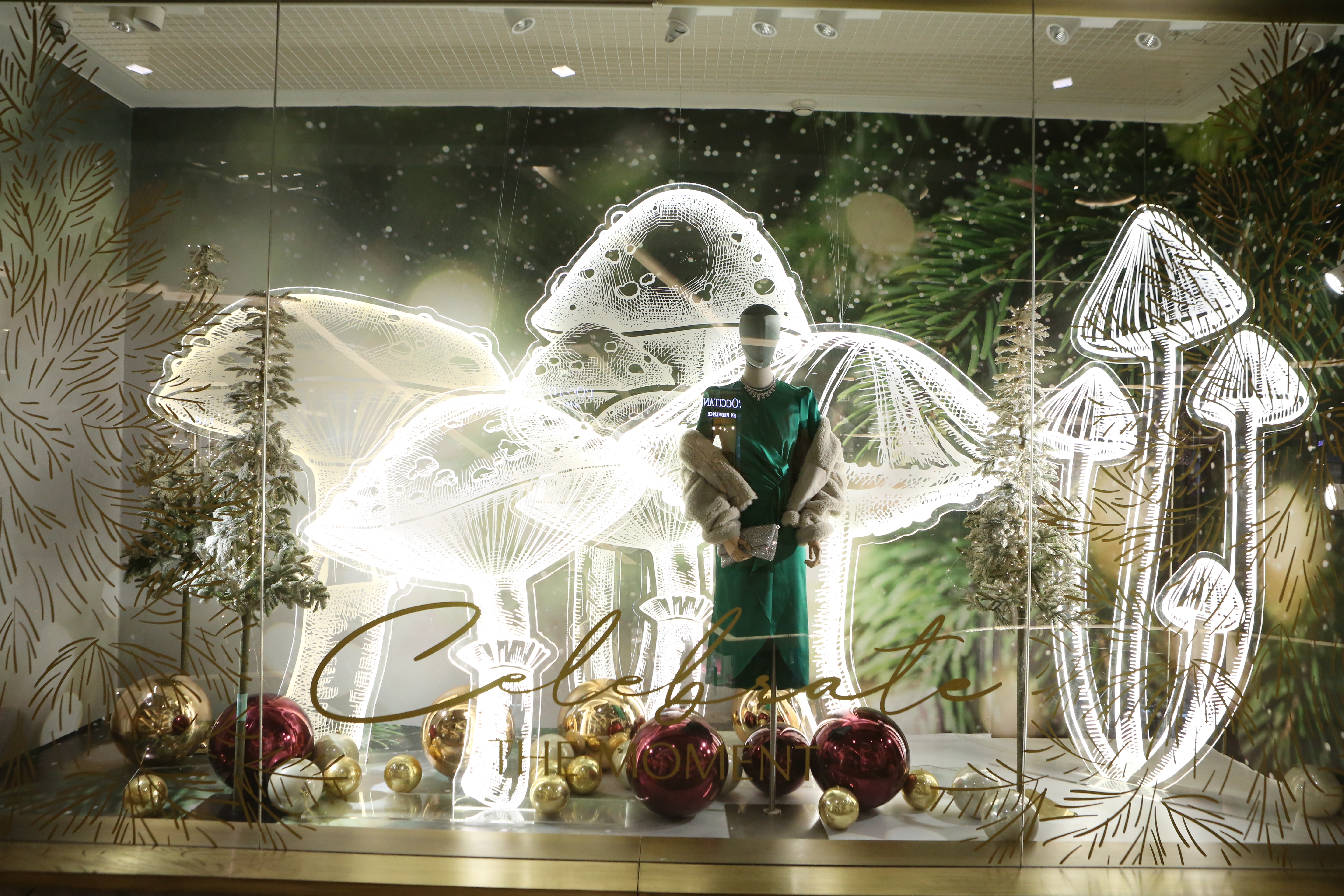 ABC Lebanon Holiday Fashion Windows titled "Celebrate The Moment". Forest element props to create a fairytale botanical Christmas mood by focusing on the green color and themes of "Enchanted Christmas Forest" and "Rebirth in Nature".