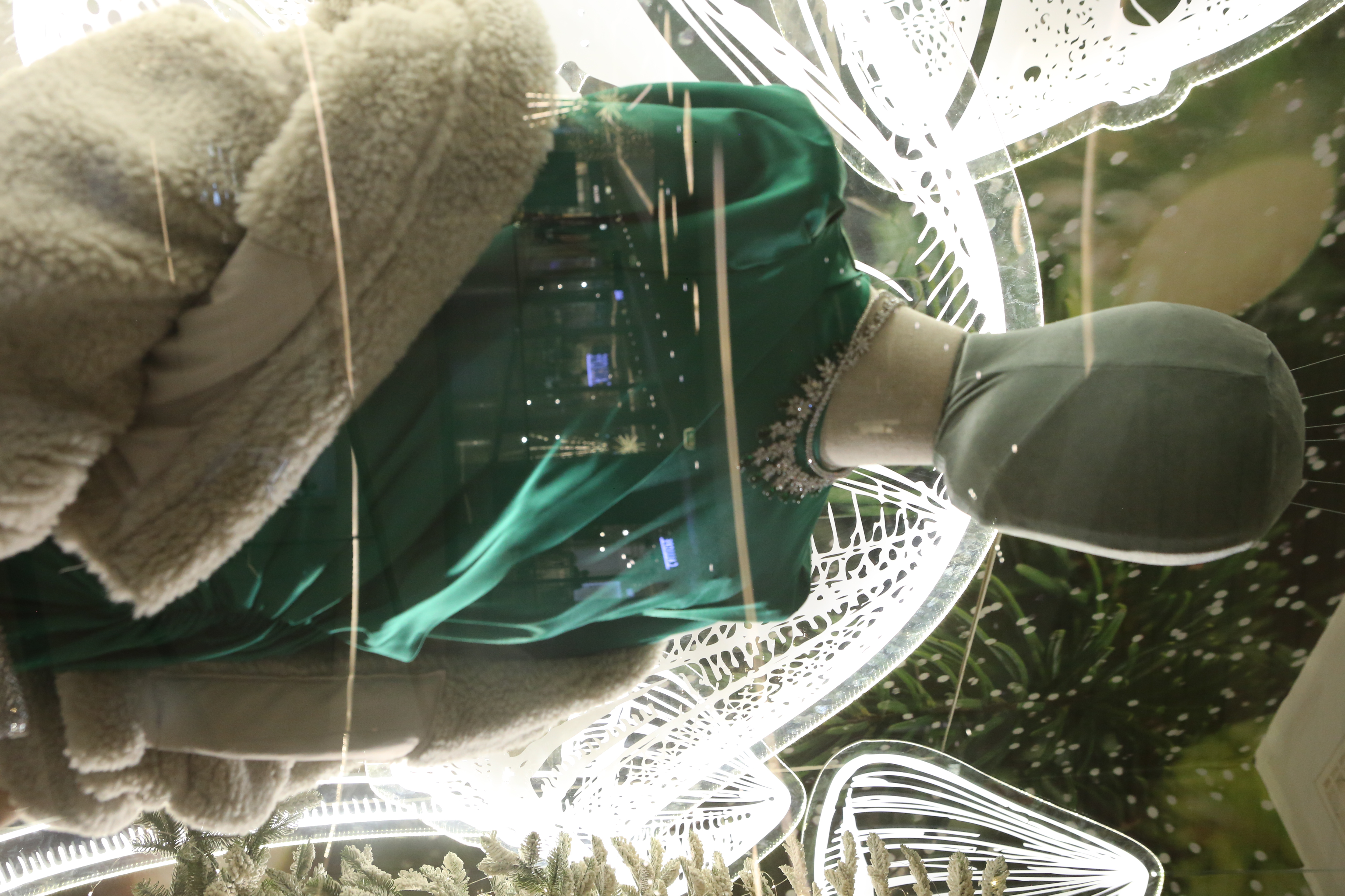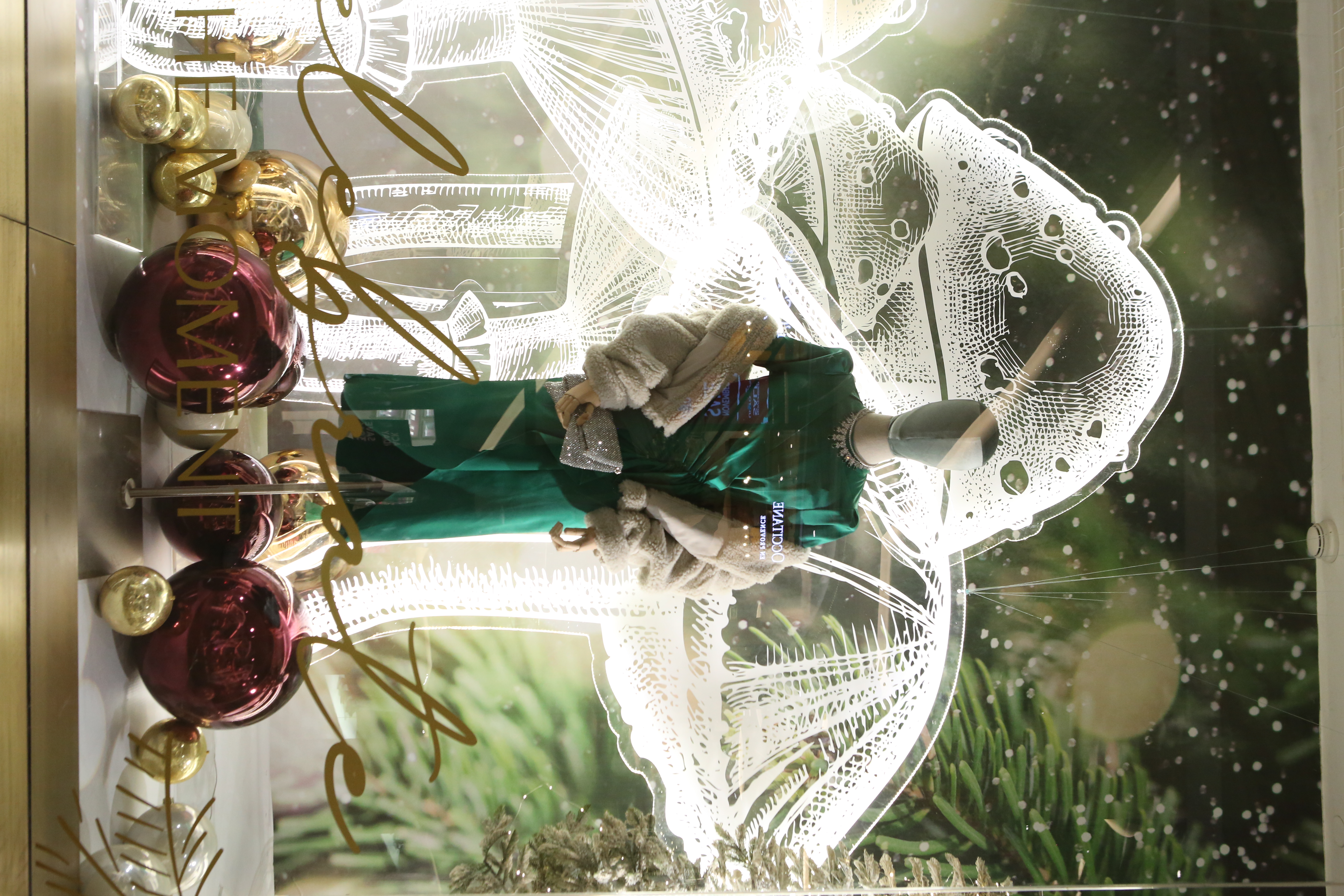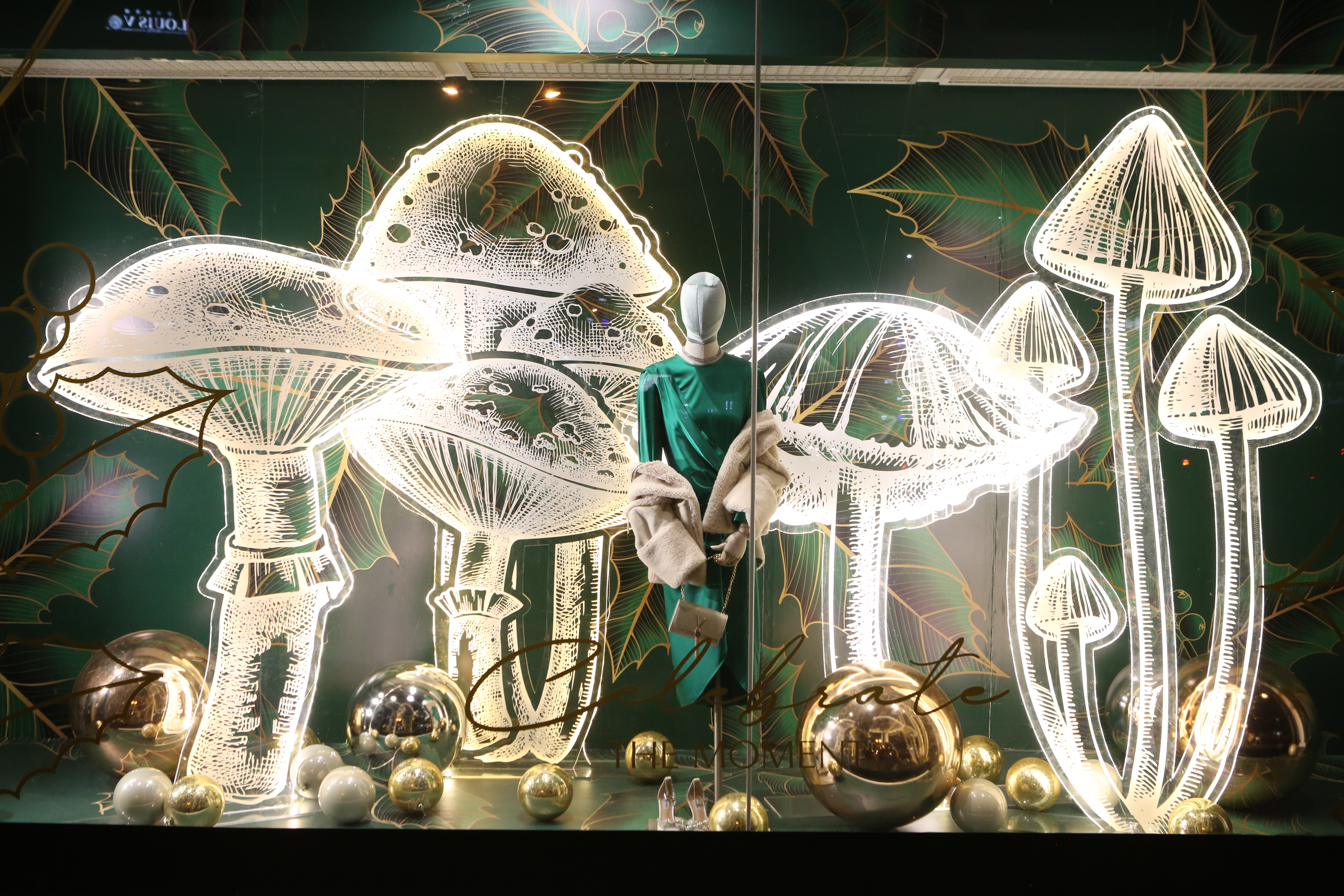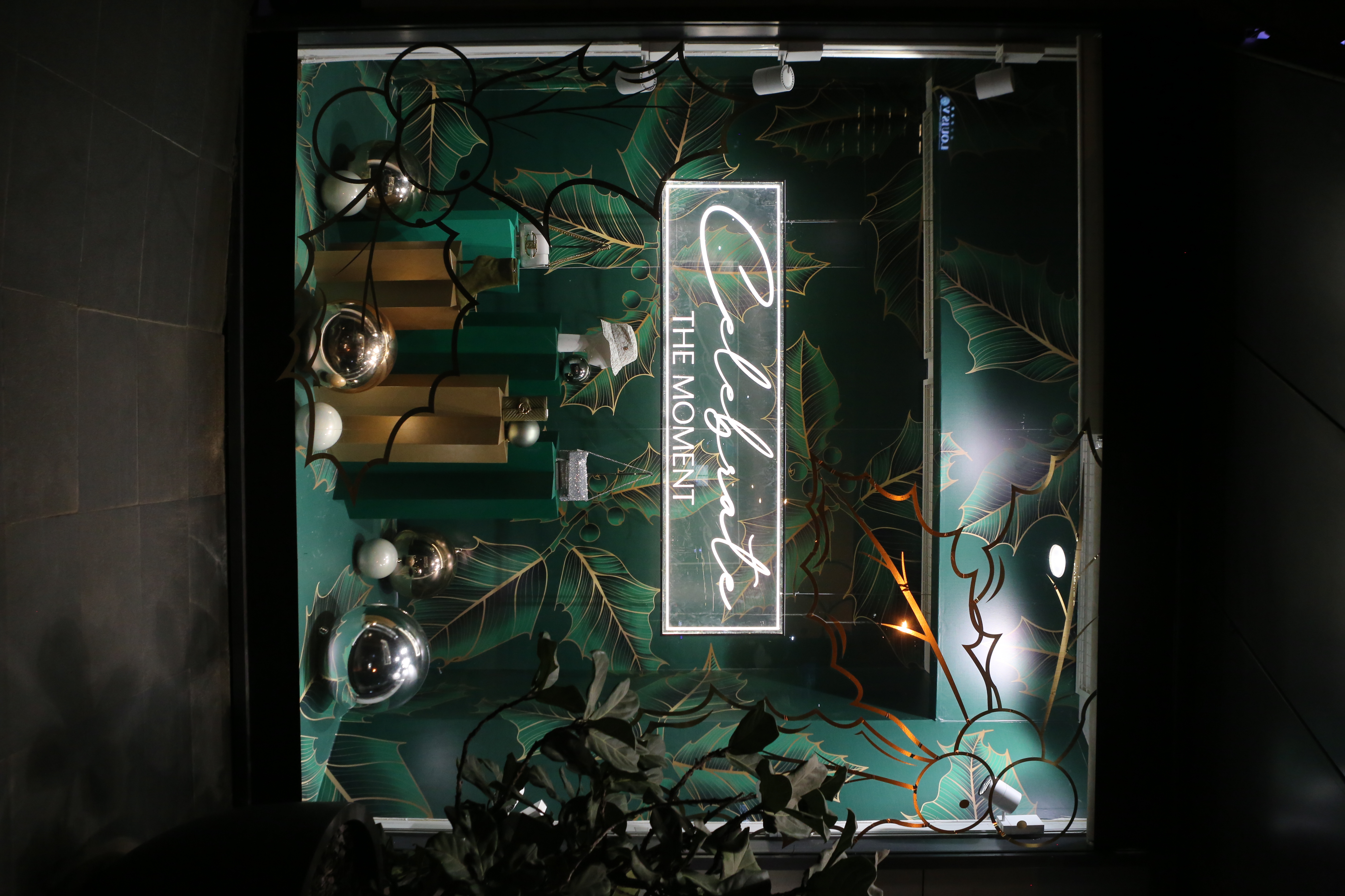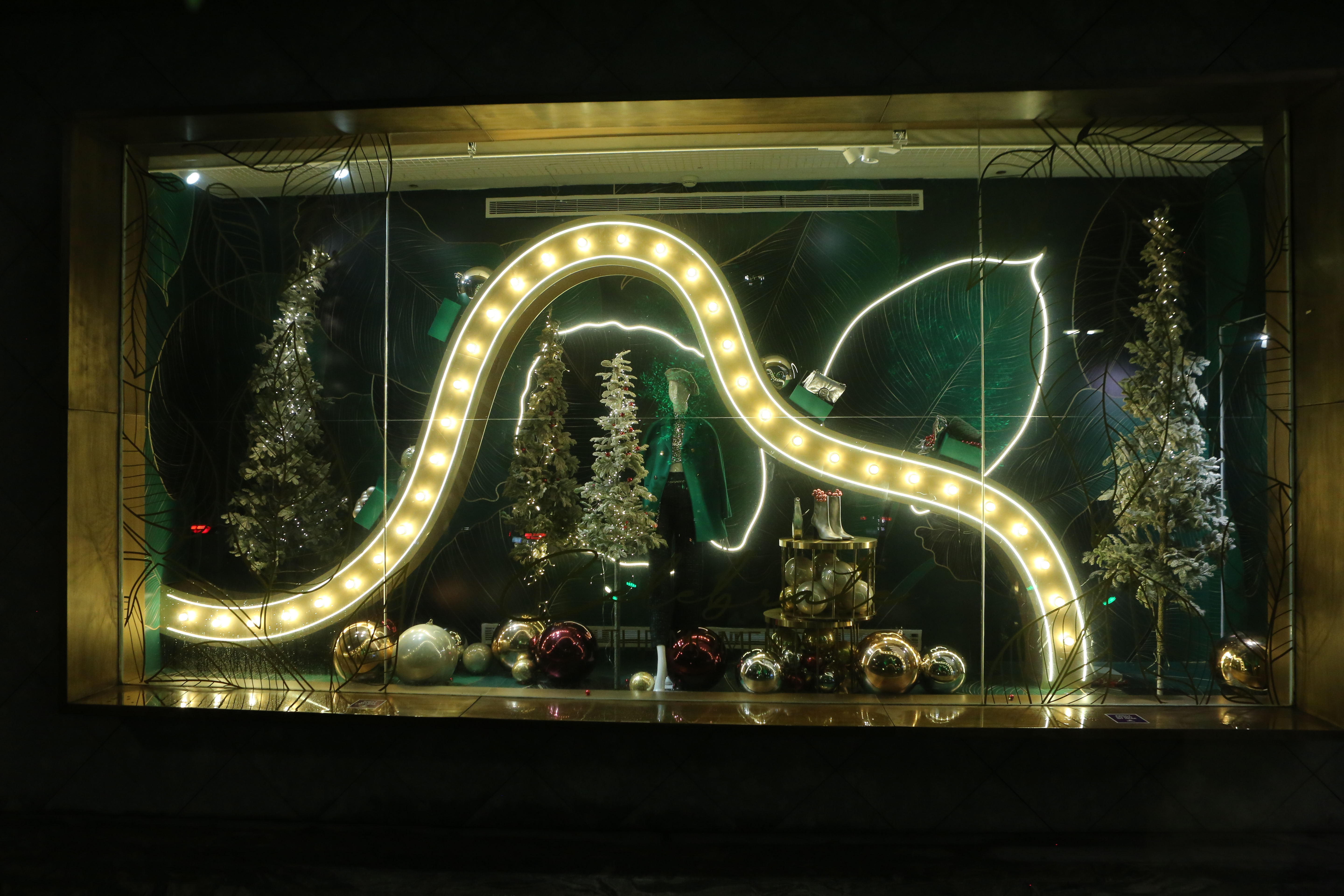 ABC Lebanon Holiday Fashion Windows titled "Celebrate The Moment". Forest element props to create a fairytale botanical Christmas mood by focusing on the green color and themes of "Enchanted Christmas Forest" and "Rebirth in Nature".