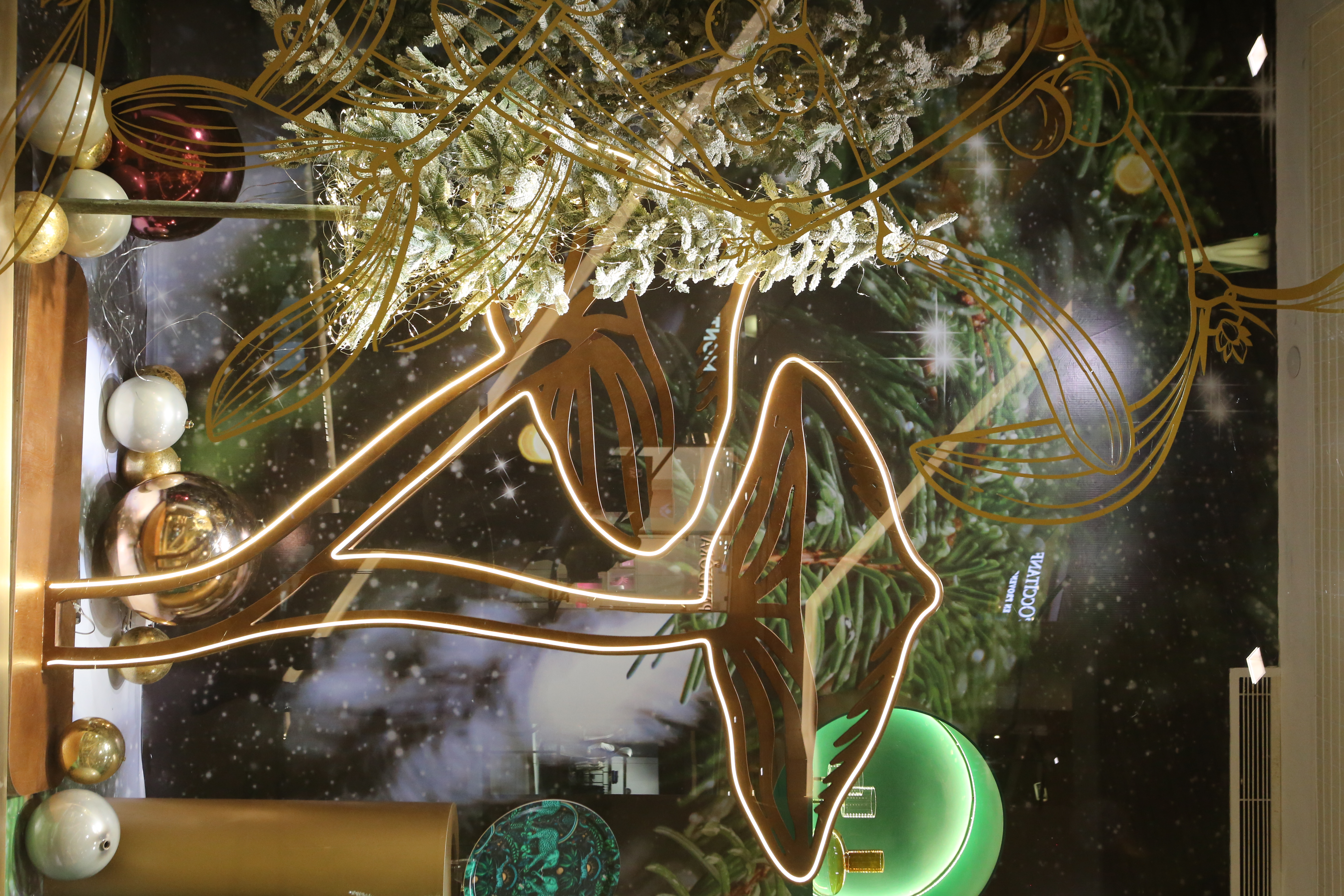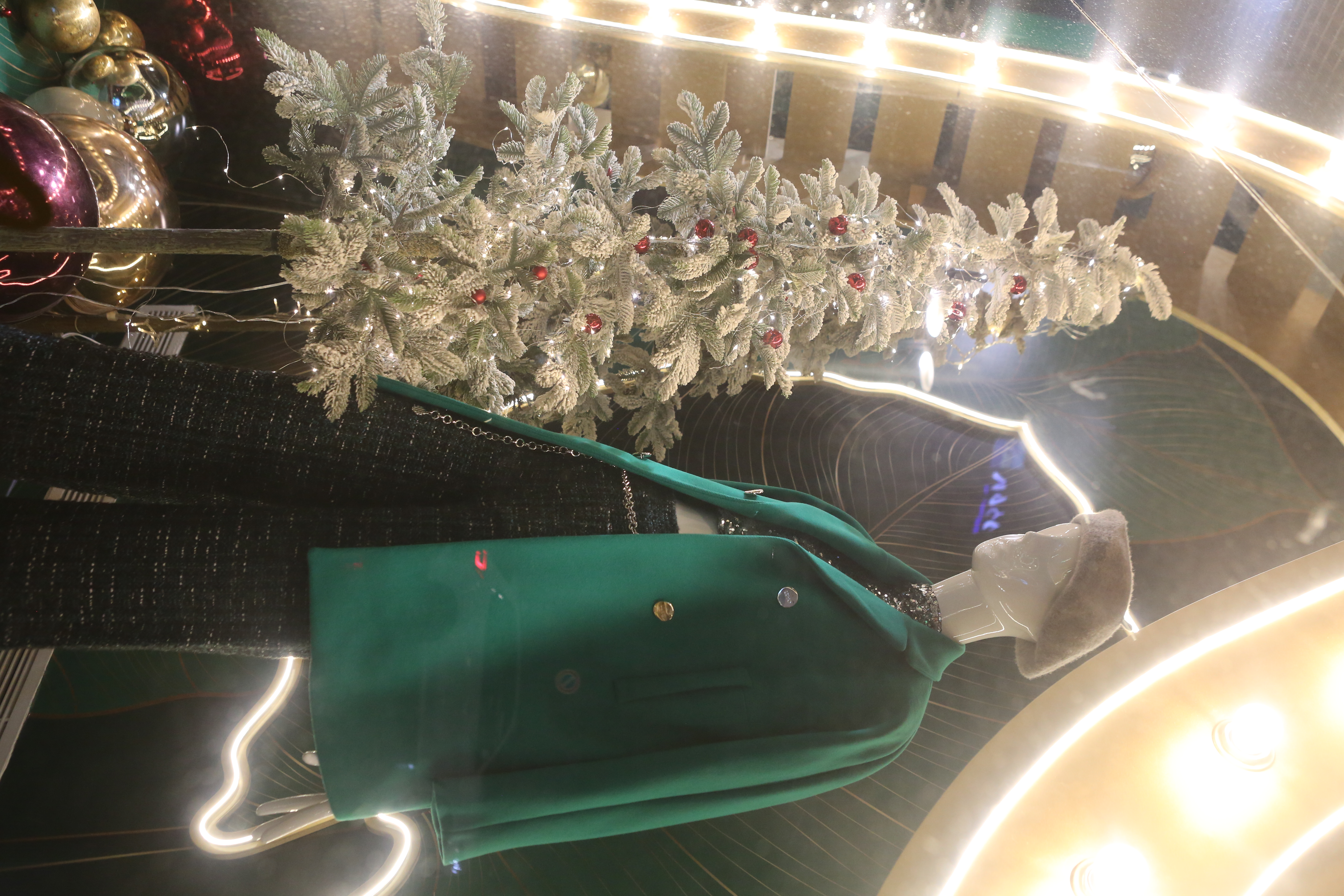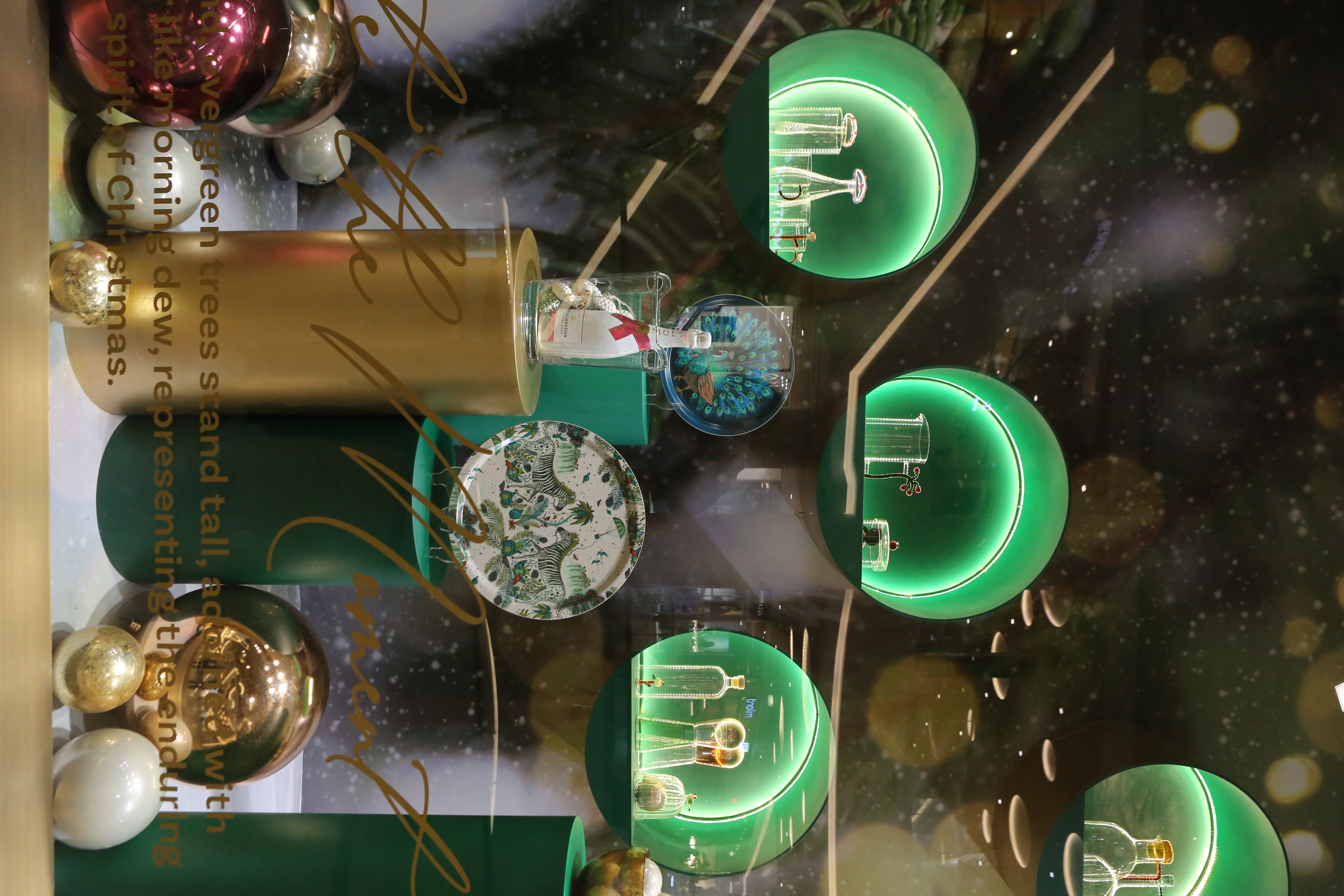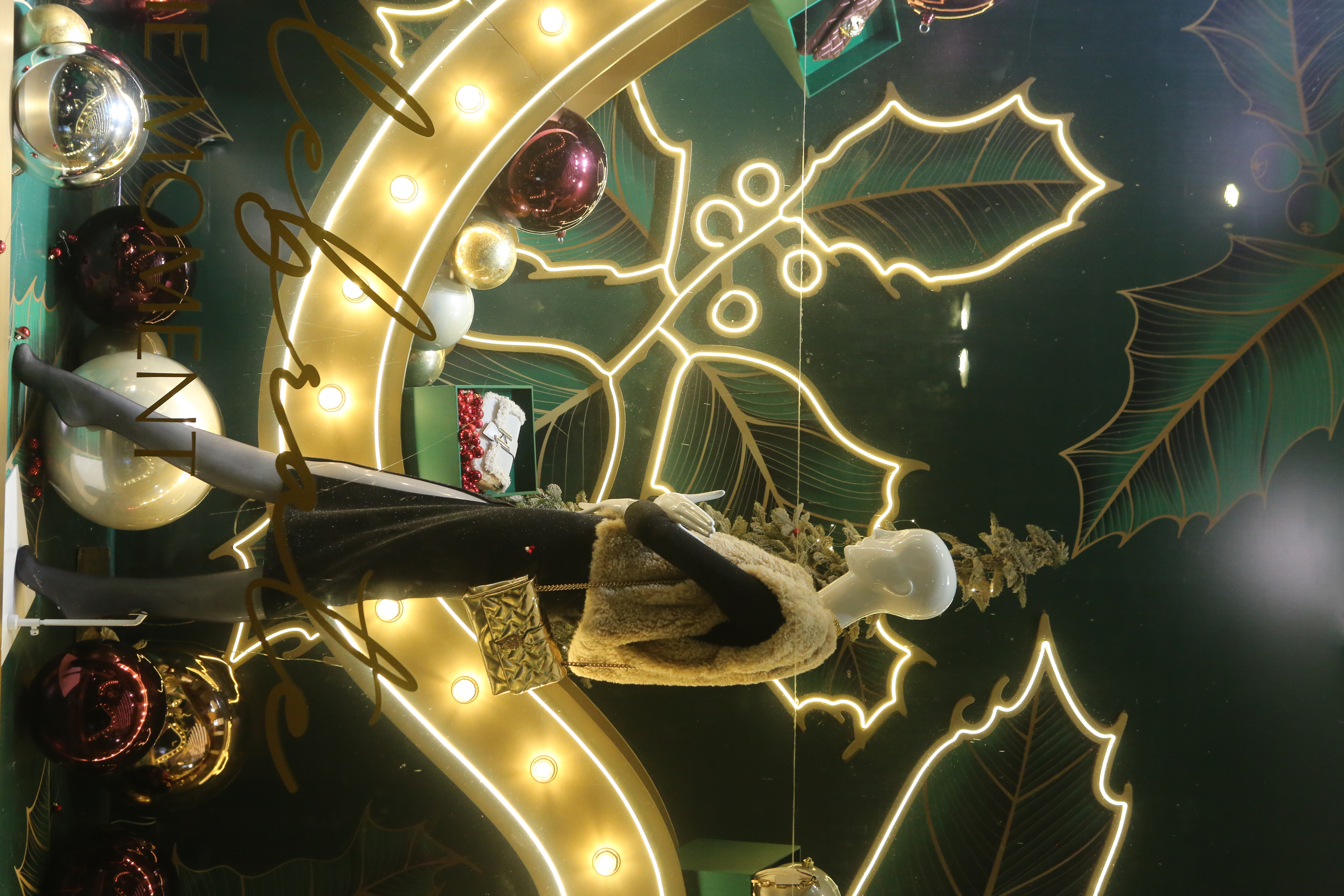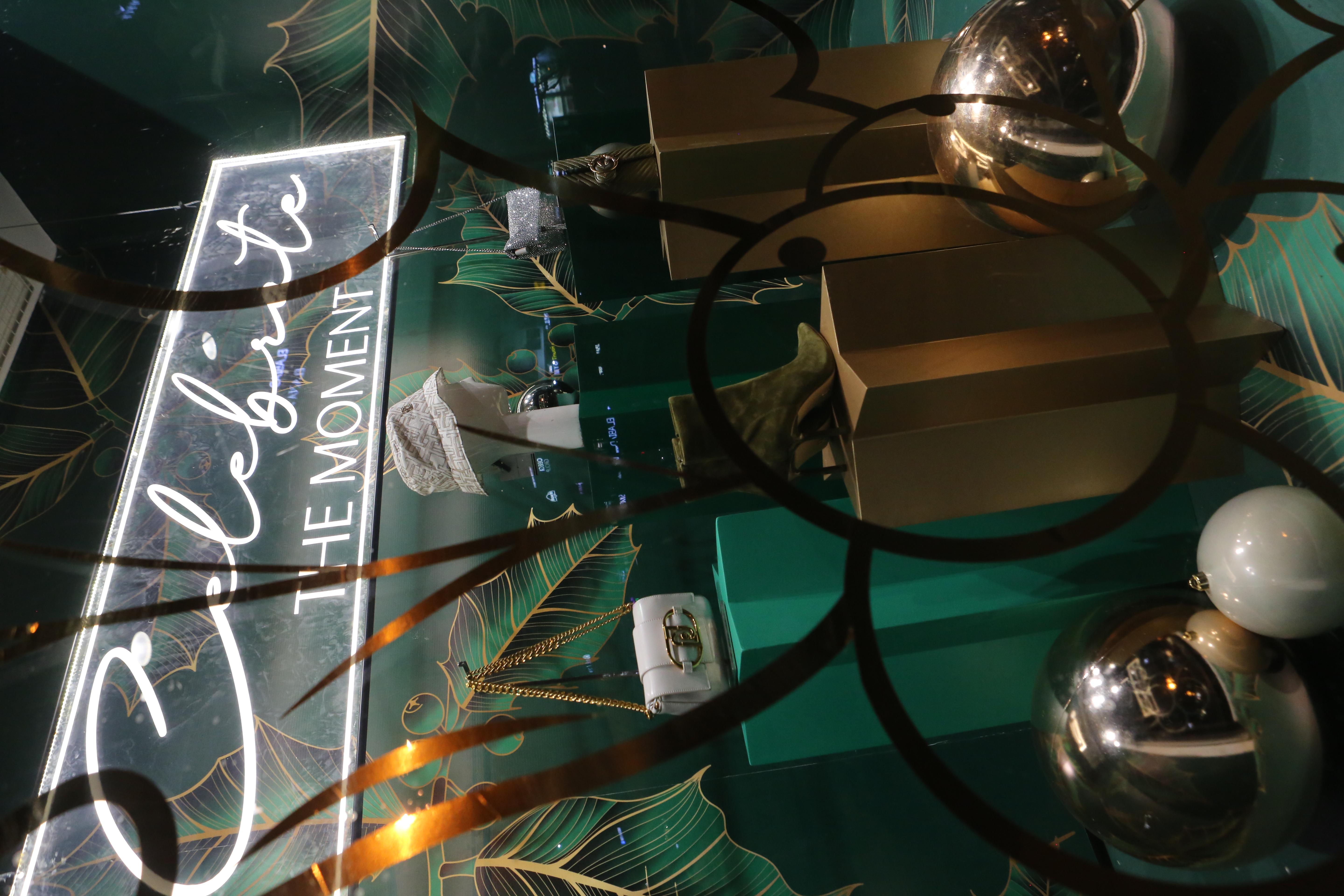ABC Lebanon Holiday Fashion Windows titled "Celebrate The Moment". Forest element props to create a fairytale botanical Christmas mood by focusing on the green color and themes of "Enchanted Christmas Forest" and "Rebirth in Nature".