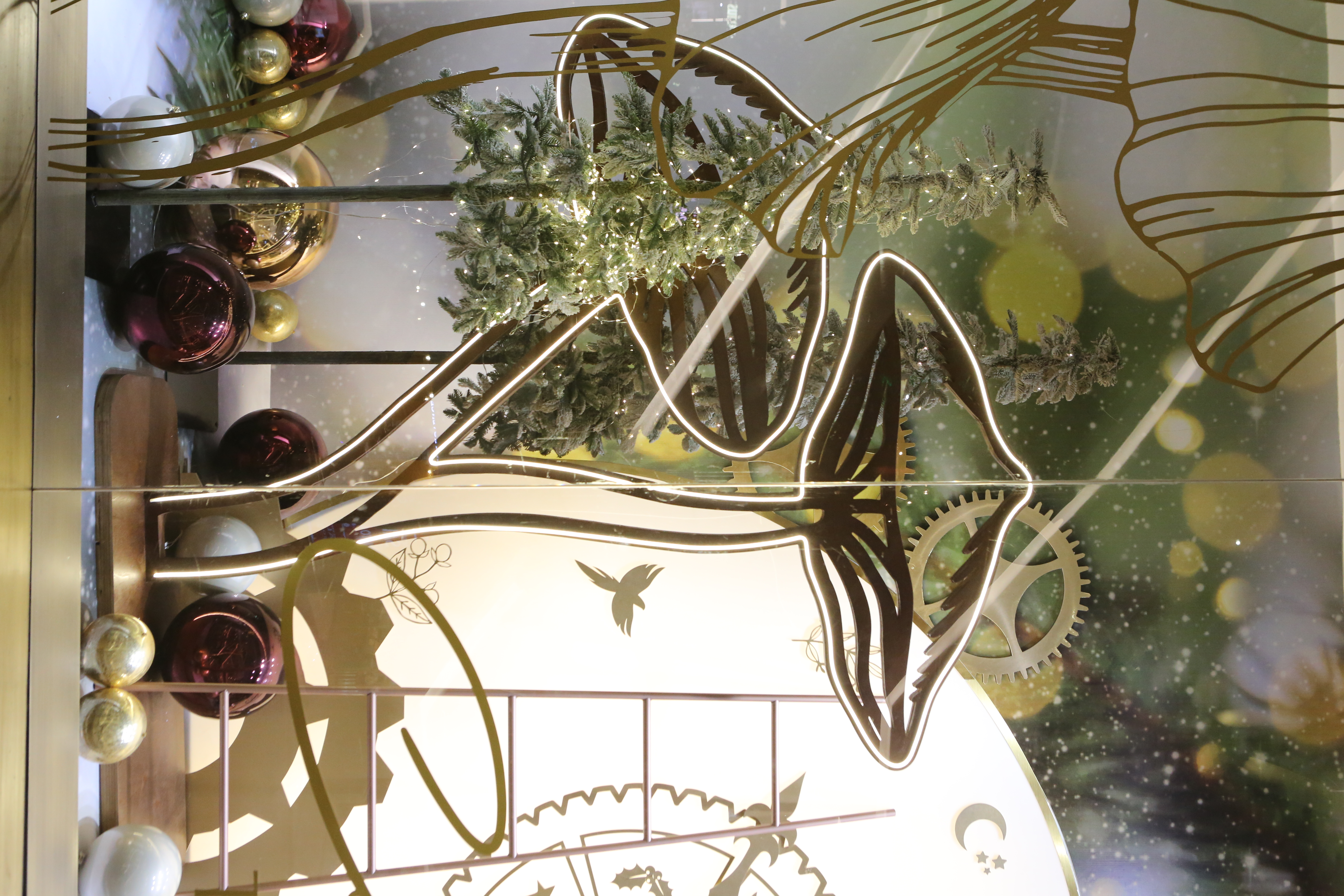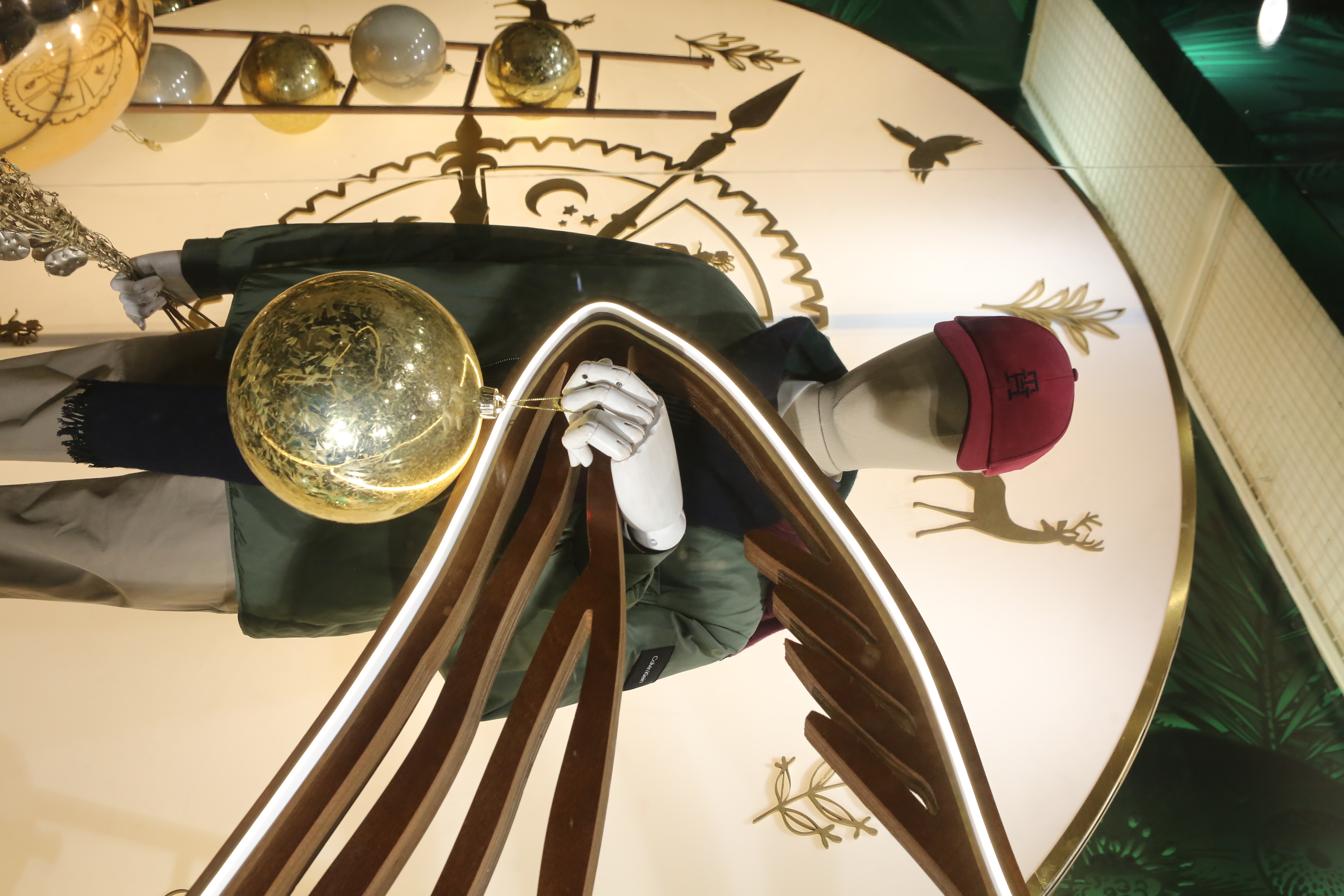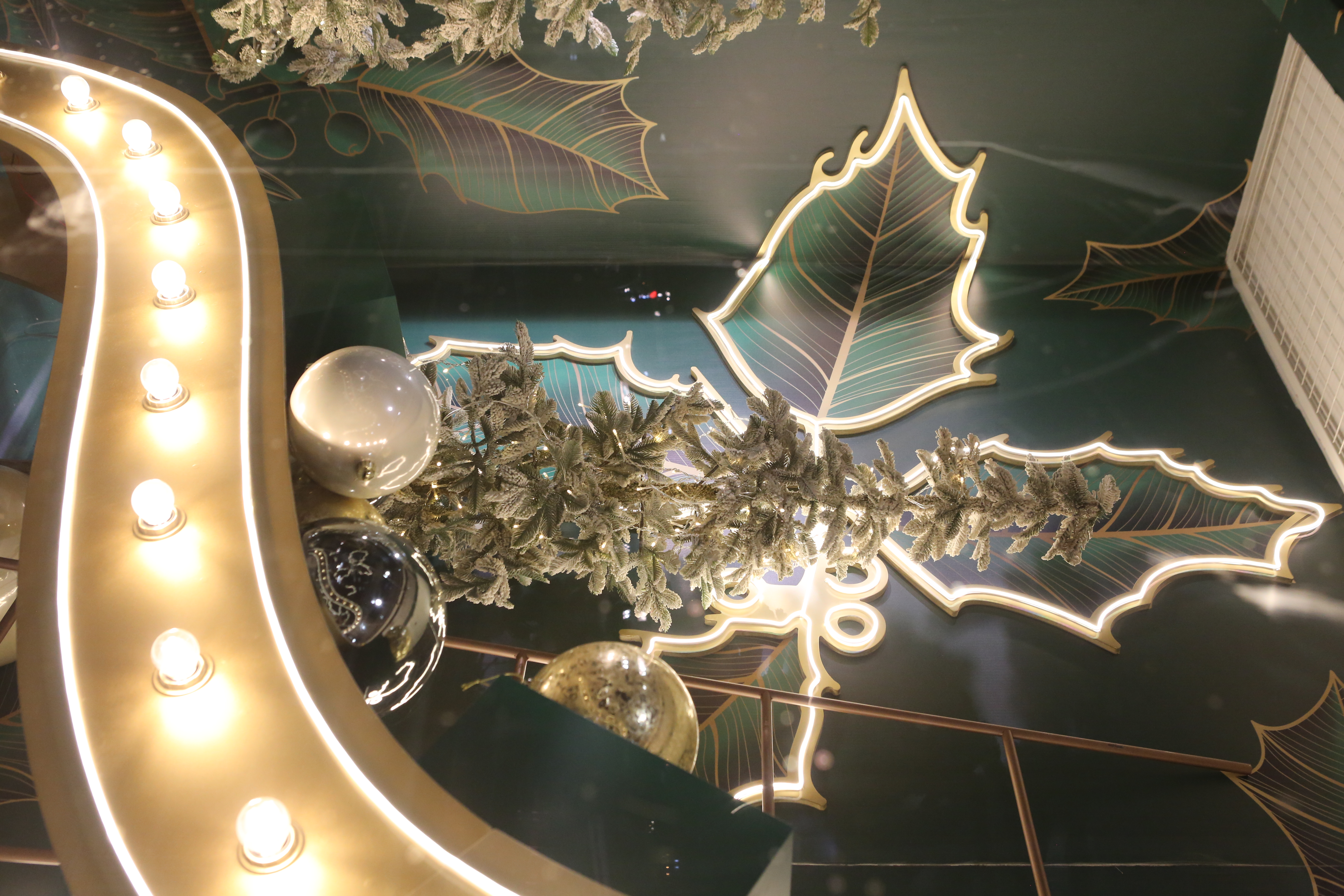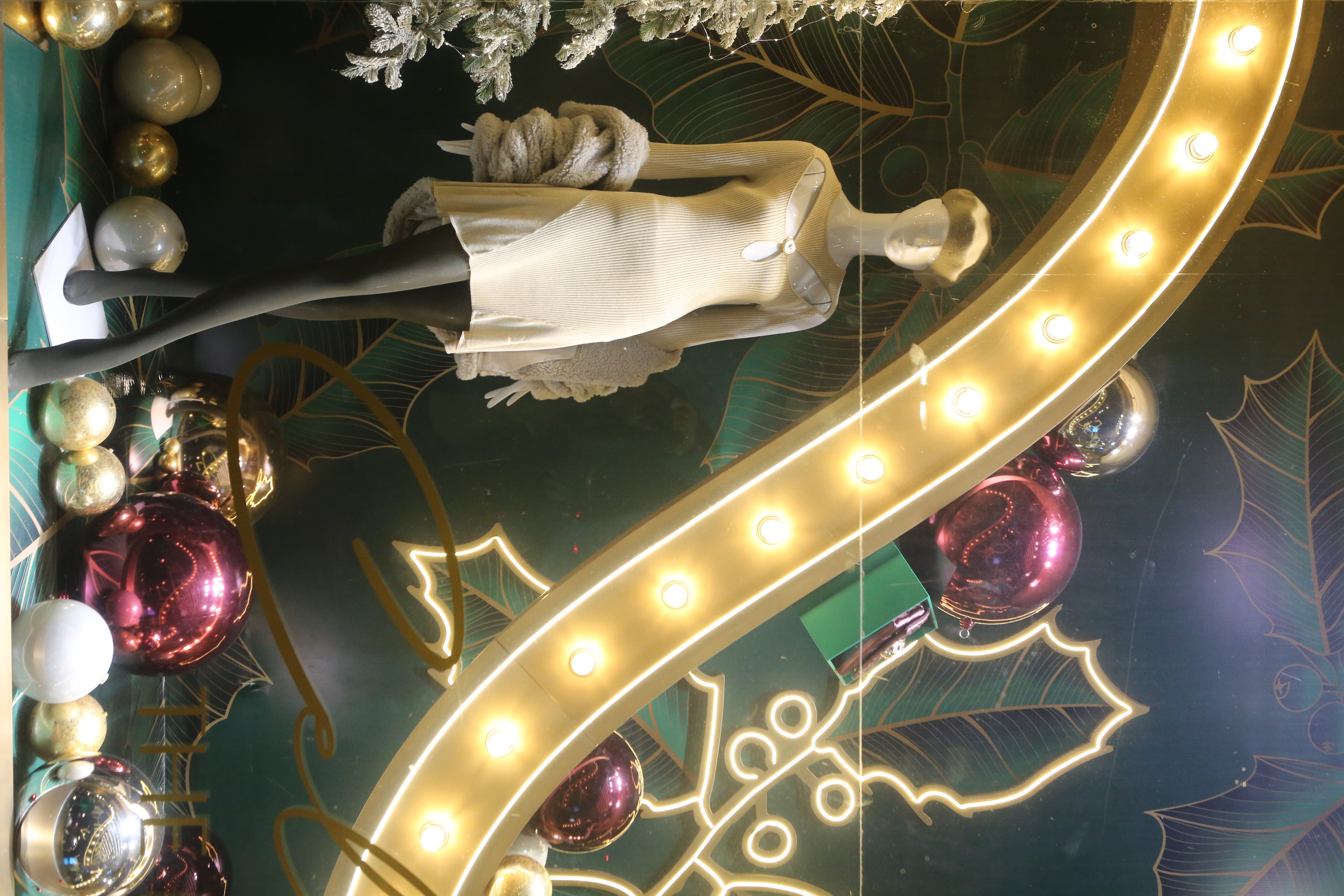 ABC Lebanon Holiday Fashion Windows titled "Celebrate The Moment". Forest element props to create a fairytale botanical Christmas mood by focusing on the green color and themes of "Enchanted Christmas Forest" and "Rebirth in Nature".