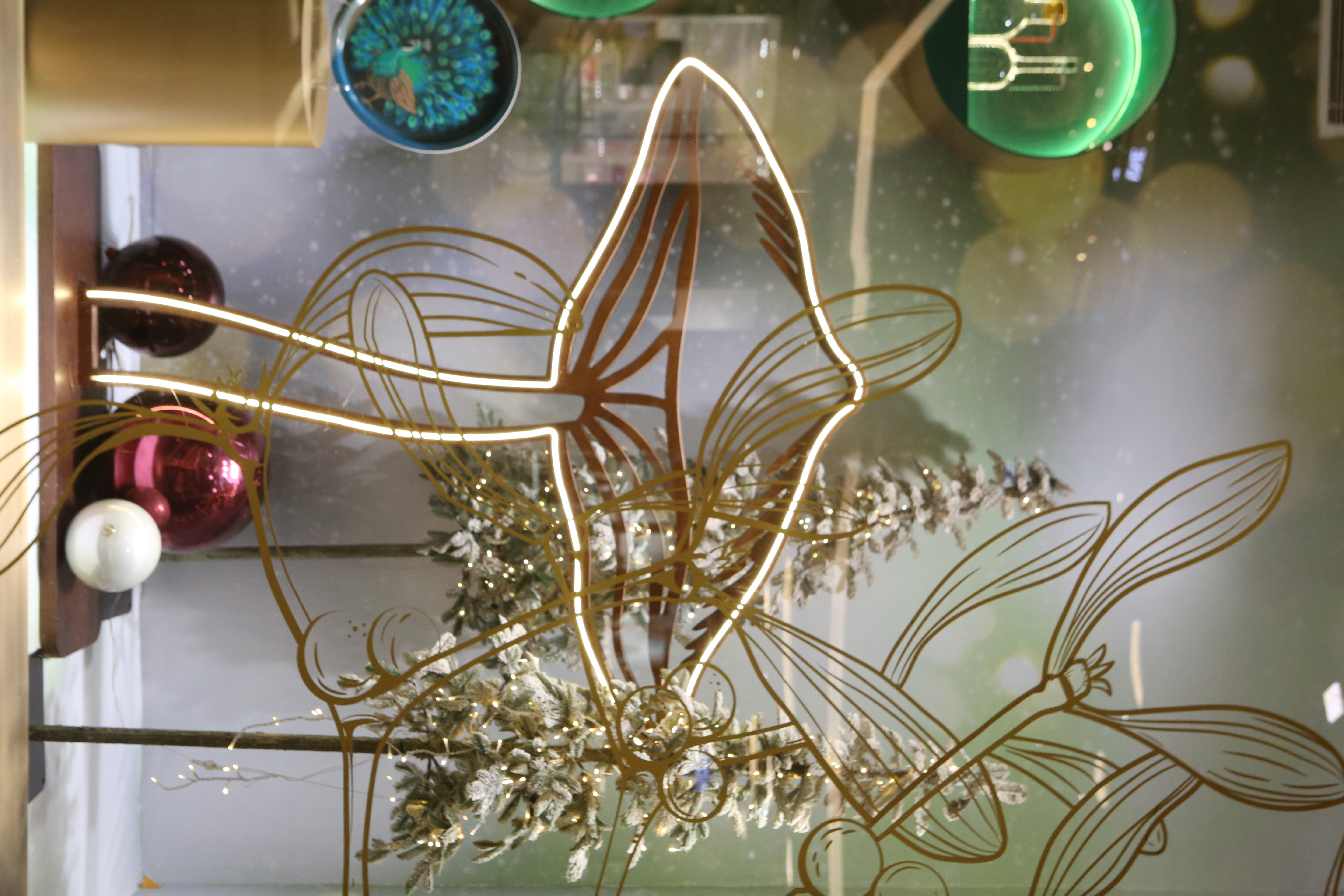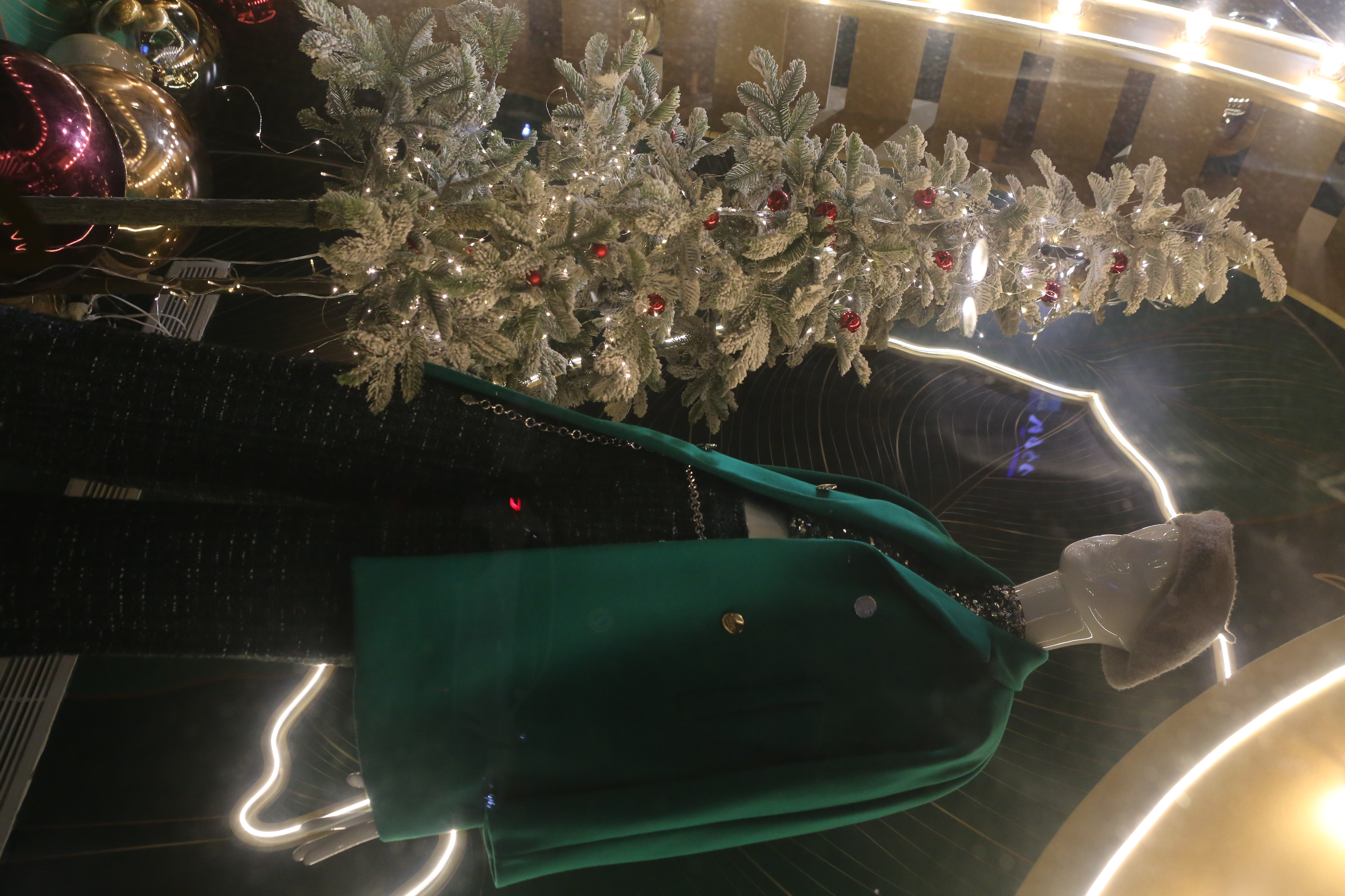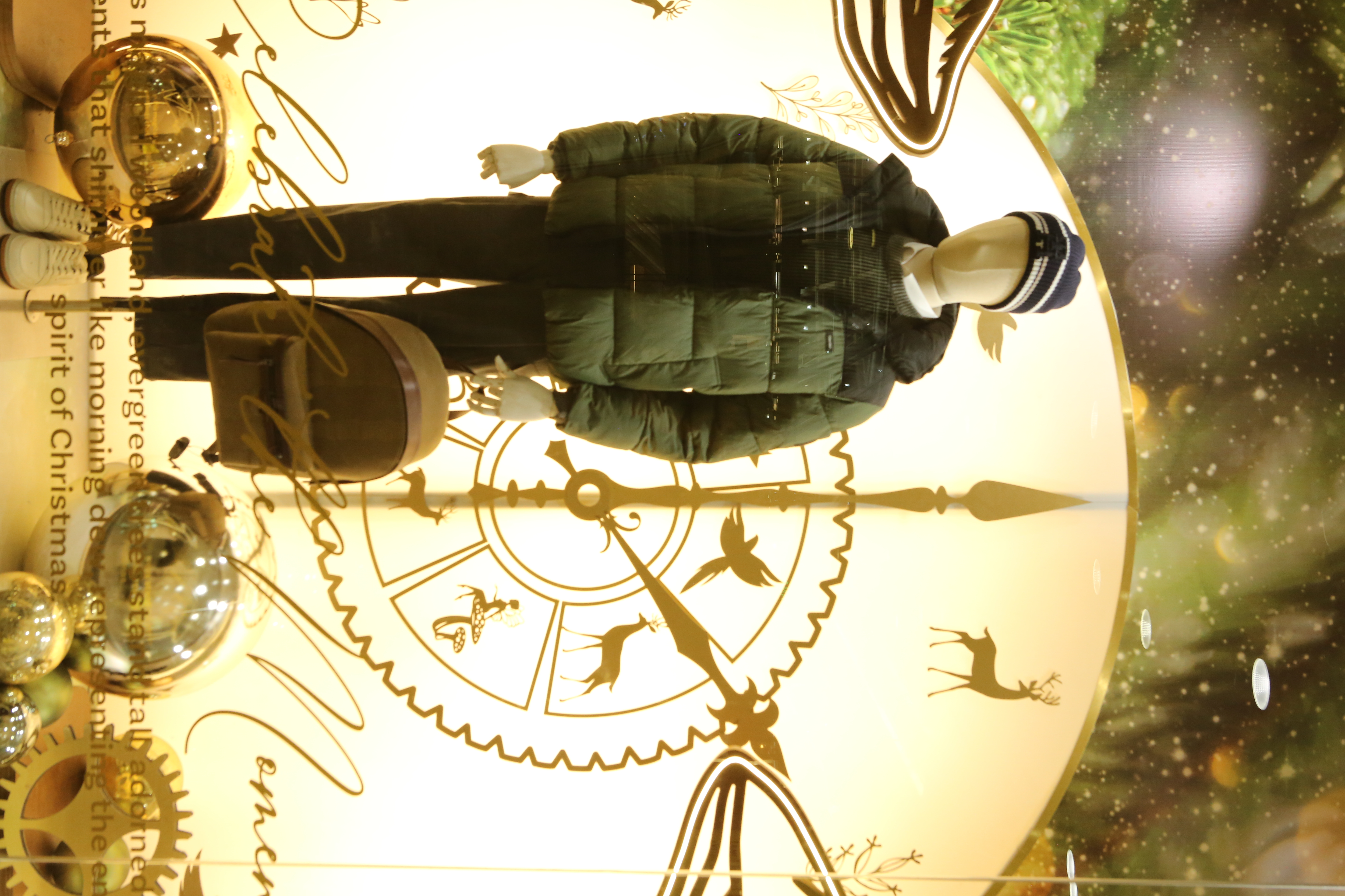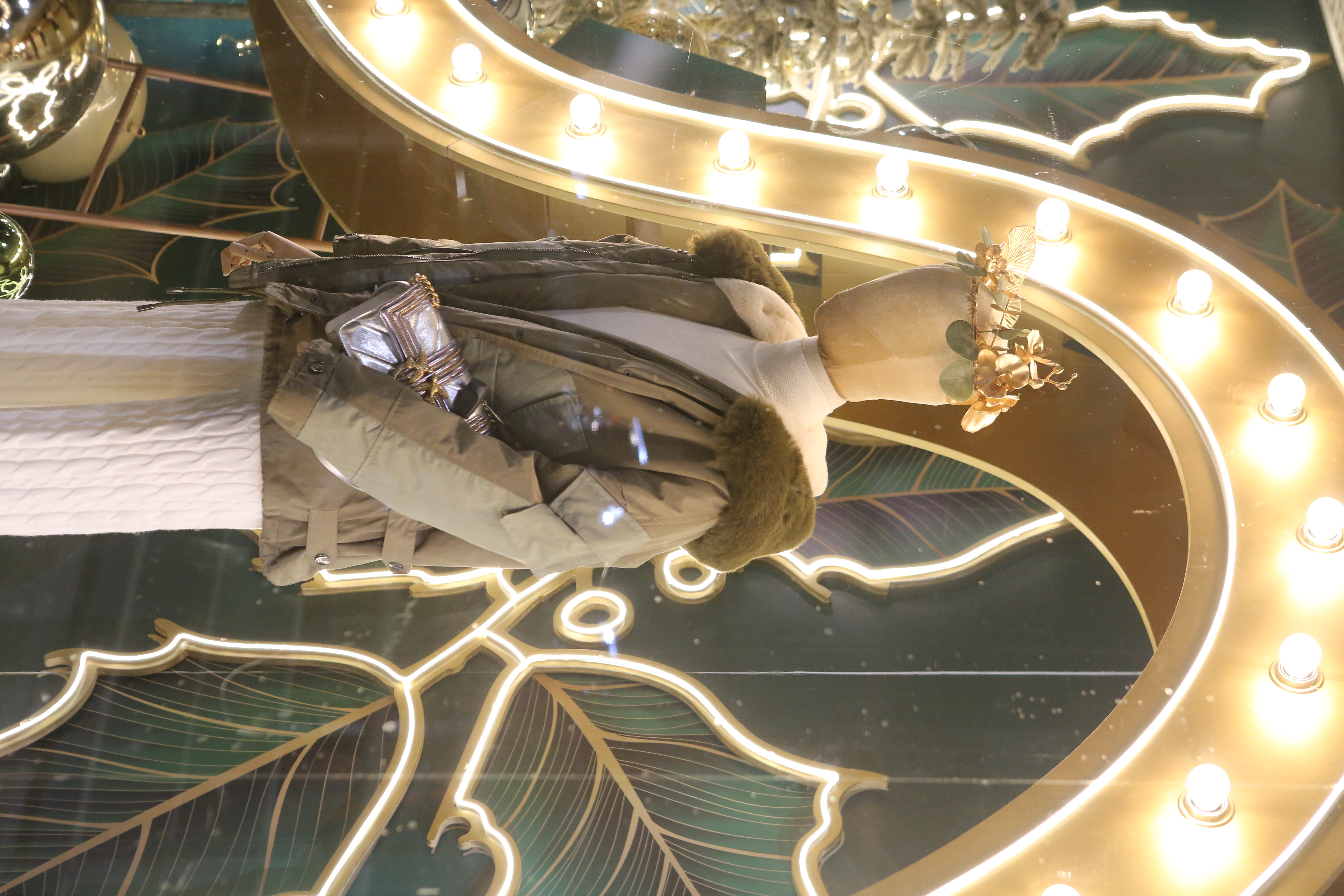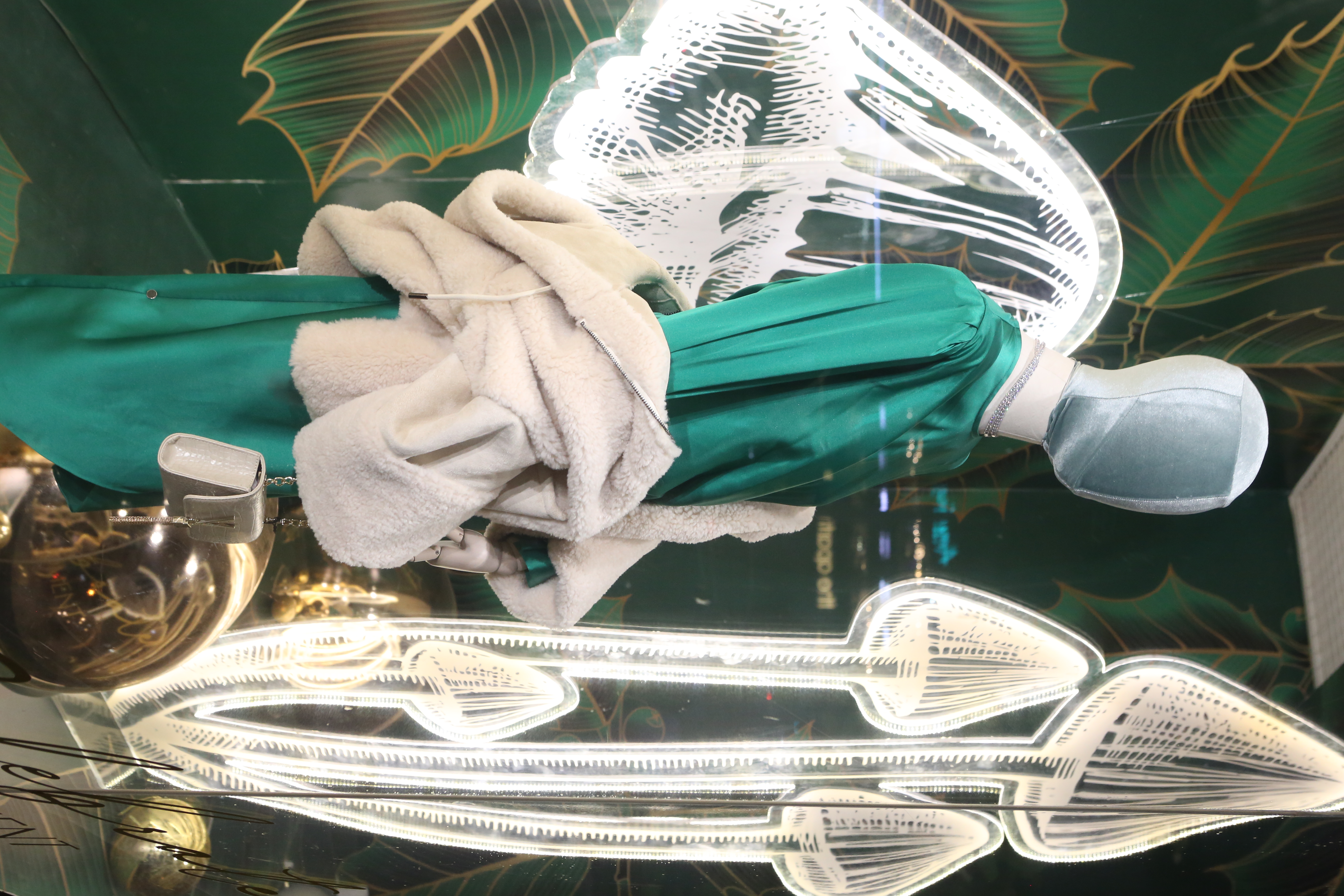 ABC Lebanon Holiday Fashion Windows titled "Celebrate The Moment". Forest element props to create a fairytale botanical Christmas mood by focusing on the green color and themes of "Enchanted Christmas Forest" and "Rebirth in Nature".