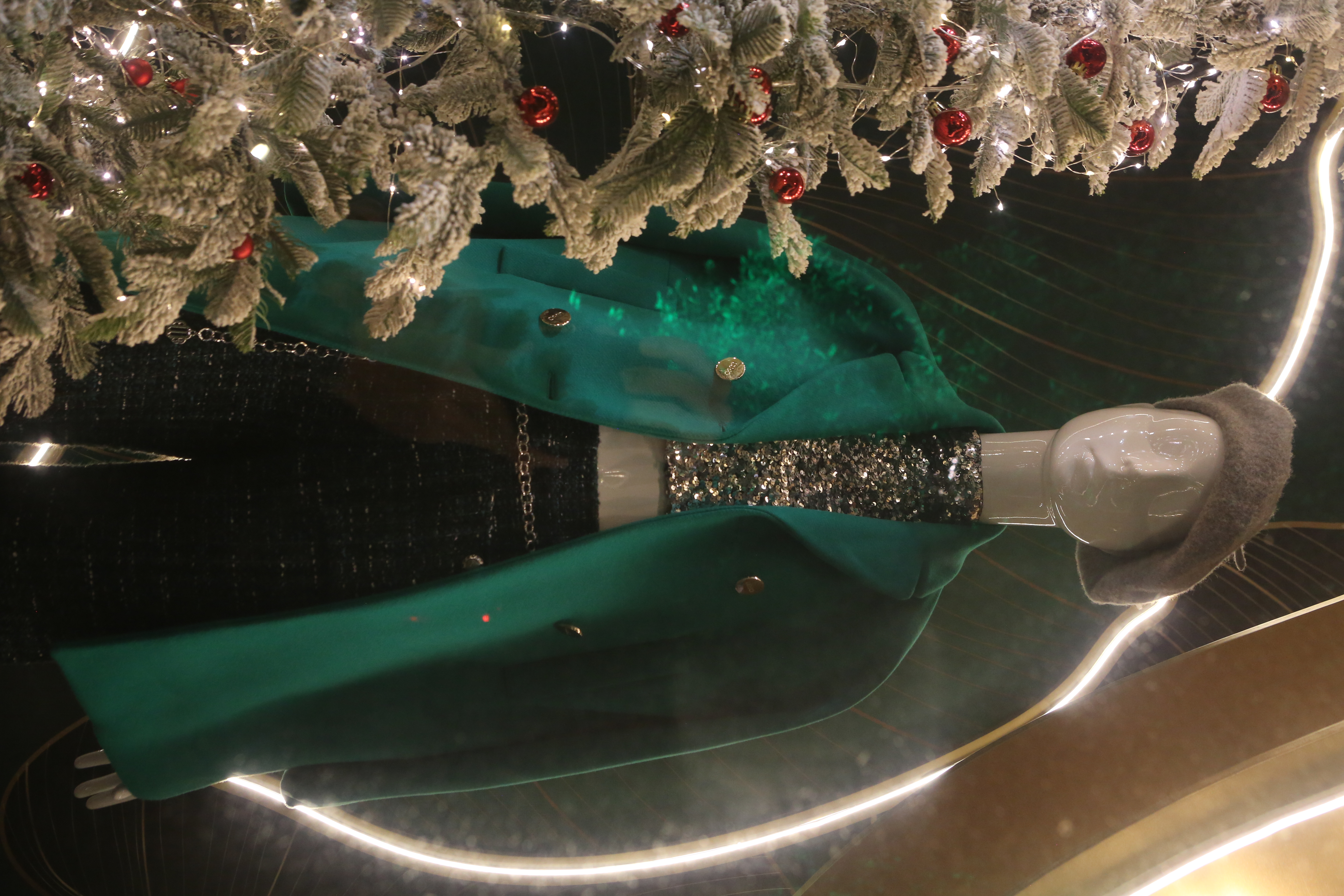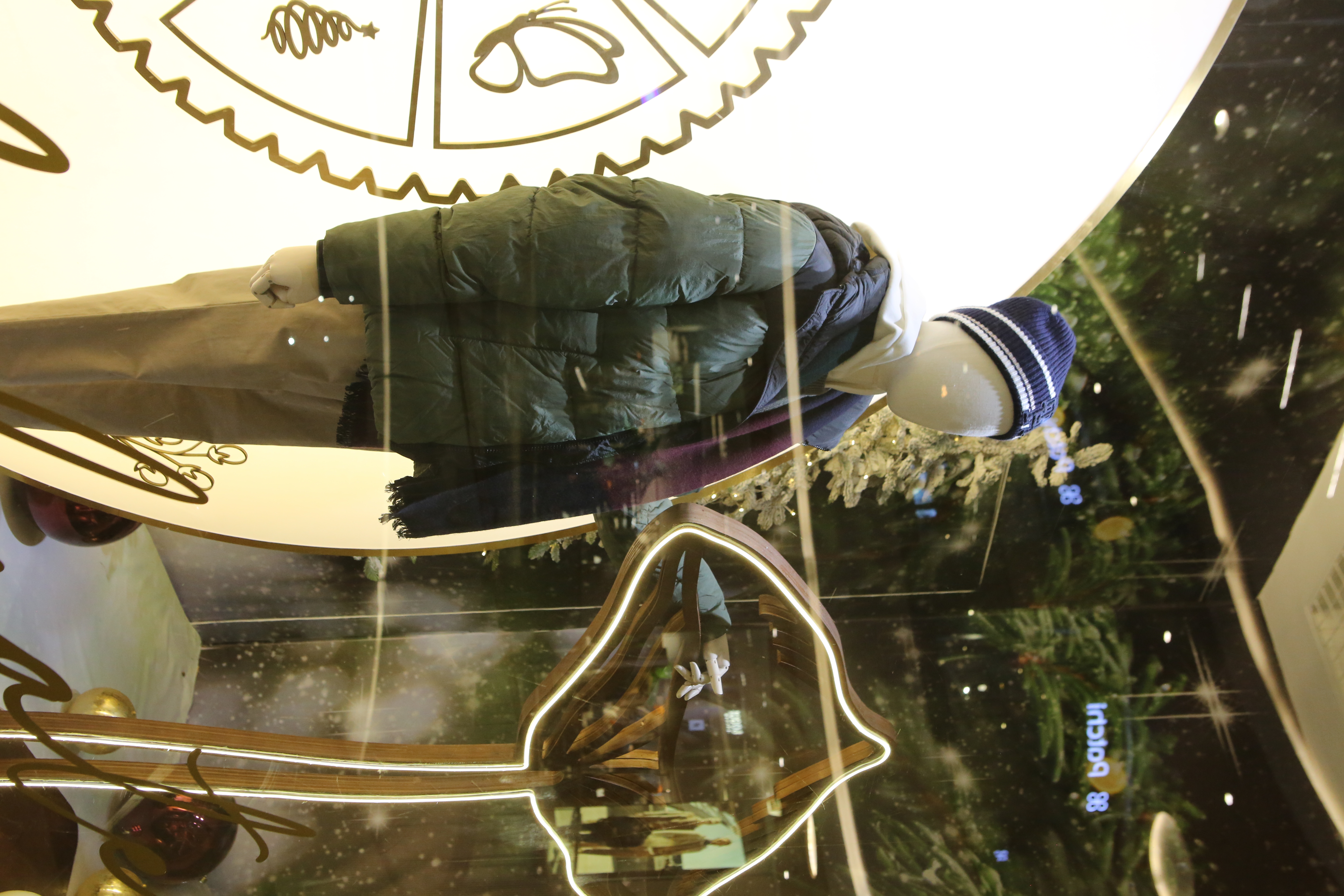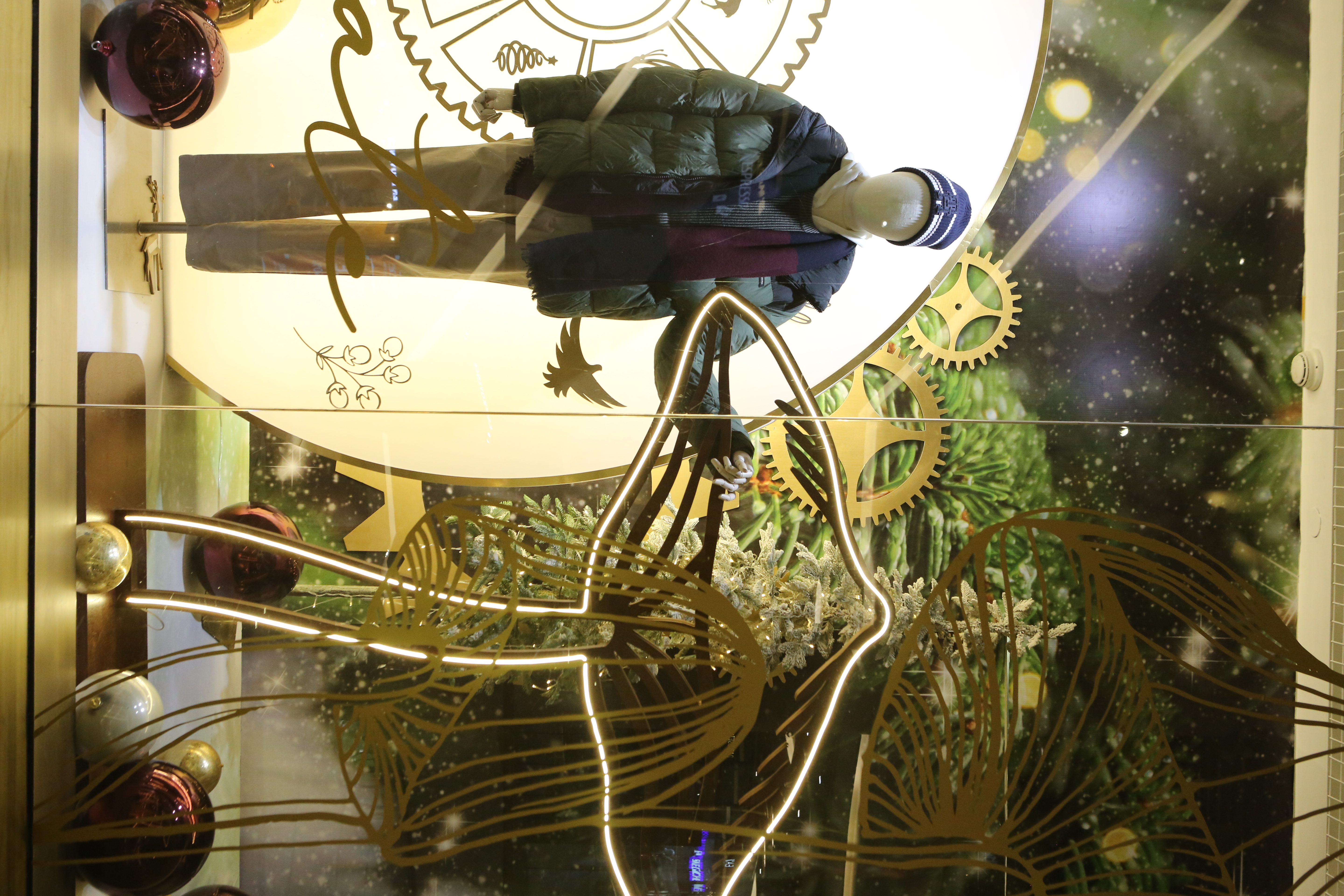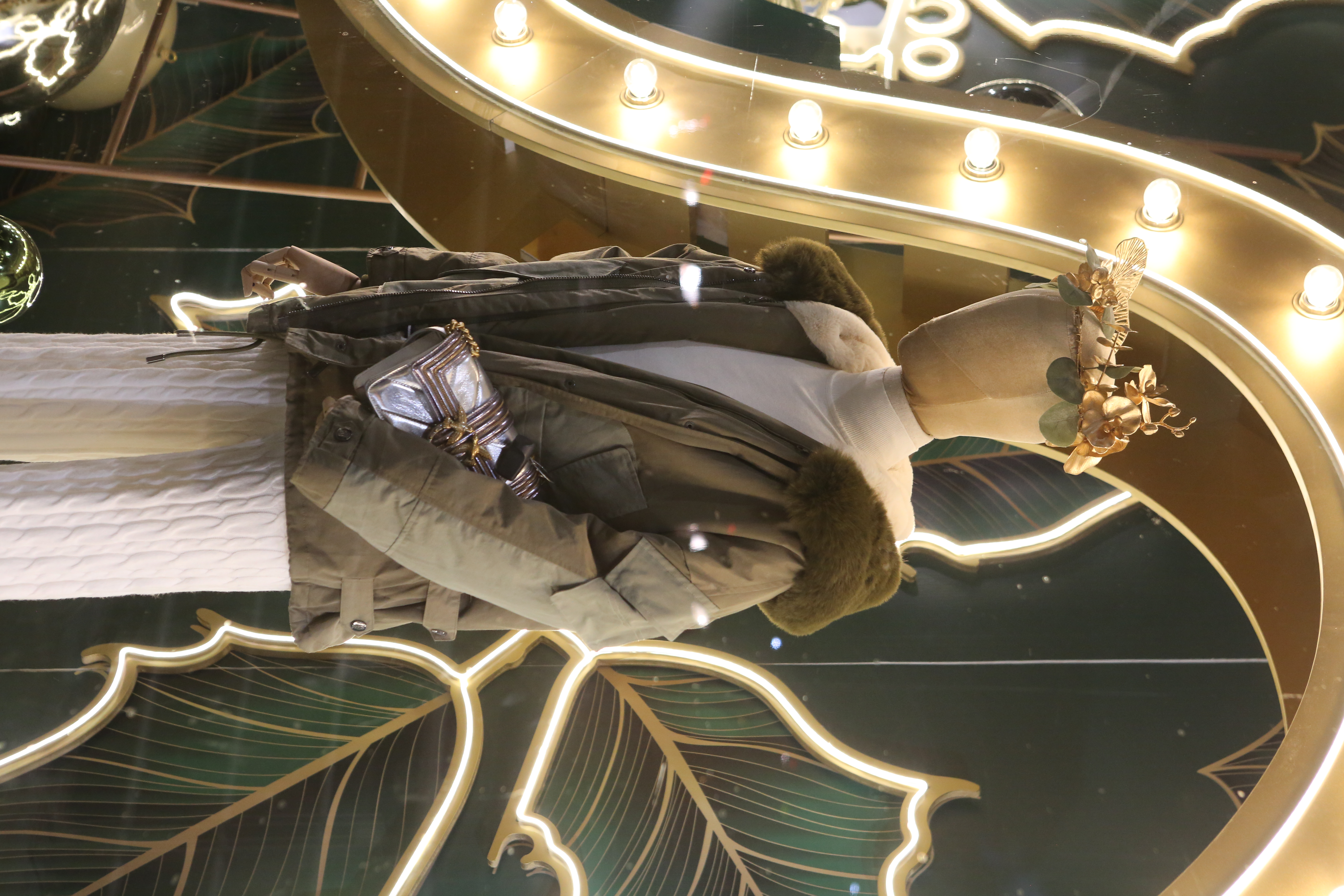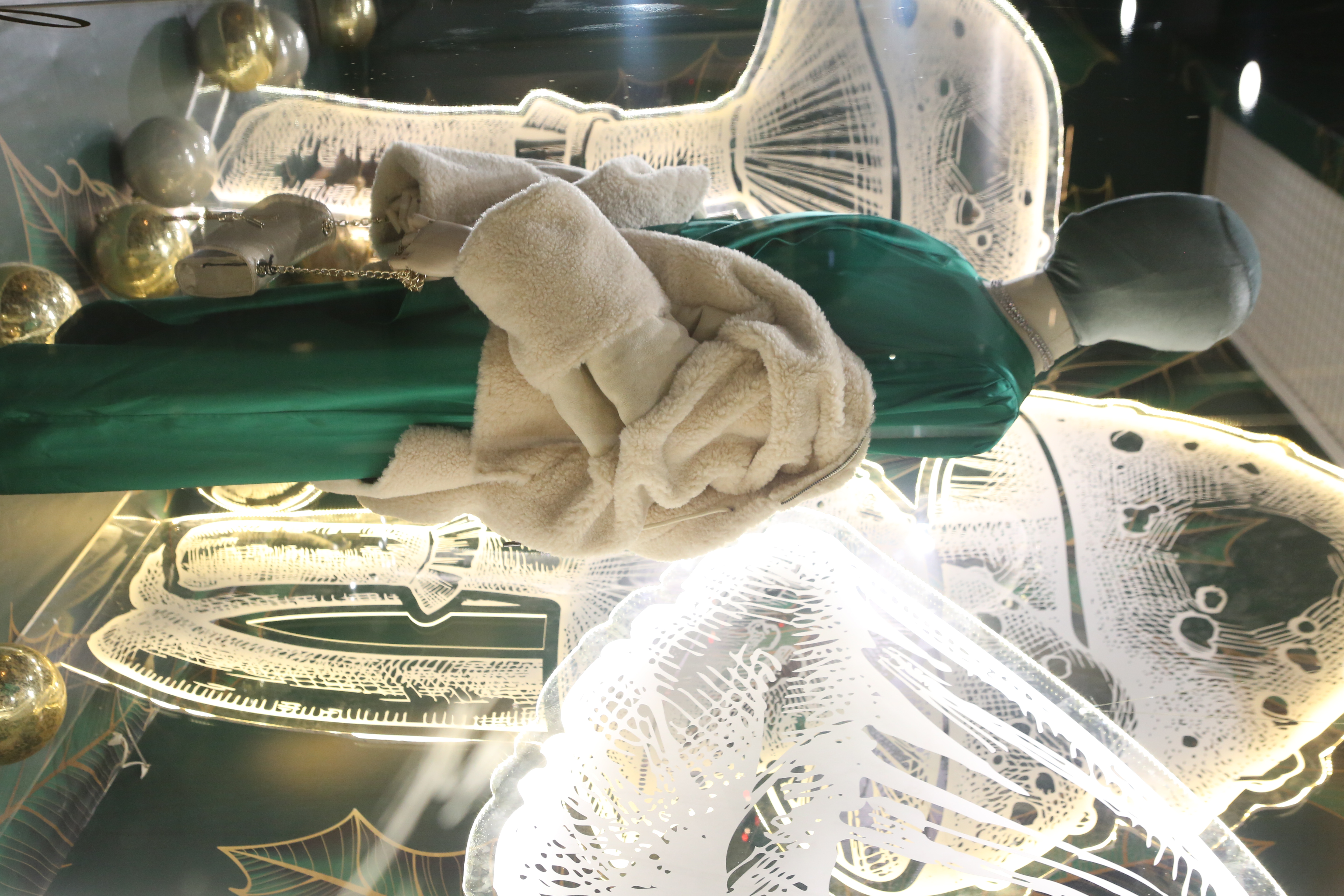 ABC Lebanon Holiday Fashion Windows titled "Celebrate The Moment". Forest element props to create a fairytale botanical Christmas mood by focusing on the green color and themes of "Enchanted Christmas Forest" and "Rebirth in Nature".