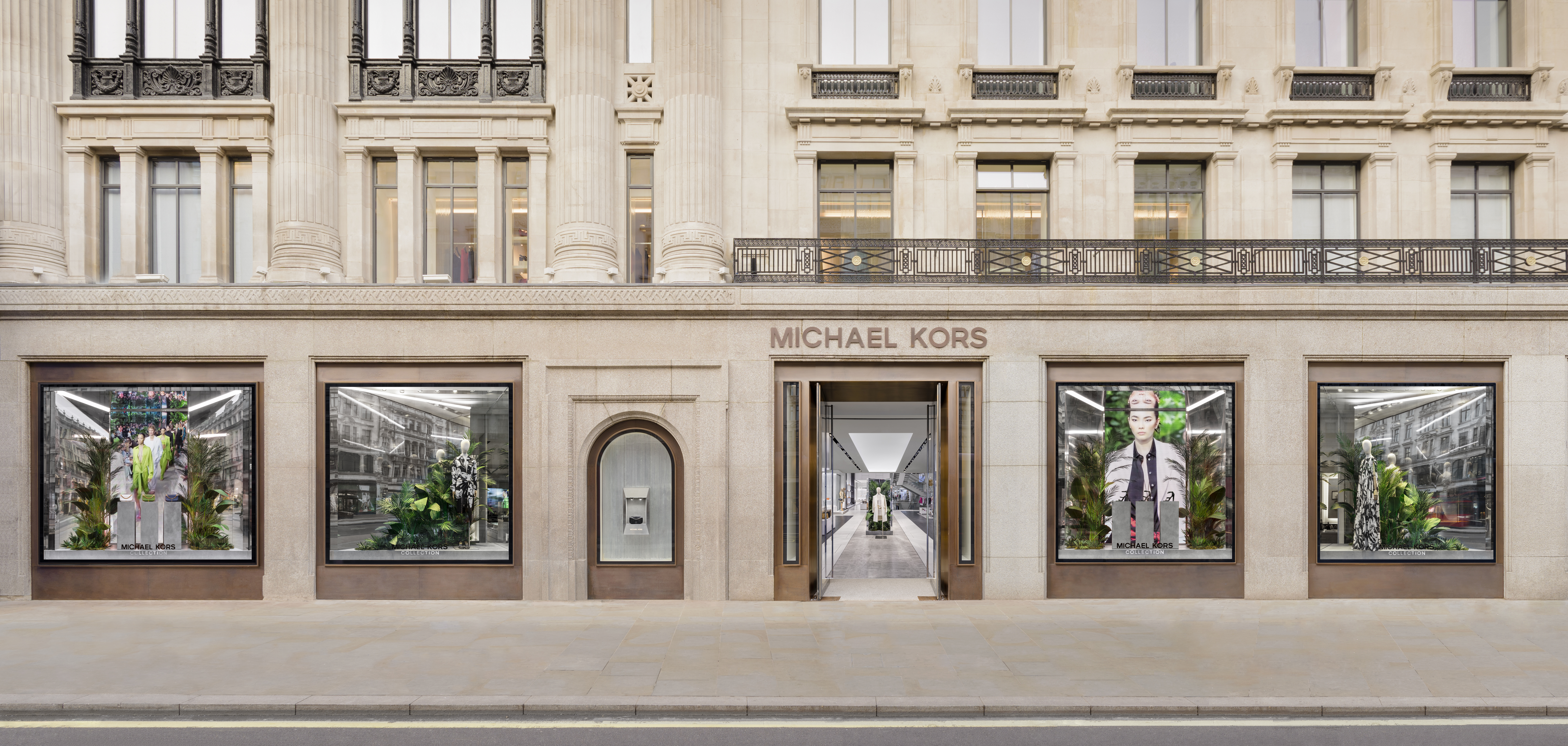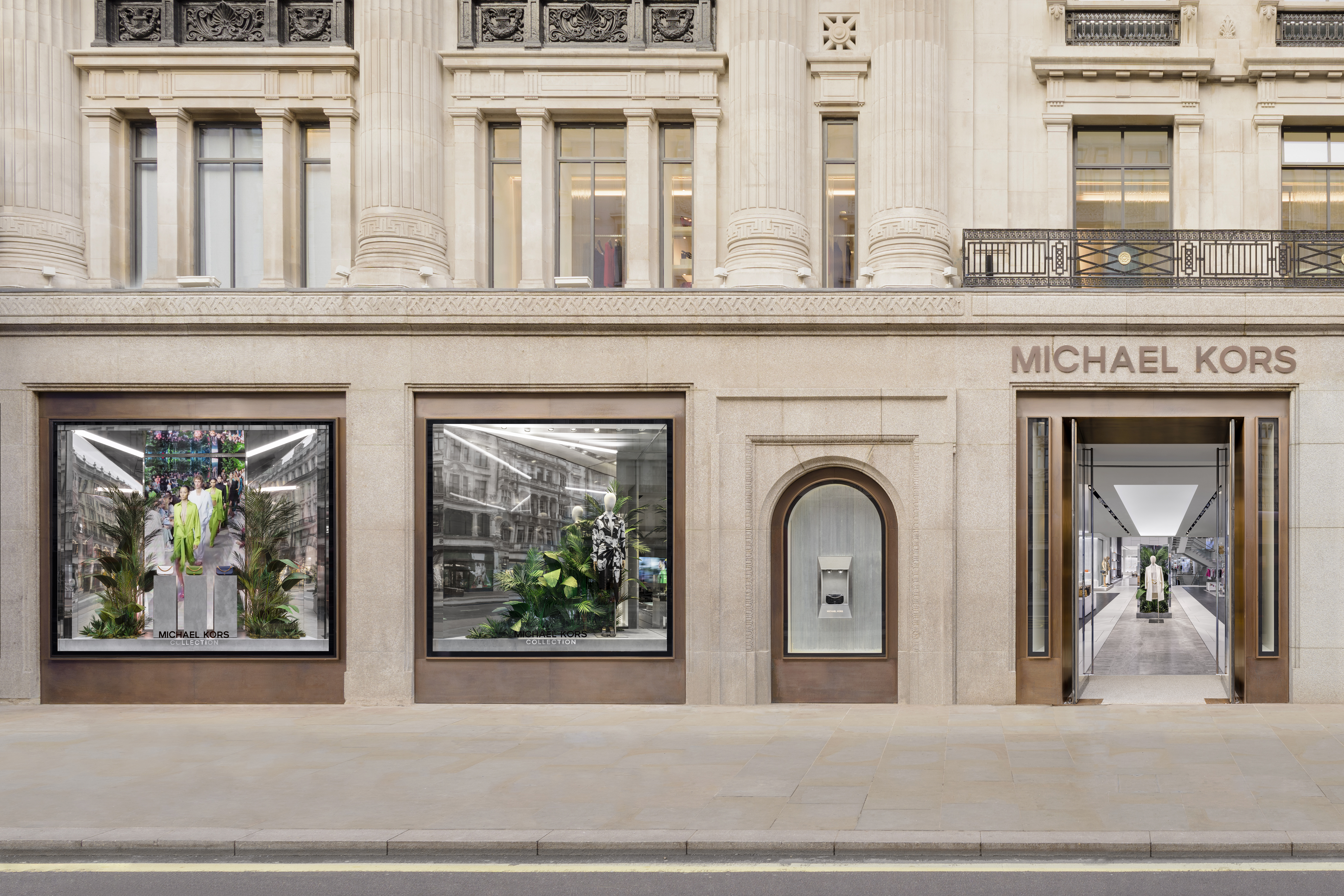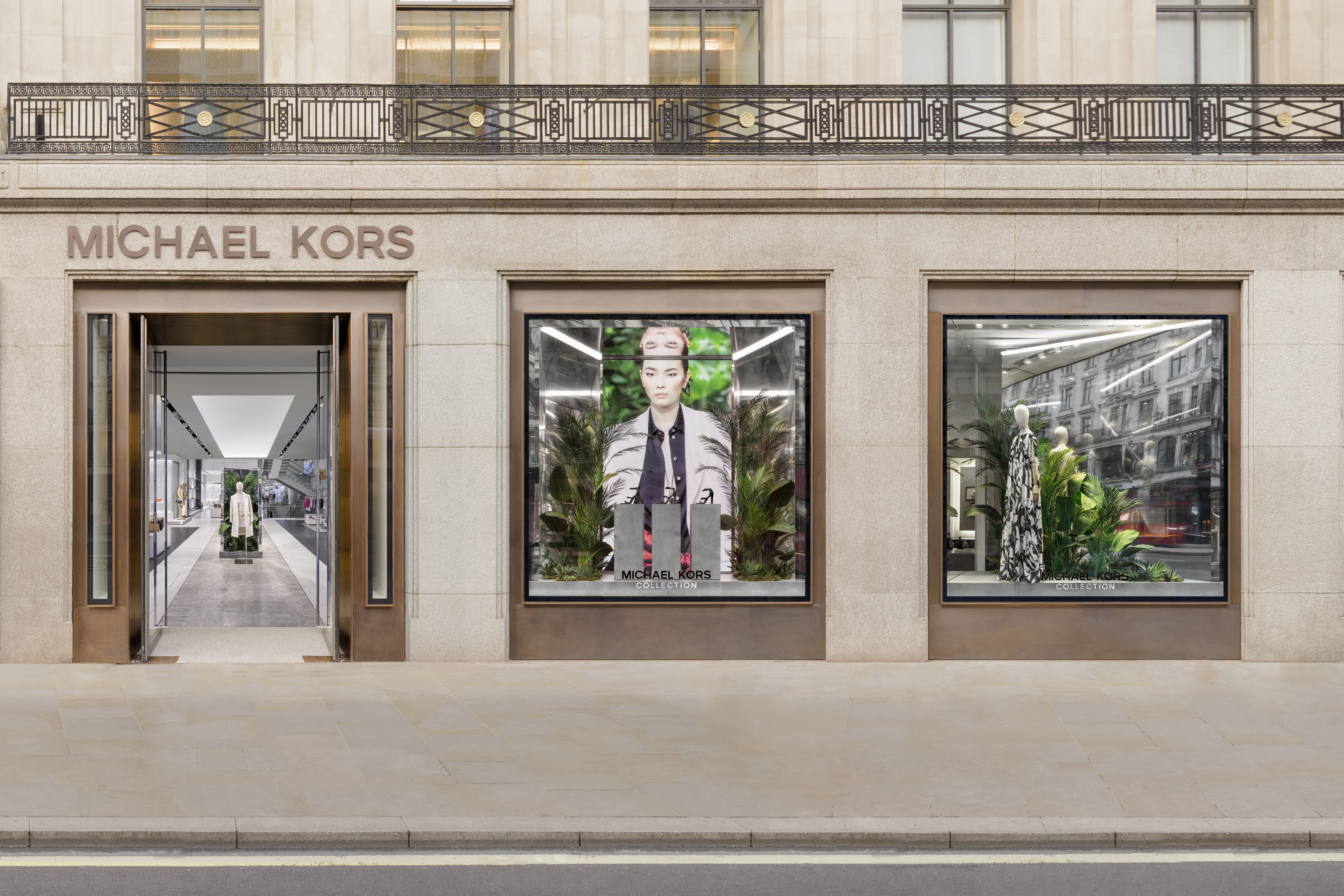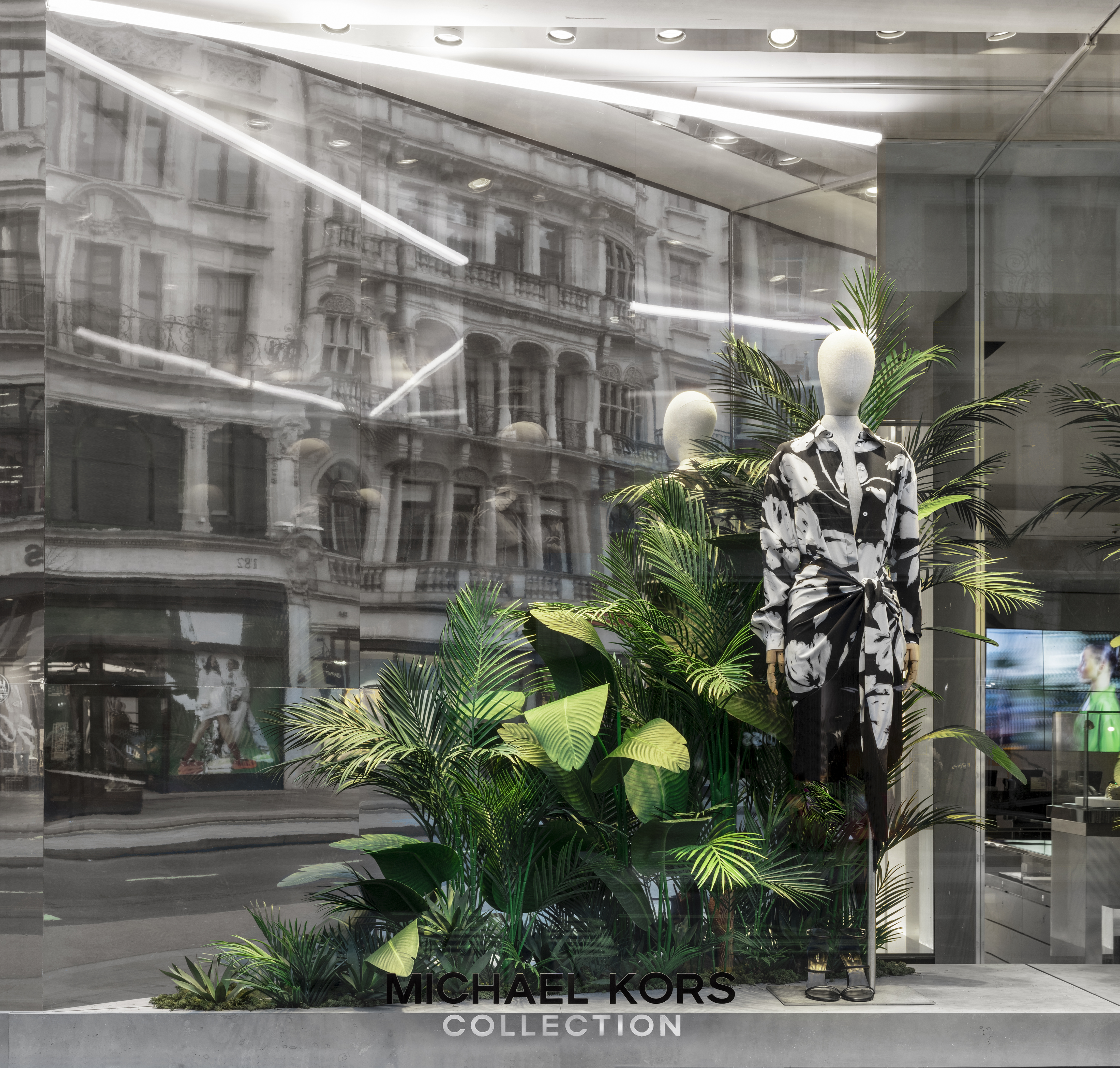 WINDOWS ADORNED WITH TROPICAL PALM FRONDS, CONCRETE MATERIALS AND MIRRORED SURFACES HIGHLIGHT THE MICHAEL KORS COLLECTION SPRING 2023 PEICES.