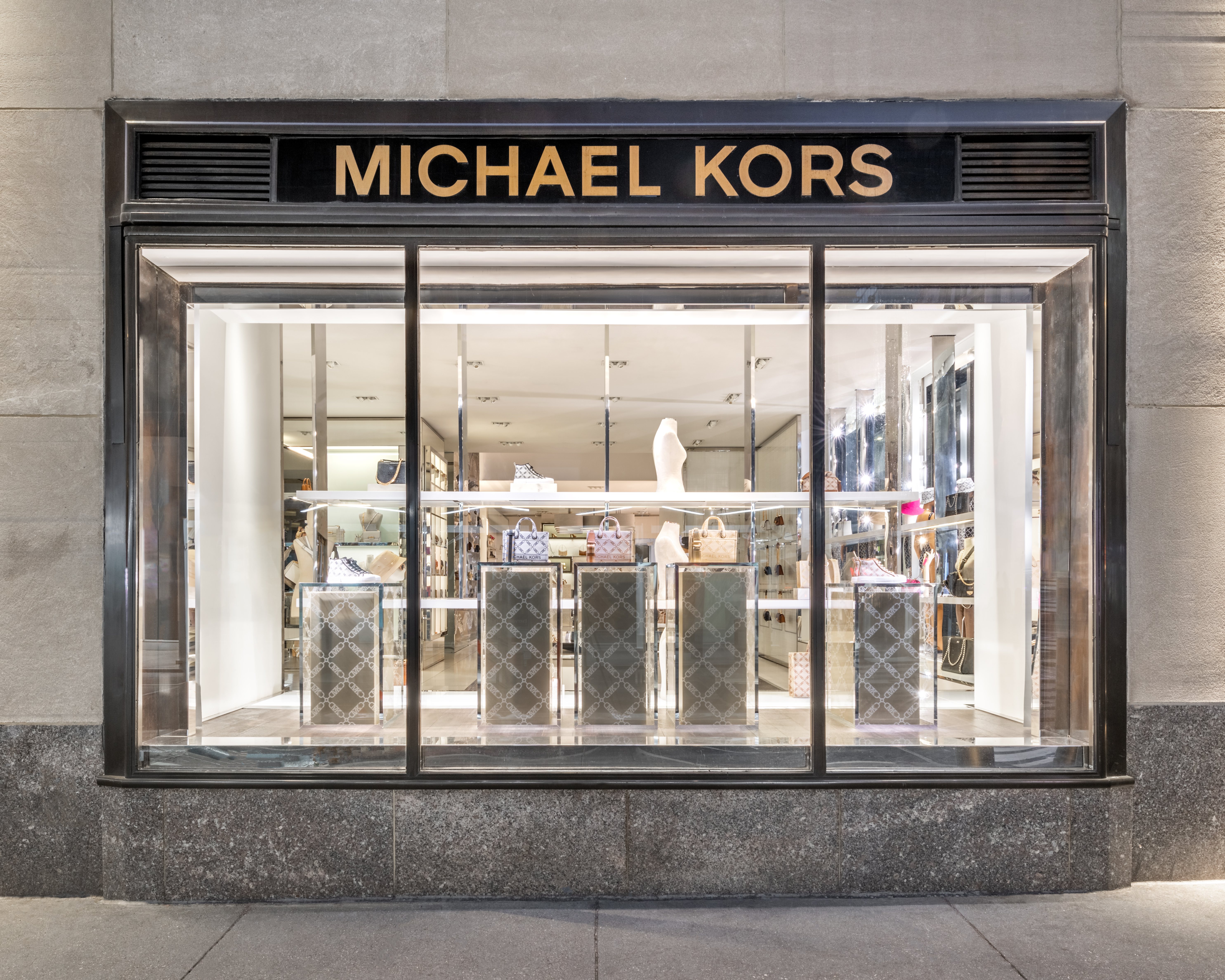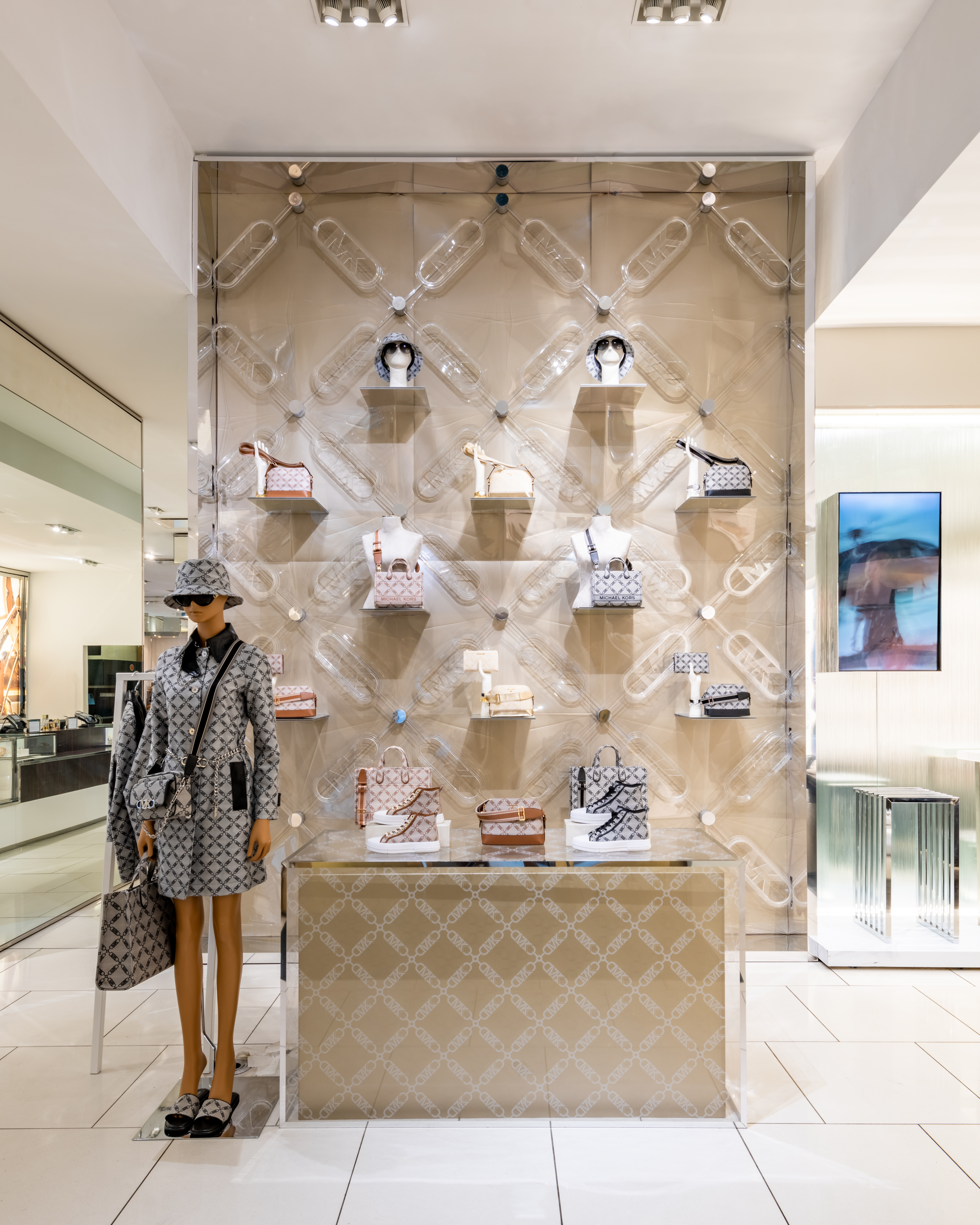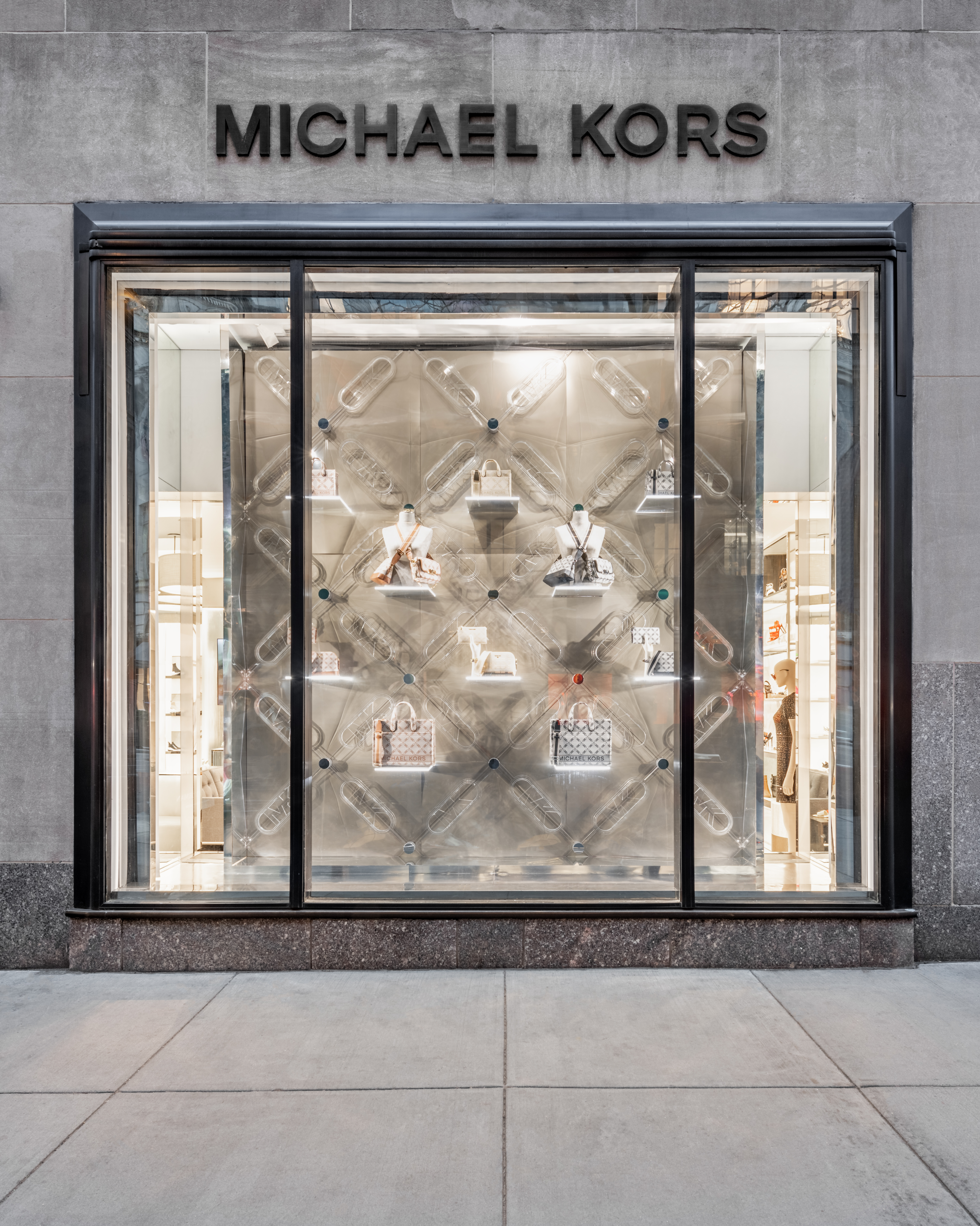 DRAWING INSPIRATION FROM QUILTED MATERIALS IN ARCHITECTURE AND THE SEASONS' MICHAEL KORS EMPIRE JAQUARD PRINT, ACRYLIC ELEMENTS AND LIGHT RODS WERE USED TO HIGHLIGHT THE COLLECTION.