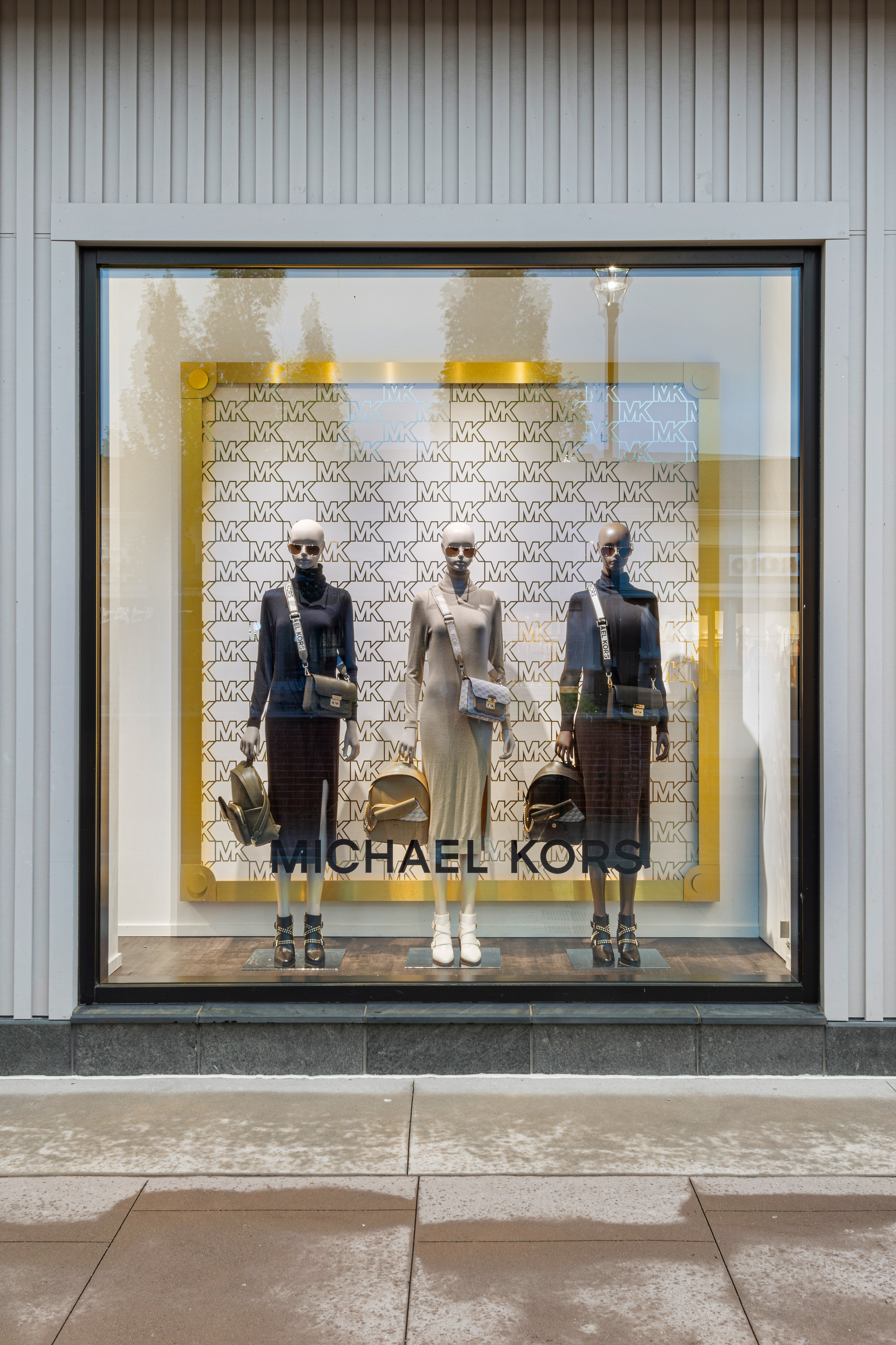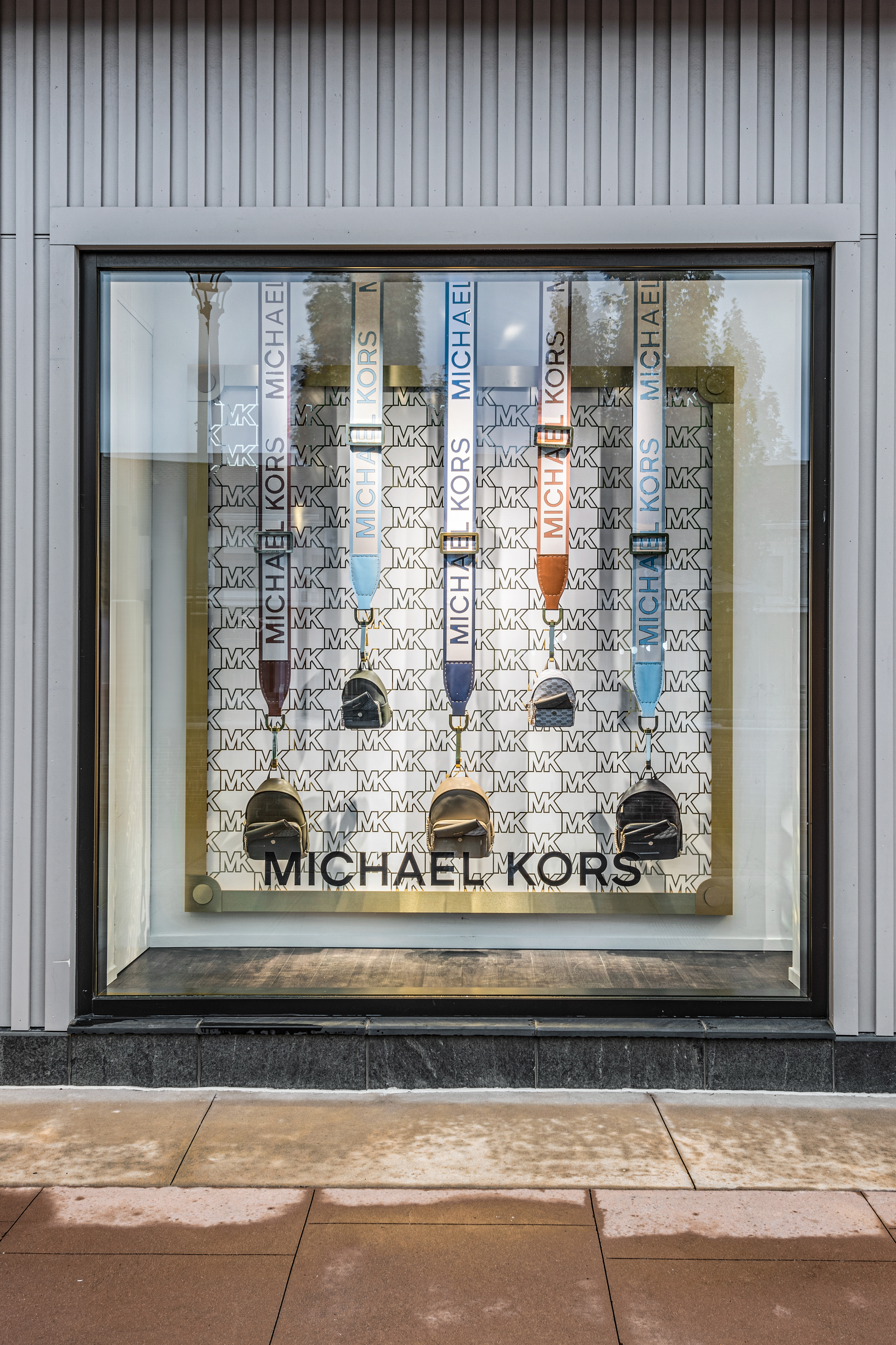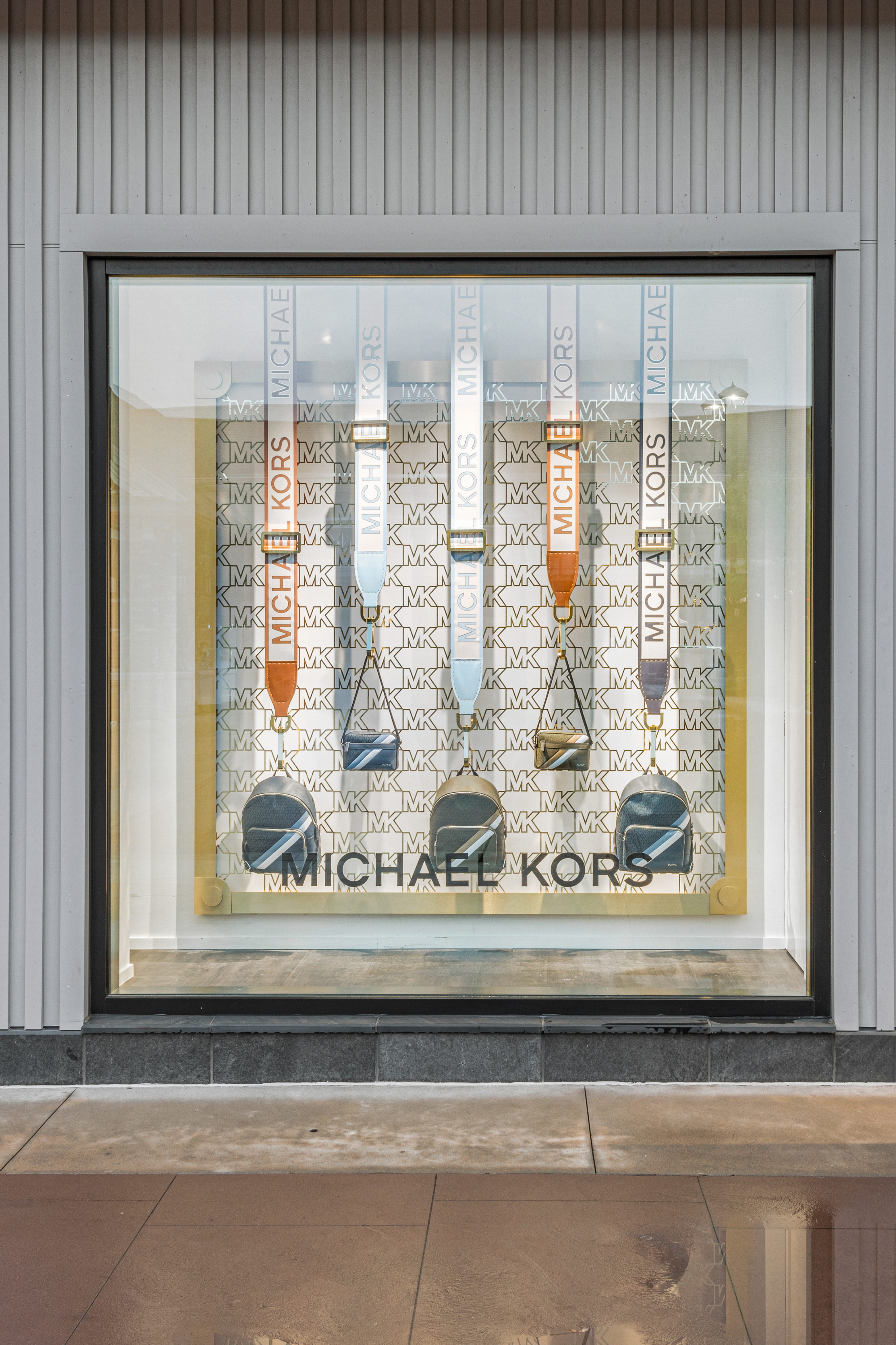 CAPITALIZING ON BRAND HERITAGE, OUTLET FALL 2023 WINDOWS EXPLORED THE EXPANSION OF HARDWARE AND LOGO TO CREATE PLAYFUL MEANS TO DISPLAY PRODUCT. OVERSIZED DIMENSIONAL AND VINYL STRAPS SCATTERED THROUGHOUT WINDOWS WERE COMPLIMENTED BY VANILLA AND GOLD DETAILS.