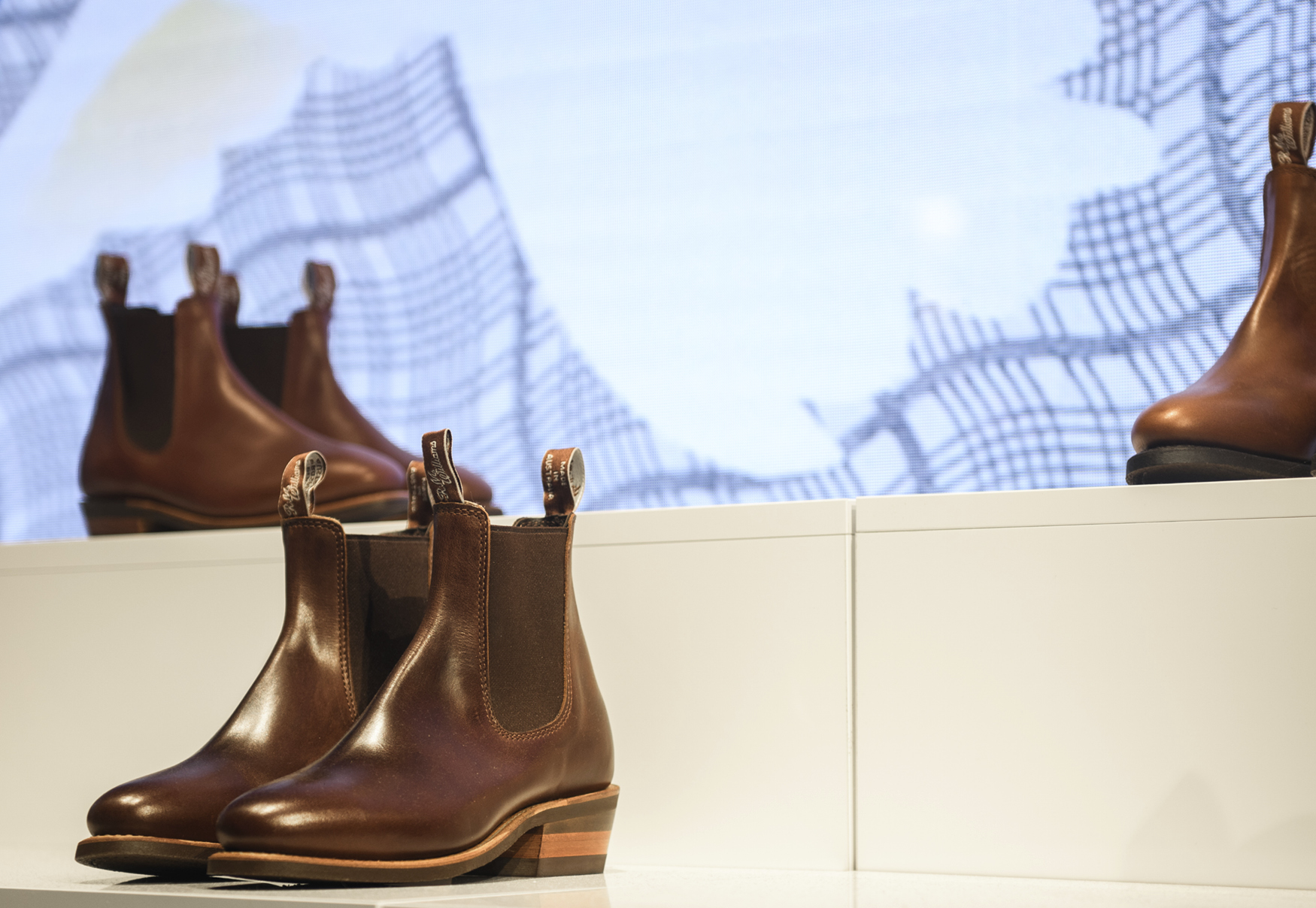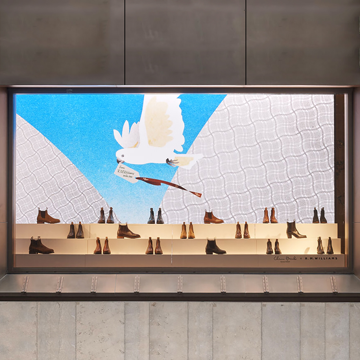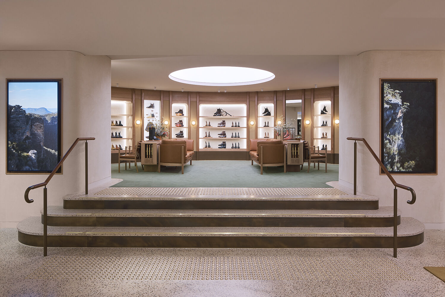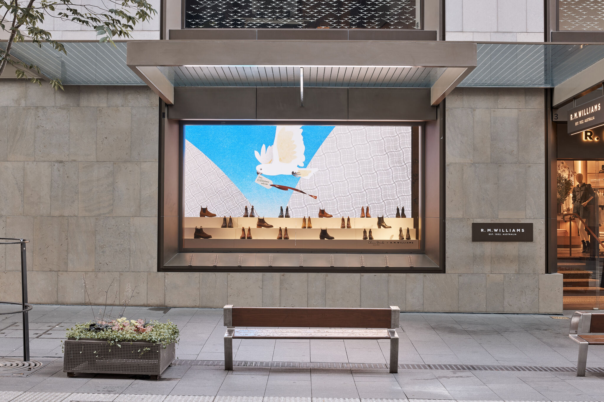 We partnered with the Australian illustrator Clemens Habicht to bring the space to life, presenting a window installation filled with storytelling, with bespoke steps to hero the products under the captivating sky scene against the Opera House sails. Eye-catching frames and refined fixtures continue the journey inside the store. The boot education wall uncovers the craftsmanship behind each part of their iconic shoes, revealing the brand's local artistry".