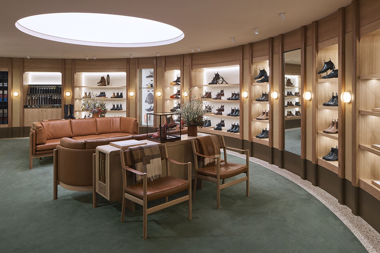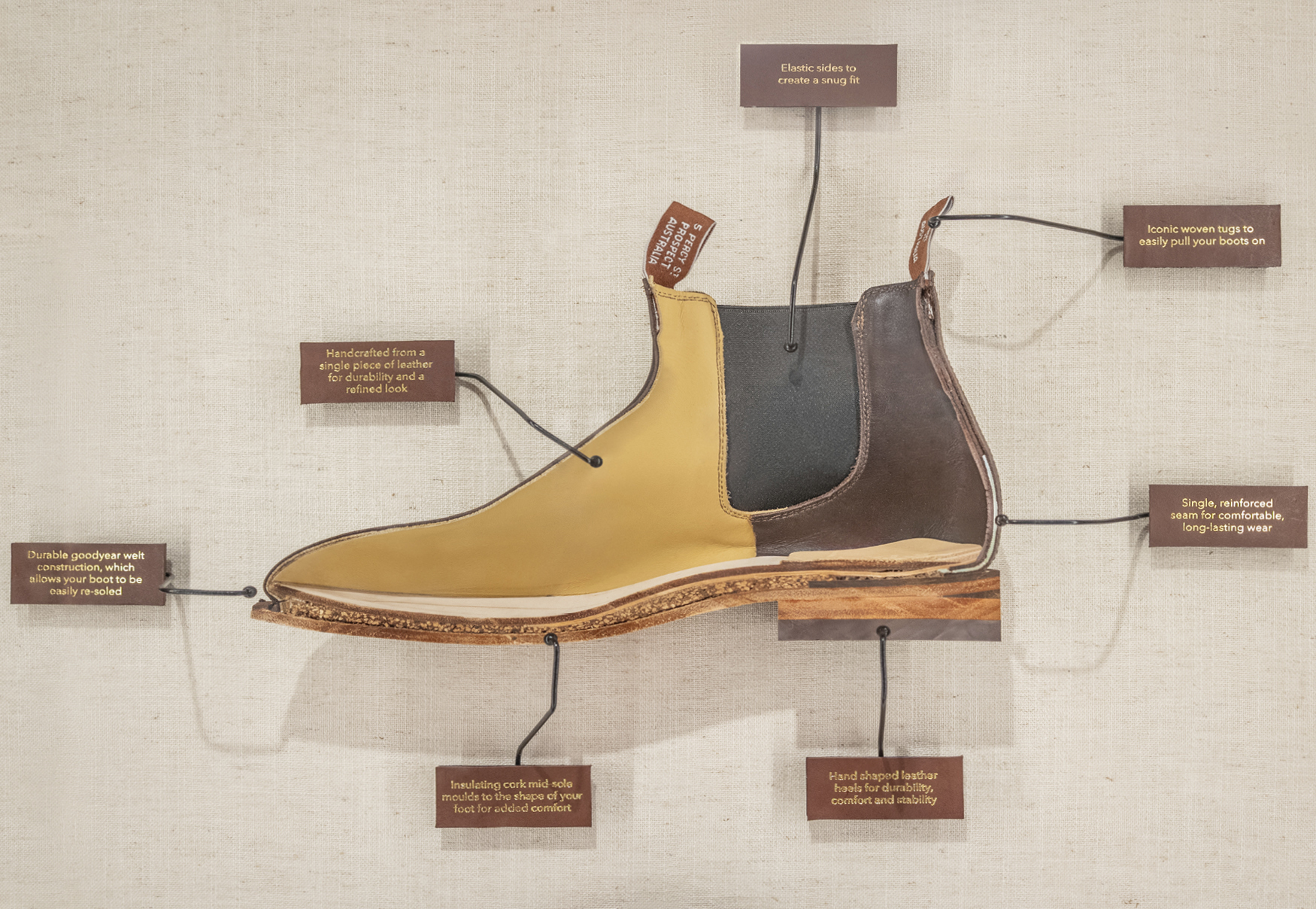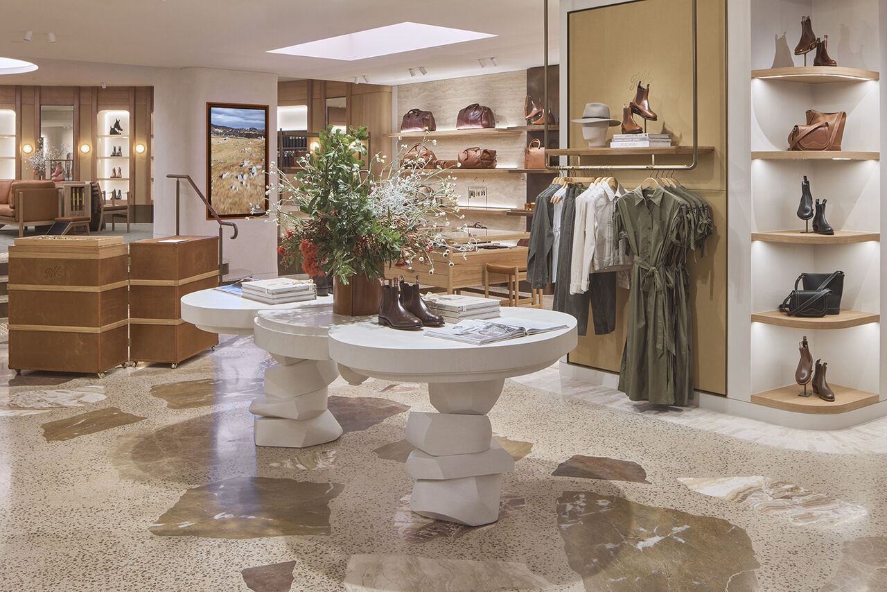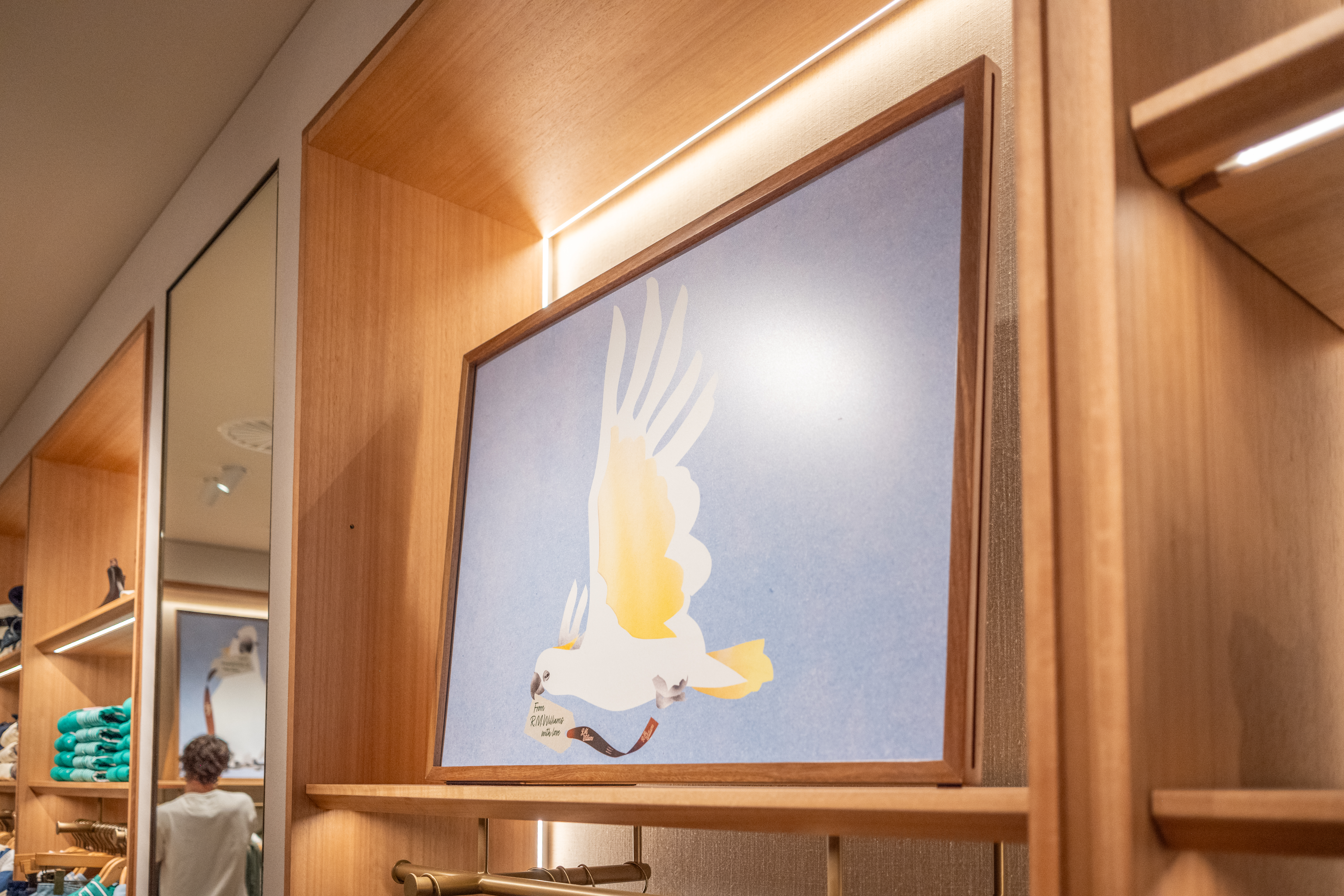 We partnered with the Australian illustrator Clemens Habicht to bring the space to life, presenting a window installation filled with storytelling, with bespoke steps to hero the products under the captivating sky scene against the Opera House sails. Eye-catching frames and refined fixtures continue the journey inside the store. The boot education wall uncovers the craftsmanship behind each part of their iconic shoes, revealing the brand's local artistry".
