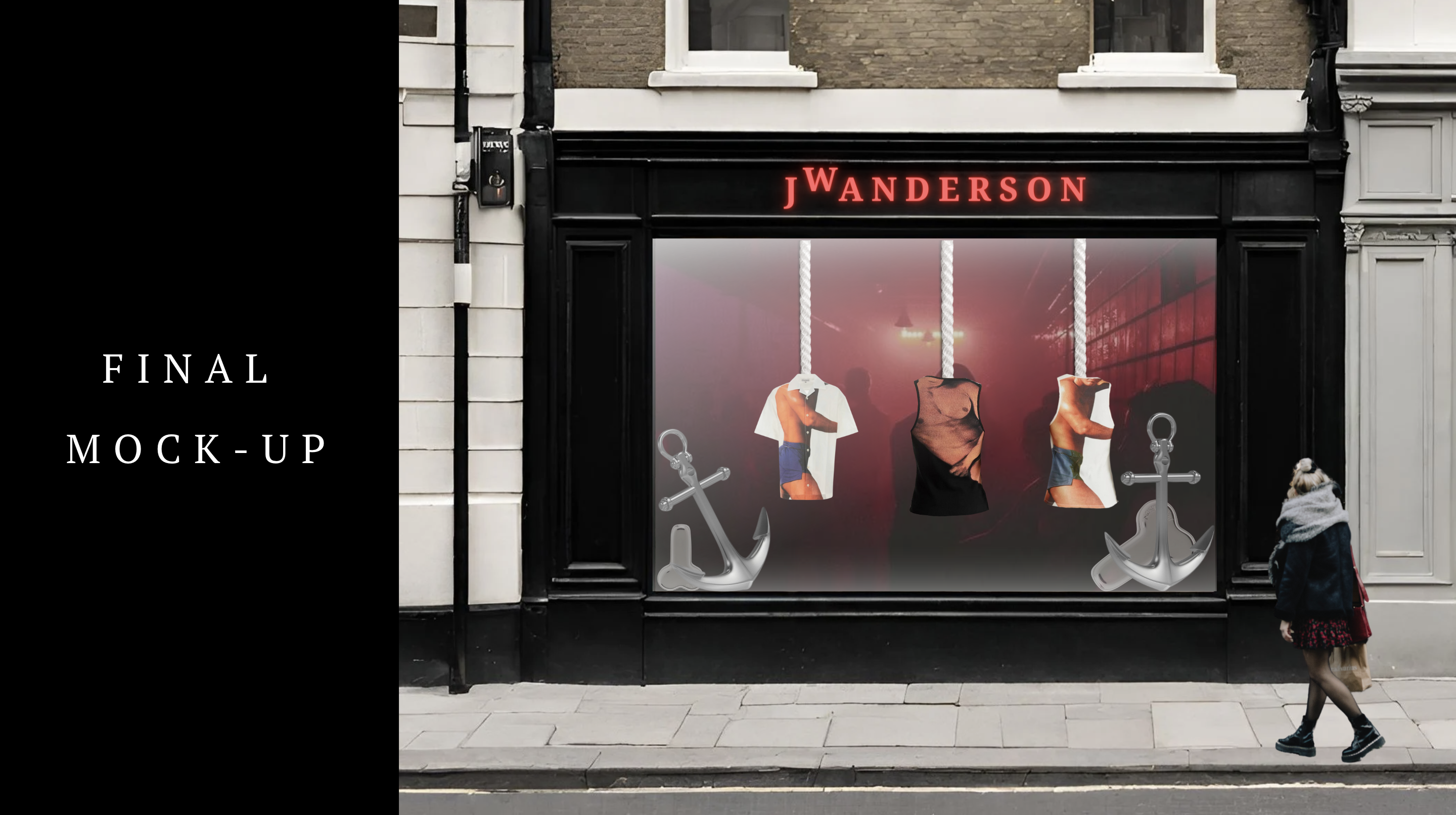 This window display is a realistic setting, promotional display at their London store that emphasizes themes of the brand such as nightlife / “rave” culture, aesthetics of the Soho, London area and exploration of sexuality and the human physique.