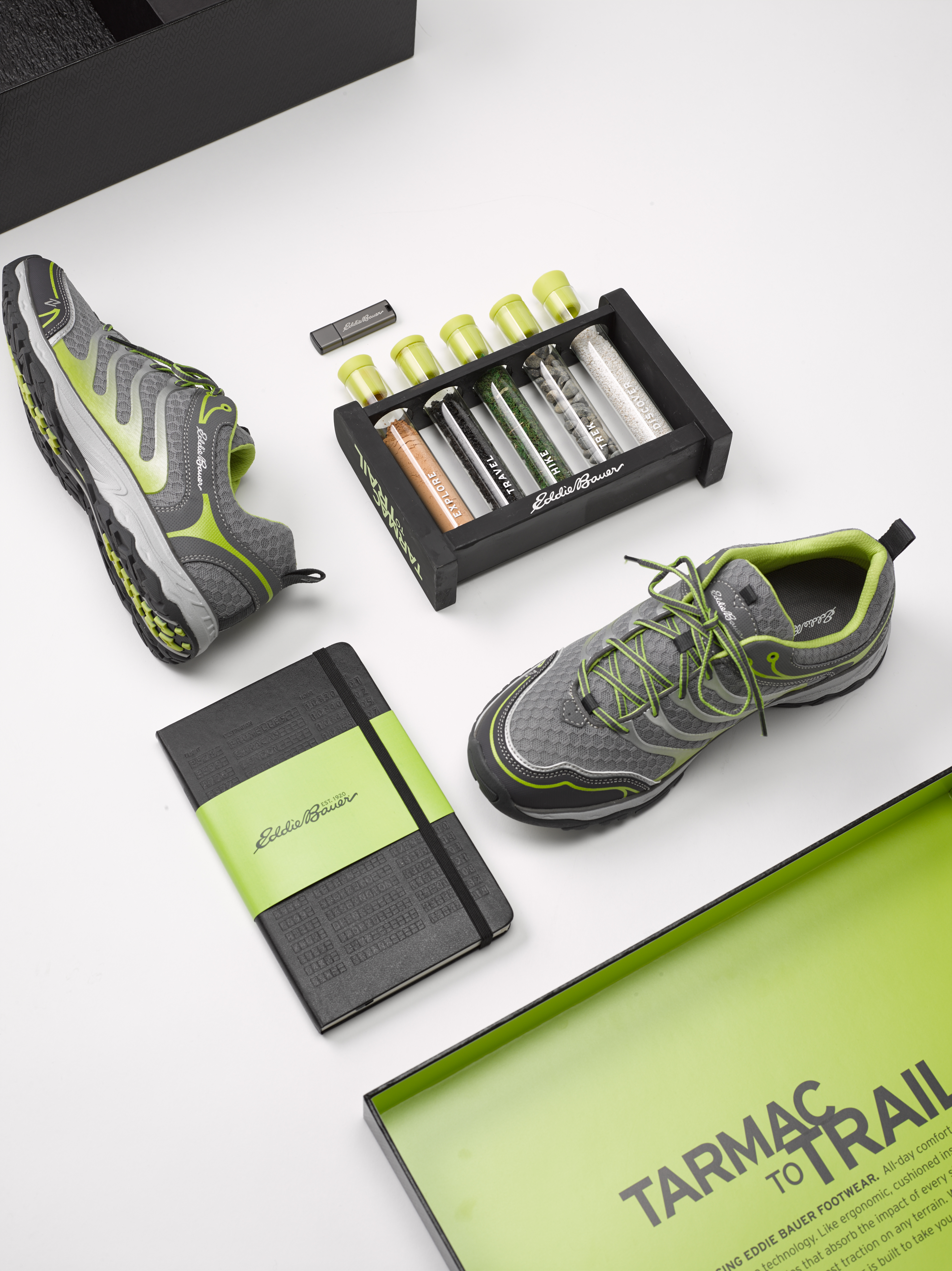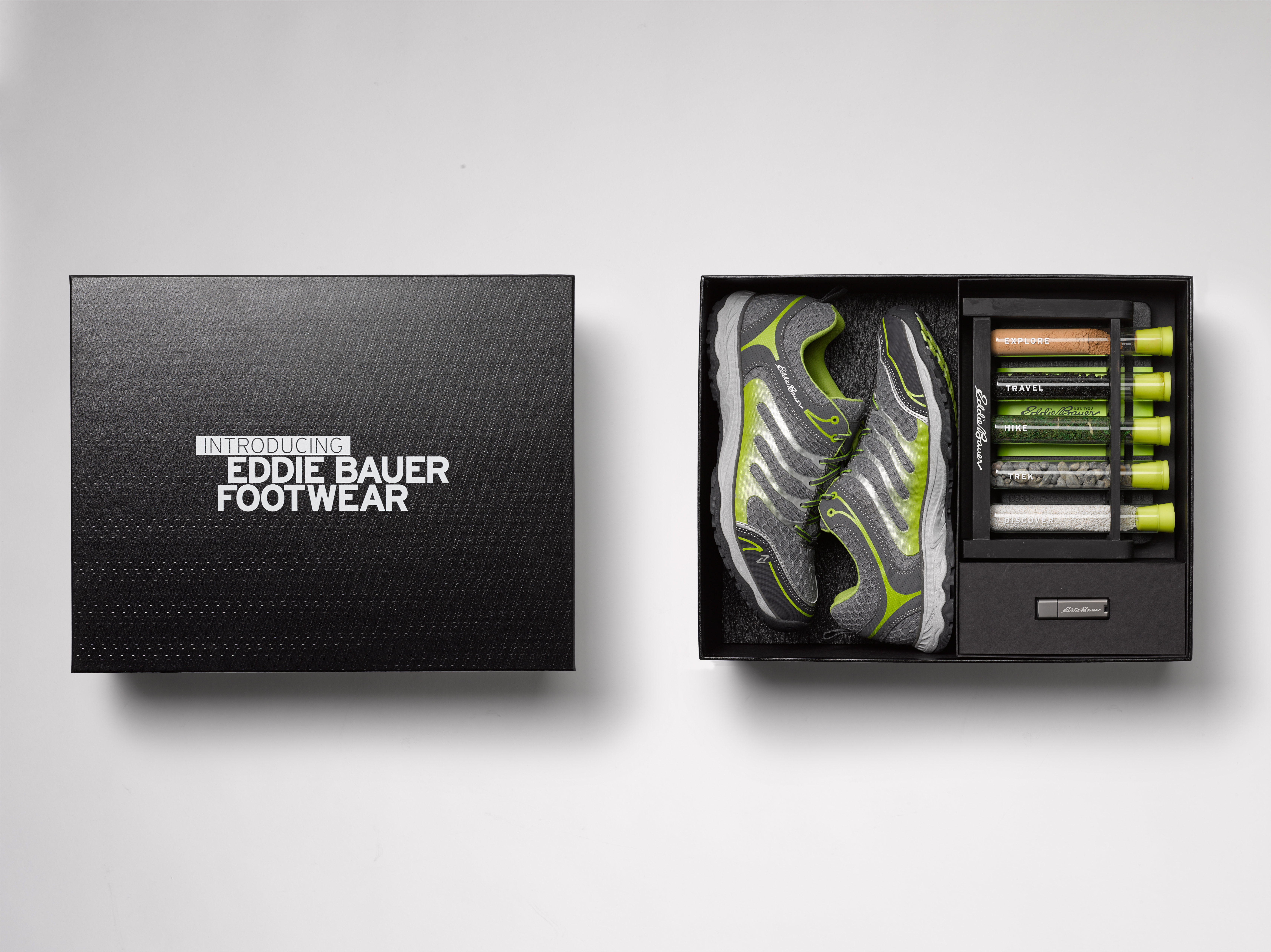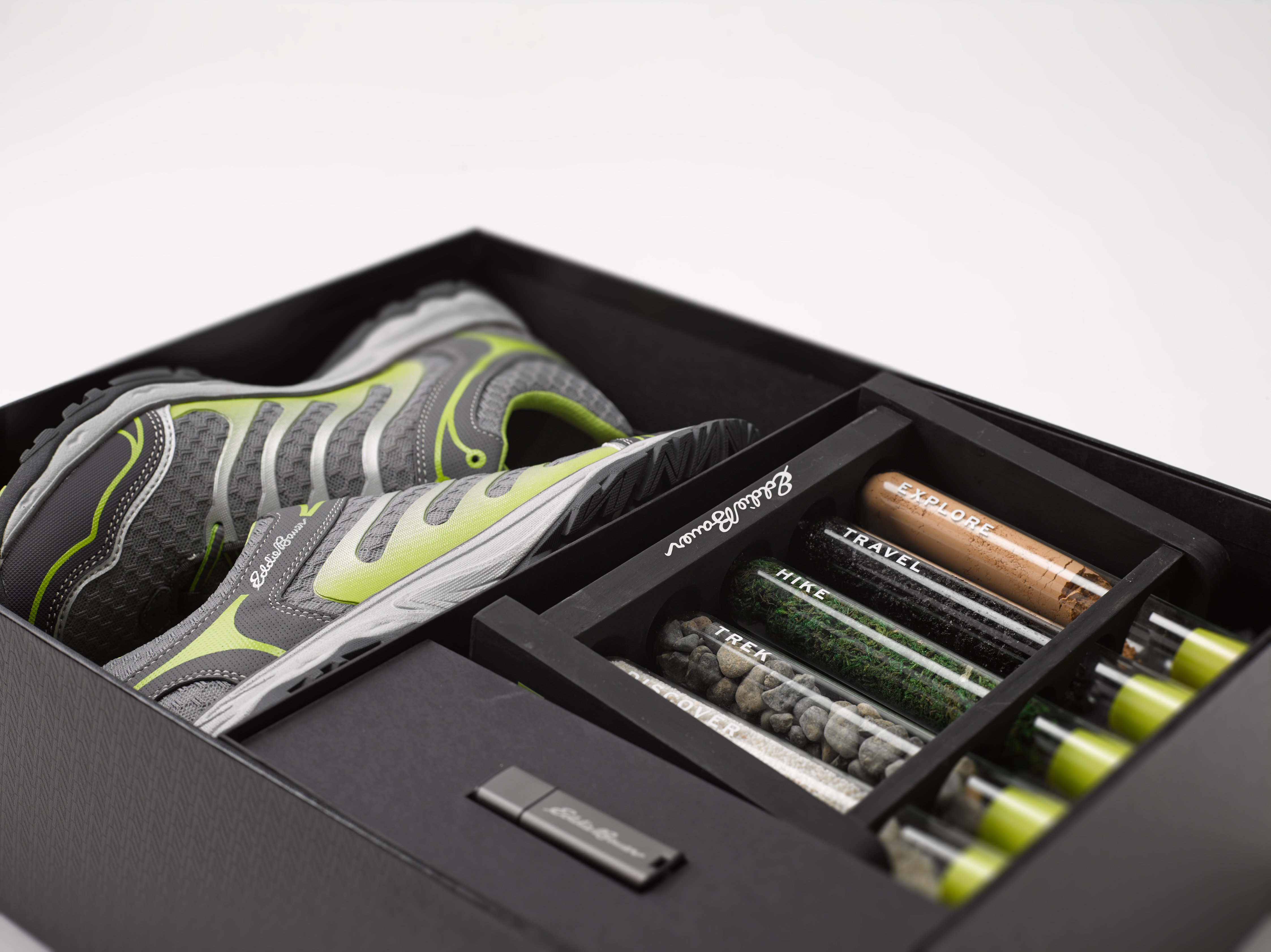 Eddie Bauer partnered with Innomark to create this unboxing experience that presents press kit materials for a new footwear launch. This custom rigid box solution includes individual compartments for shoes, vials, a USB drive, and printed materials. A combination of gloss and matte black printing provided a textured tread effect, while digitally cut vinyl letters enhanced branding and clearly labeled kit components.