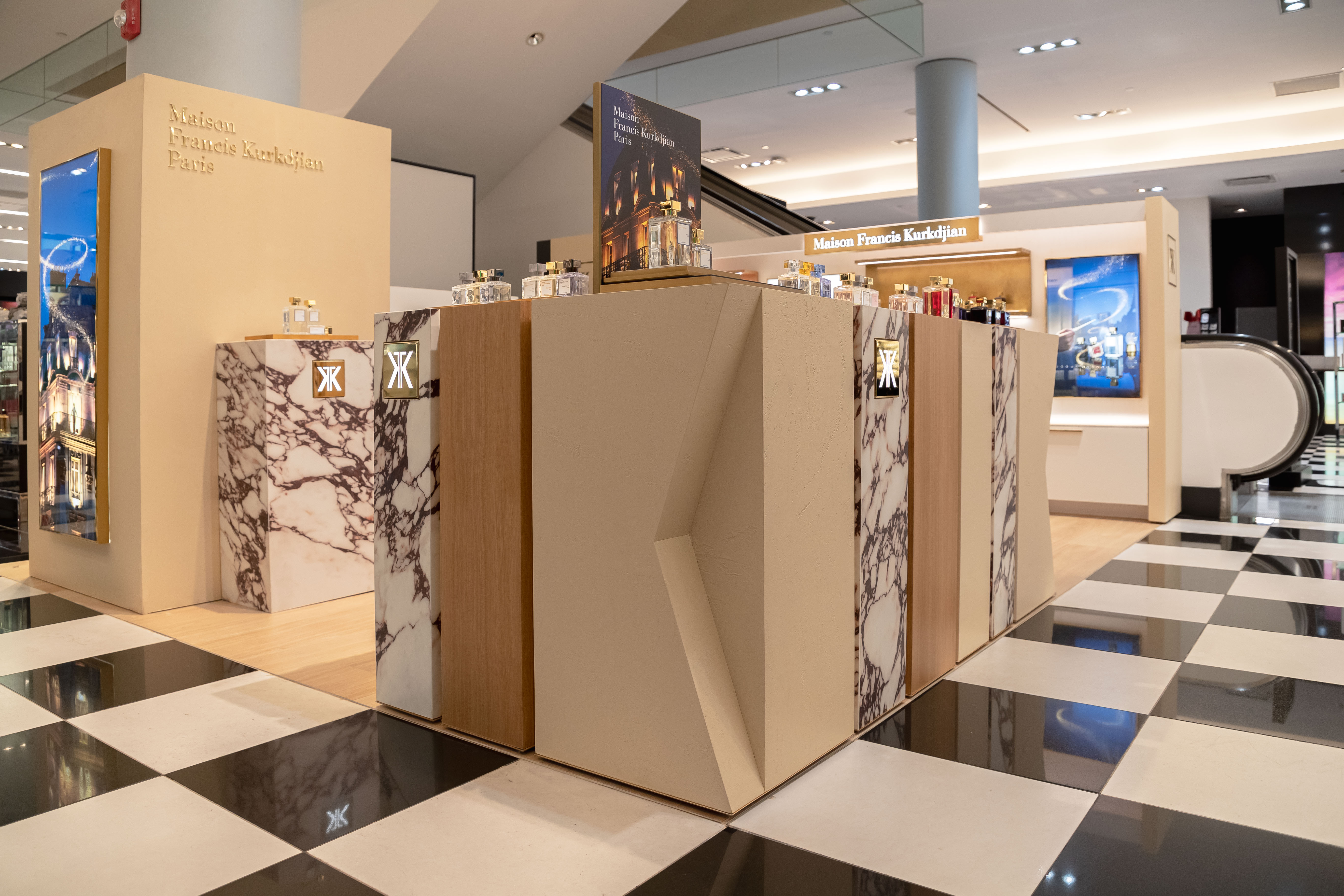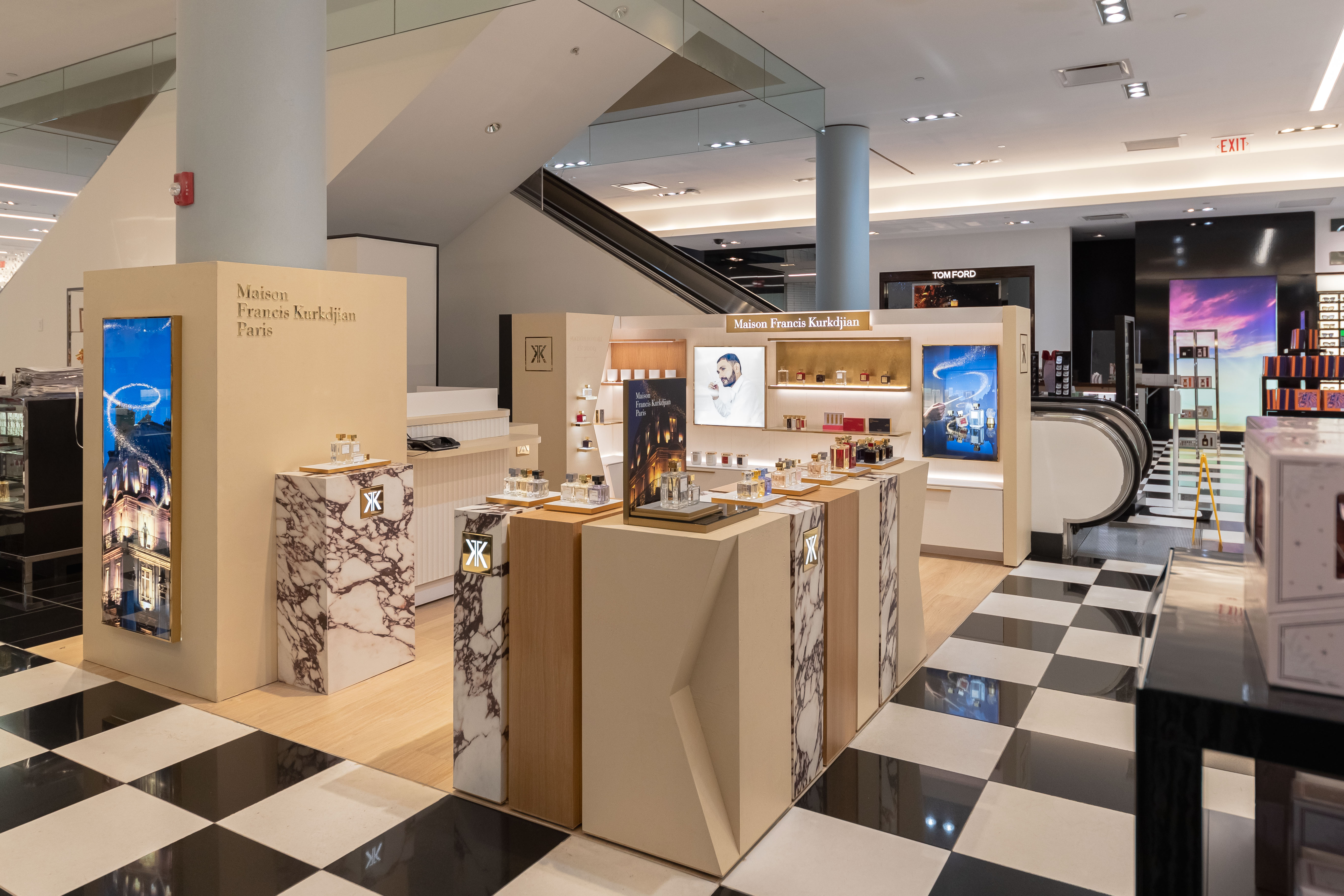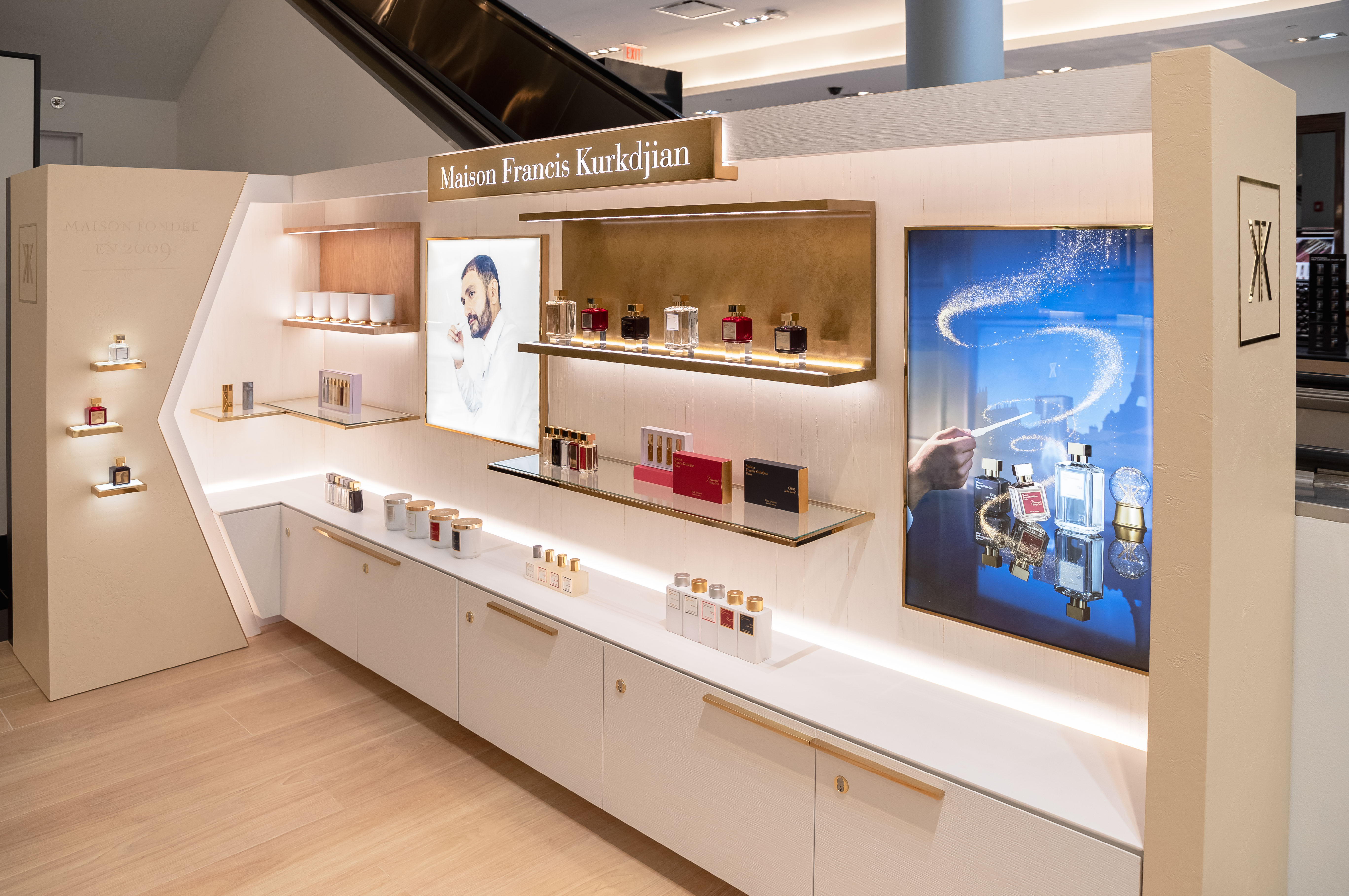 This Maison Francis Kurkdjian permanent shop-in-shop display at Bloomingdale’s in Willowbrook Mall New Jersey captivates customers with its stunning stone and gold displays. Challenging stonework required expert craftsmanship and precision to execute the intricate details. Piddi Design fabricated and installed custom built-in cabinetry, display units and stand-alone fixtures.