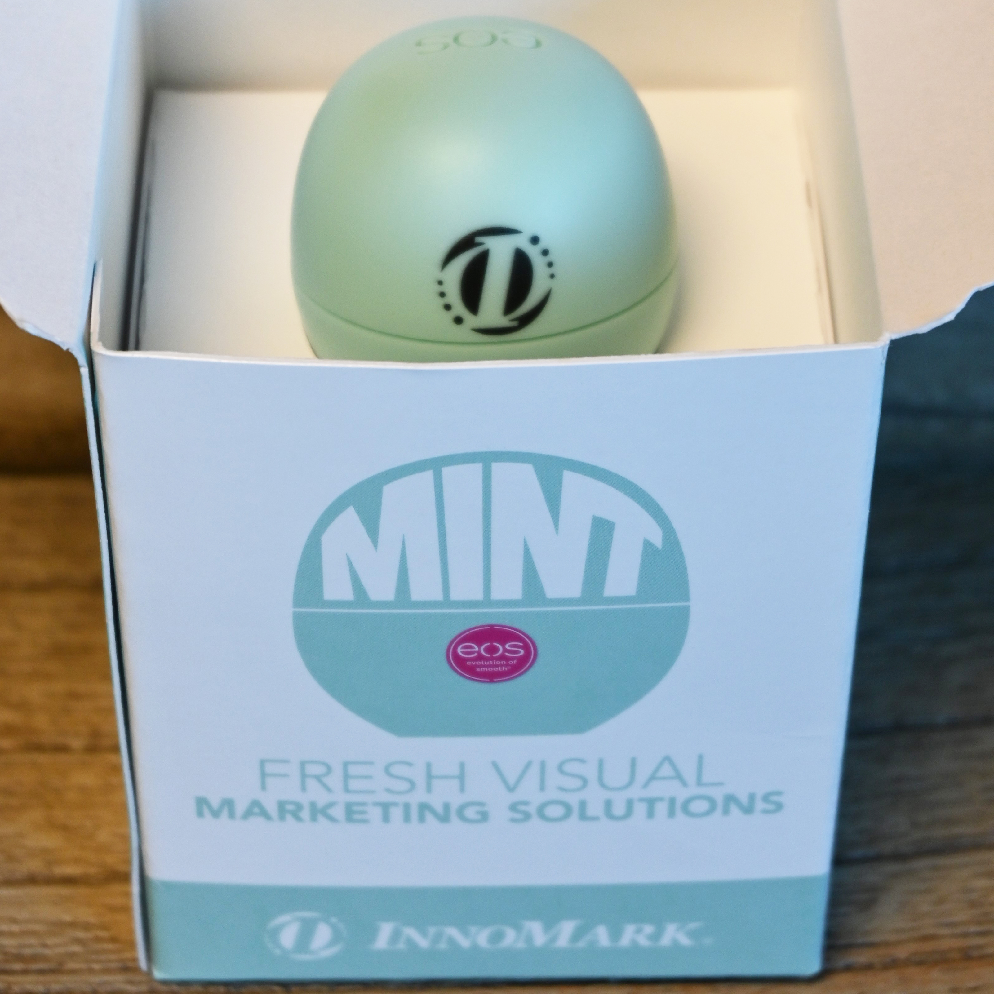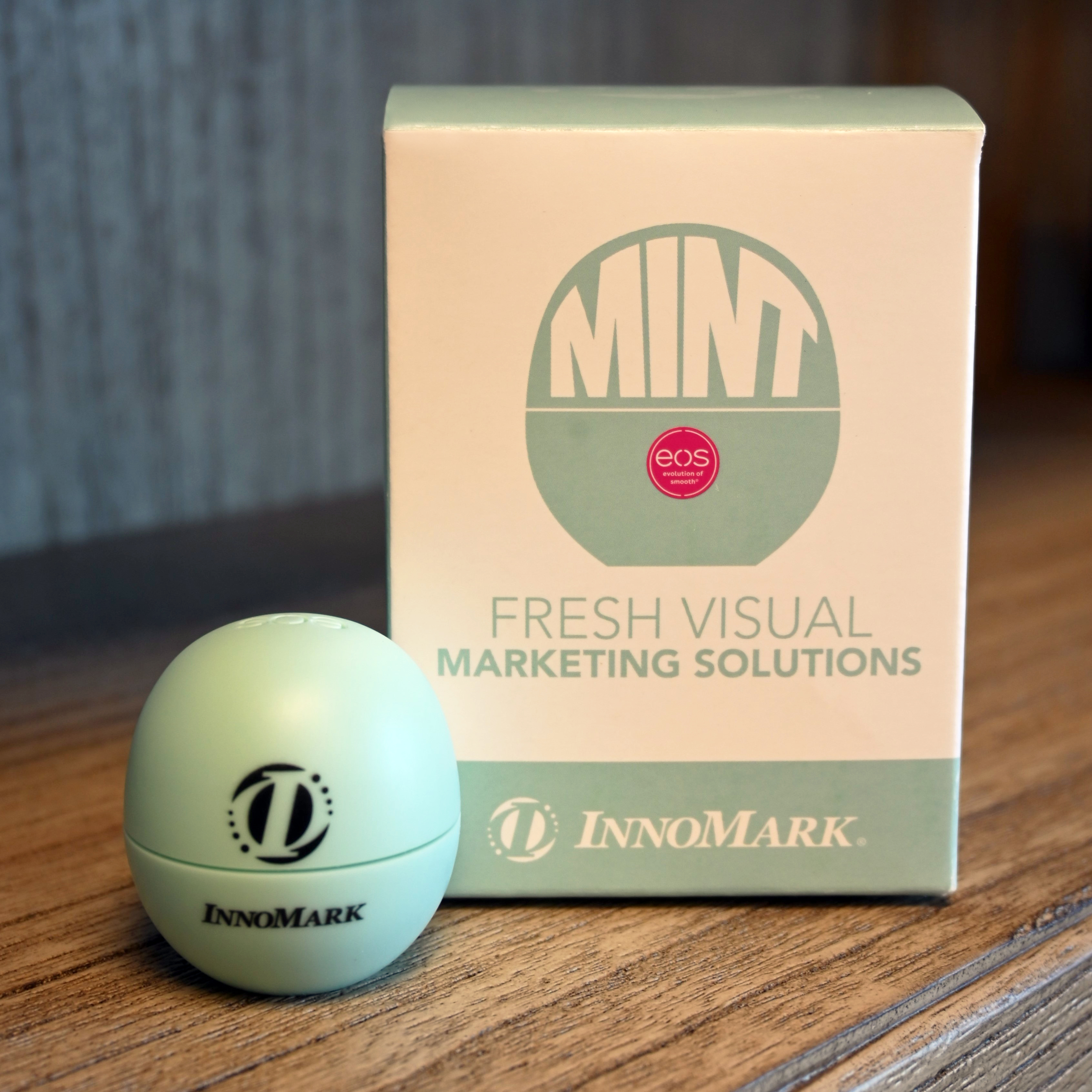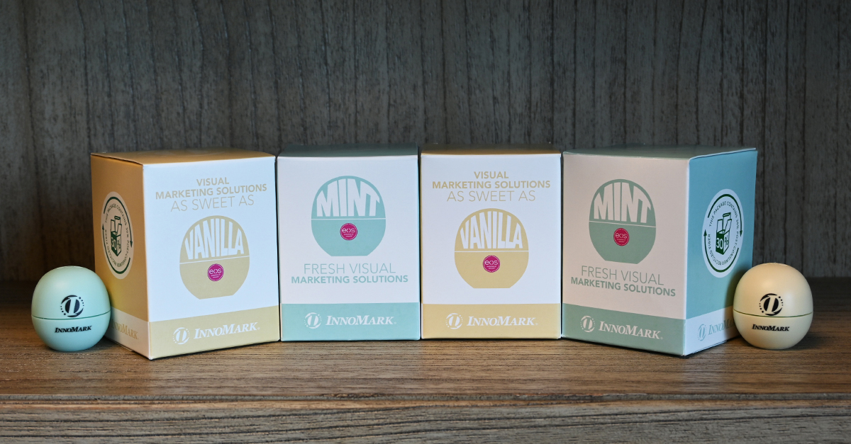 Innomark wanted to provide branded swag at the 2024 SHOP! MarketPlace show, while showcasing capabilities and current market trends. Among other items, the booth was stocked with EOS lip balm in custom folding cartons. We used our SBS hybrid material and statistics about sustainable purchasing on the inside flap, along with an icon, to help promote our sustainability efforts. Our team customized two flavors— mint and vanilla— with the Innomark logo and differentiated their packaging with coordinating colors and slogans. These were a hit with booth visitors!