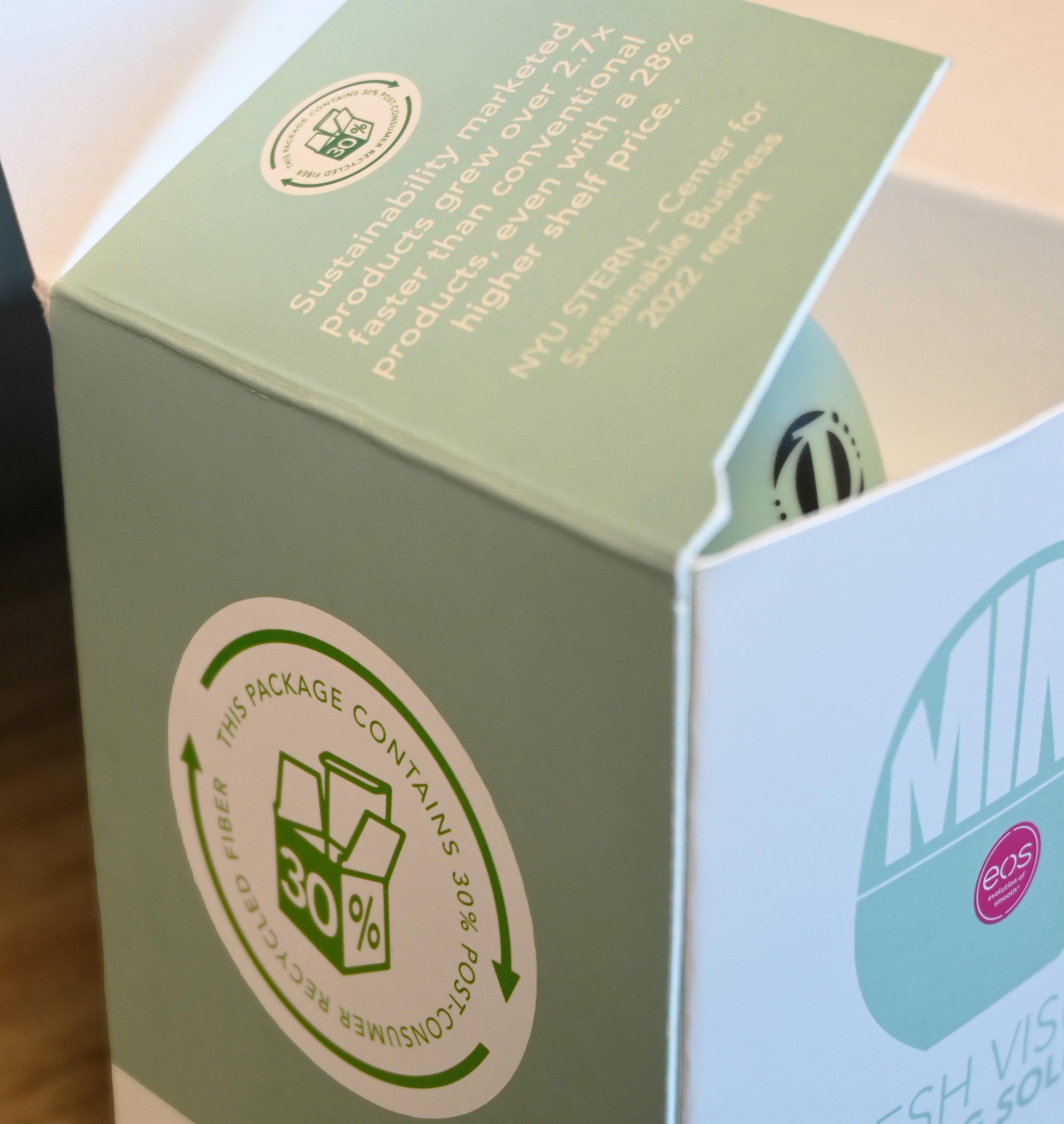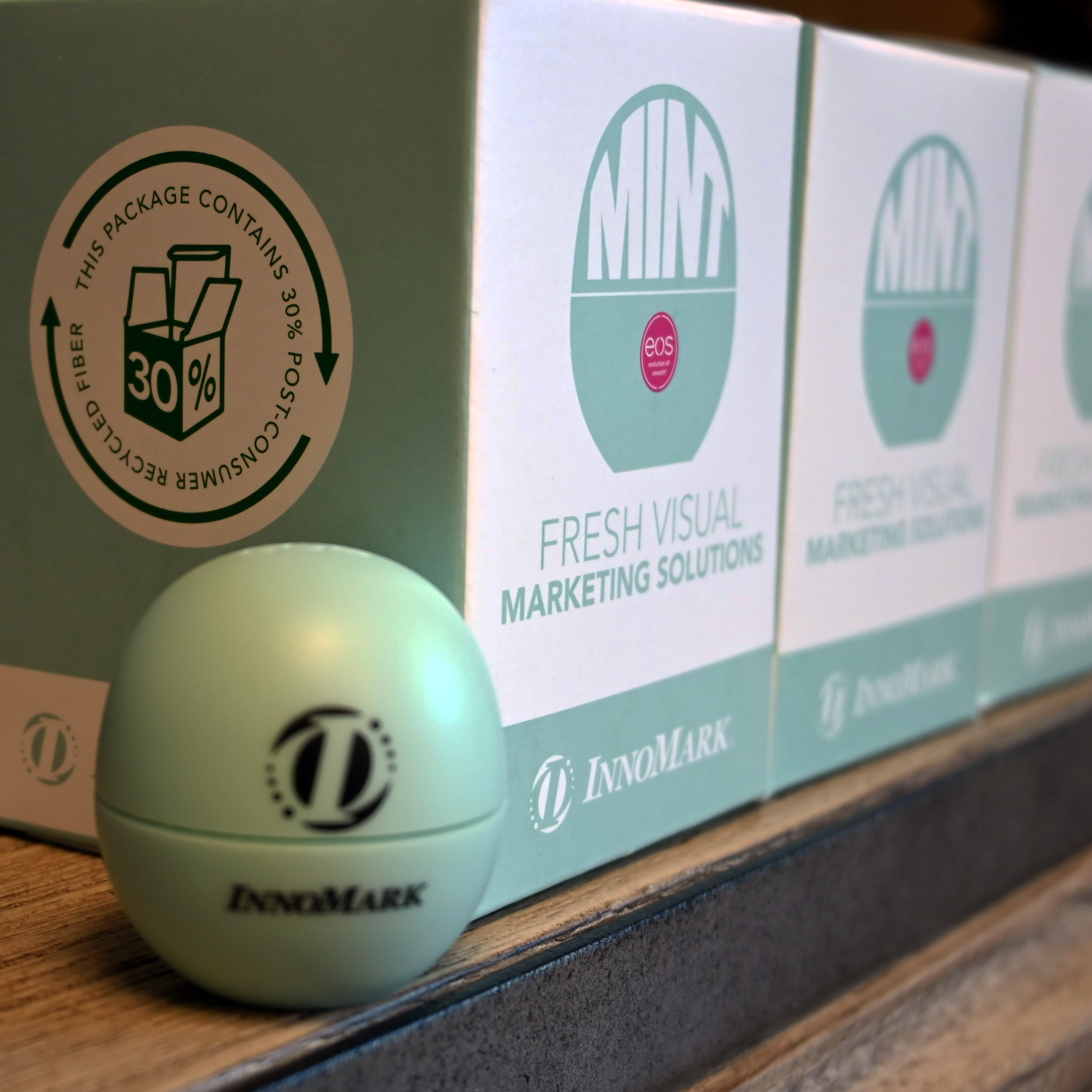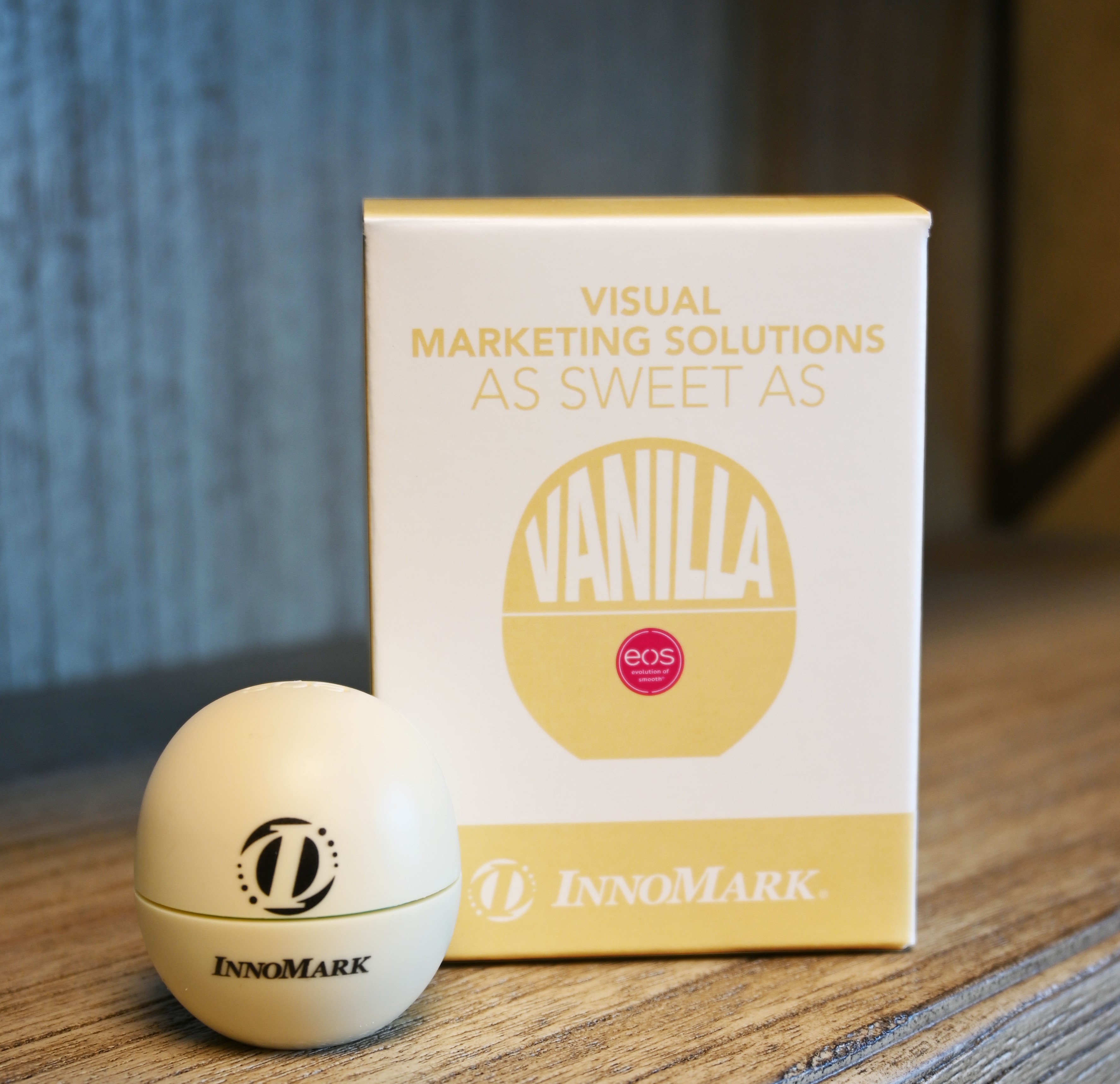 Innomark wanted to provide branded swag at the 2024 SHOP! MarketPlace show, while showcasing capabilities and current market trends. Among other items, the booth was stocked with EOS lip balm in custom folding cartons. We used our SBS hybrid material and statistics about sustainable purchasing on the inside flap, along with an icon, to help promote our sustainability efforts. Our team customized two flavors— mint and vanilla— with the Innomark logo and differentiated their packaging with coordinating colors and slogans. These were a hit with booth visitors!