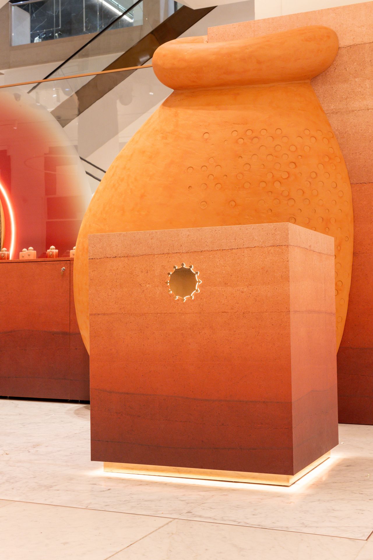 The installation features an interplay of rammed earth textures, fresh clay finish, metallic accents and crimson sand, with a radiant Sun setting in its centre – showing once again, how deep Omani heritage through contemporary design can transform retail experience and elevate High Perfumery, telling the story of four decades of excellence.