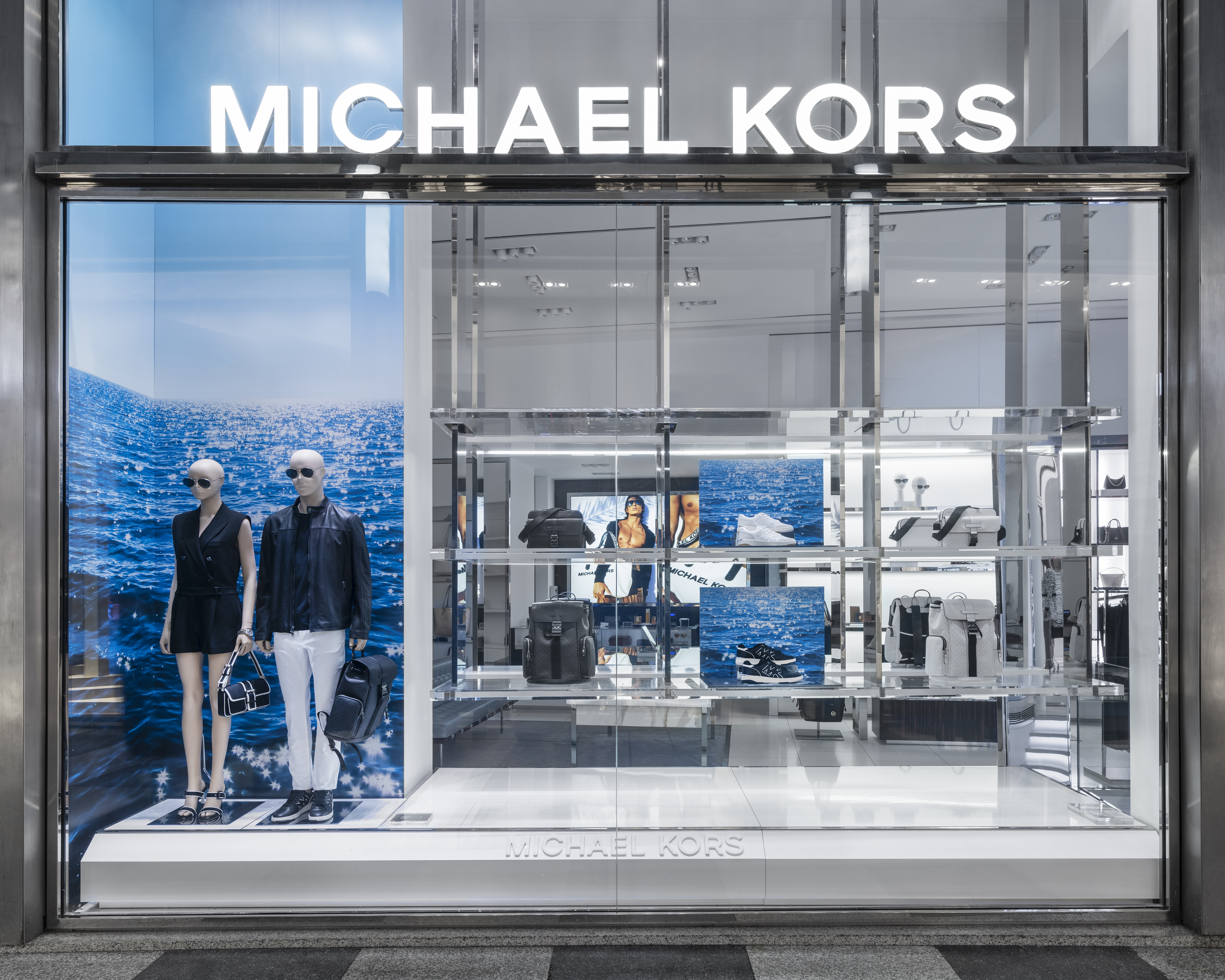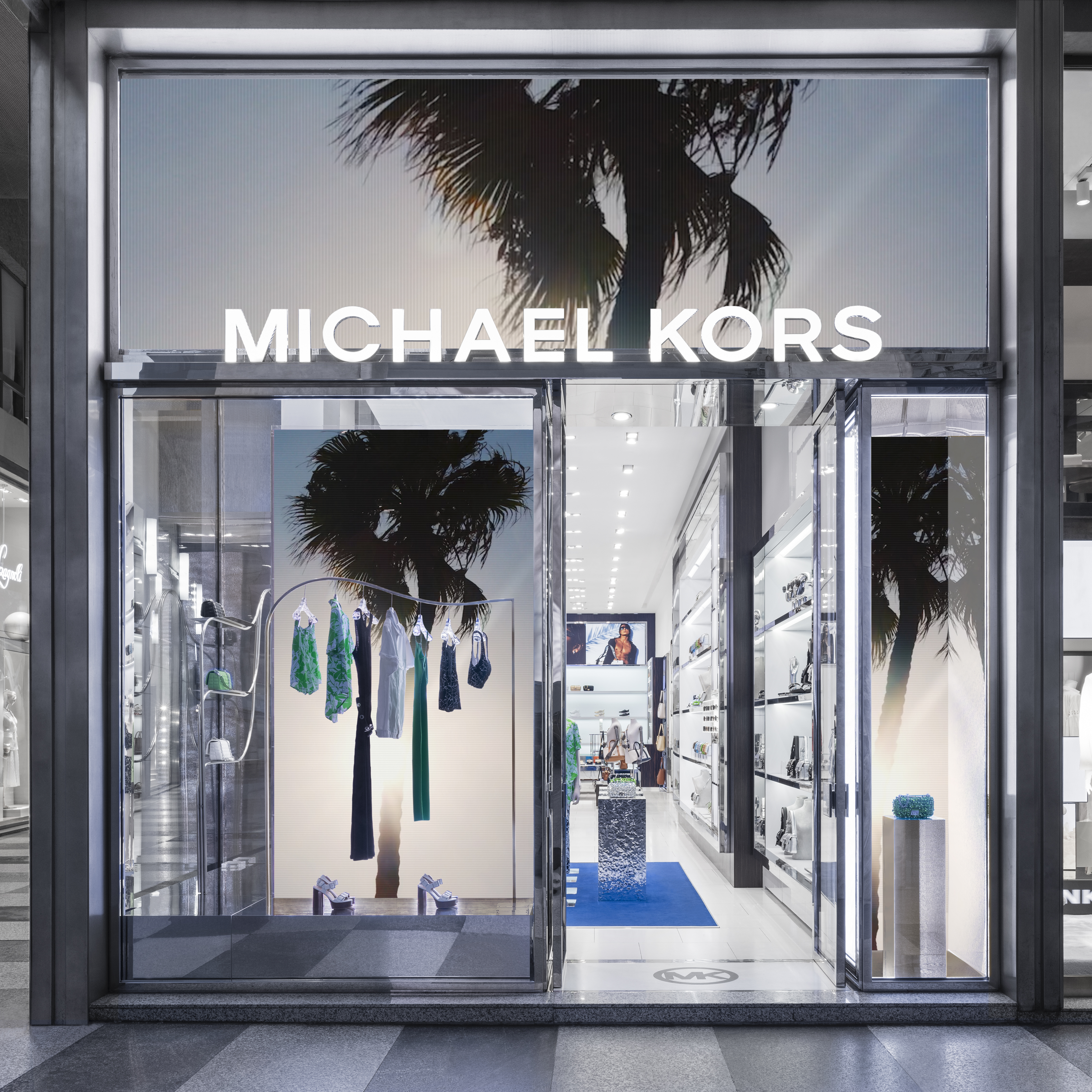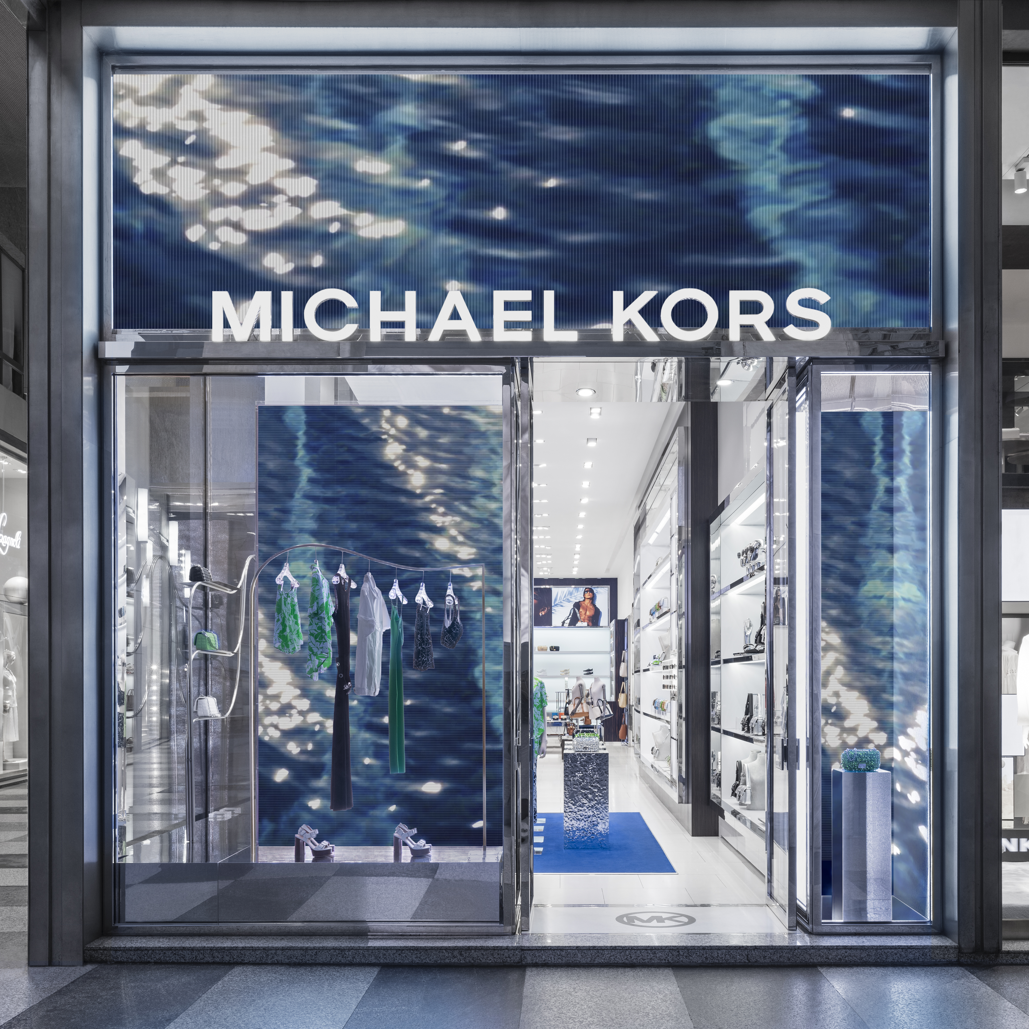 Michael Kors; Spring 2024 window animation features innovative wavy chrome rails that elegantly highlight the collection, adding a dynamic, fluid element to the display. Complementing this modern showcase is a sleek summer video that captures the essence of Southern California, with its sun-drenched beaches, gentle waves, and relaxed coastal vibe. This combination of reflective chrome and vibrant, summer-y visuals creates a chic, immersive experience that perfectly embodies the spirit of the season.
