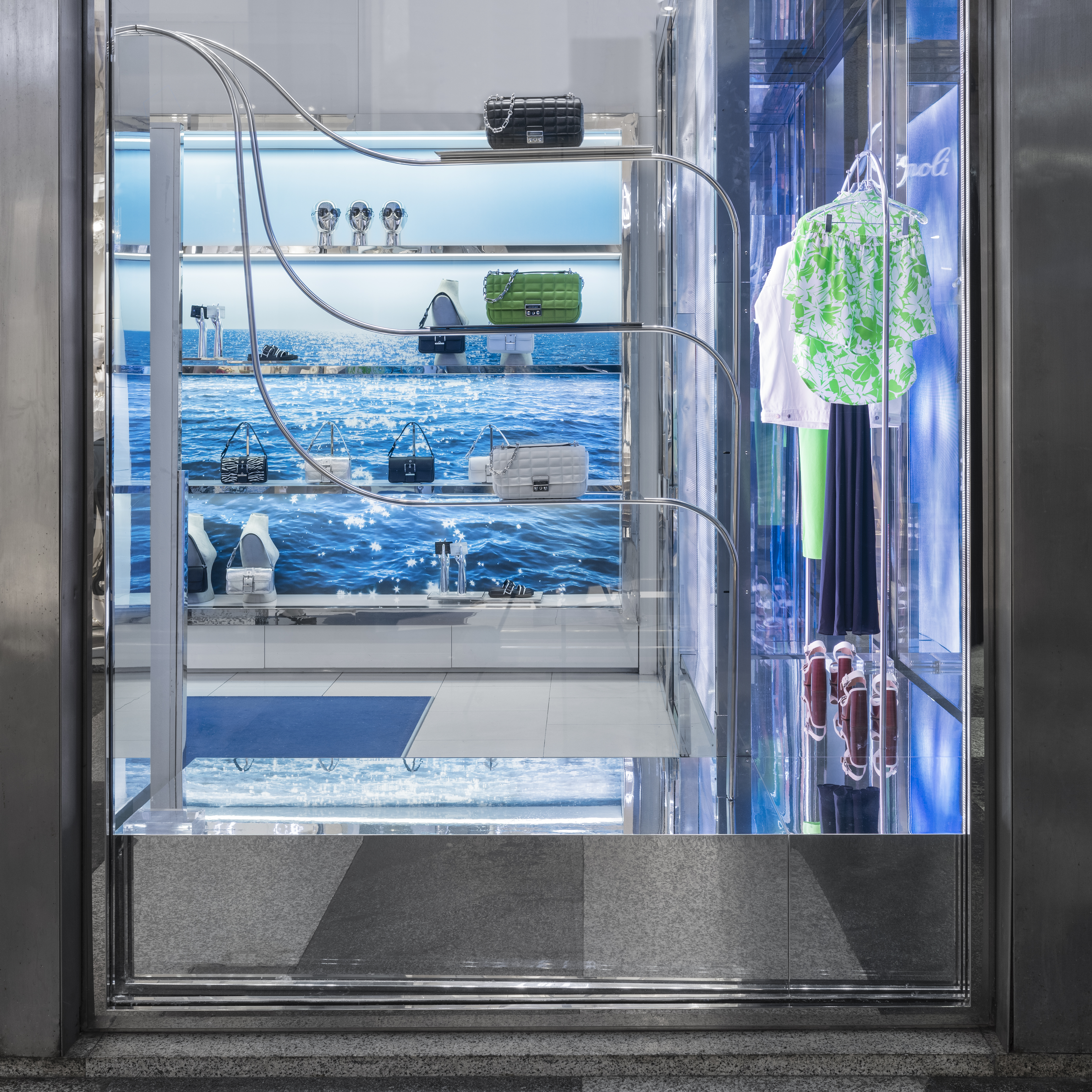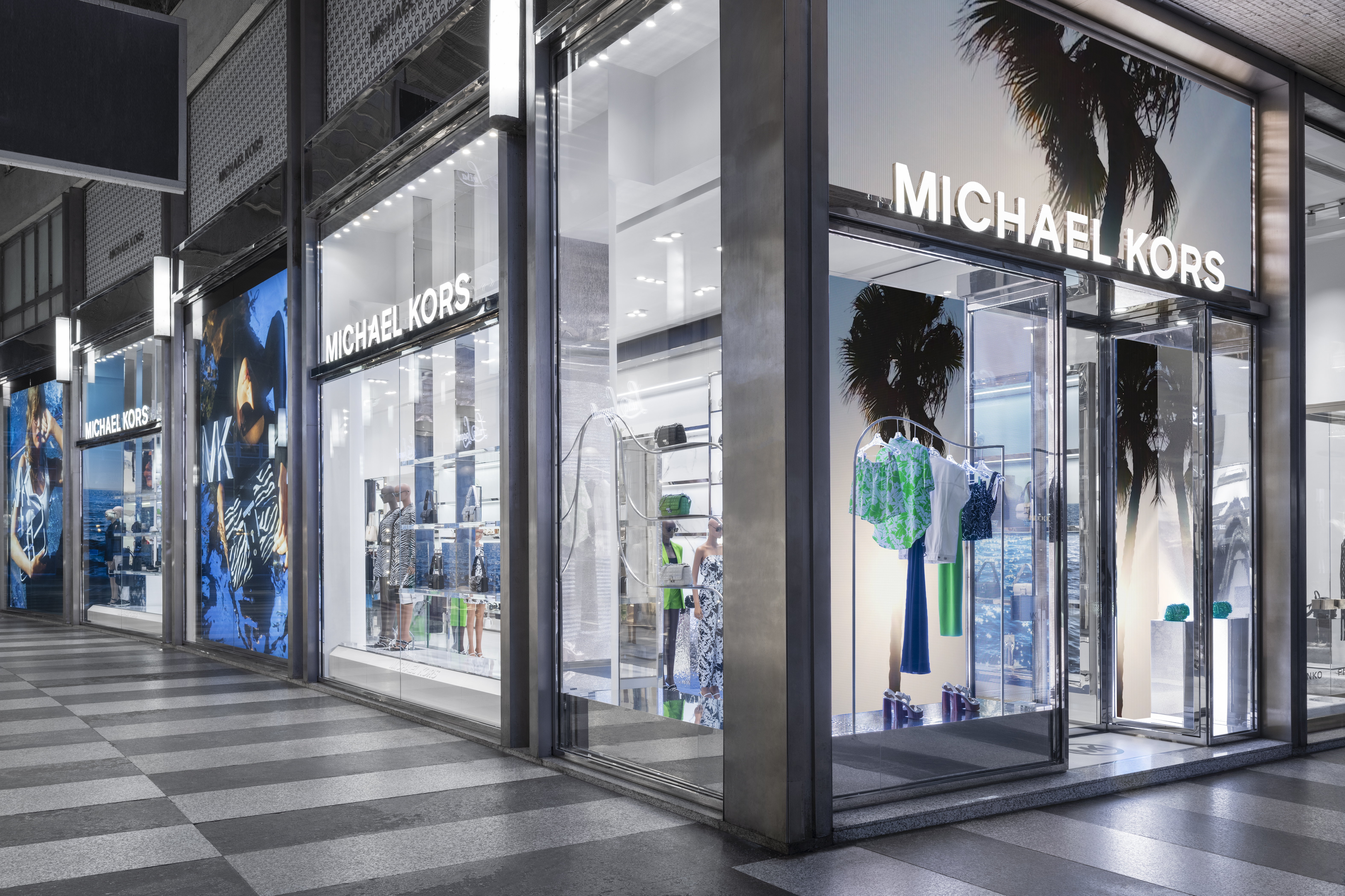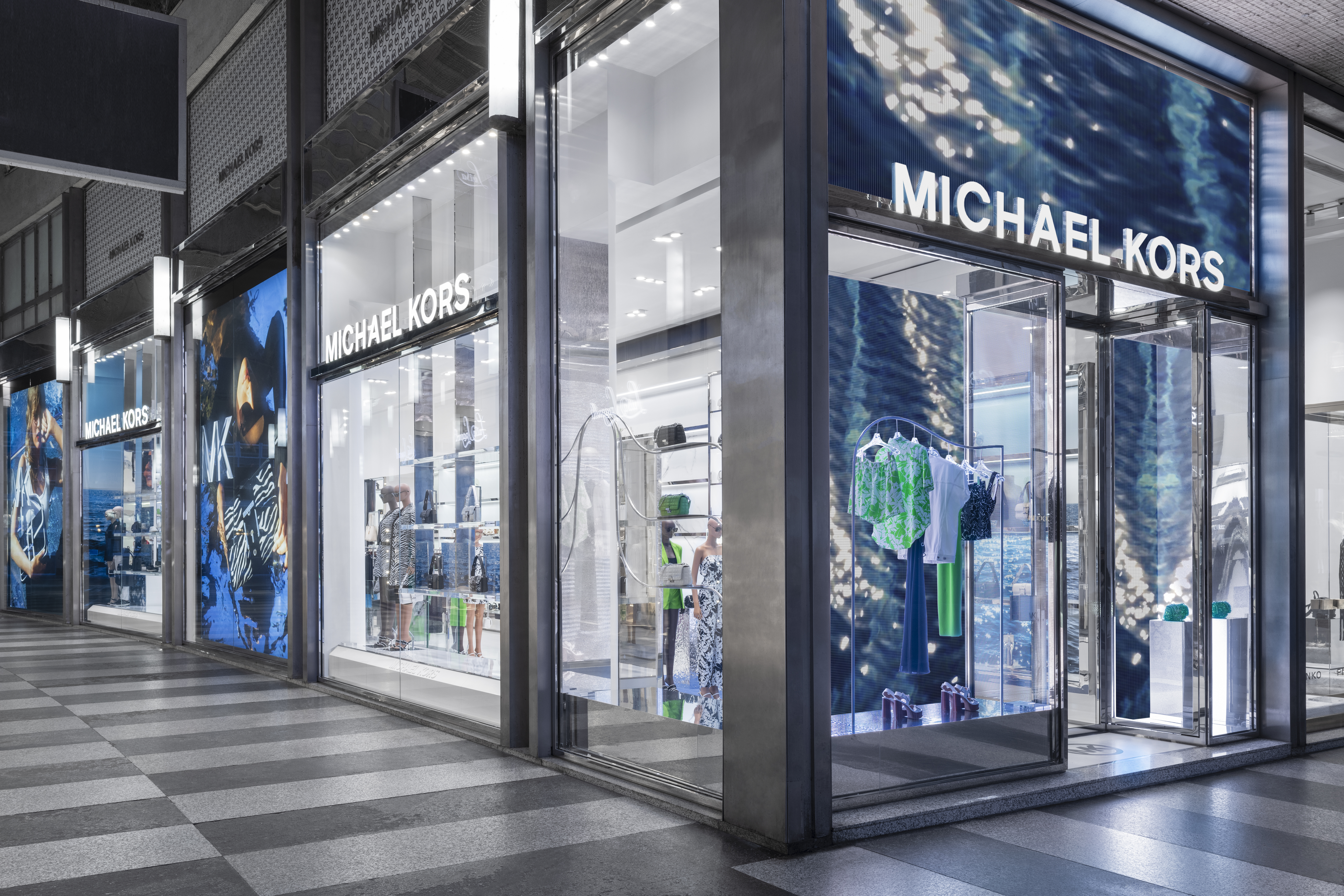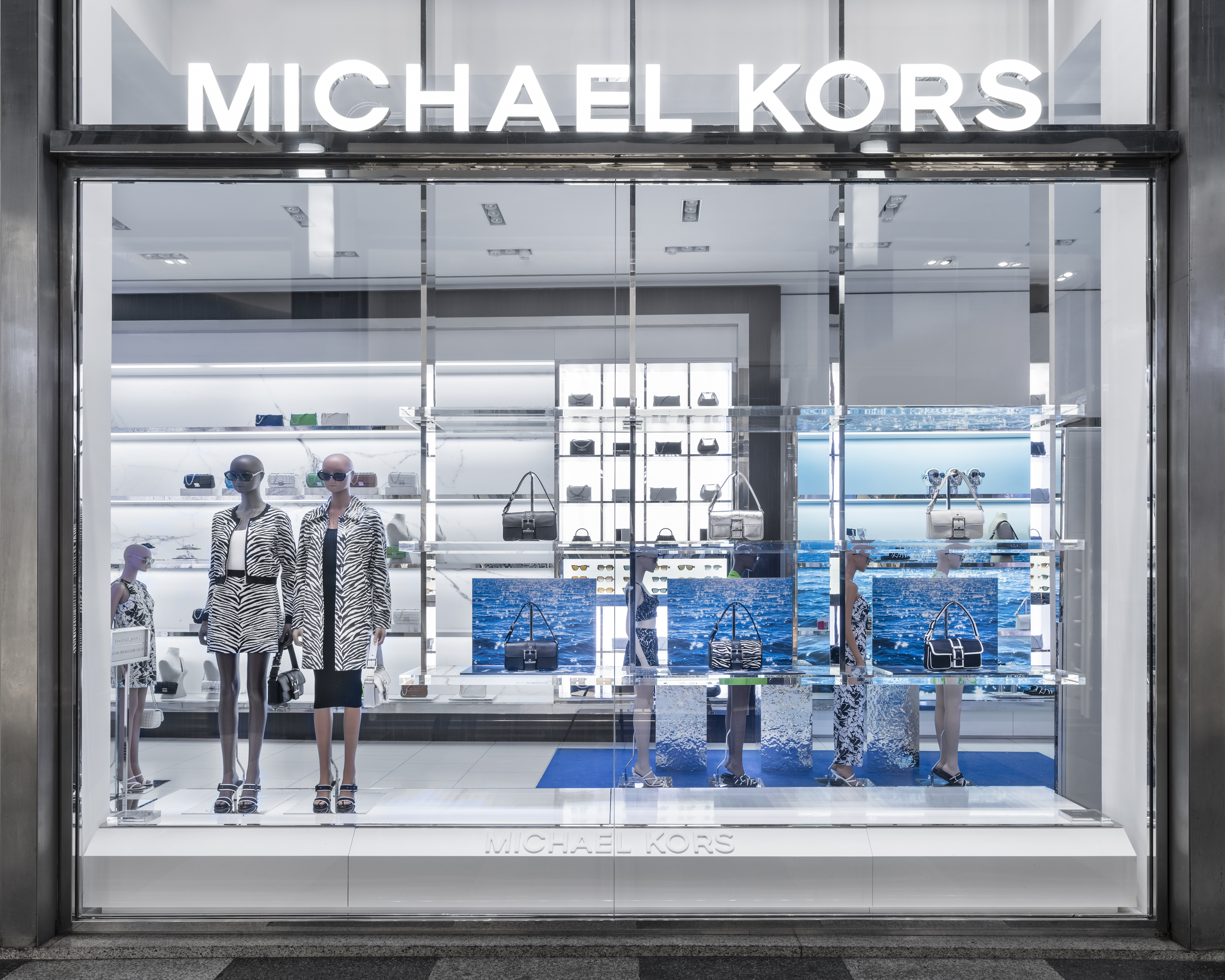 Michael Kors; Spring 2024 window animation features innovative wavy chrome rails that elegantly highlight the collection, adding a dynamic, fluid element to the display. Complementing this modern showcase is a sleek summer video that captures the essence of Southern California, with its sun-drenched beaches, gentle waves, and relaxed coastal vibe. This combination of reflective chrome and vibrant, summer-y visuals creates a chic, immersive experience that perfectly embodies the spirit of the season.
