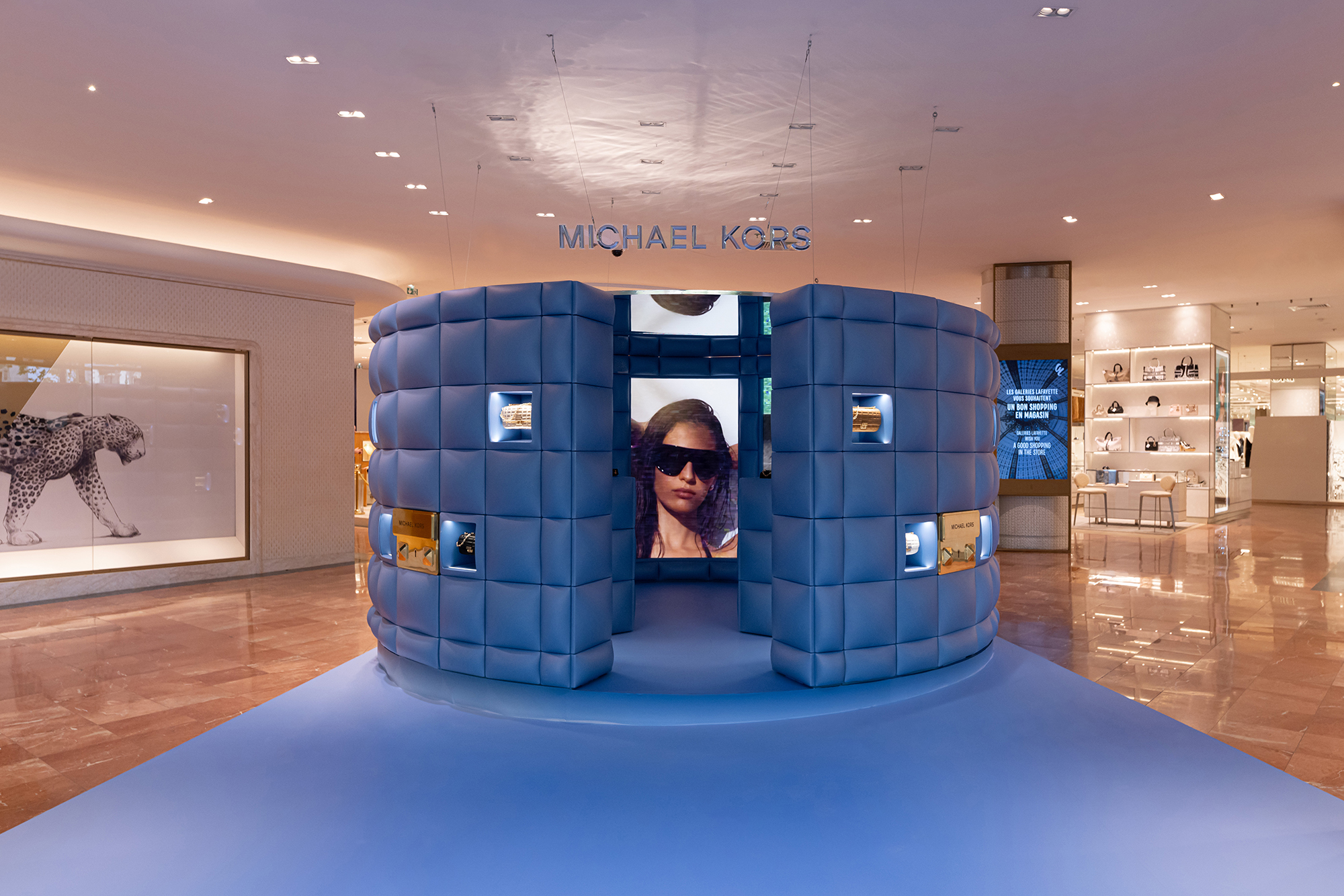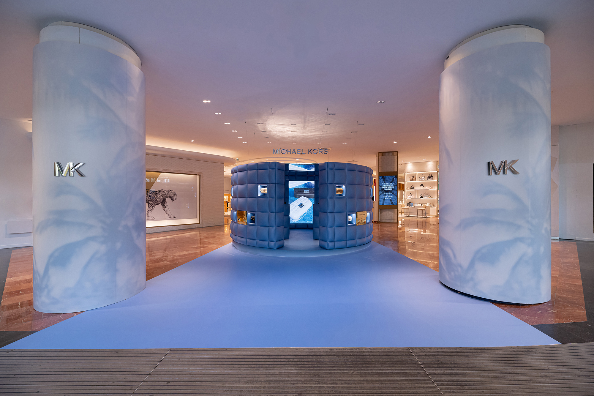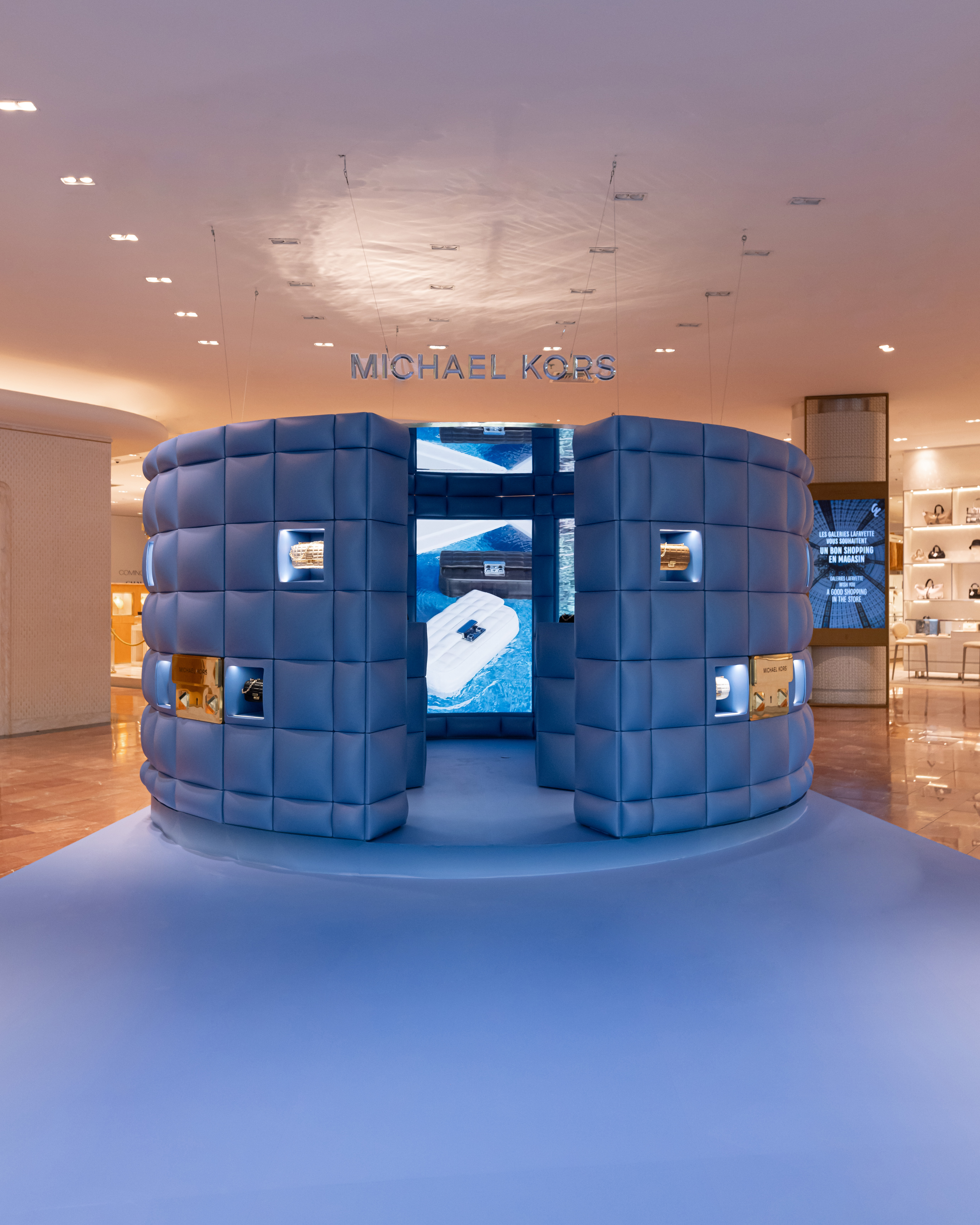 Michael Kors; Spring 2024 pop-up at Galeries Lafayette elegantly highlights the collection, adding a dynamic, fluid element to the display. Complementing this modern showcase is a sleek summer video that captures the essence of Southern California, with its sun-drenched beaches, gentle waves, and relaxed coastal vibe. This combination of reflective chrome and vibrant, summer-y visuals creates a chic, immersive experience that perfectly embodies the spirit of the season.