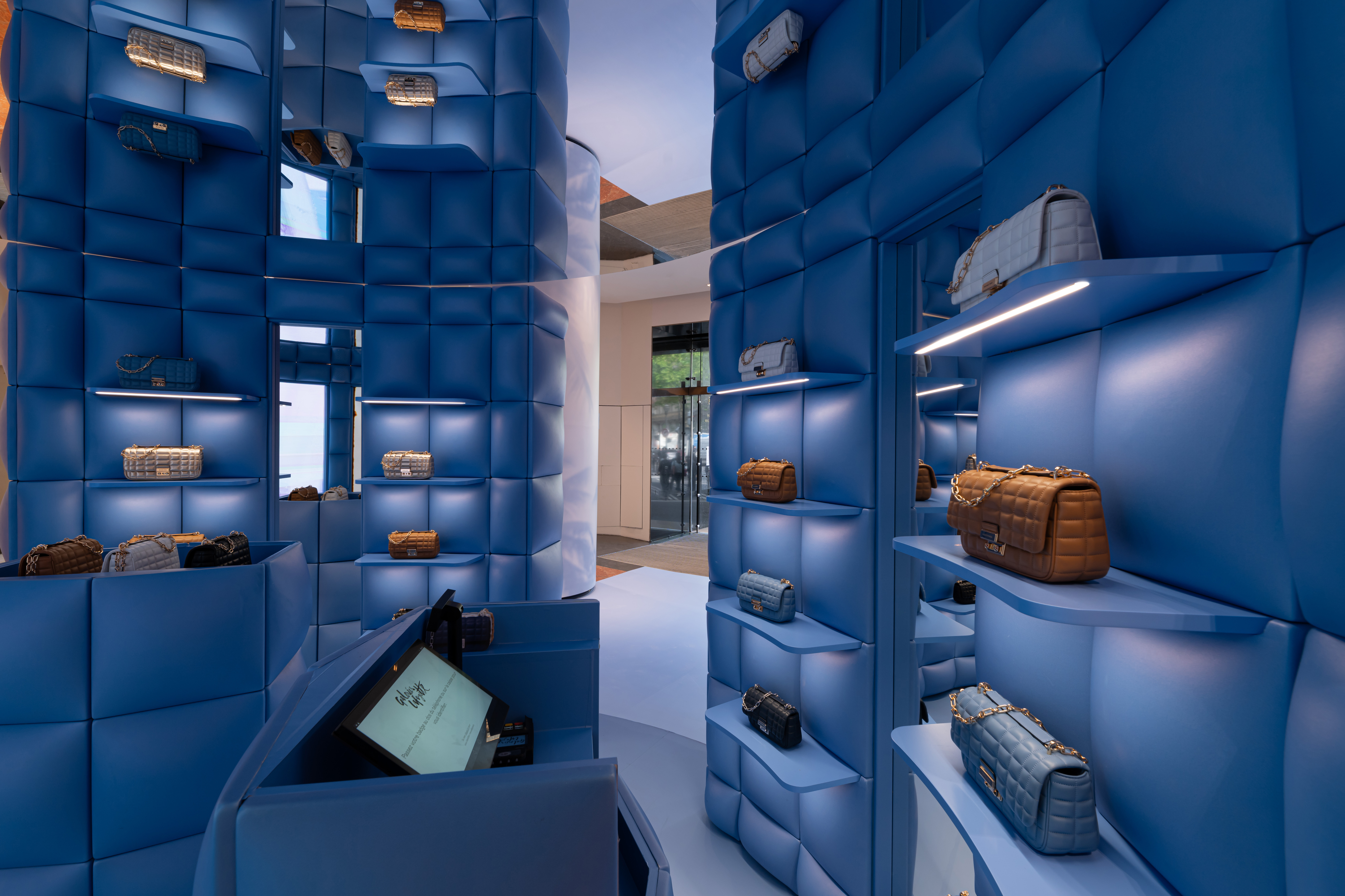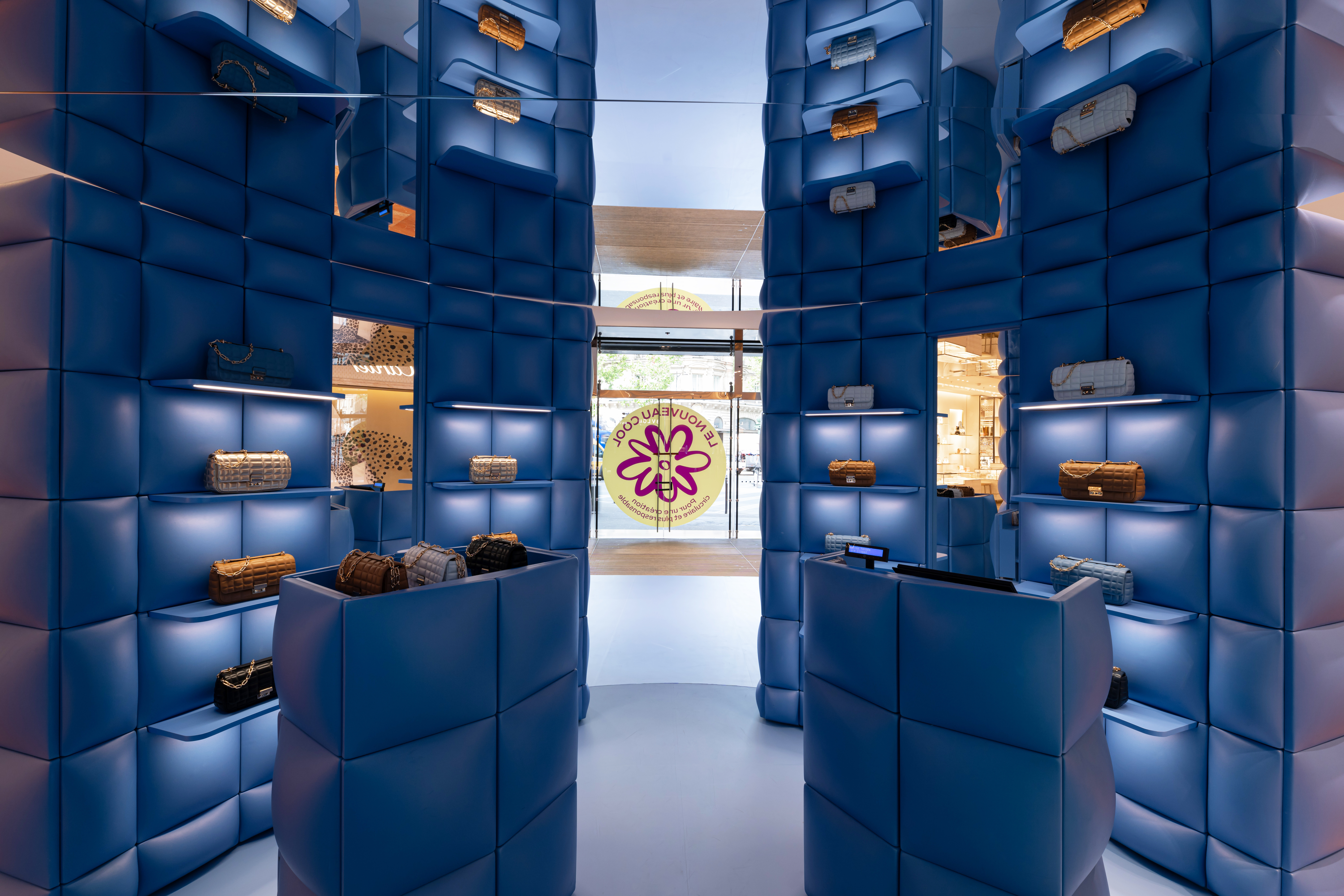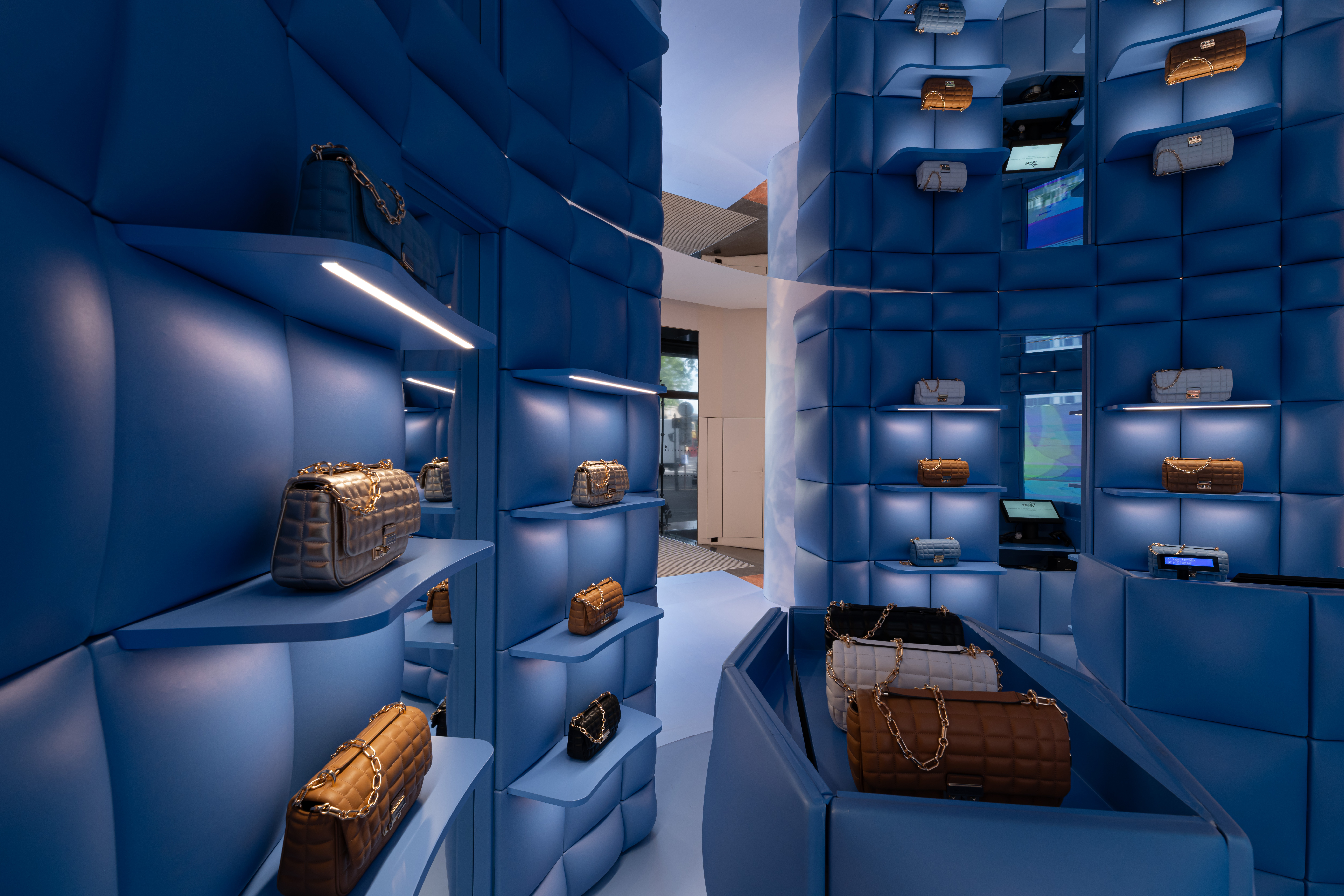 Michael Kors; Spring 2024 pop-up at Galeries Lafayette elegantly highlights the collection, adding a dynamic, fluid element to the display. Complementing this modern showcase is a sleek summer video that captures the essence of Southern California, with its sun-drenched beaches, gentle waves, and relaxed coastal vibe. This combination of reflective chrome and vibrant, summer-y visuals creates a chic, immersive experience that perfectly embodies the spirit of the season.