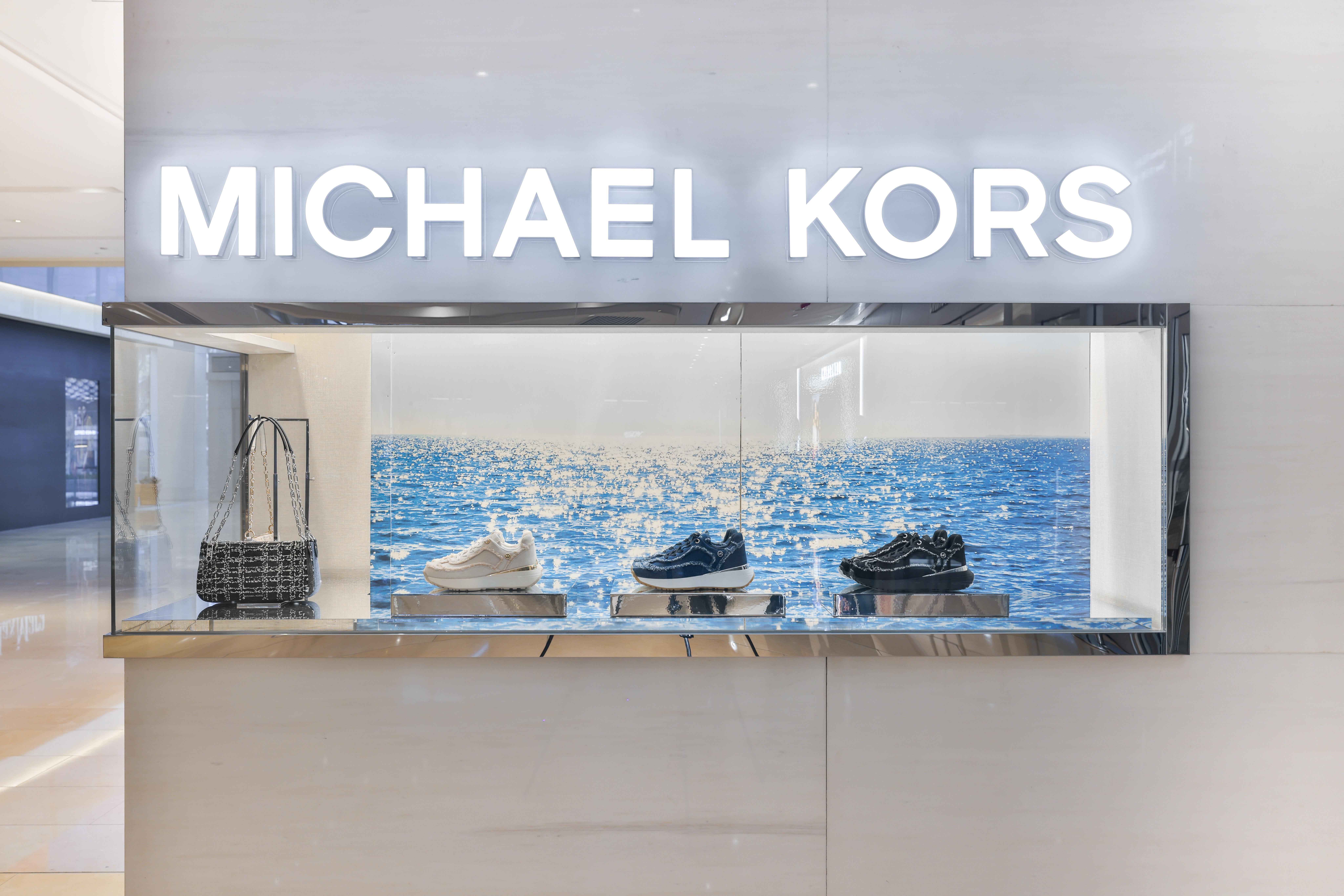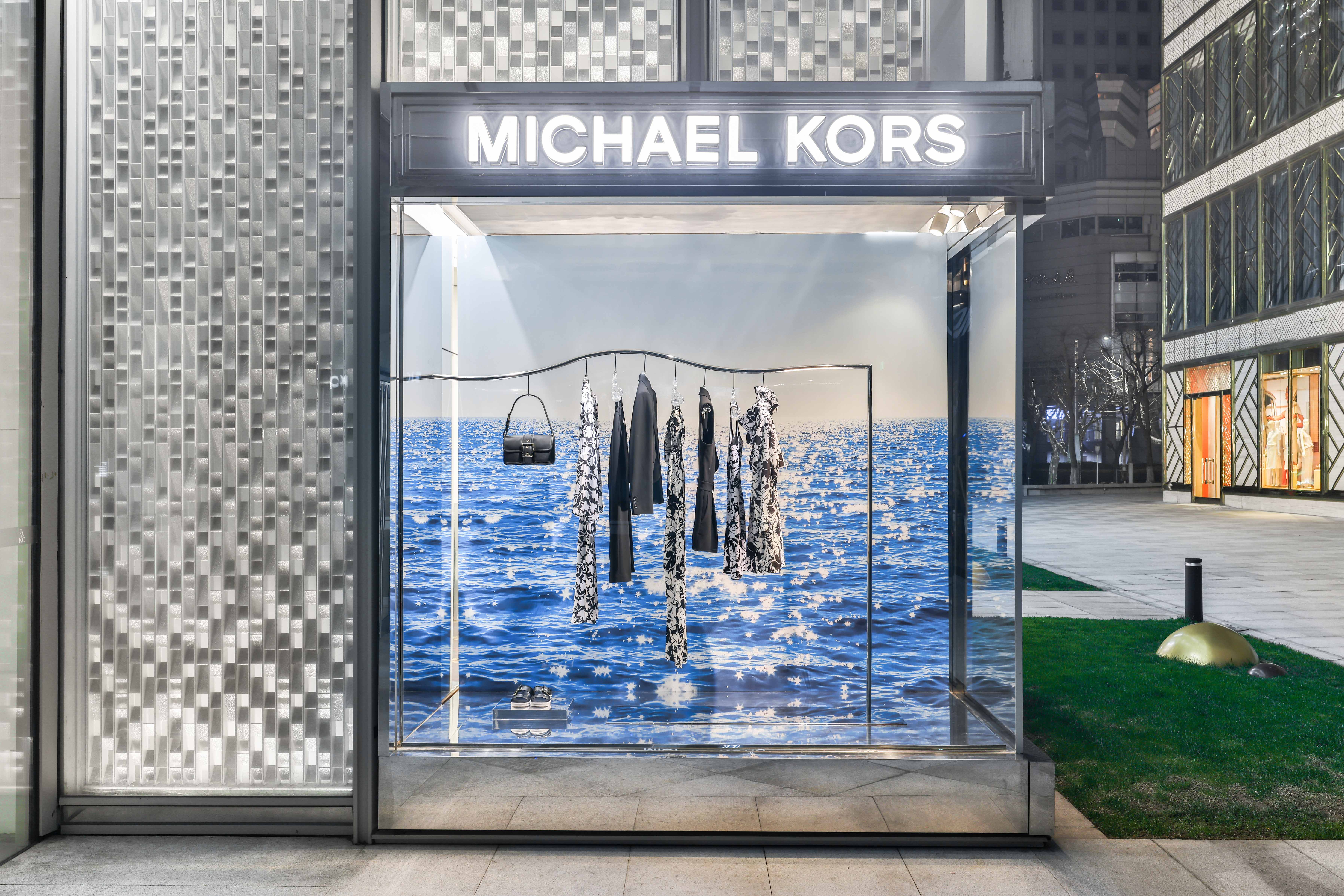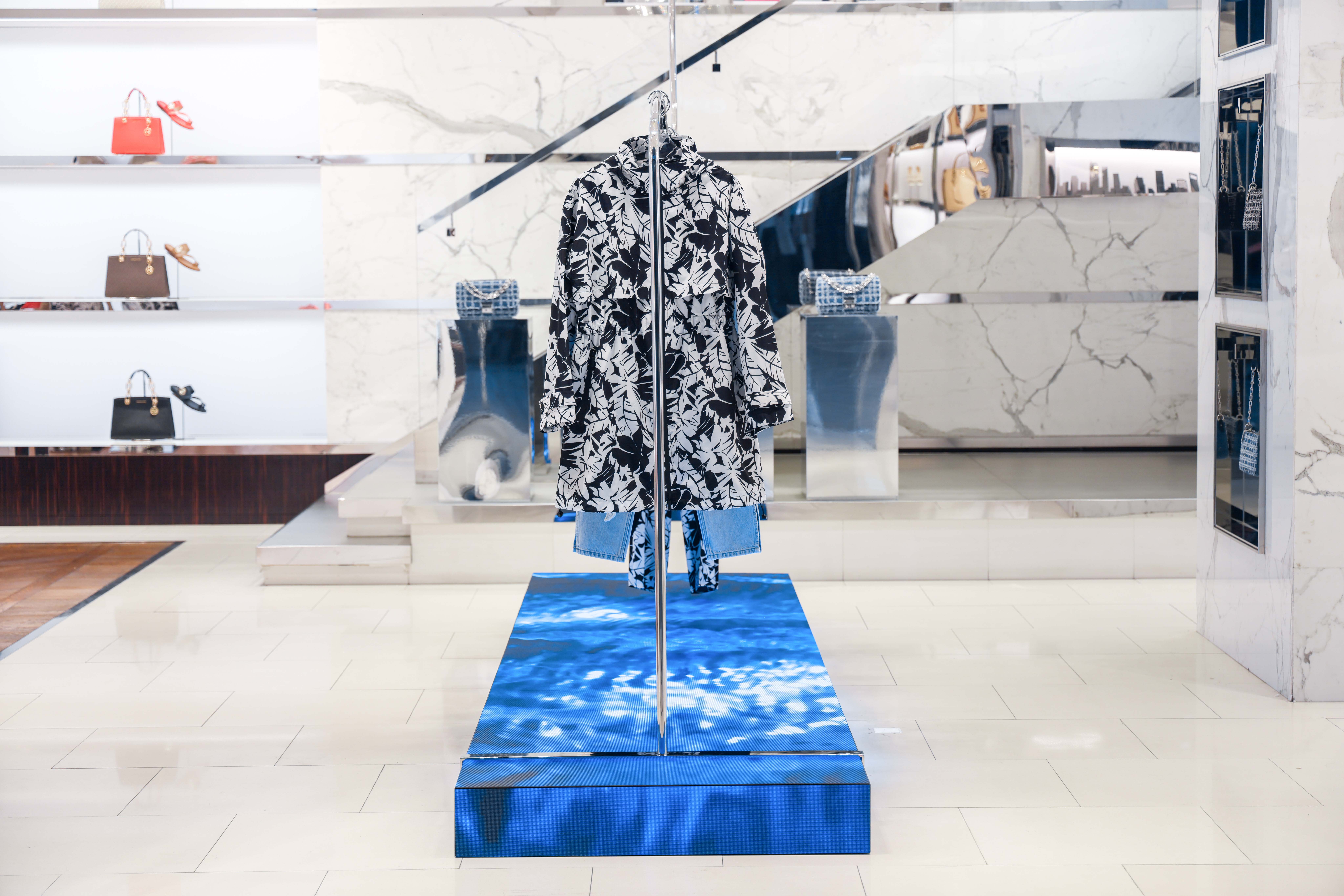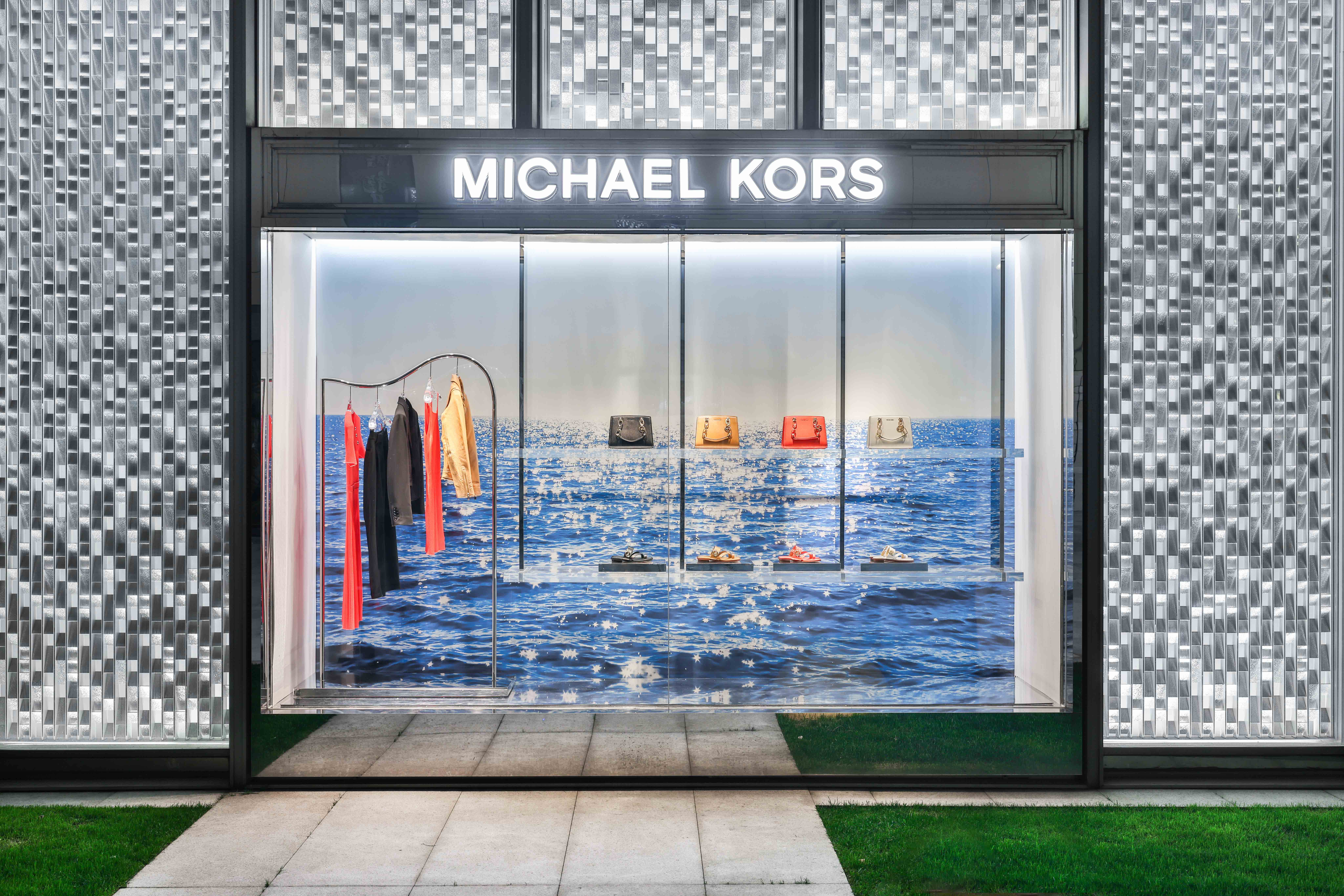 Michael Kors' Spring 2024 window animation features innovative wavy chrome rails that elegantly highlight the collection, adding a dynamic, fluid element to the display. Complementing this modern showcase is a sleek summer video that captures the essence of Southern California, with its sun-drenched beaches, gentle waves, and relaxed coastal vibe. This combination of reflective chrome and vibrant, summer-y visuals creates a chic, immersive experience that perfectly embodies the spirit of the season.