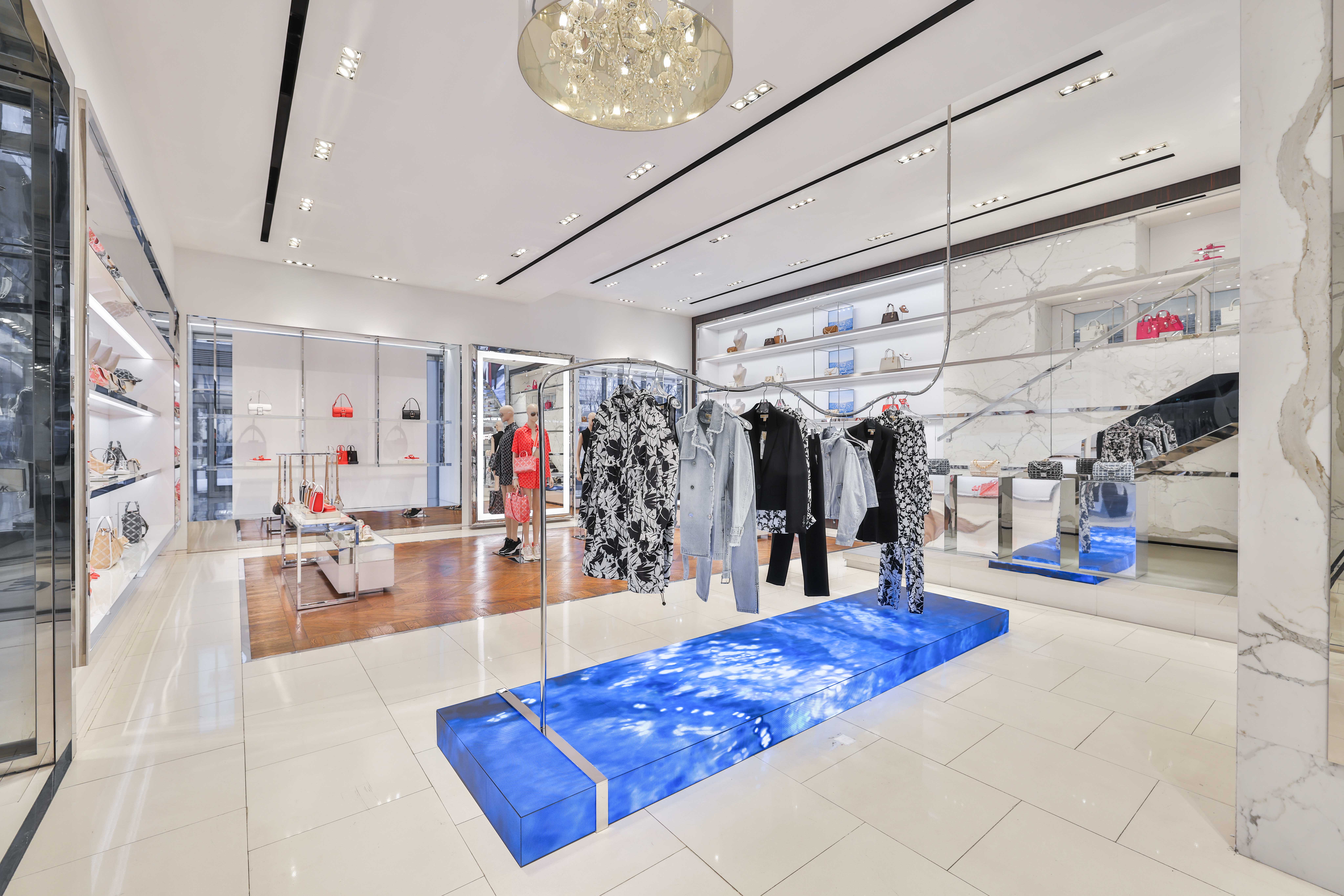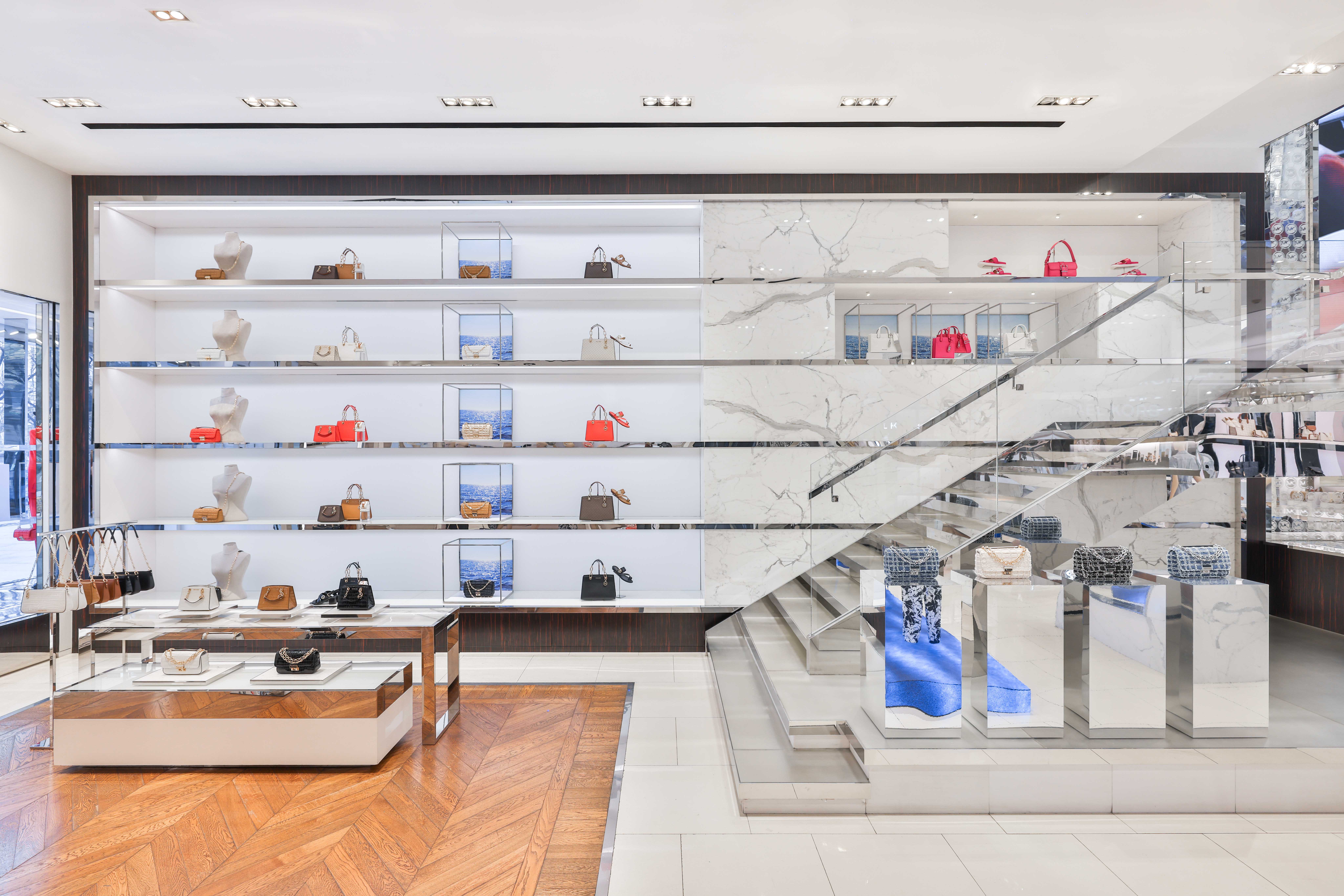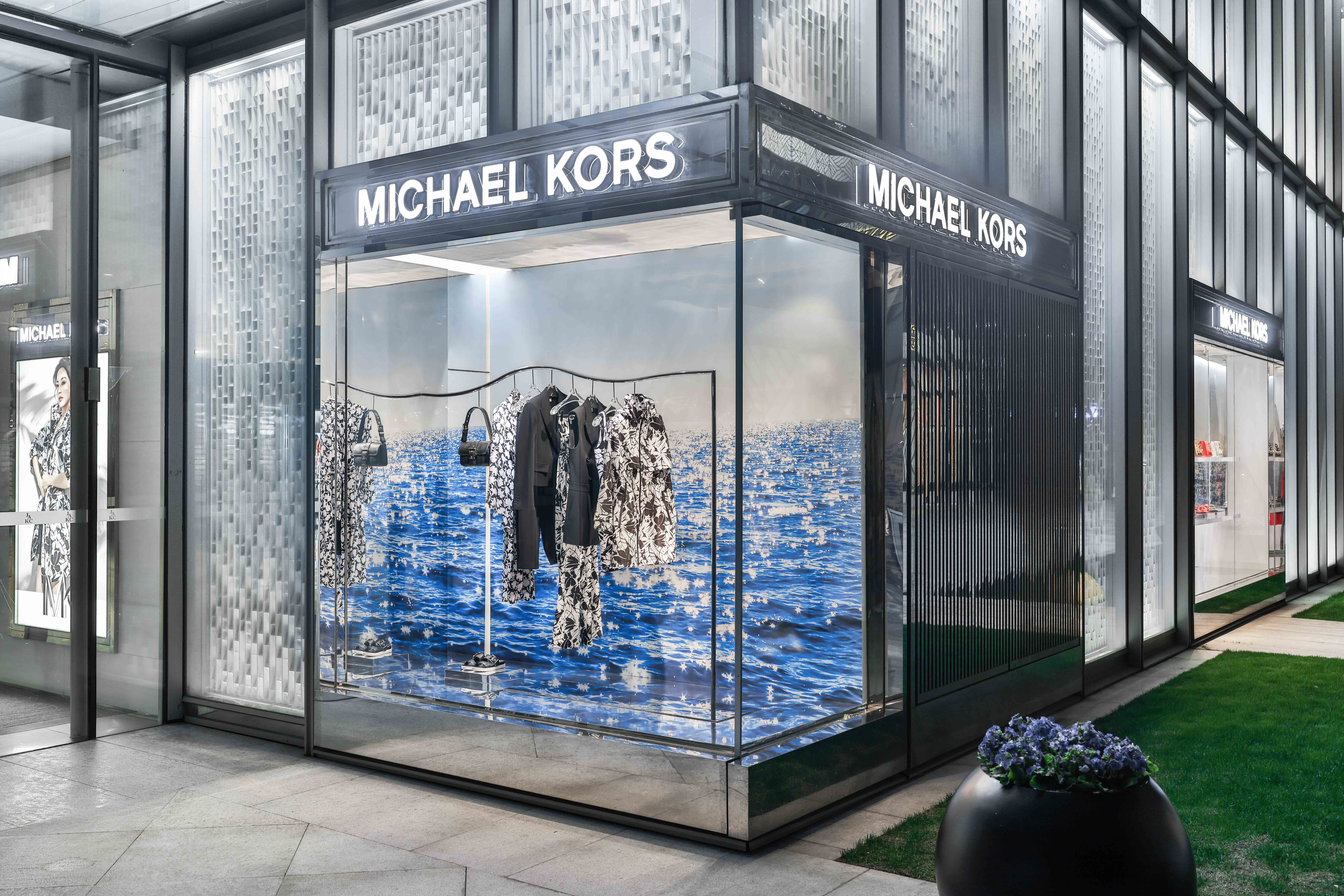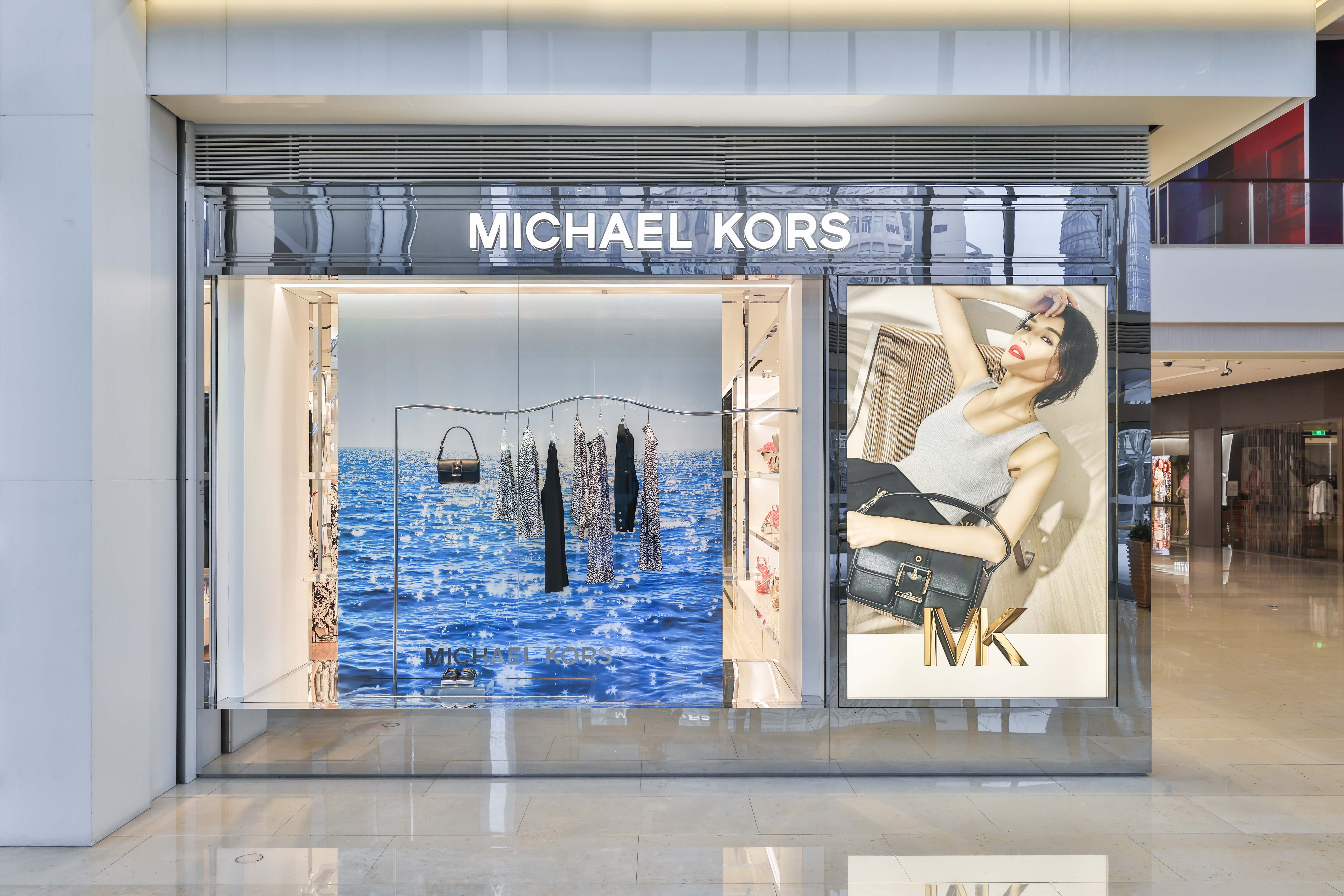 Michael Kors' Spring 2024 window animation features innovative wavy chrome rails that elegantly highlight the collection, adding a dynamic, fluid element to the display. Complementing this modern showcase is a sleek summer video that captures the essence of Southern California, with its sun-drenched beaches, gentle waves, and relaxed coastal vibe. This combination of reflective chrome and vibrant, summer-y visuals creates a chic, immersive experience that perfectly embodies the spirit of the season.