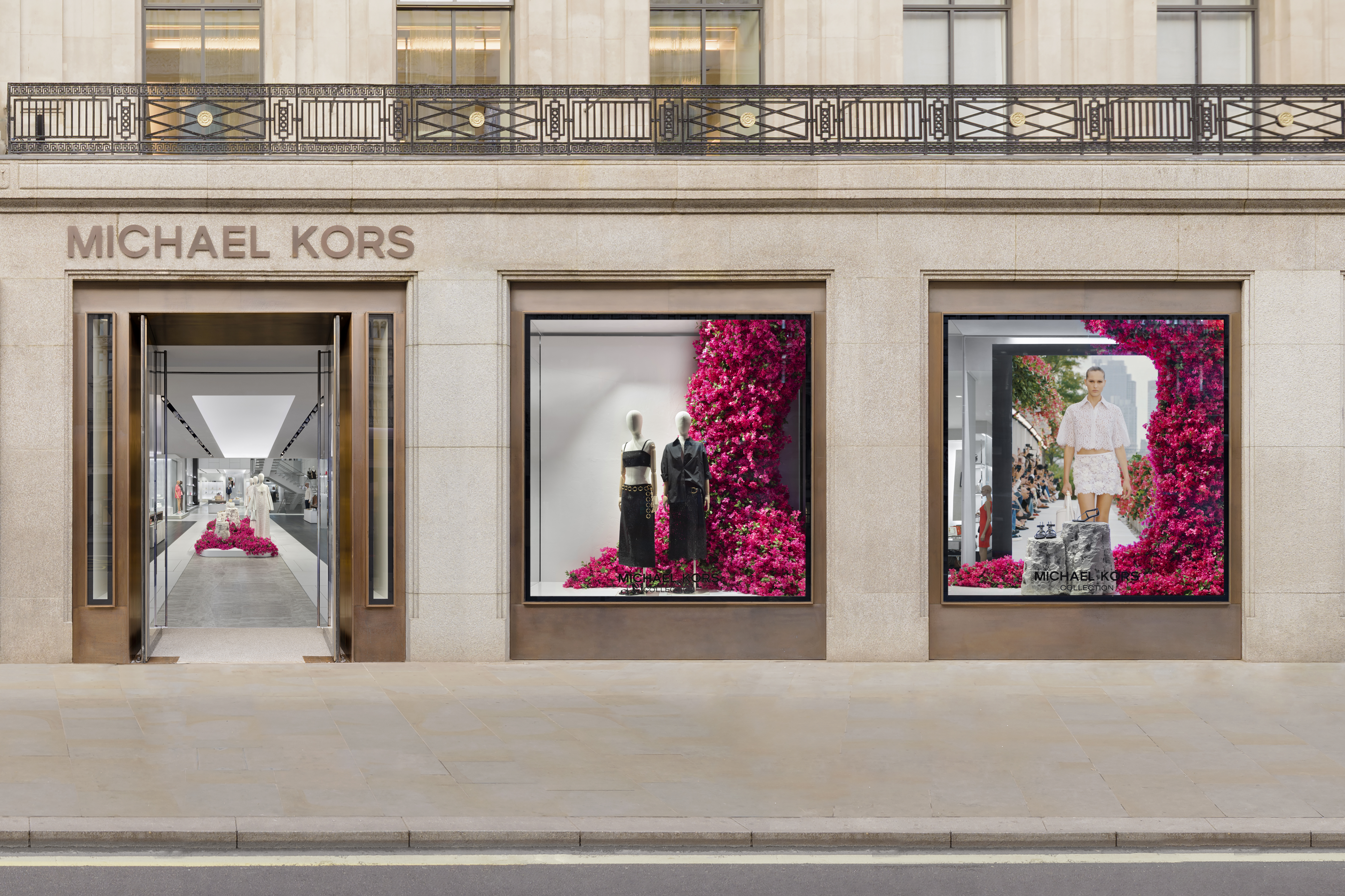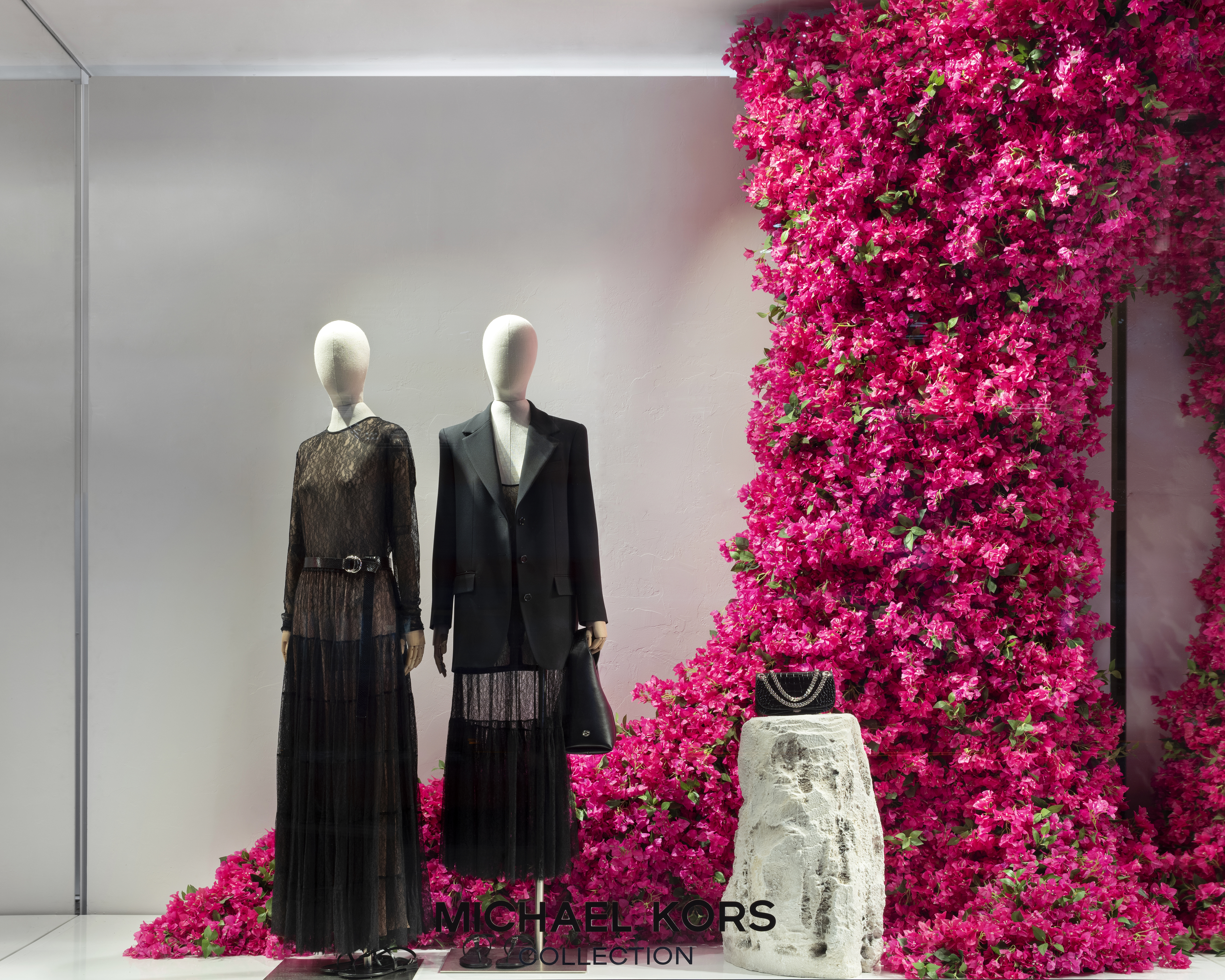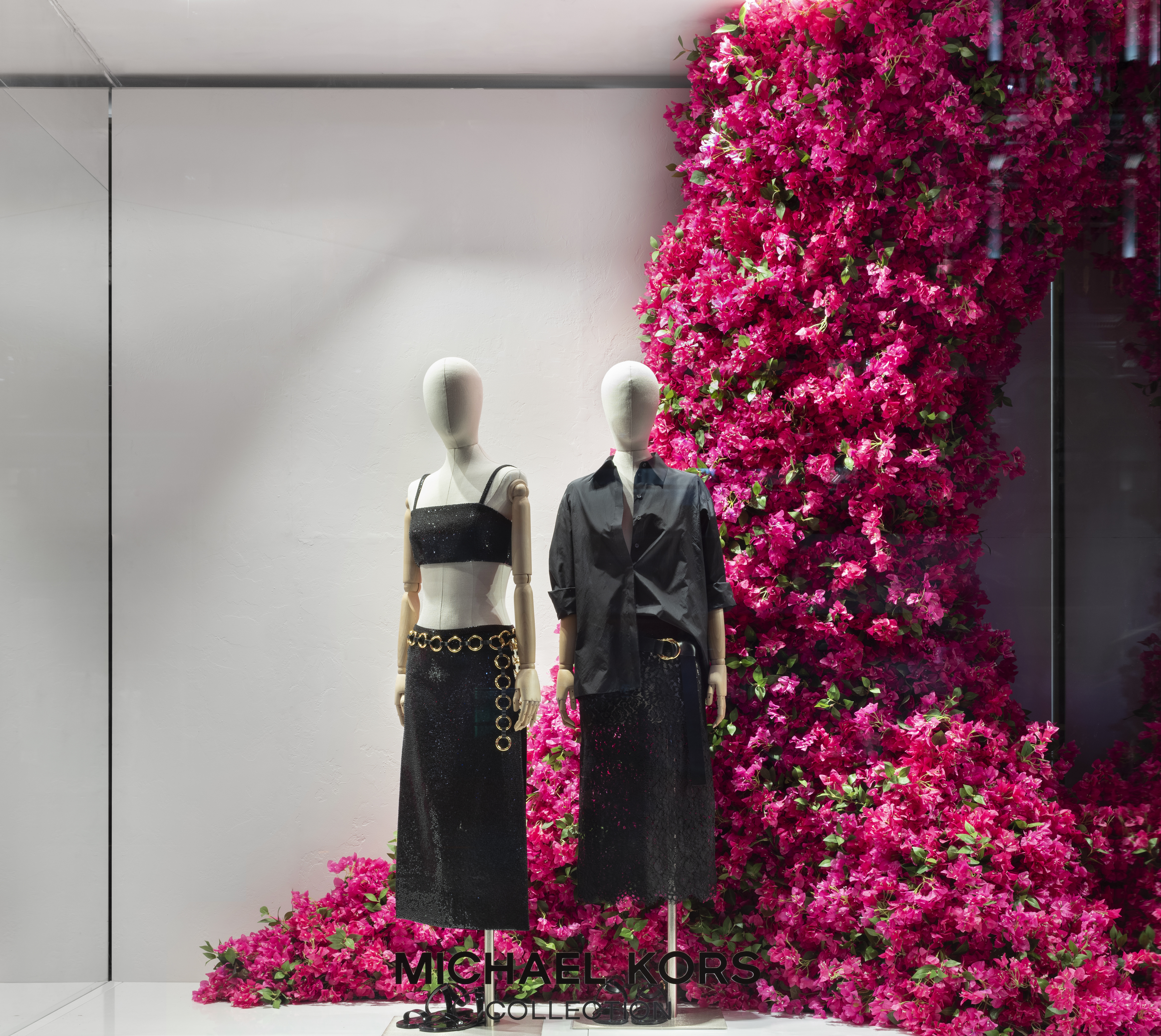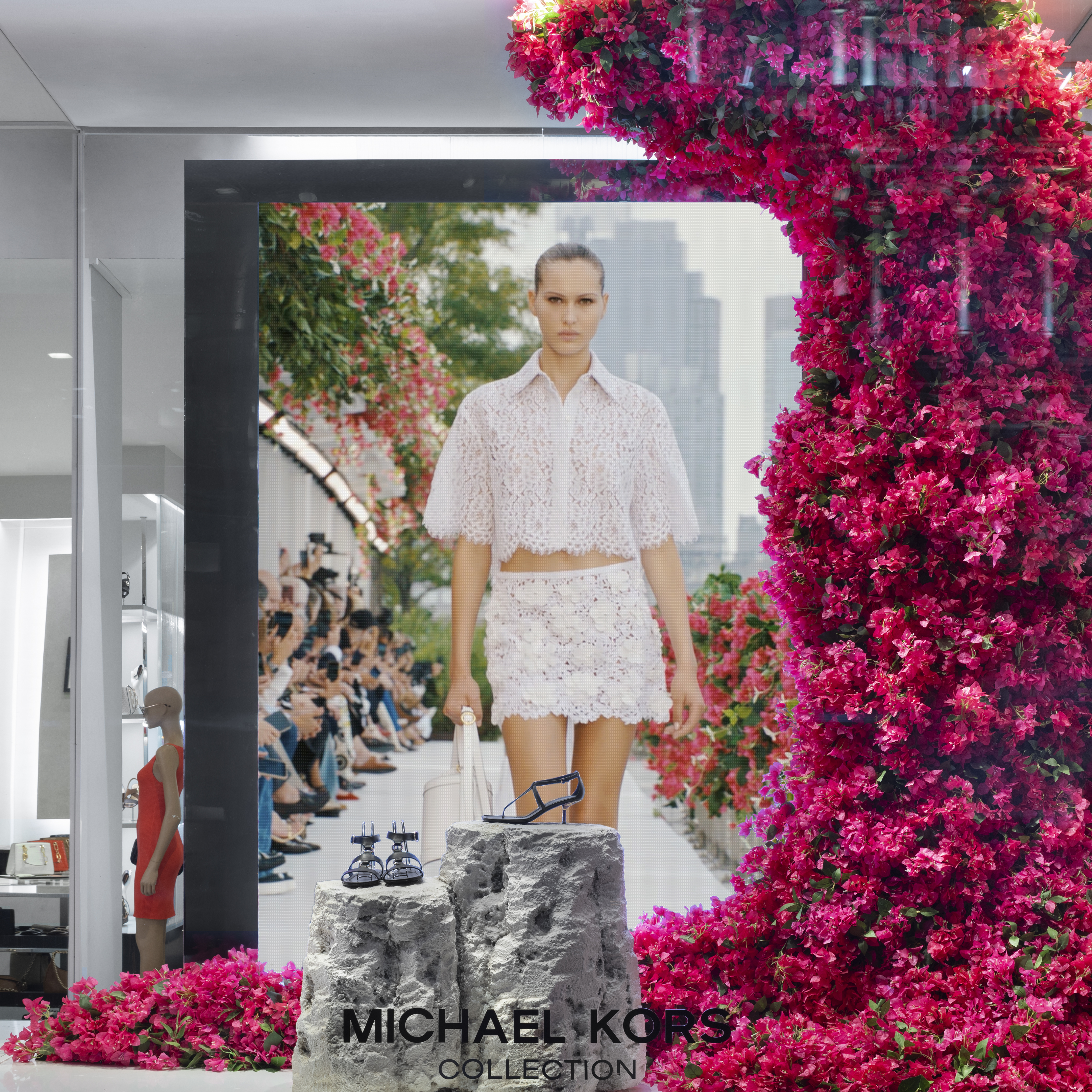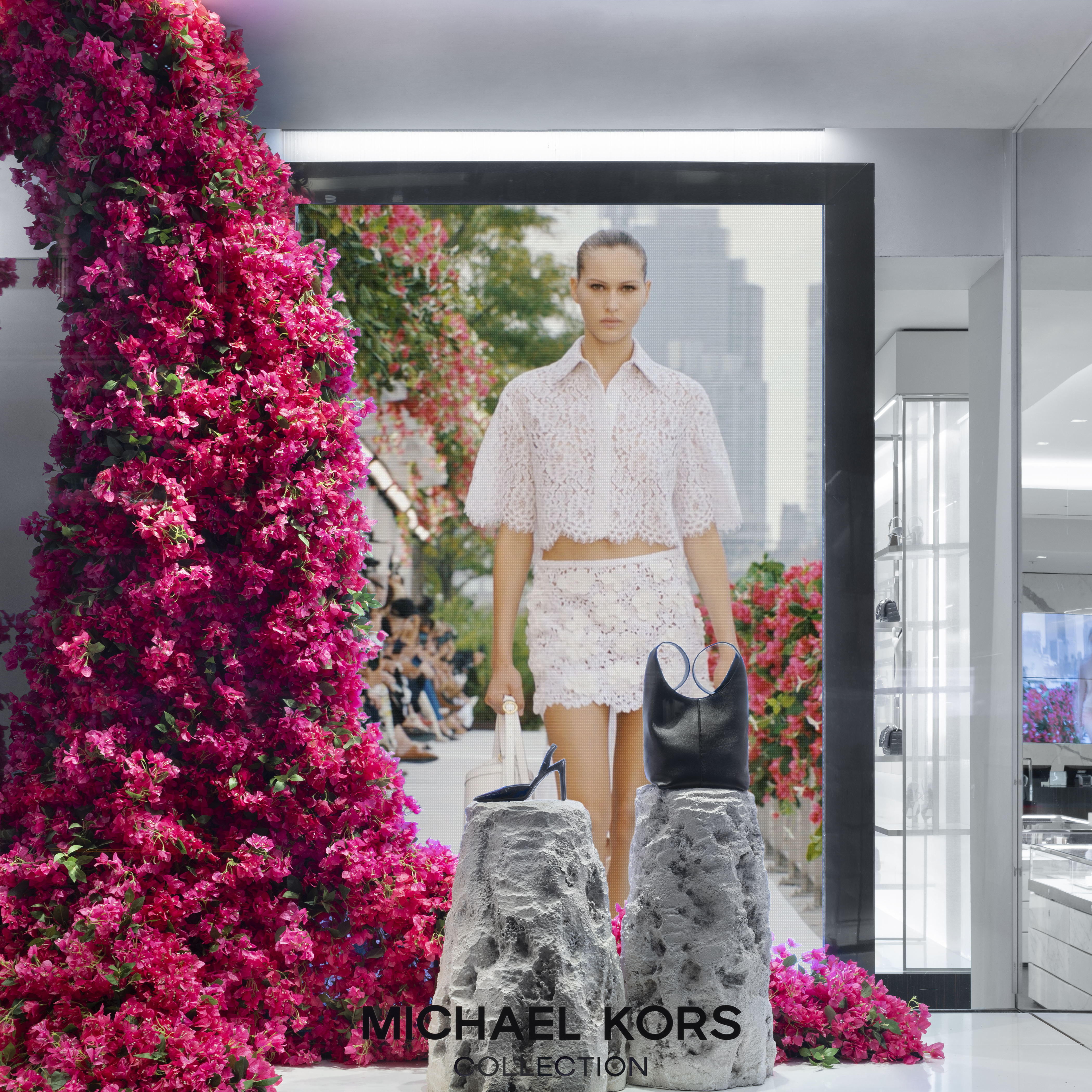 Michael Kors' Spring 2024 window animation effortlessly captures the vibrant essence of Capri, Italy, through a captivating display of bougainvillea flowers. The animation features these lush, magenta blooms cascading gracefully across the store windows, evoking the island's romantic charm and sun-drenched beauty. The fluid motion of the flowers and the soft, Mediterranean-inspired color palette transport viewers to the idyllic coastal setting, perfectly encapsulating the spirit of Kors' latest collection.