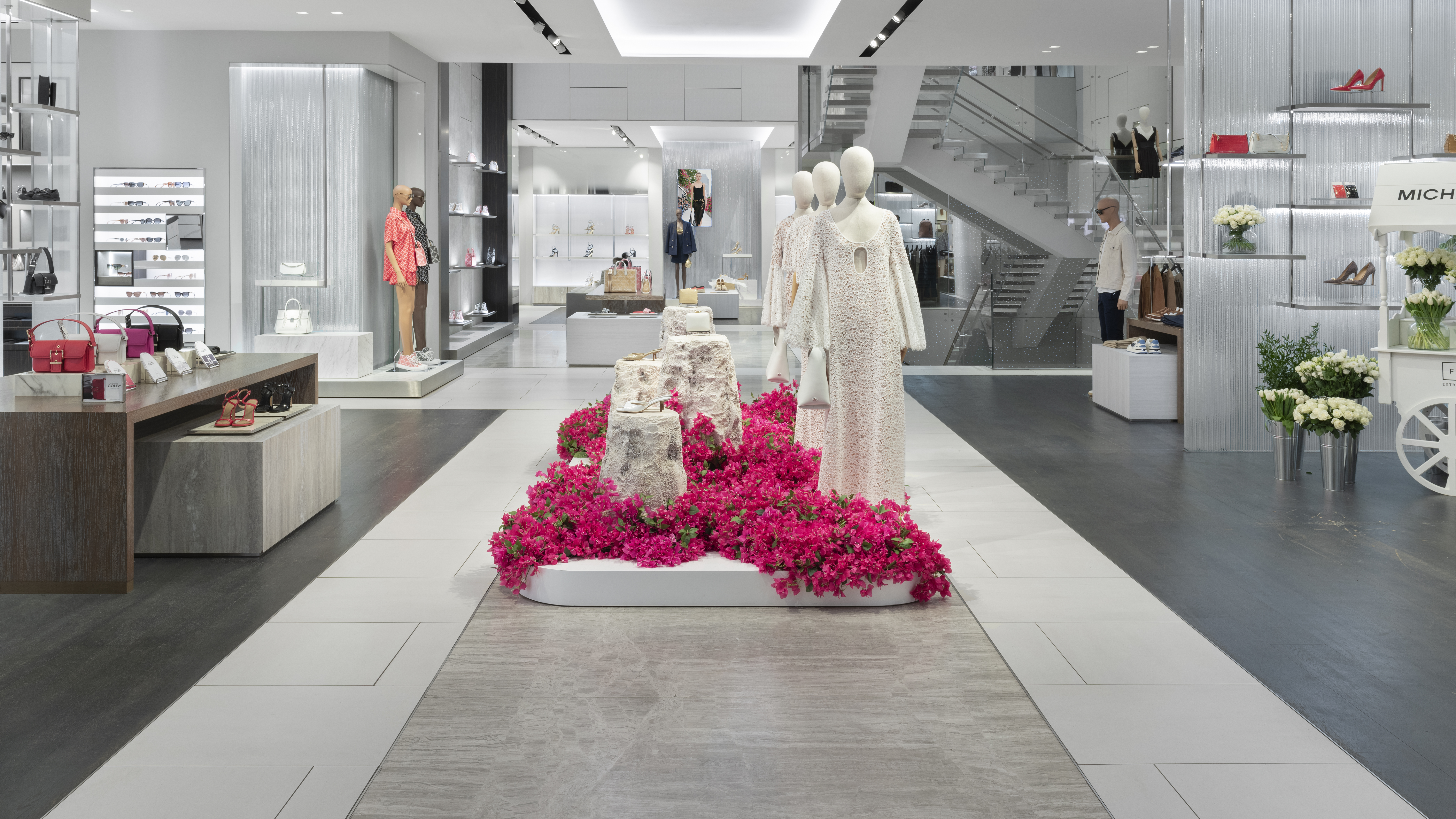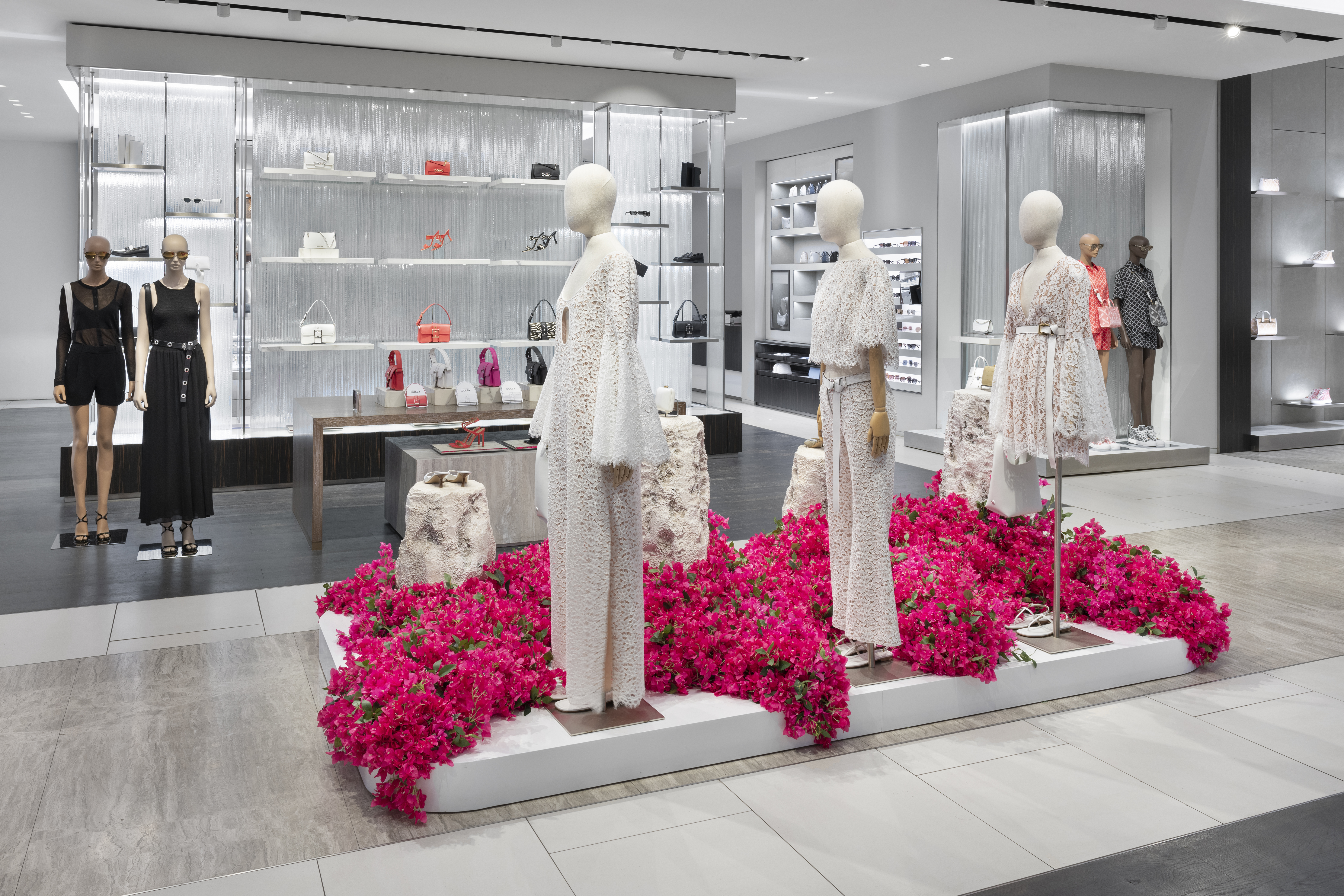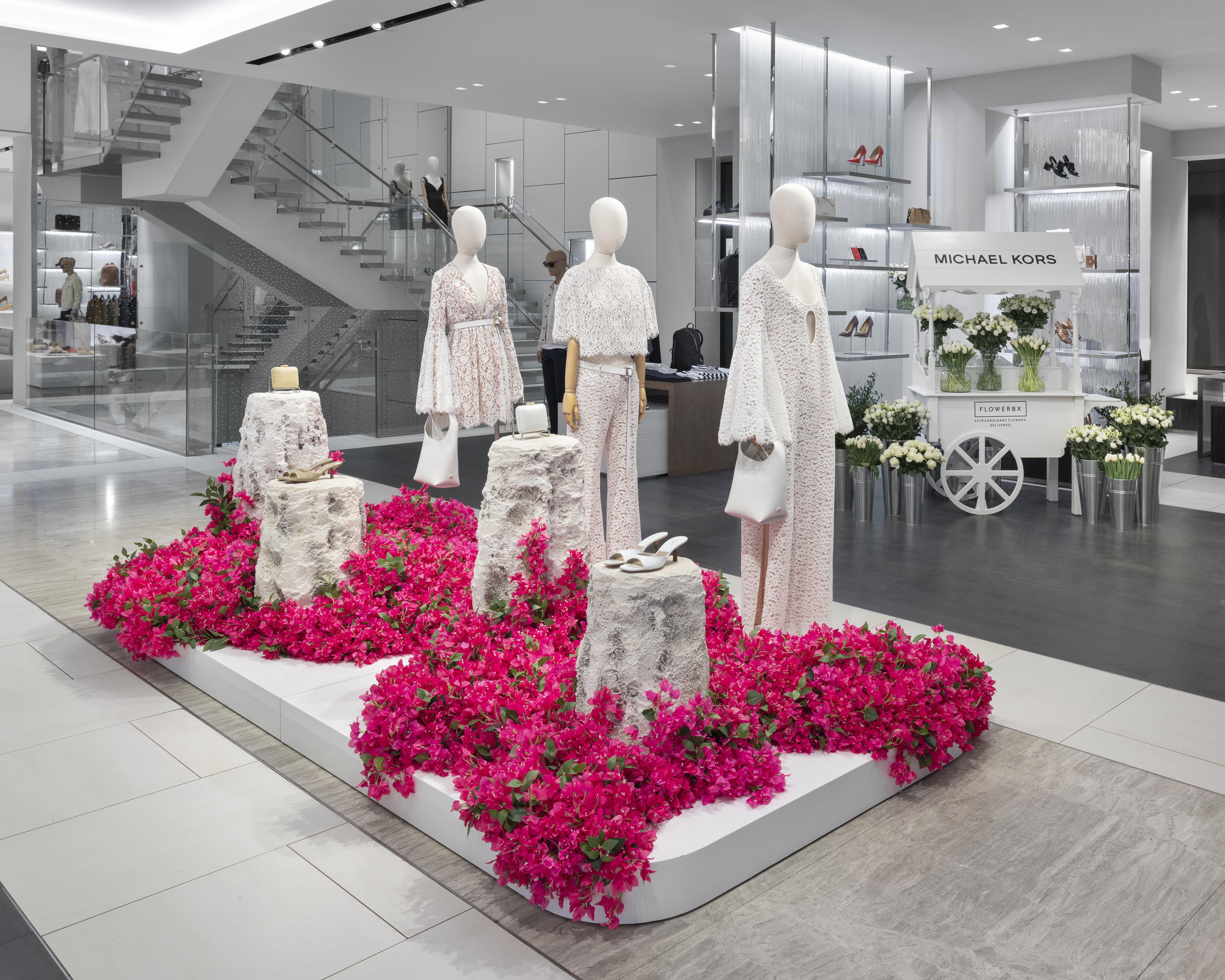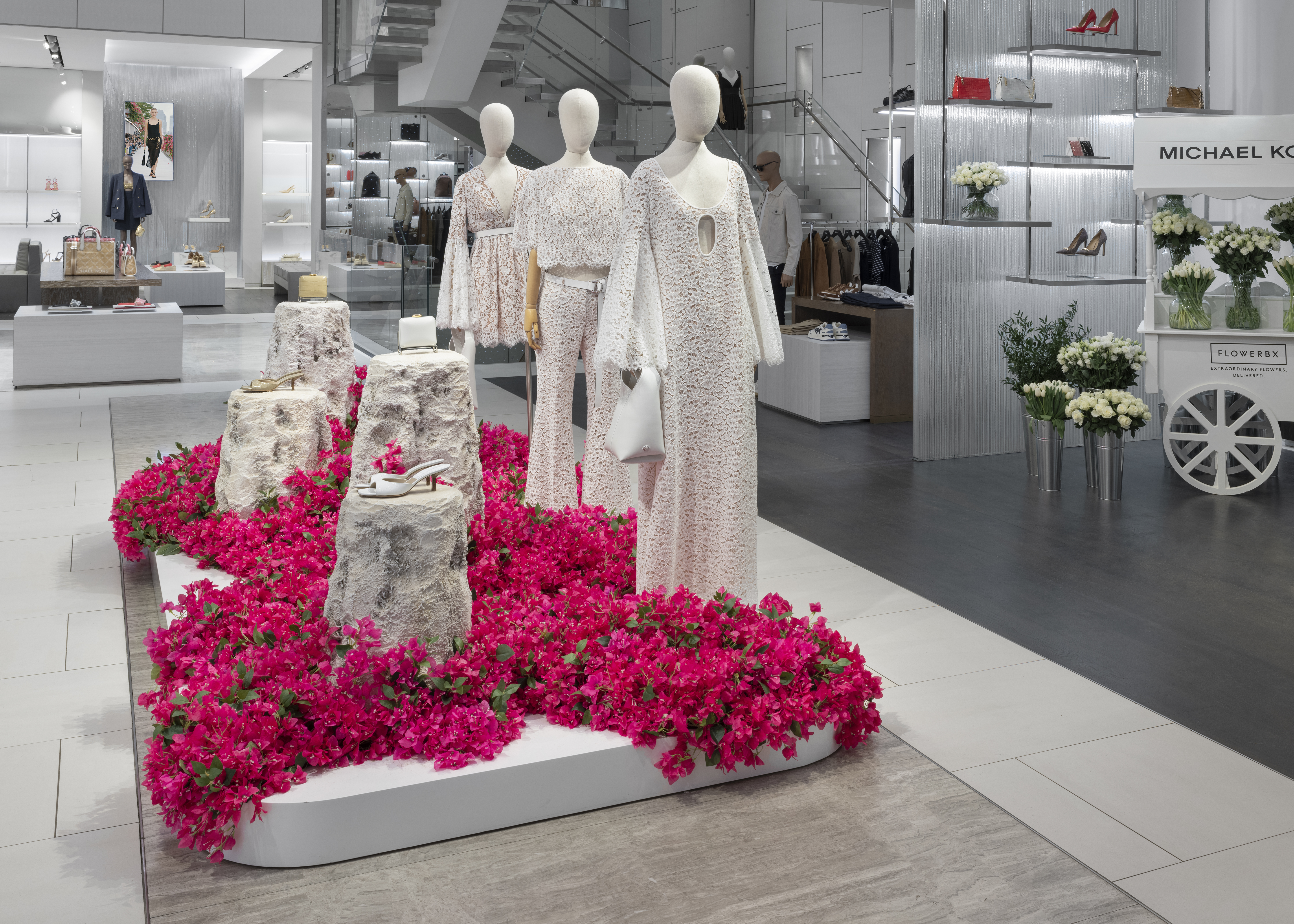 Michael Kors' Spring 2024 window animation effortlessly captures the vibrant essence of Capri, Italy, through a captivating display of bougainvillea flowers. The animation features these lush, magenta blooms cascading gracefully across the store windows, evoking the island's romantic charm and sun-drenched beauty. The fluid motion of the flowers and the soft, Mediterranean-inspired color palette transport viewers to the idyllic coastal setting, perfectly encapsulating the spirit of Kors' latest collection.