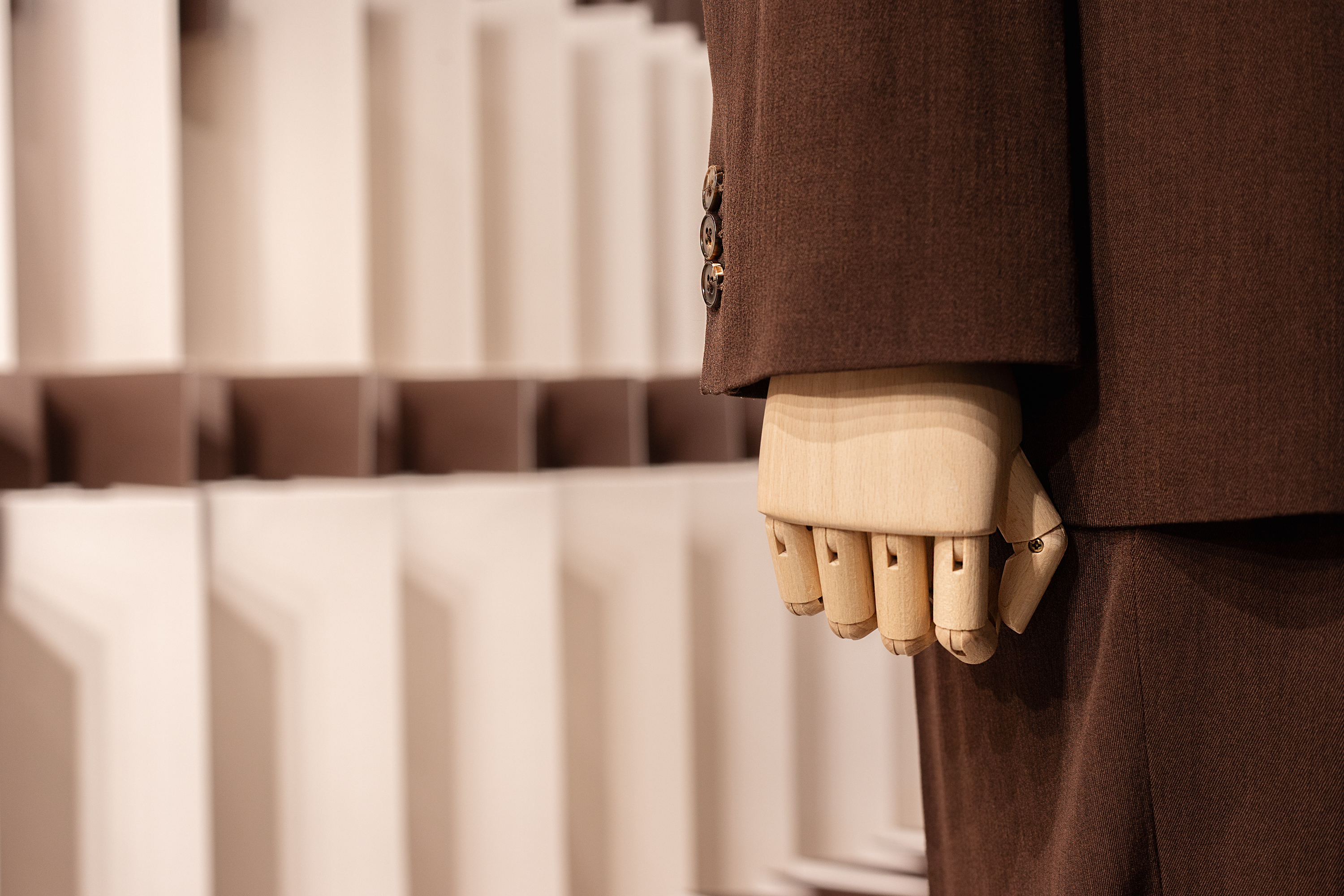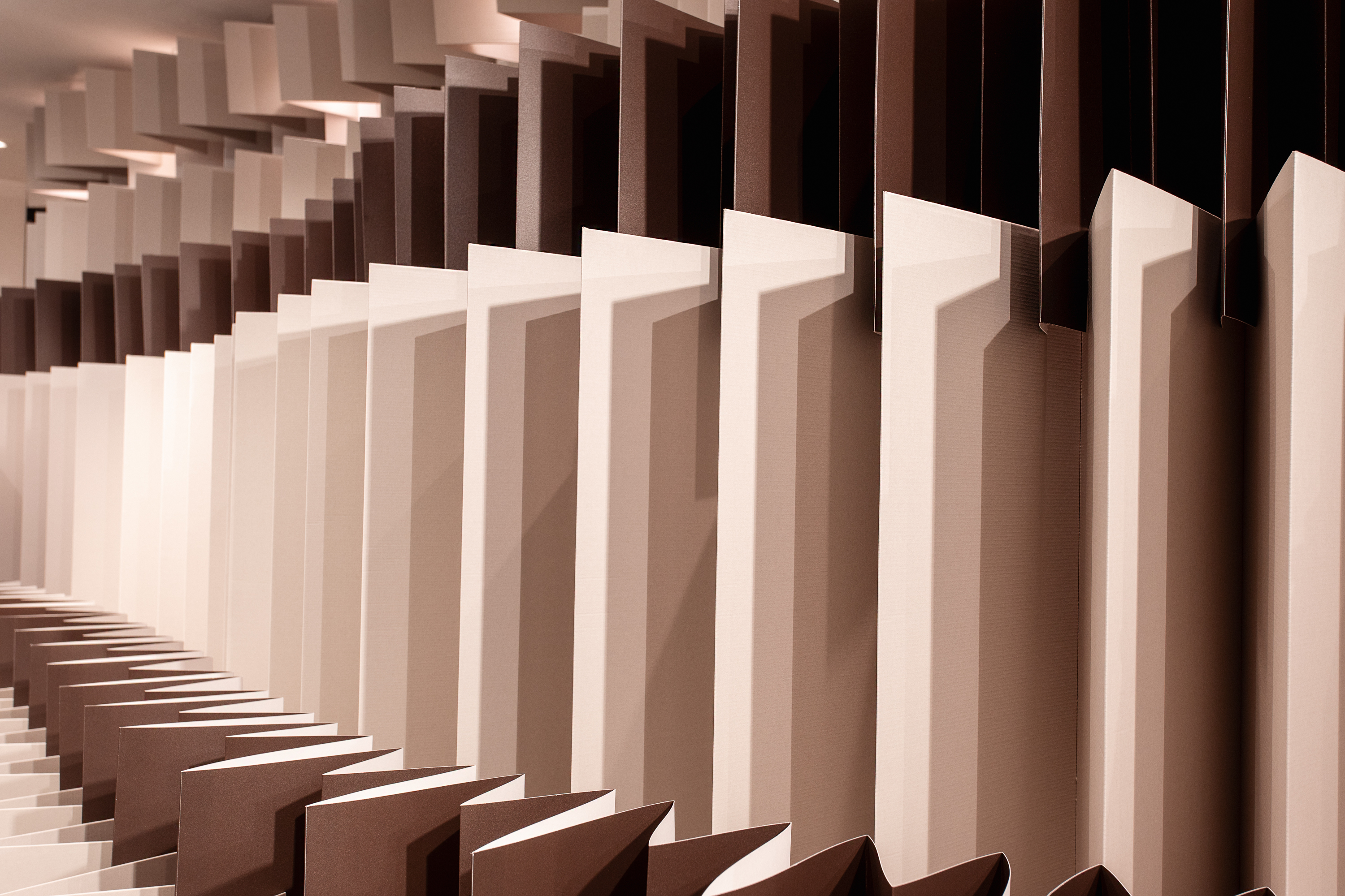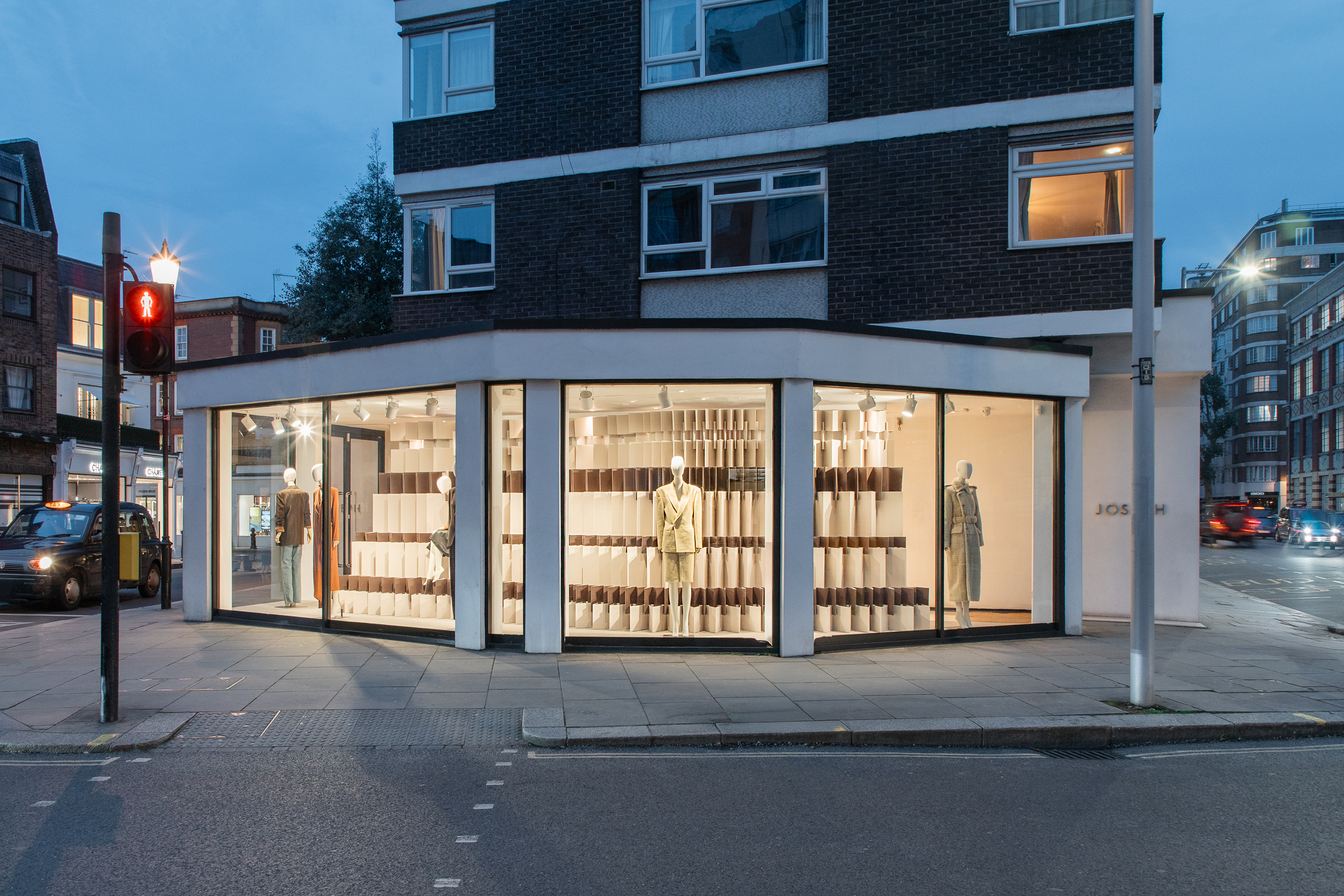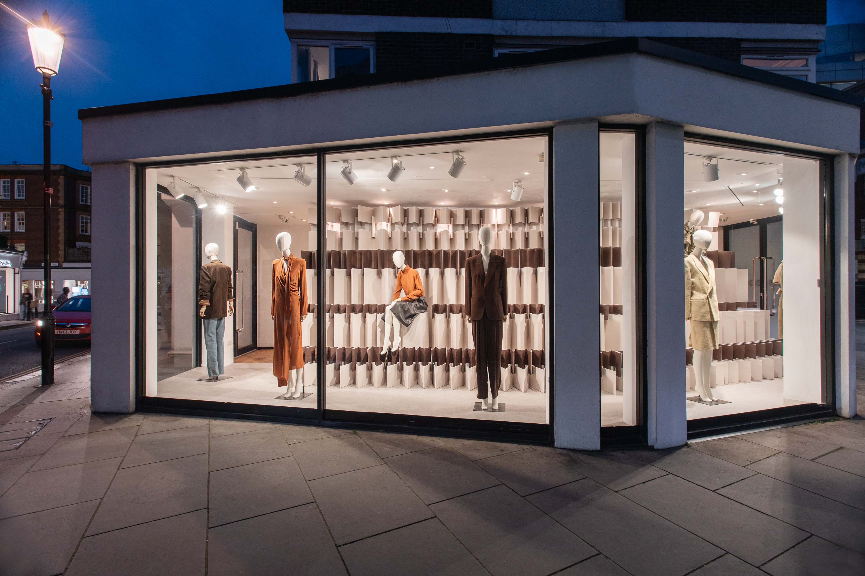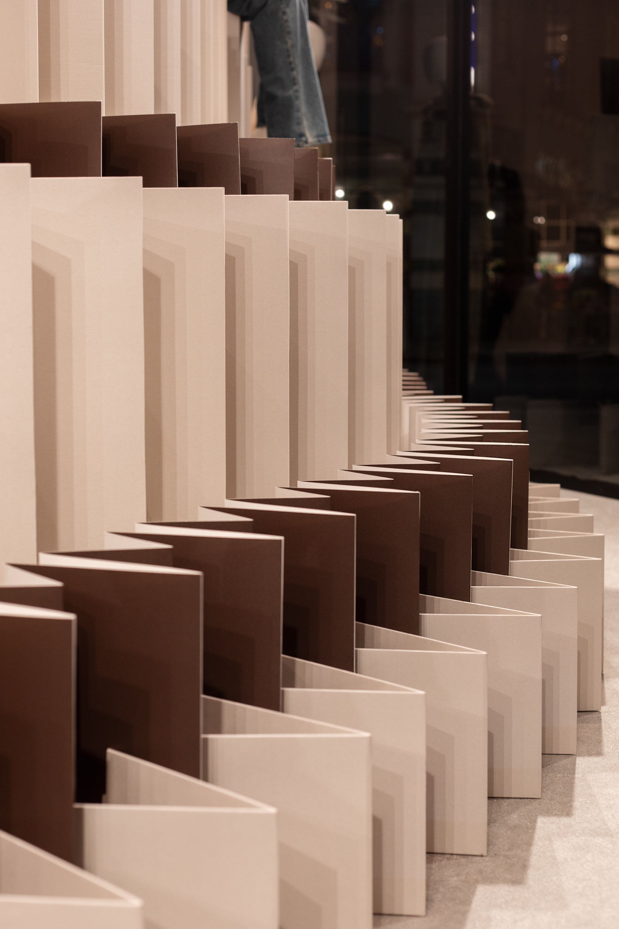 Our AW24 flagship window concept for JOSEPH drew inspiration from the plissé mould used to create their signature fabric treatment. The repetitive lines and folds featured in their collection is brought to life through our cascading sculpture piece. This sculpture is freestanding and sustainably fabricated using only cardboard and high gsm card. The palette selected is subtle and refined to allow the flowing form speak for itself. A combination of spotlights and an abundance of natural light creates interesting and repetitive shadowing. Rows of triangular prisms are intricately combined with w-shaped card connectors using hidden slits to create an accordion like structure without any need for additional fixings or supports.