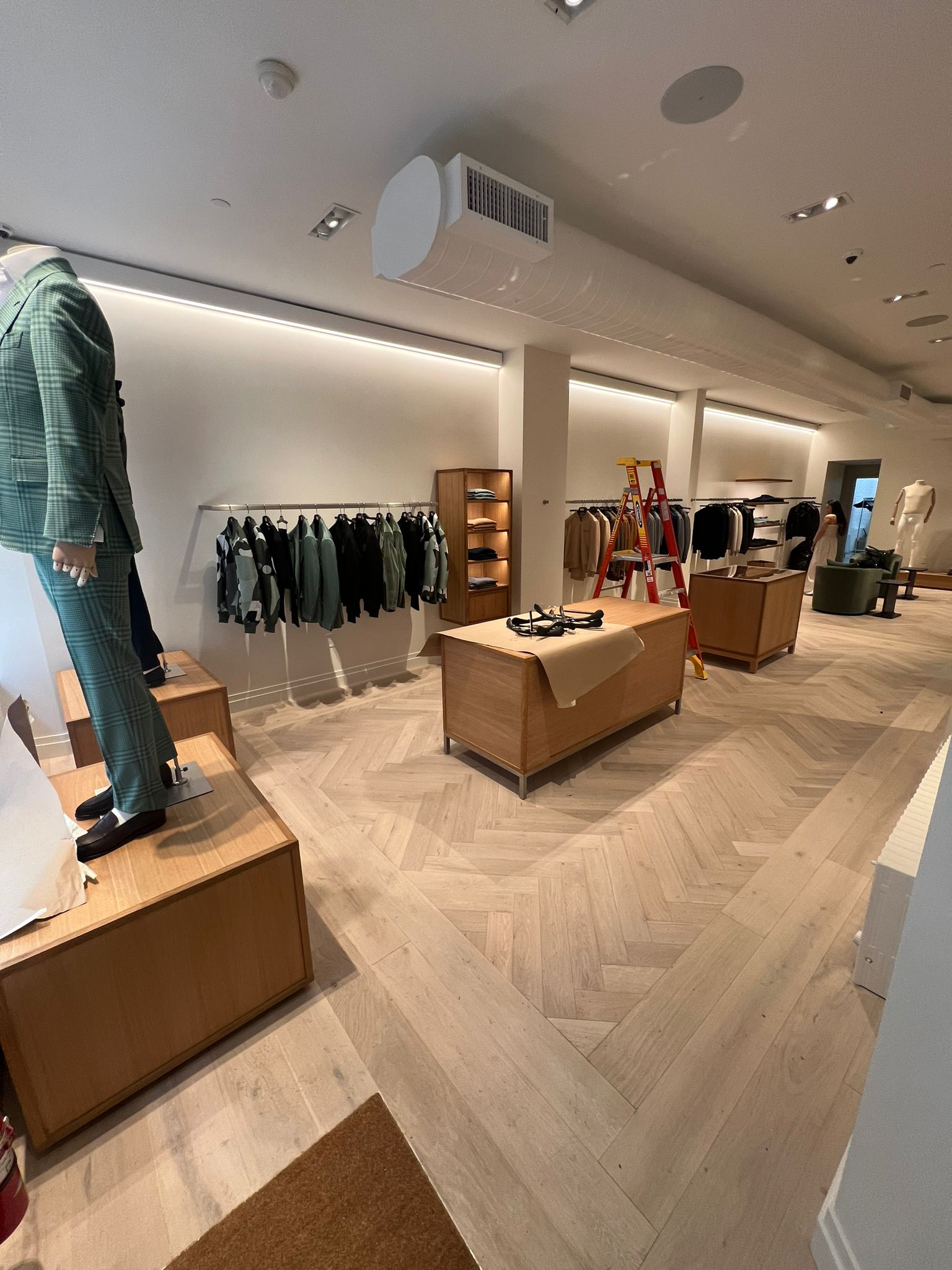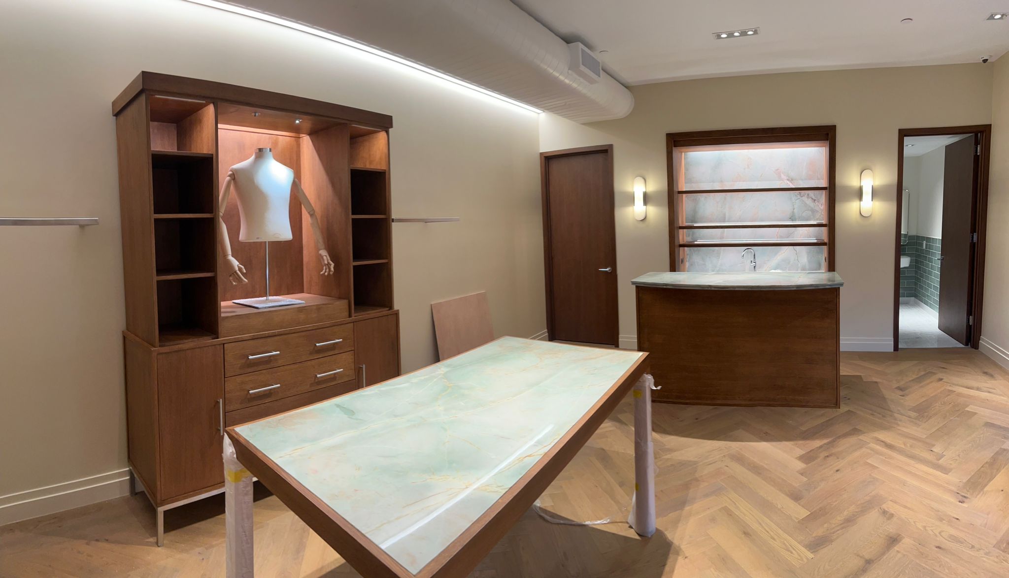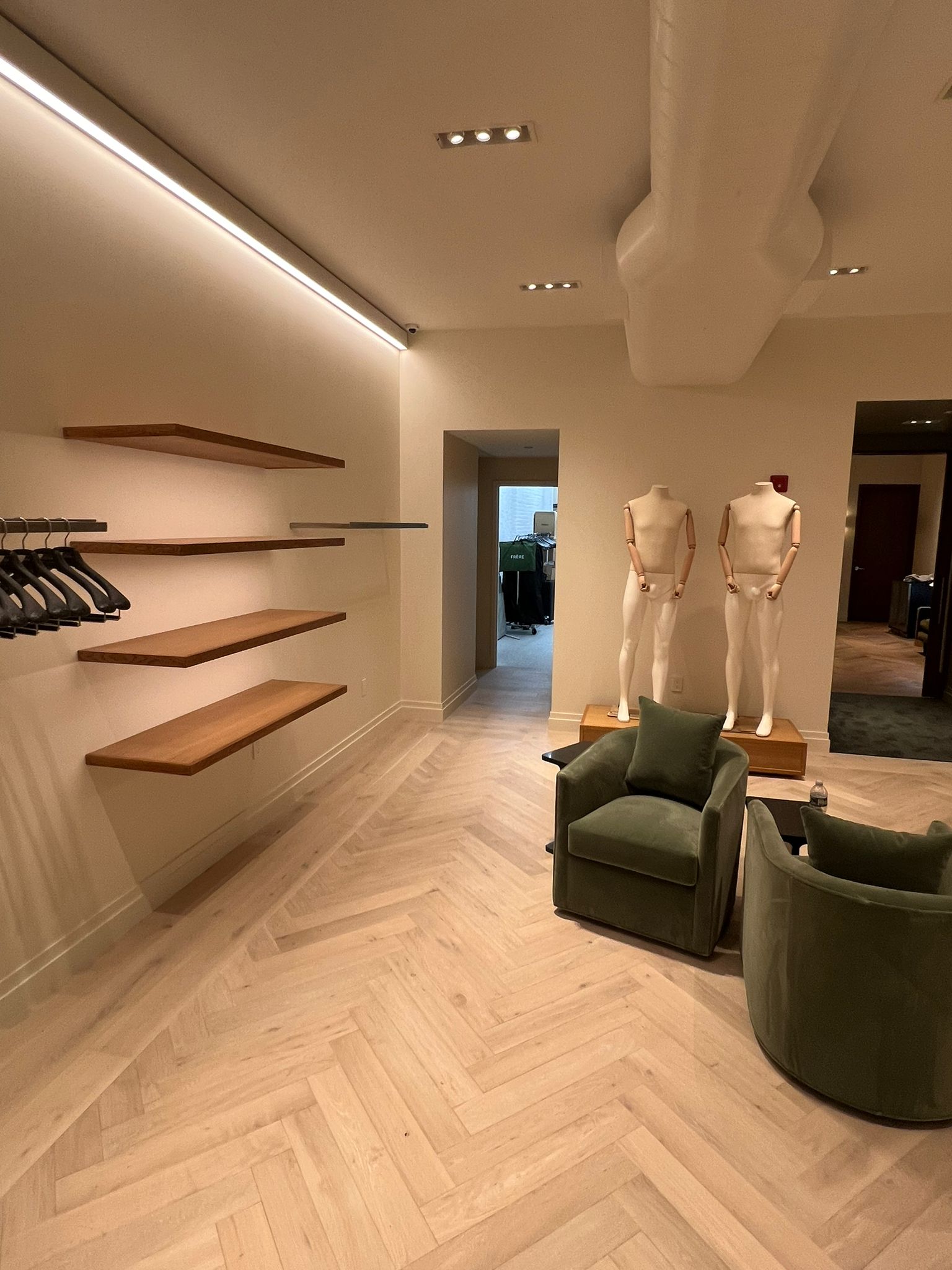 Our skilled workforce executed the interior millwork with exceptional craftsmanship. The project included illuminated shelving units, mannequin display units, product display shelves, and suspended wall-mounted cabinets. These features were designed with a meticulous focus on detail, such as the shelving’s concealed LED illumination, which maintained a sleek, modern look by hiding all wiring and transformers. The wall-mounted units were crafted to create a floating effect, free of visible fasteners, with a snug-fit bar seamlessly integrated into flushed walls.