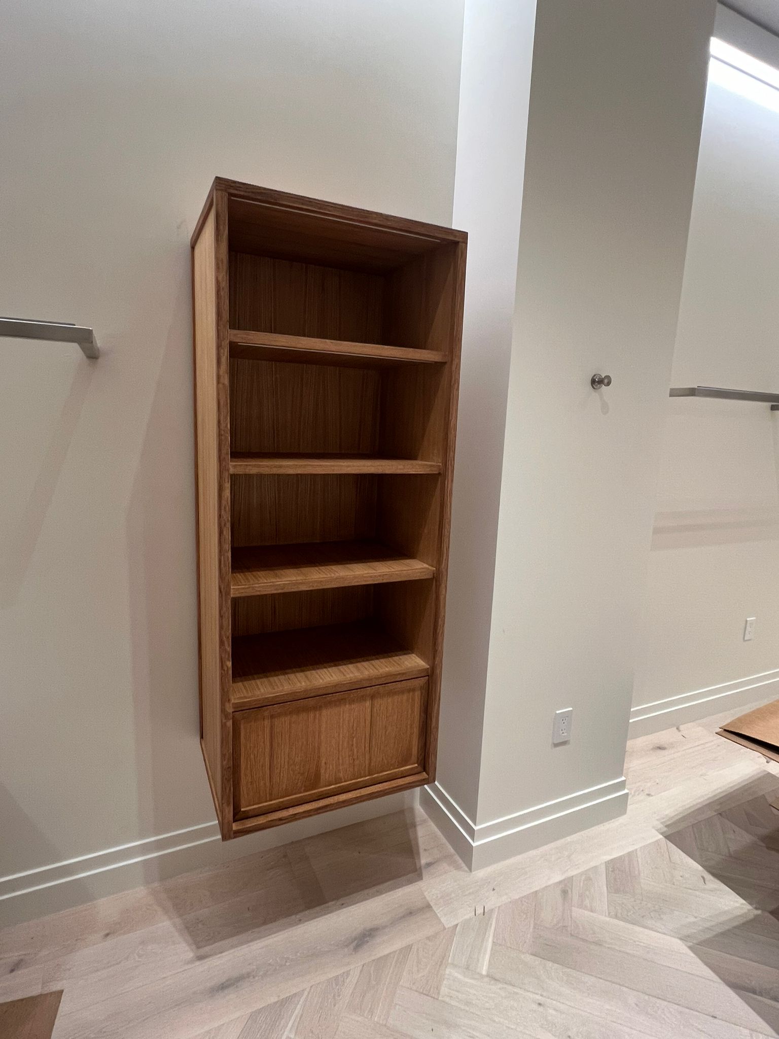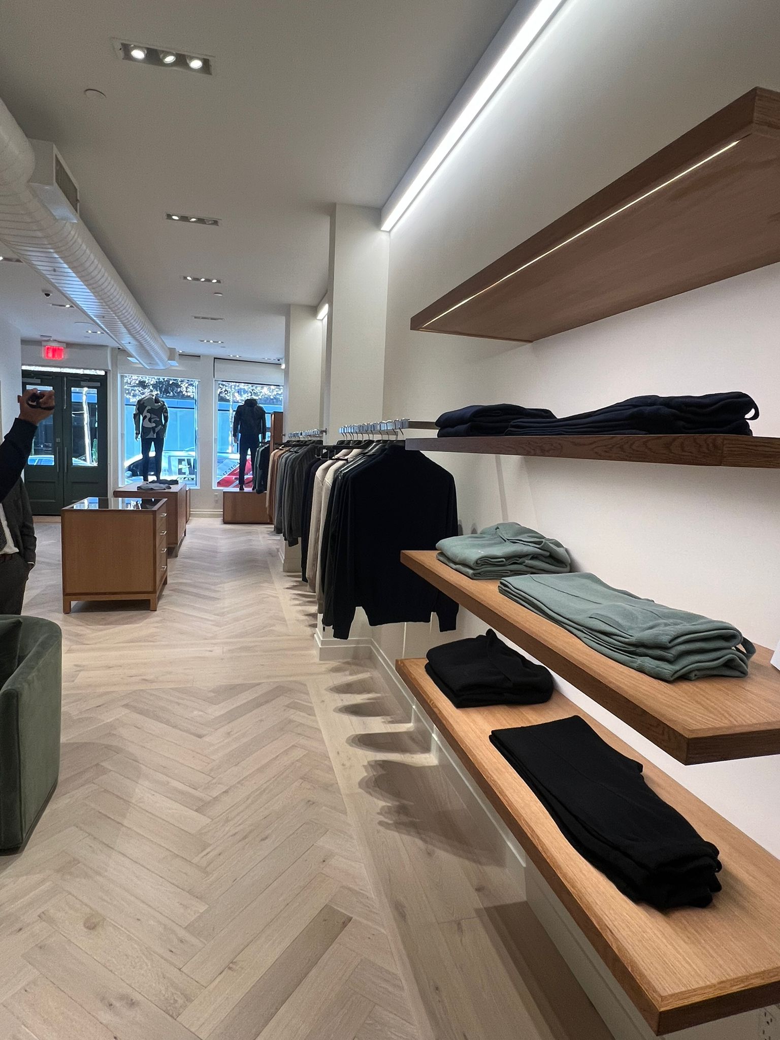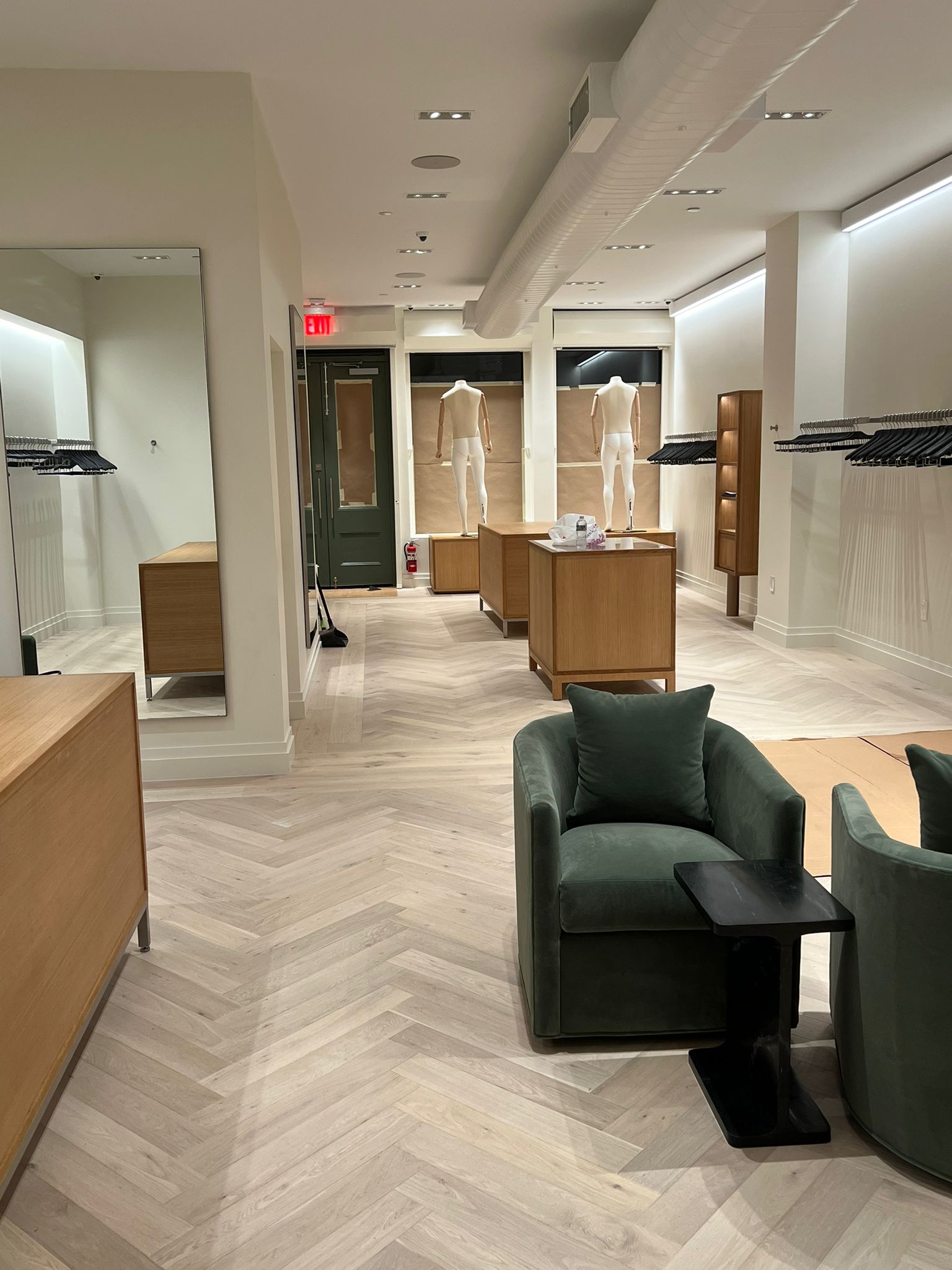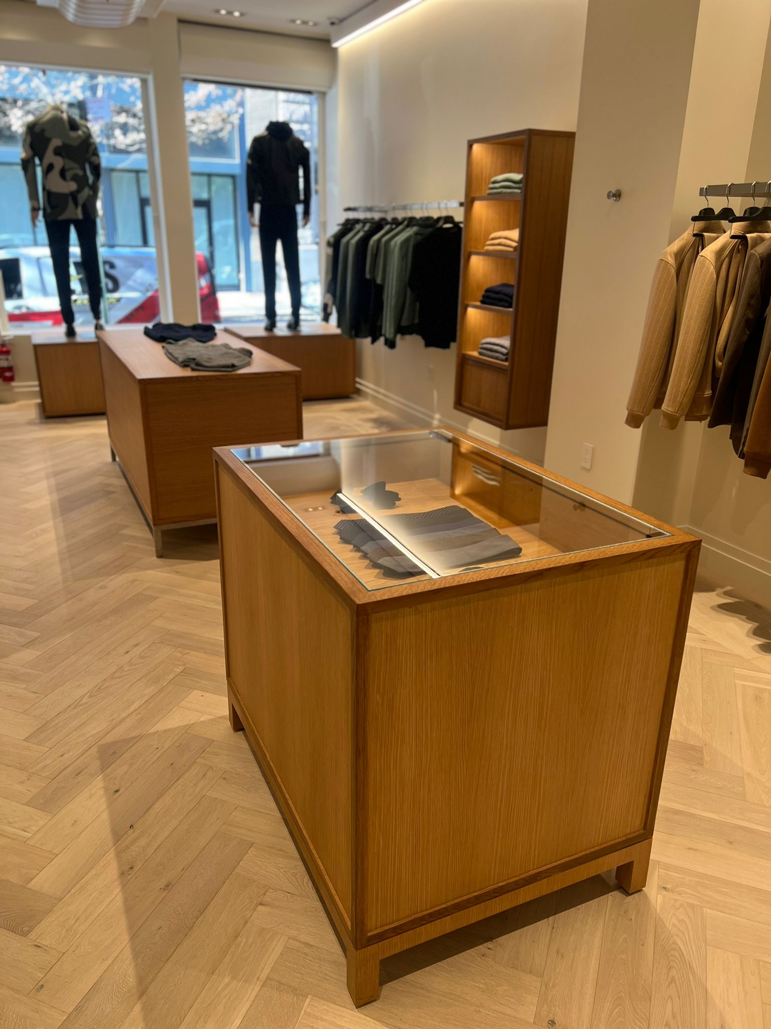 Our skilled workforce executed the interior millwork with exceptional craftsmanship. The project included illuminated shelving units, mannequin display units, product display shelves, and suspended wall-mounted cabinets. These features were designed with a meticulous focus on detail, such as the shelving’s concealed LED illumination, which maintained a sleek, modern look by hiding all wiring and transformers. The wall-mounted units were crafted to create a floating effect, free of visible fasteners, with a snug-fit bar seamlessly integrated into flushed walls.