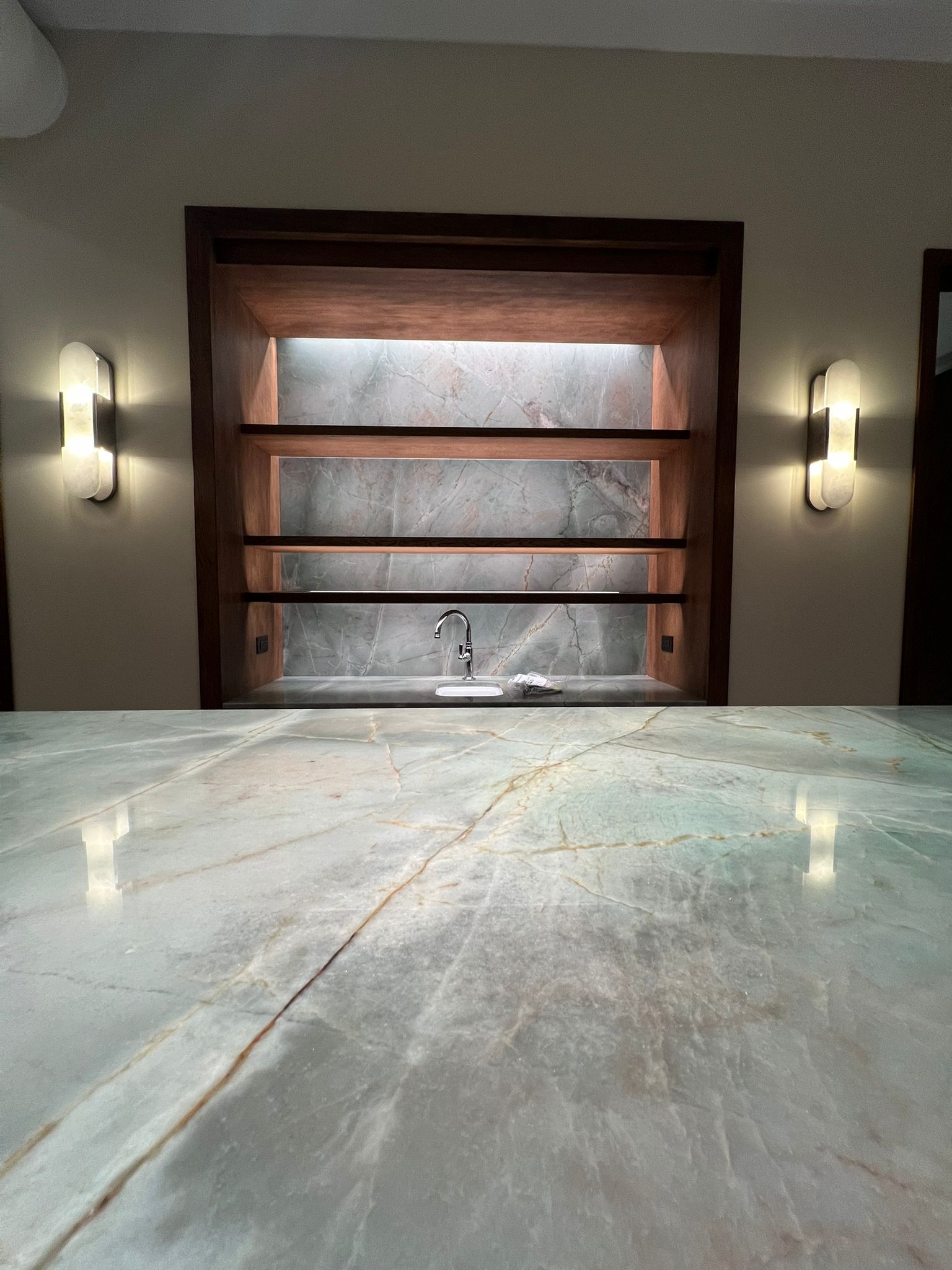 Our expertise extended beyond the interior to include the entire process of exterior signage creation, from design to installation. This included crafting blade signage and storefront elements that enhanced the brand’s street presence while adhering to local regulations. We managed the often-complex permit acquisition process, ensuring a seamless workflow. The signage’s stone elements were cut with state-of-the-art waterjet machines, achieving impeccable finishes that elevated the project’s overall quality.