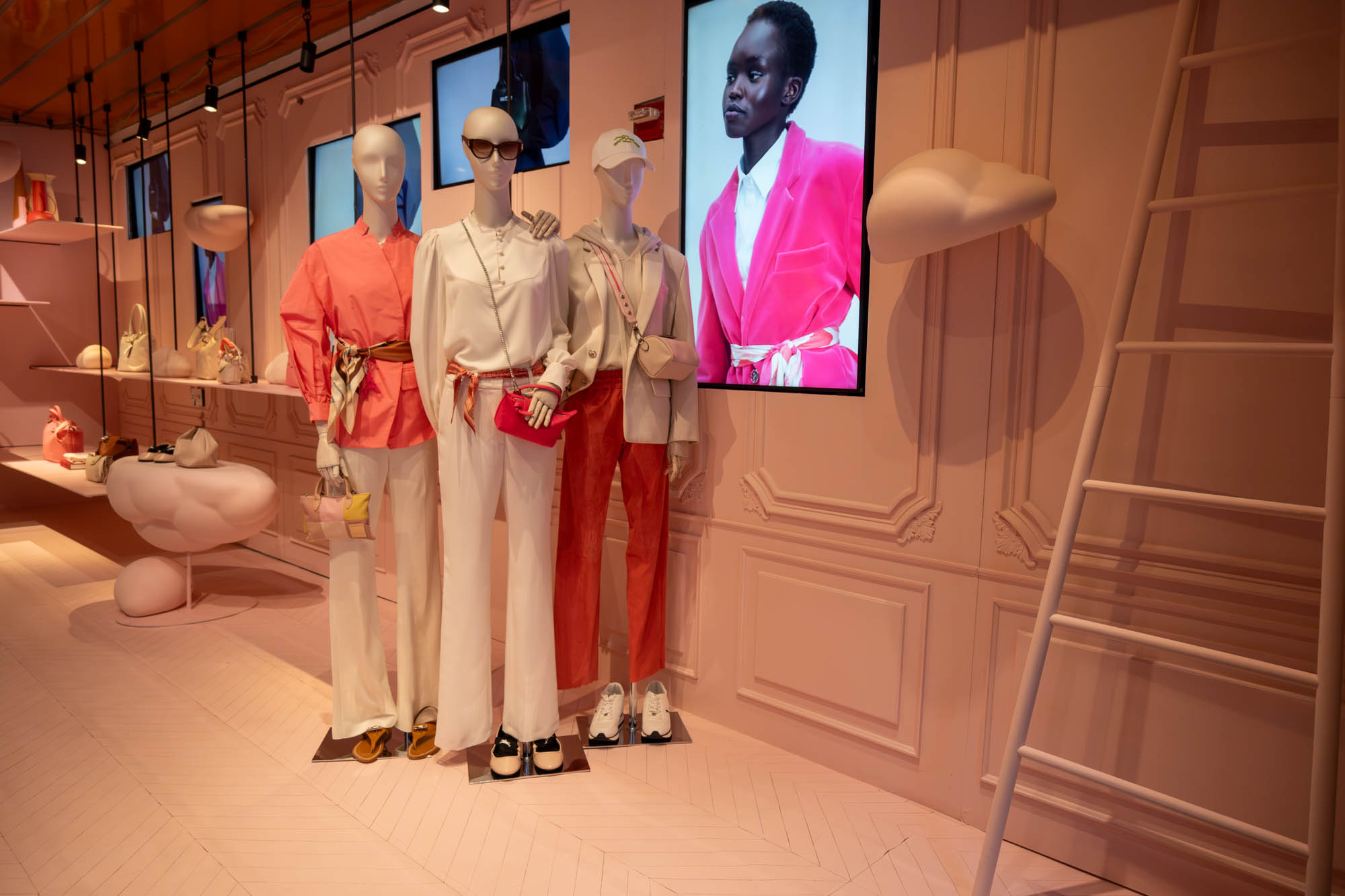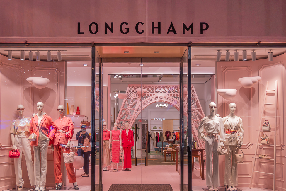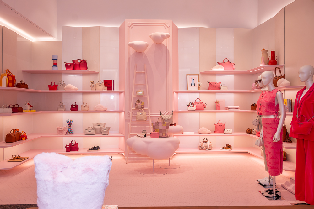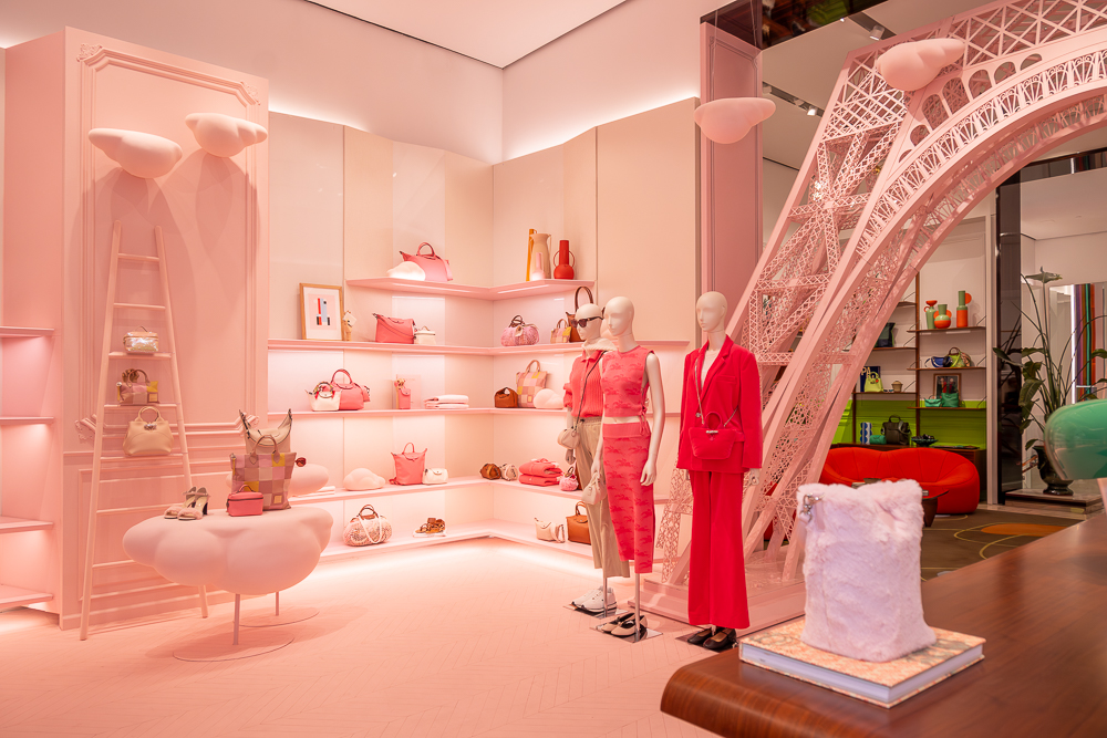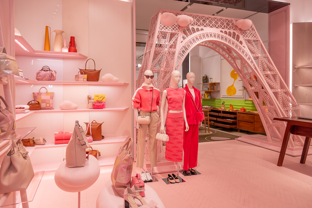 Longchamp launched a Spring 2025 holiday collection that dares you to "Dream in Pink," reflected in the window displays at their Fifth Avenue flagship and Soho boutiques. The interiors have been transformed into whimsical, pink versions of the Parisian apartment design concept first introduced by Longchamp in 2021. Fifth Avenue showcases an interior replica of the Eiffel Tower, only one of three currently on display worldwide.