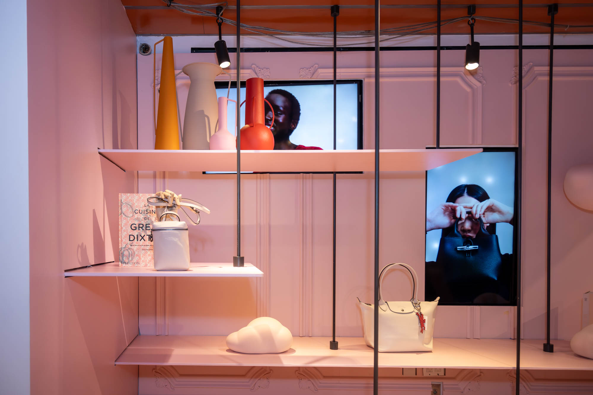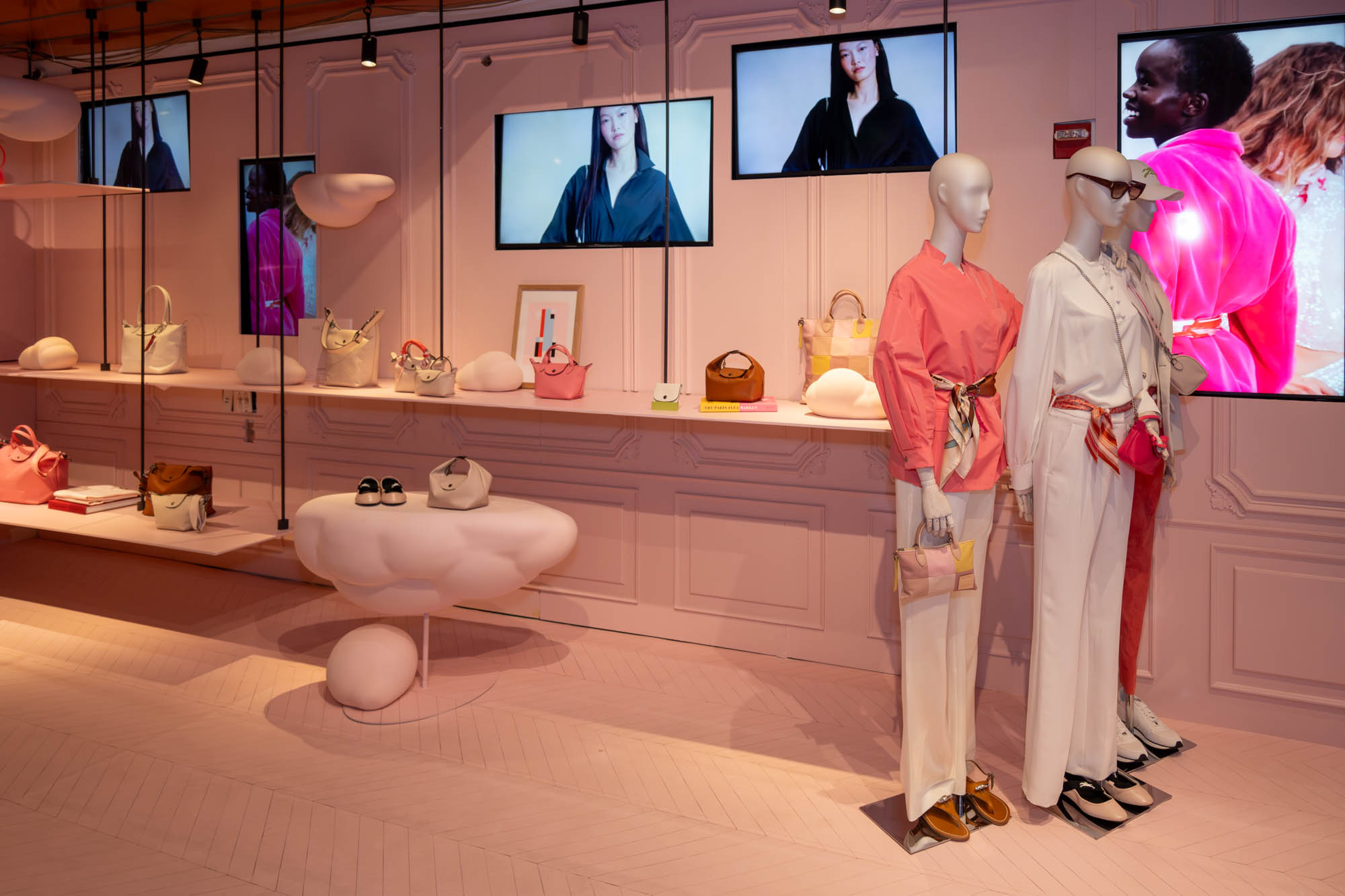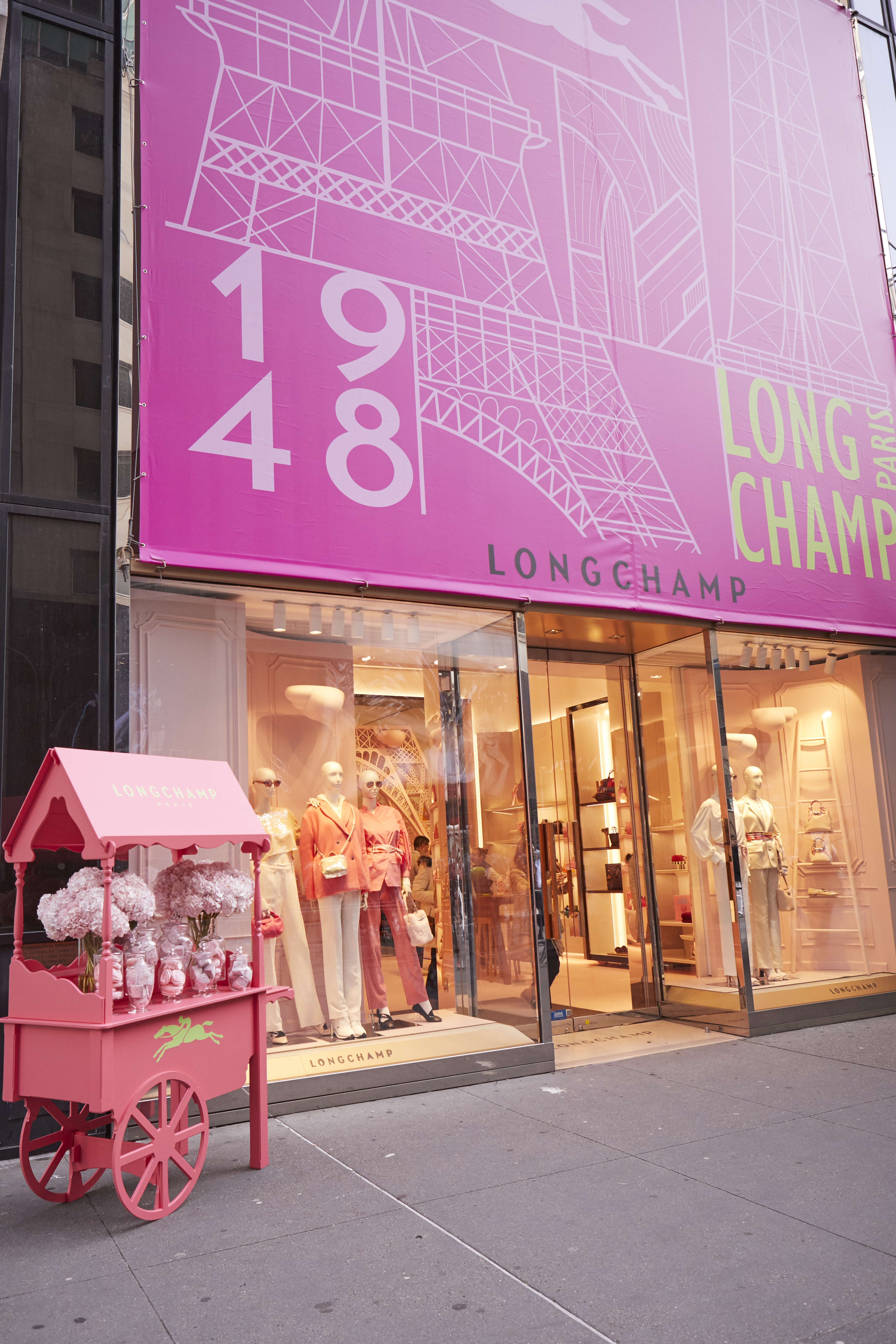 Longchamp launched a Spring 2025 holiday collection that dares you to "Dream in Pink," reflected in the window displays at their Fifth Avenue flagship and Soho boutiques. The interiors have been transformed into whimsical, pink versions of the Parisian apartment design concept first introduced by Longchamp in 2021. Fifth Avenue showcases an interior replica of the Eiffel Tower, only one of three currently on display worldwide.