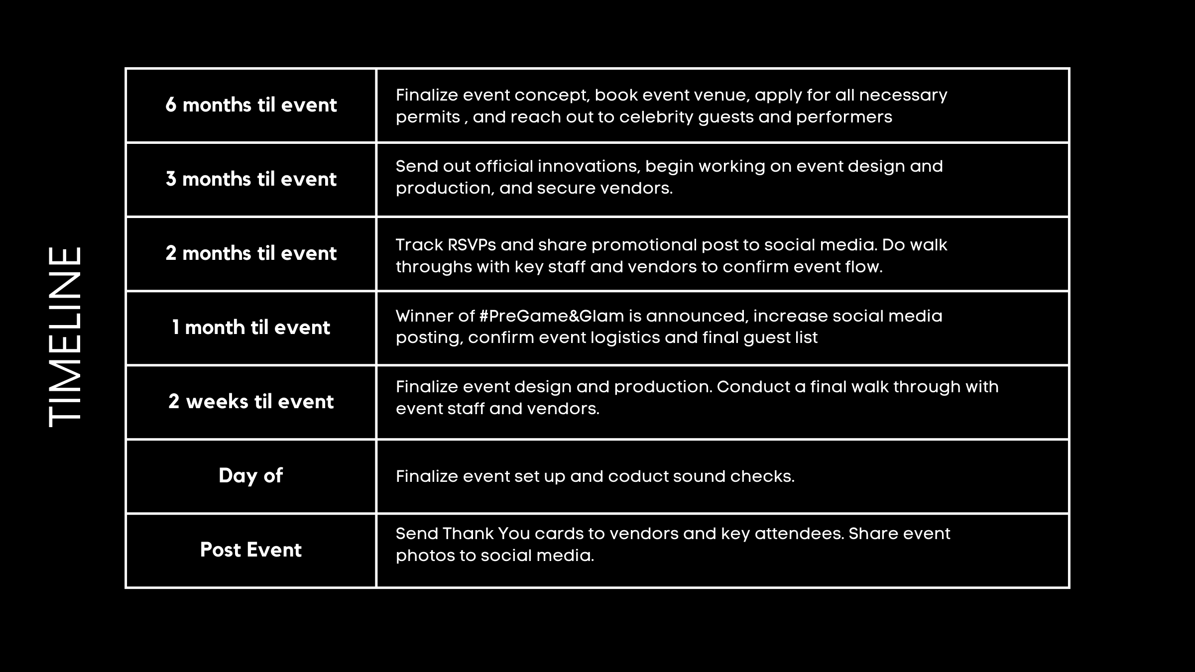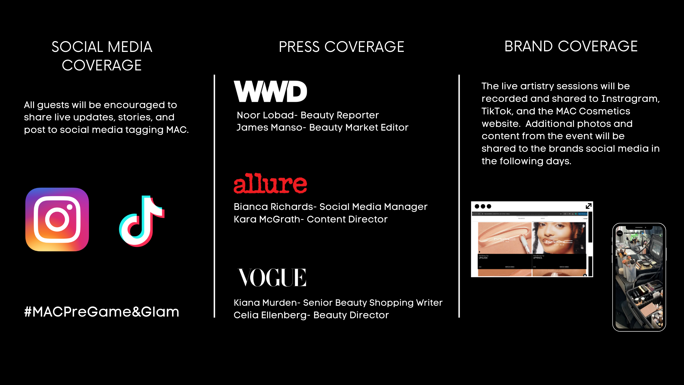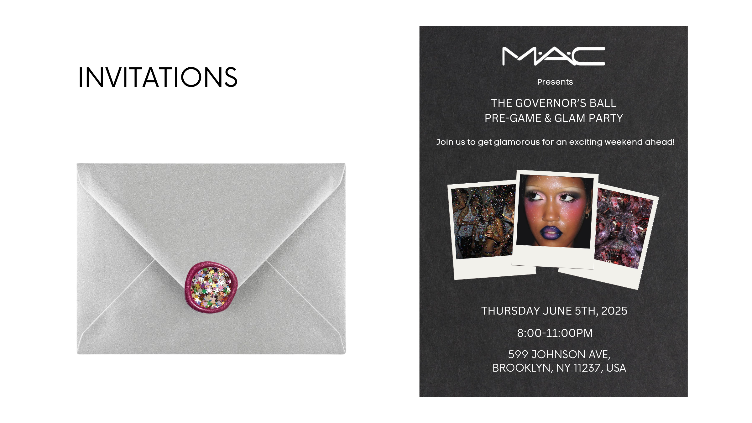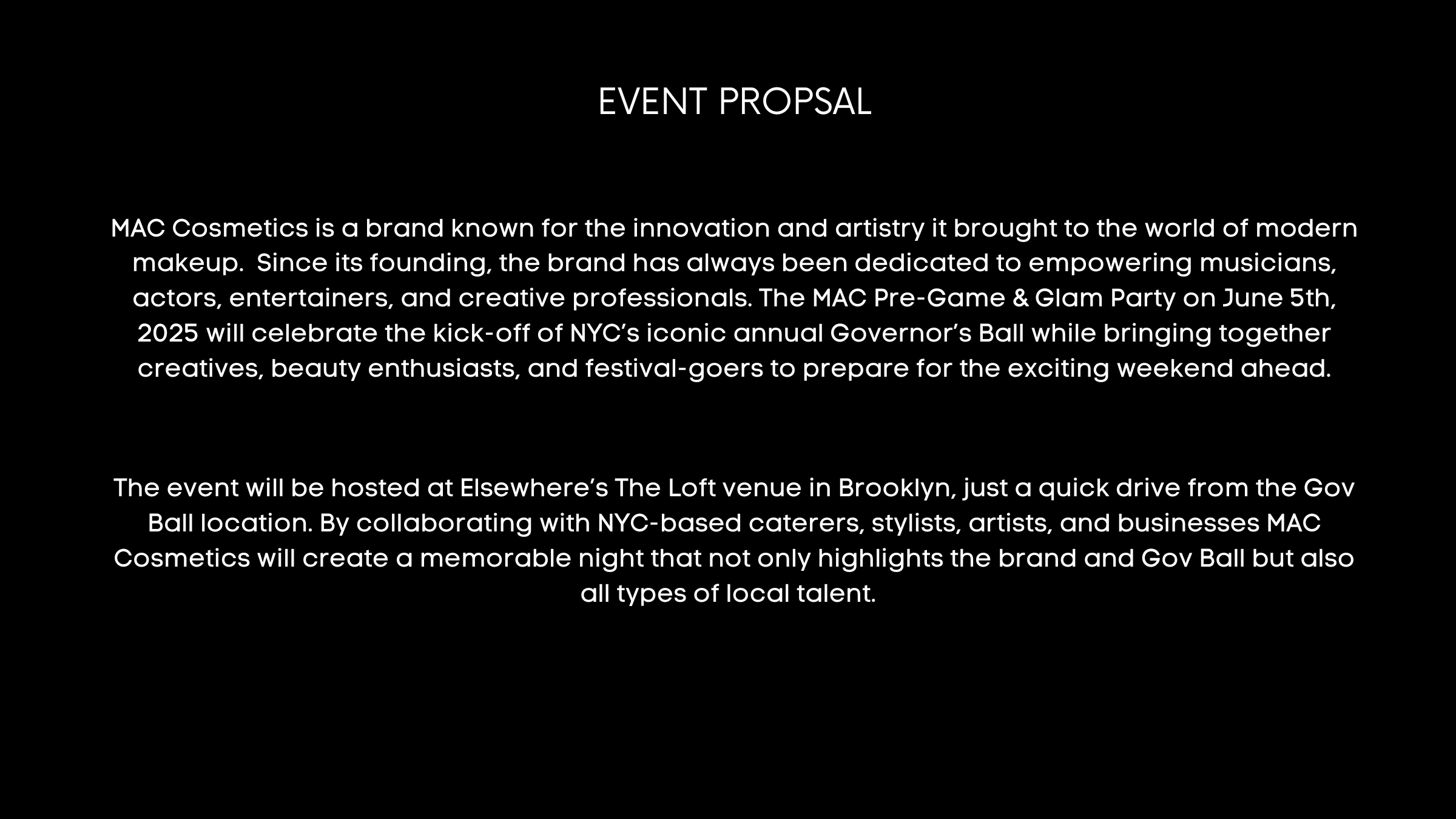 This project is an event proposal for MAC Cosmetics to host ‘MAC PreGame & Glam’ to kick off the Governor’s Ball music festival in New York. The project includes details such as venue location, legal permits, PR coverage, an estimated budget, and KPIs for the event.